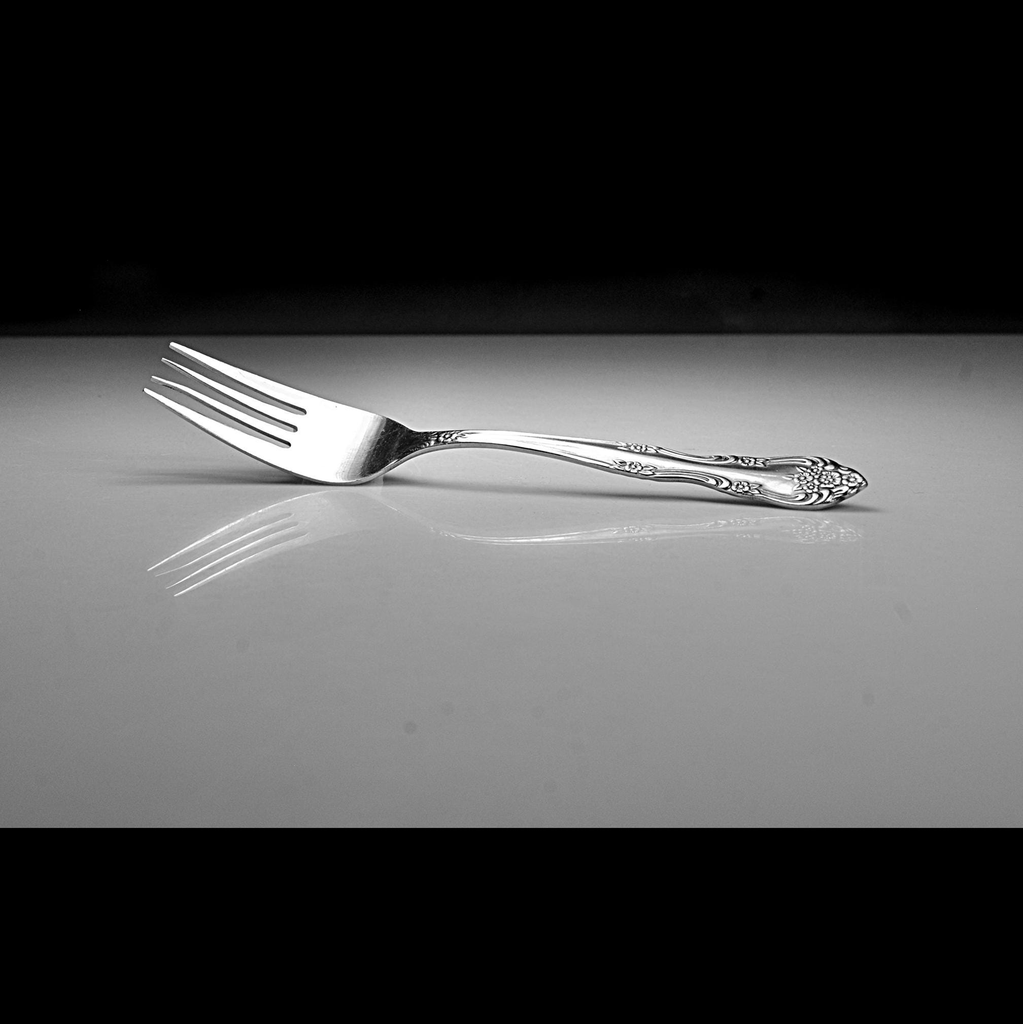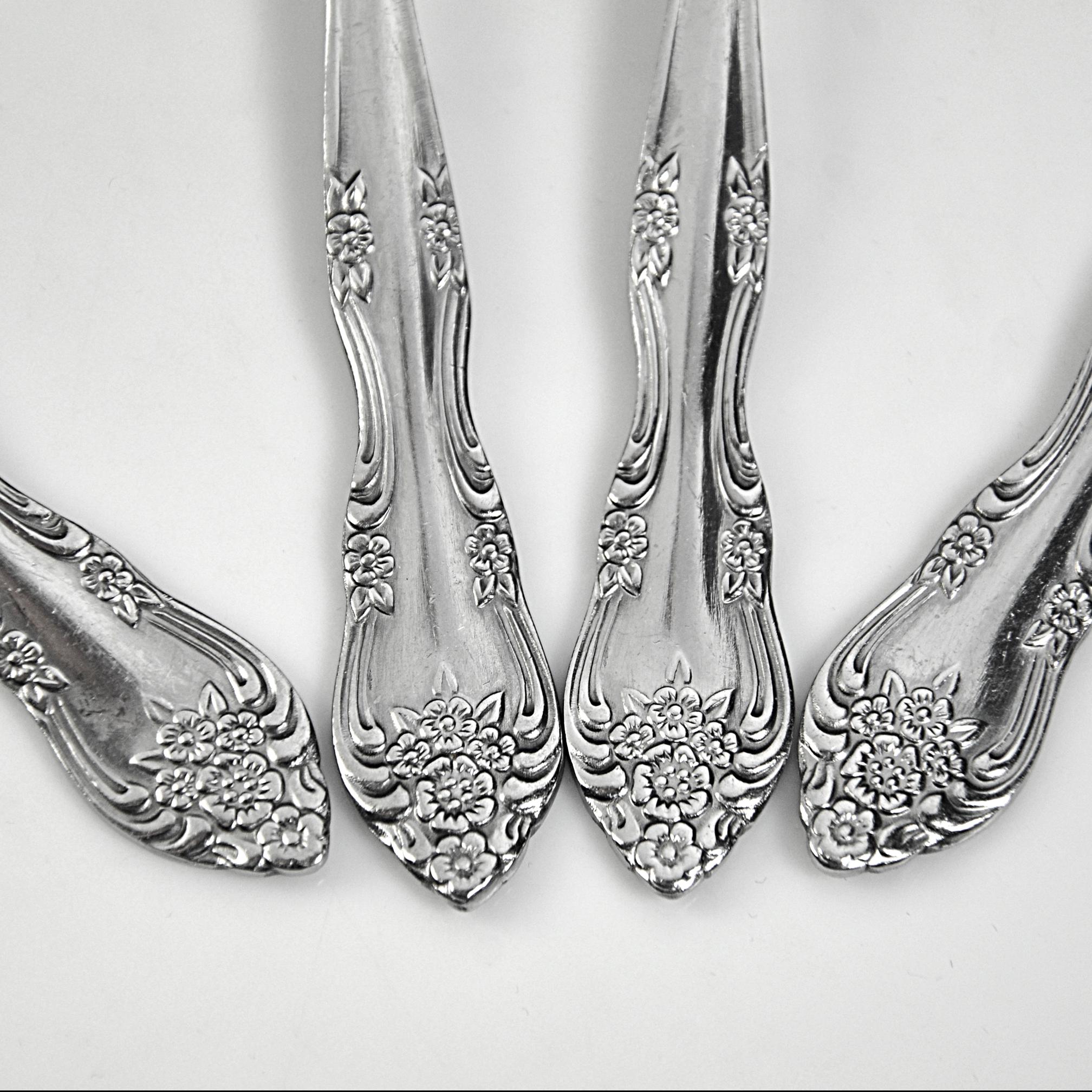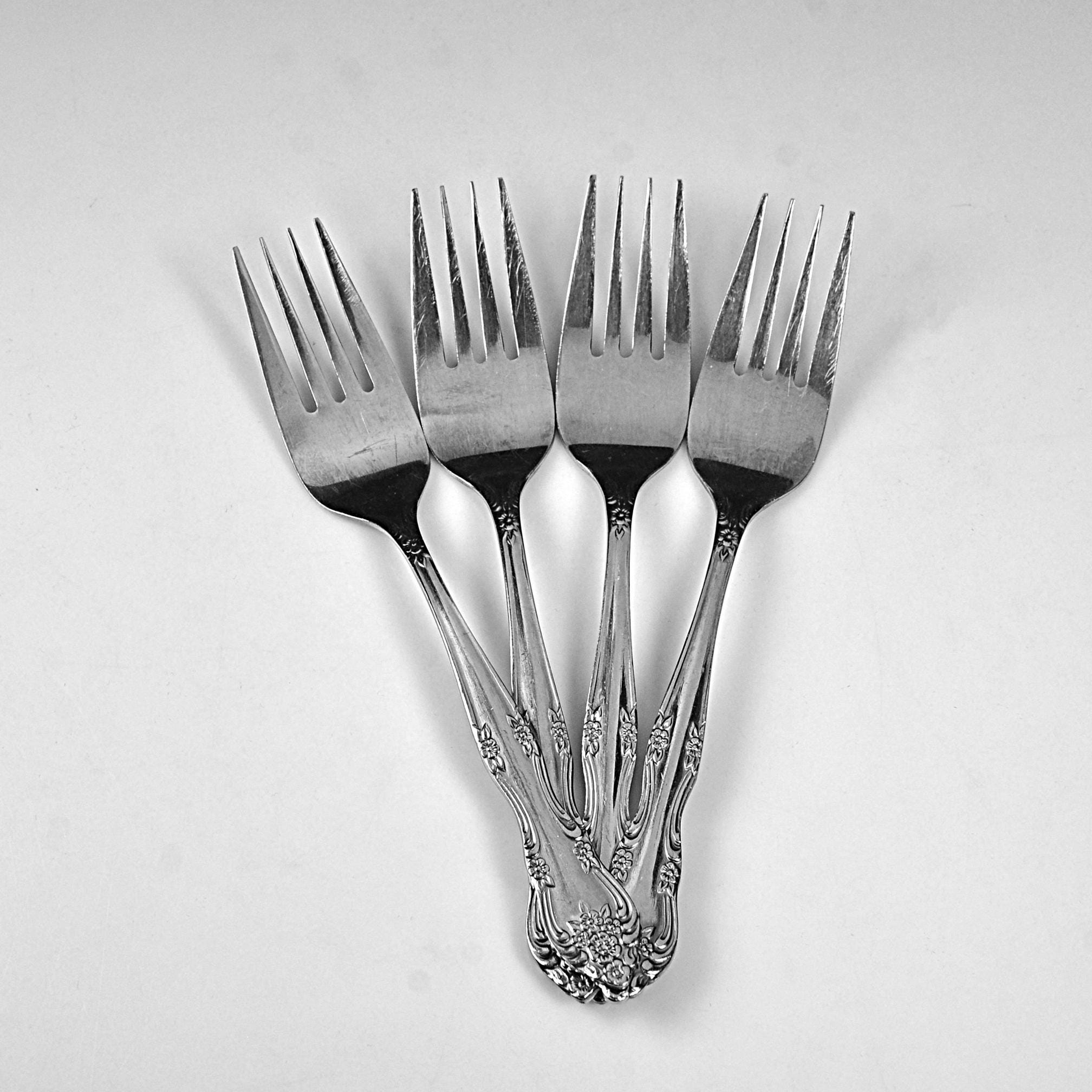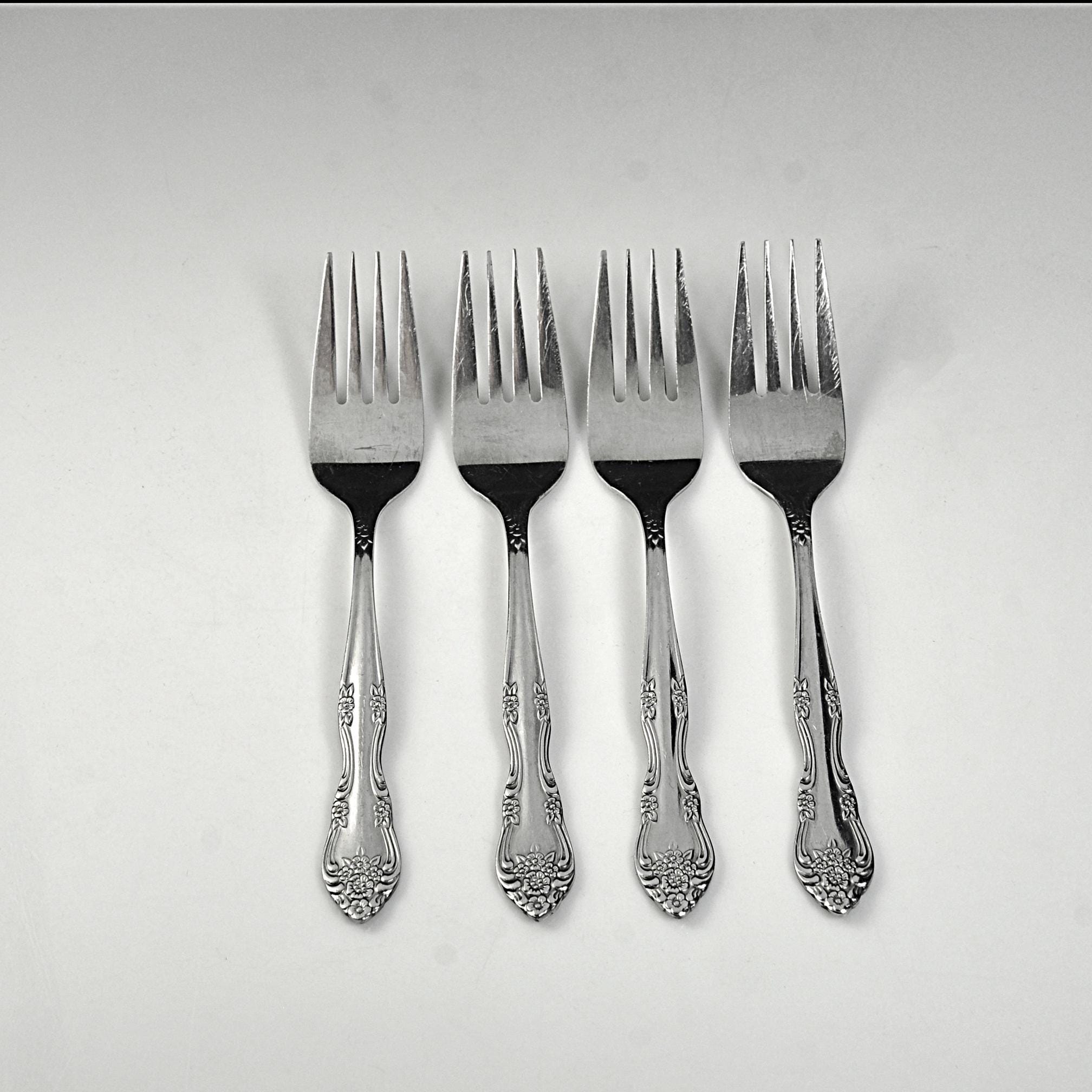 These are the kind of forks that feel familiar the moment you pick them up—simple, comfortable in the hand, and dressed up just enough with that soft floral pattern along the handle. This is a set of four salad forks, each measuring 6½ inches in length, made from stainless steel and marked Rogers Stainless Korea. They have that classic look inspired by older silverware patterns, but with the easy care of stainless—no polishing needed, just use and enjoy. They’ve been gently used and still have a nice shine, with only light surface marks from normal use. No bends, no damage—just honest pieces that are ready for the table.