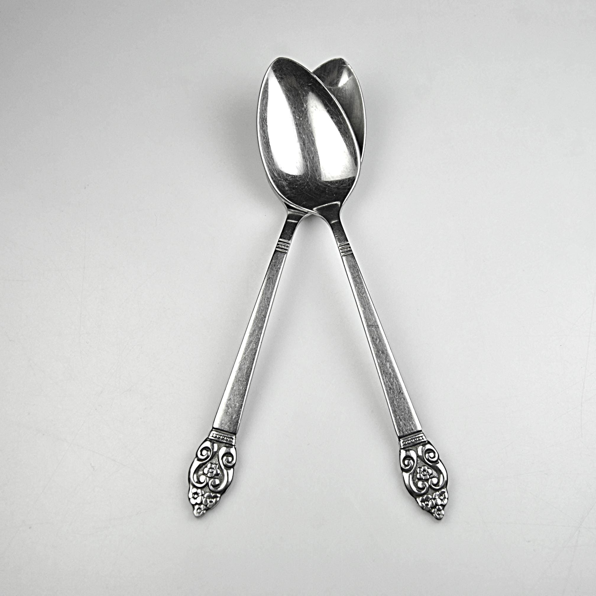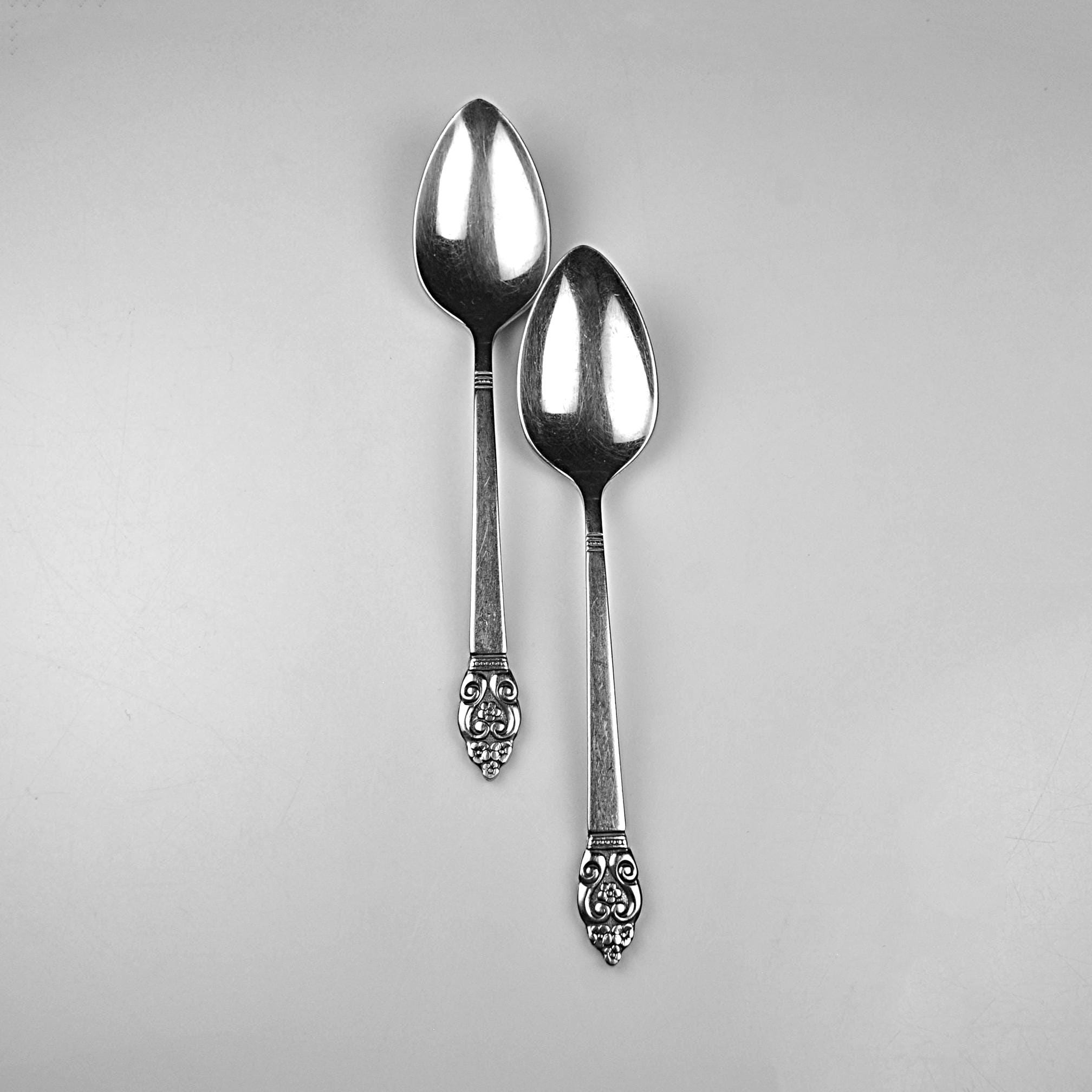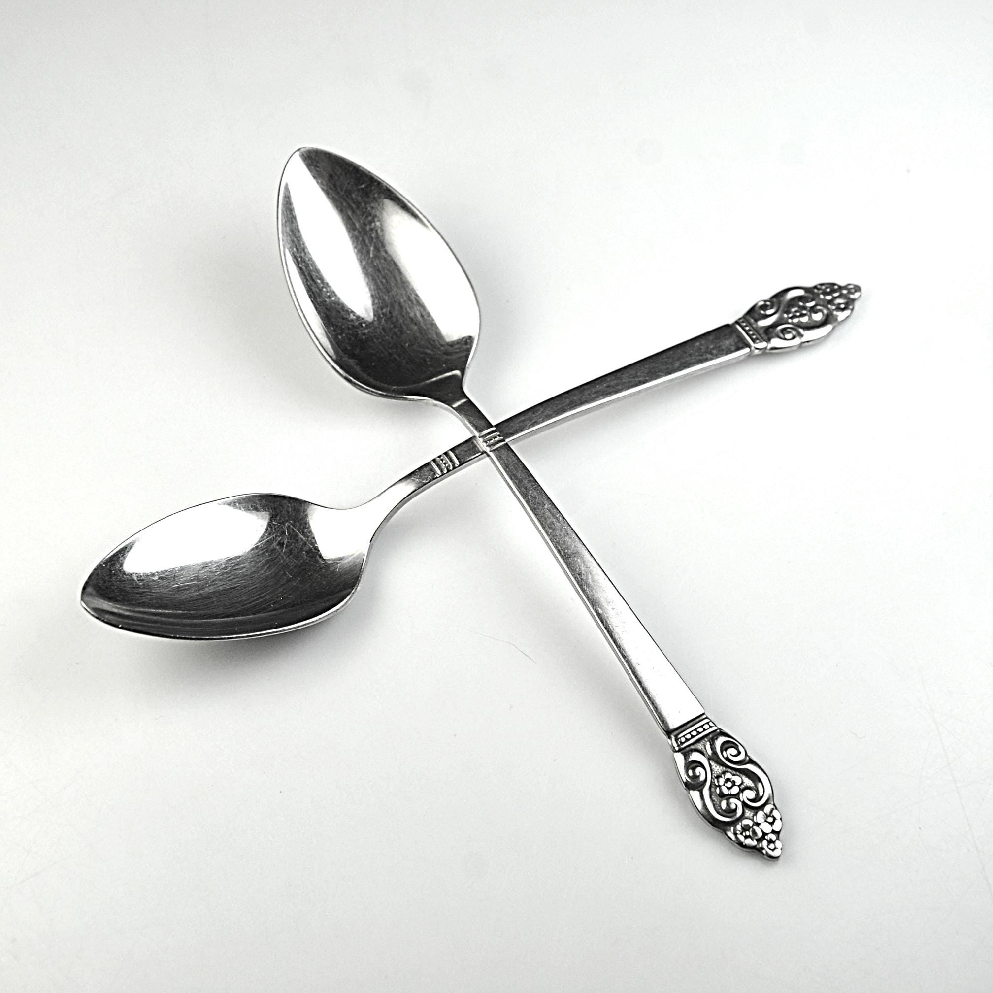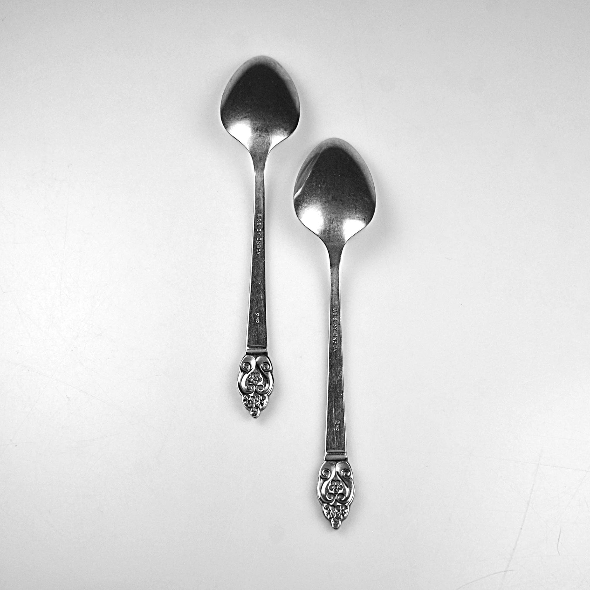 A nice pair of vintage Oneida teaspoons in the Erika pattern, a design introduced in the early 1970s. The Erika pattern features a tapered handle with a small floral and scroll design at the tip, giving the pieces just a touch of decorative detail while still keeping the clean look typical of mid-century and 1970s stainless flatware. These spoons are marked “S.S.S. BY ONEIDA” (Superior Stainless Steel) on the back and each is also stamped “2ND,” indicating they were factory seconds. This usually meant a small cosmetic imperfection during production, though nothing obvious stands out today. Both spoons measure 6⅛ inches long and remain bright and shiny. They show normal light surface marks from age and use but have no bending or damage. A good pair for replacing missing pieces in an Erika flatware set or simply adding a couple of sturdy vintage spoons to everyday use.