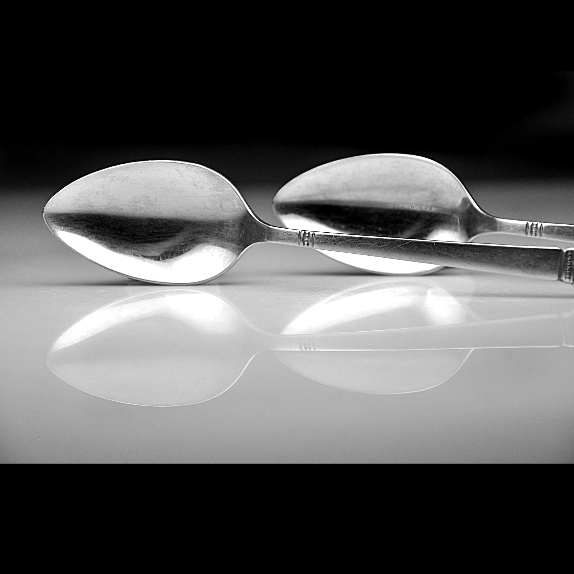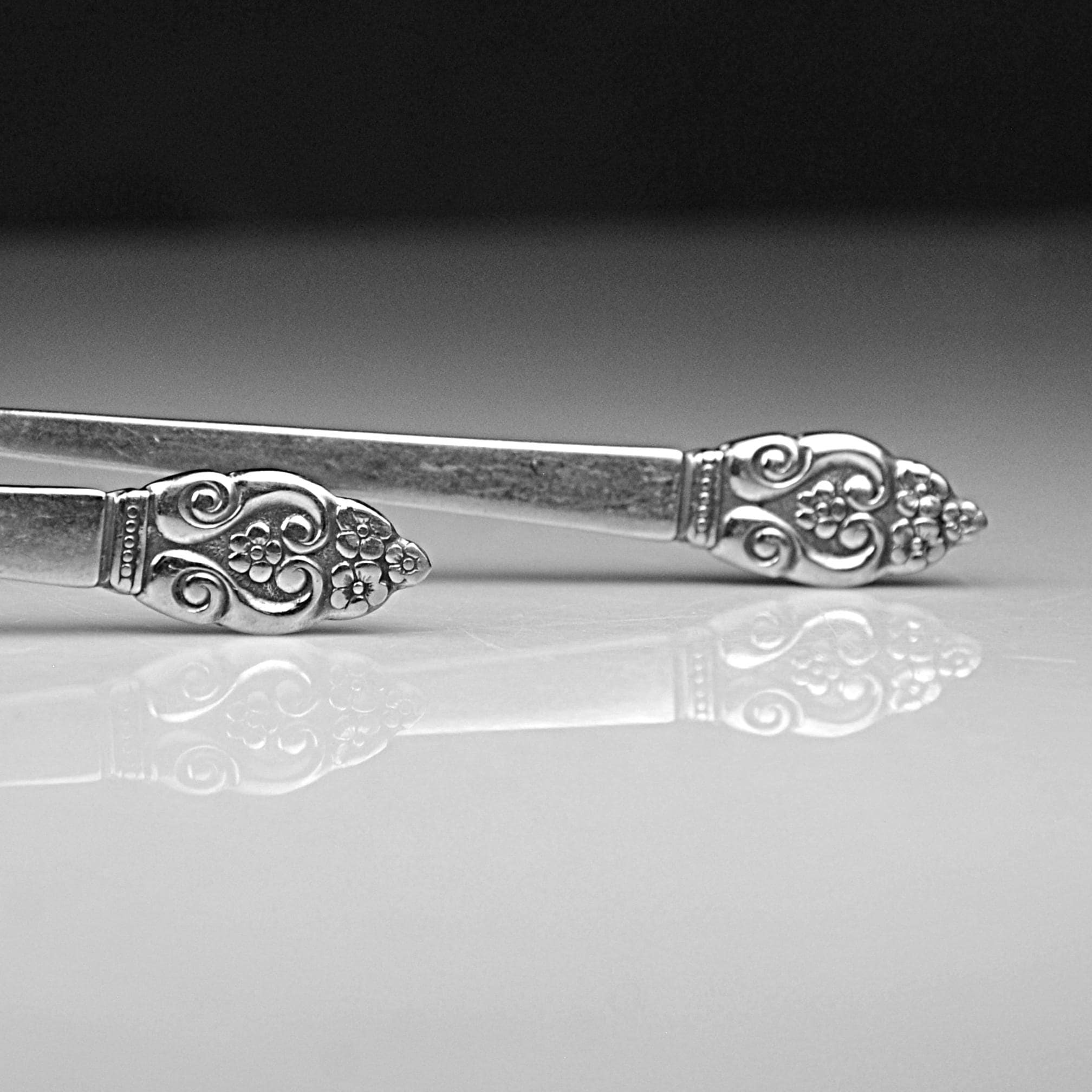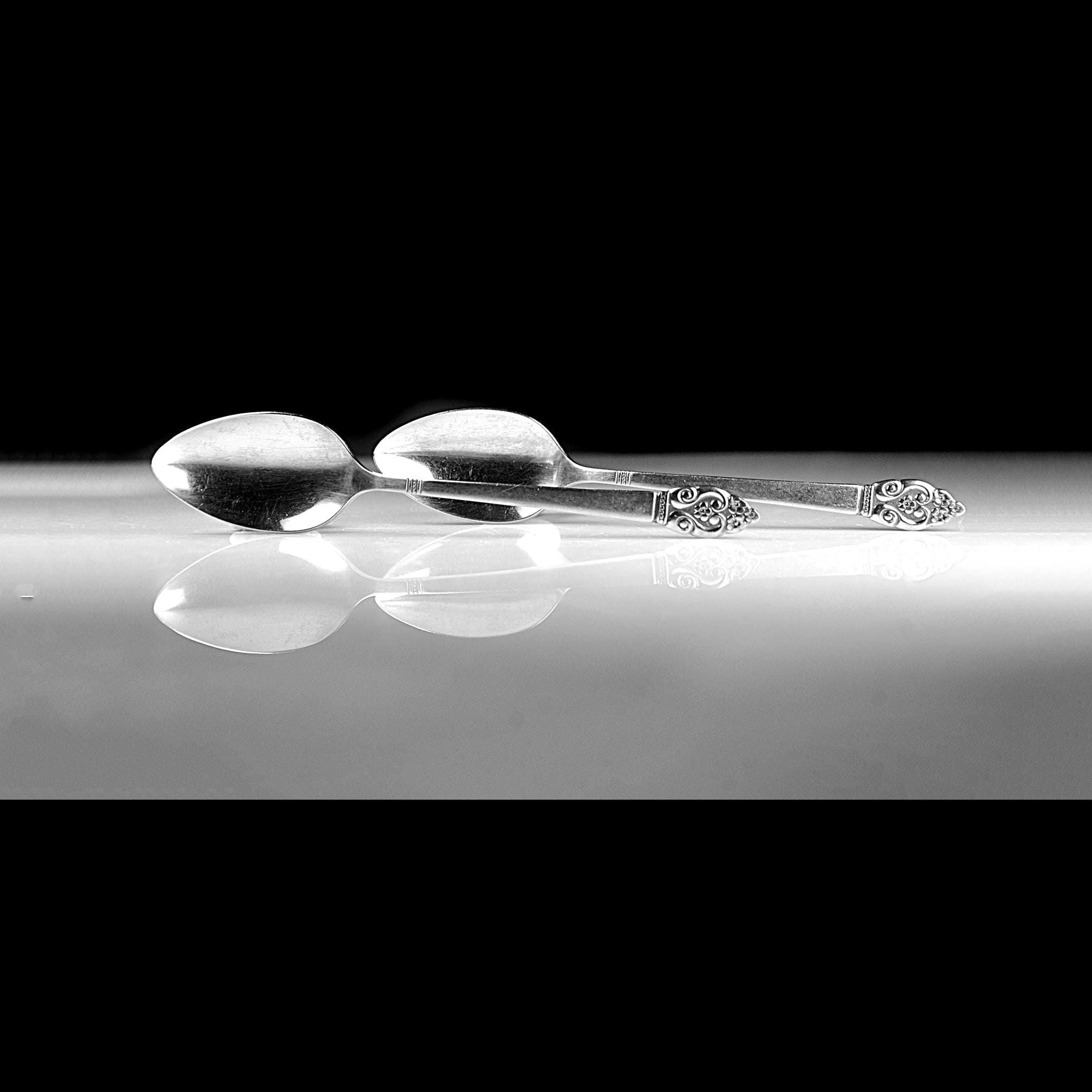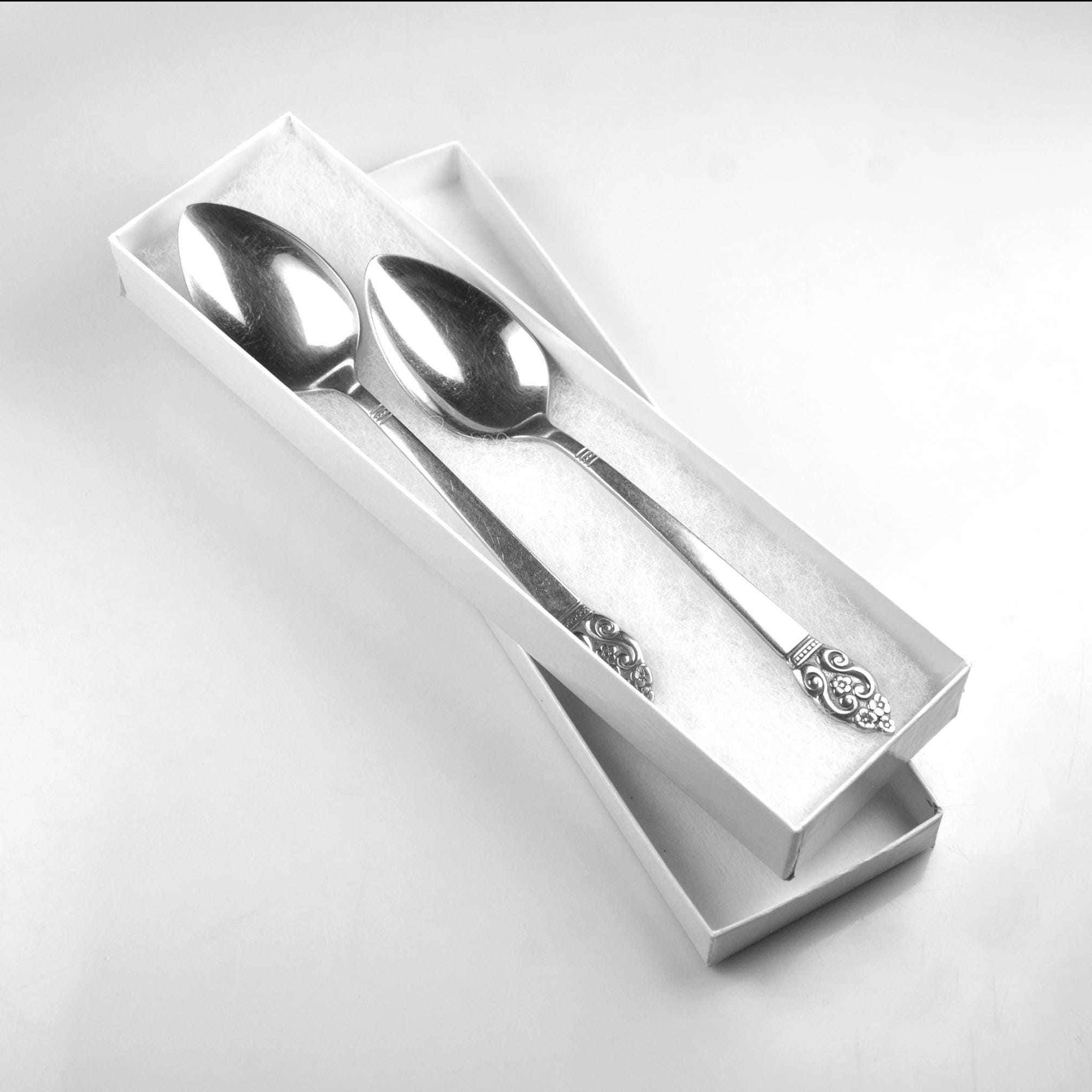 A nice pair of vintage Oneida teaspoons in the Erika pattern, a design introduced in the early 1970s. The Erika pattern features a tapered handle with a small floral and scroll design at the tip, giving the pieces just a touch of decorative detail while still keeping the clean look typical of mid-century and 1970s stainless flatware. These spoons are marked “S.S.S. BY ONEIDA” (Superior Stainless Steel) on the back and each is also stamped “2ND,” indicating they were factory seconds. This usually meant a small cosmetic imperfection during production, though nothing obvious stands out today. Both spoons measure 6⅛ inches long and remain bright and shiny. They show normal light surface marks from age and use but have no bending or damage. A good pair for replacing missing pieces in an Erika flatware set or simply adding a couple of sturdy vintage spoons to everyday use.