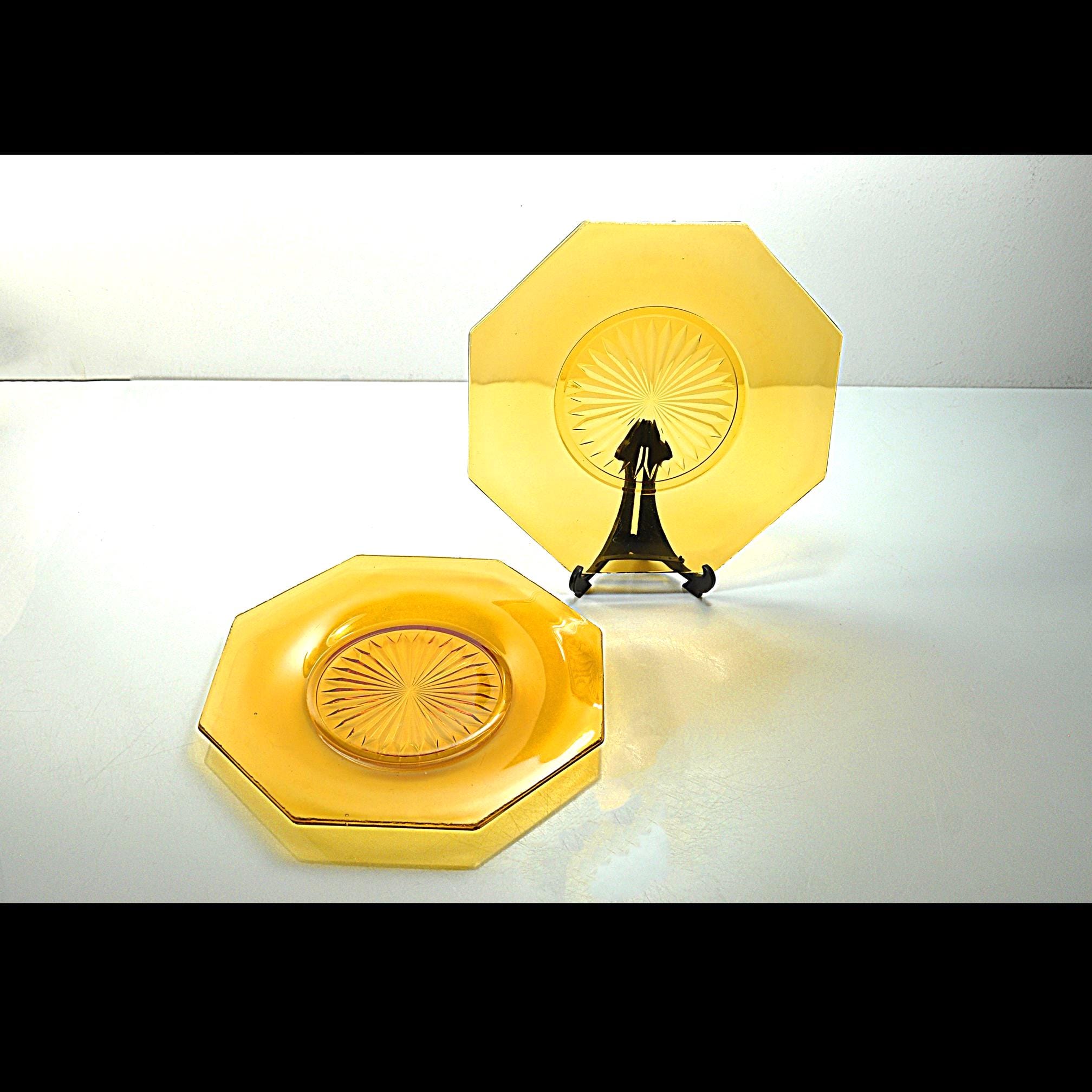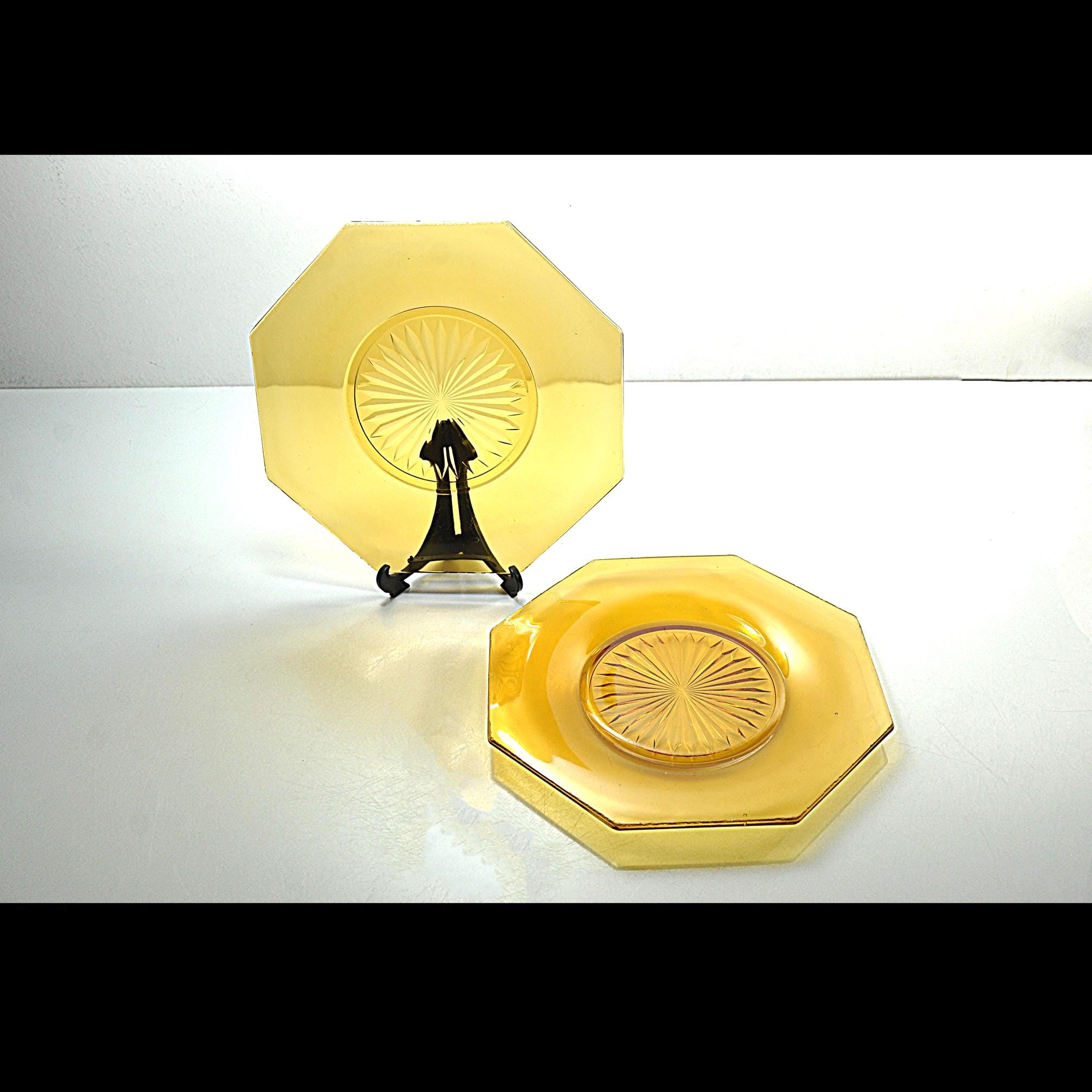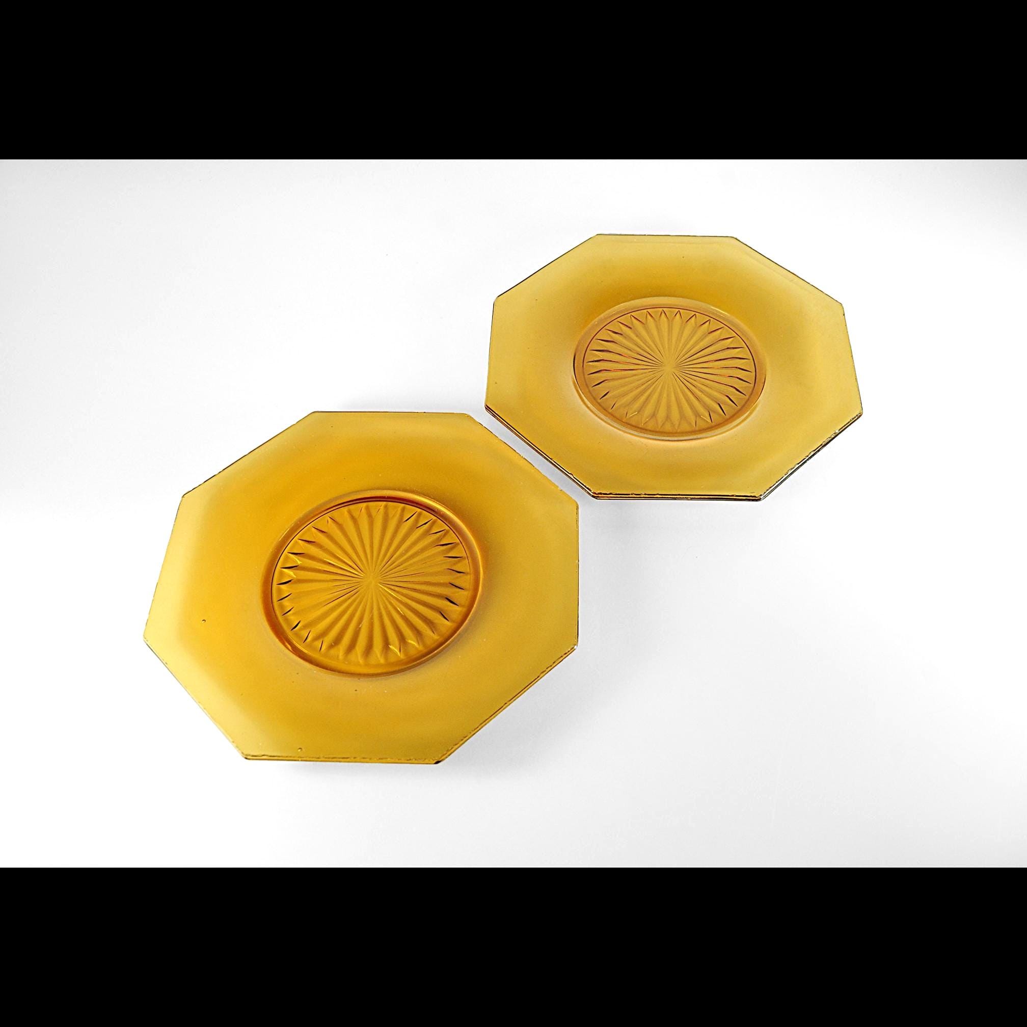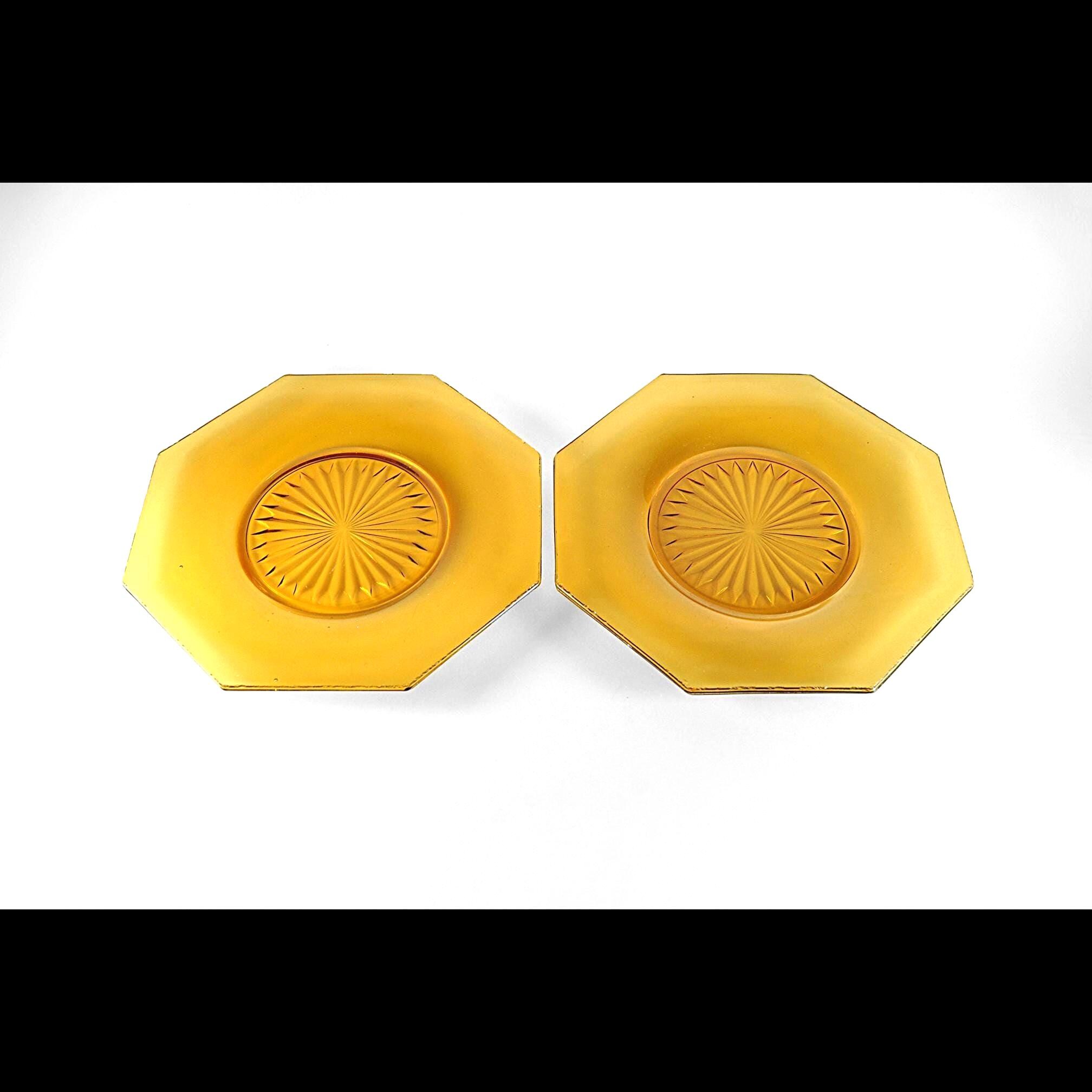 Amber glass always feels warm and welcoming on the table. These two vintage octagon plates have that beautiful deep amber color that was so popular in American homes during the Depression era. The plates feature a classic starburst pattern pressed into the center, a design that catches the light and gives the glass a little extra sparkle. Pieces like this were made to be used every day. Each plate measures about 8 inches across and has a distinctive octagon shape, giving them a subtle Art Deco feel. They make wonderful dessert or salad plates, and the amber color looks especially beautiful on a fall table or holiday setting. These plates are in good vintage condition overall. There are a few small flea-bite chips along parts of the rim, which is common for pressed glass pieces that have been around for nearly a century. There are no cracks, and the glass remains bright and clear.