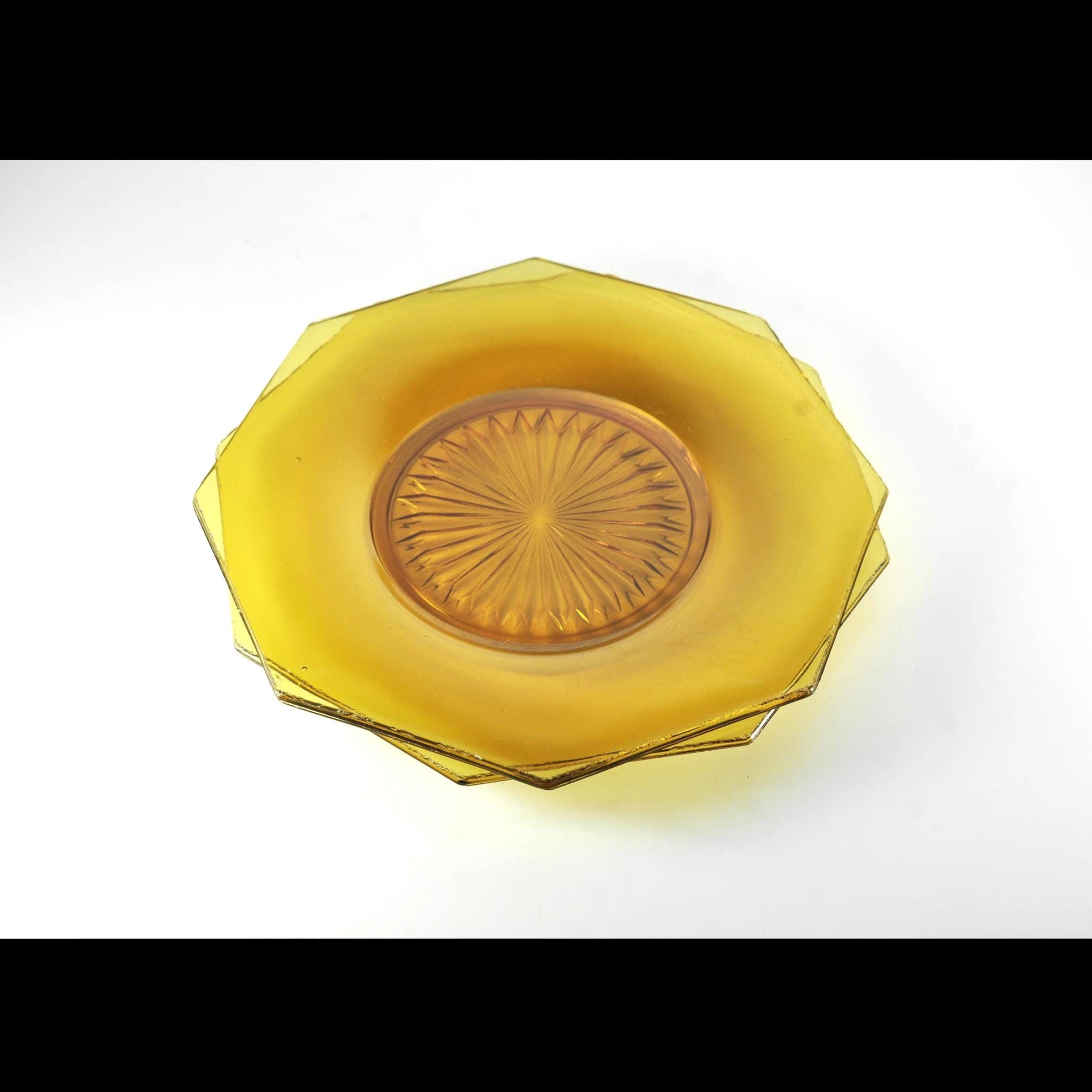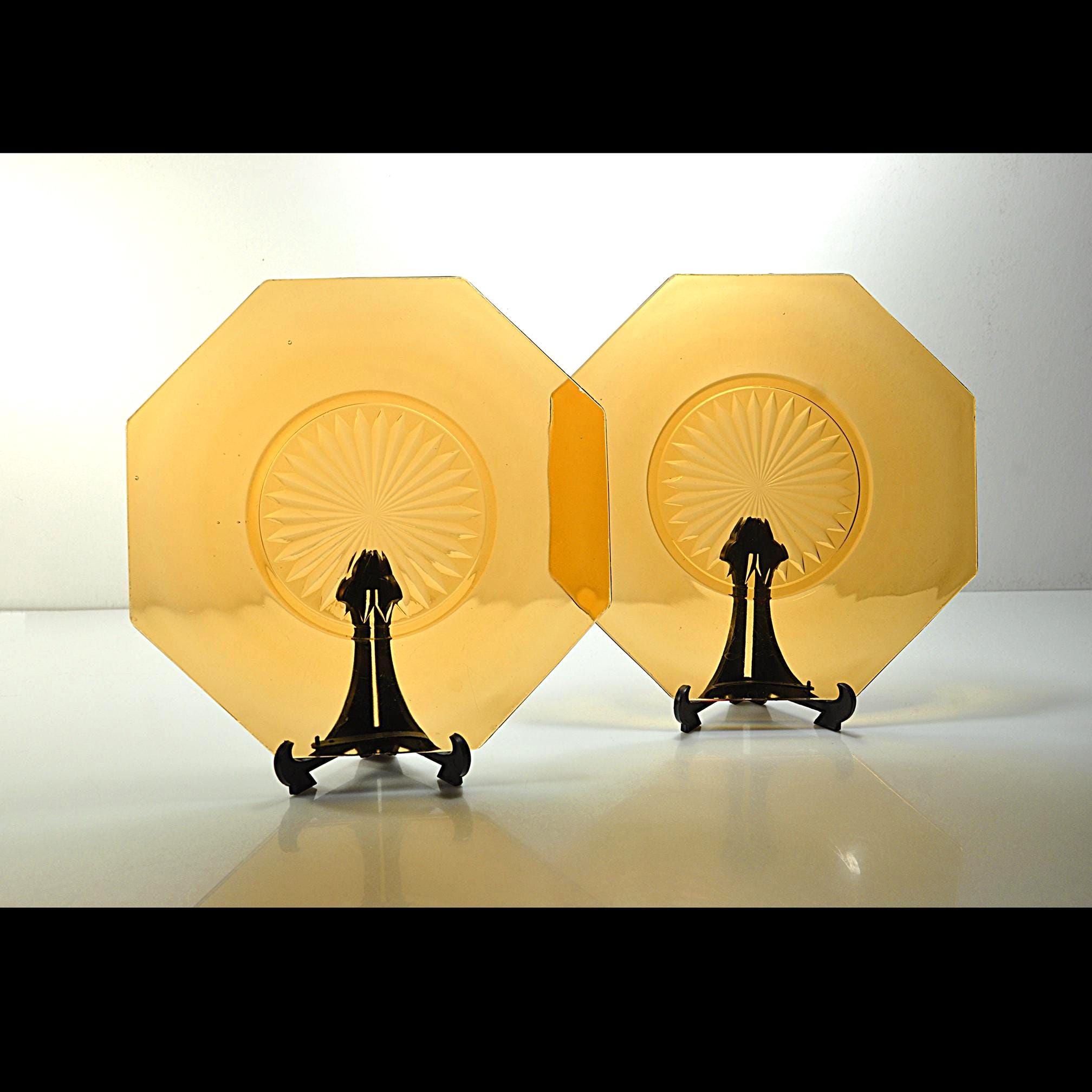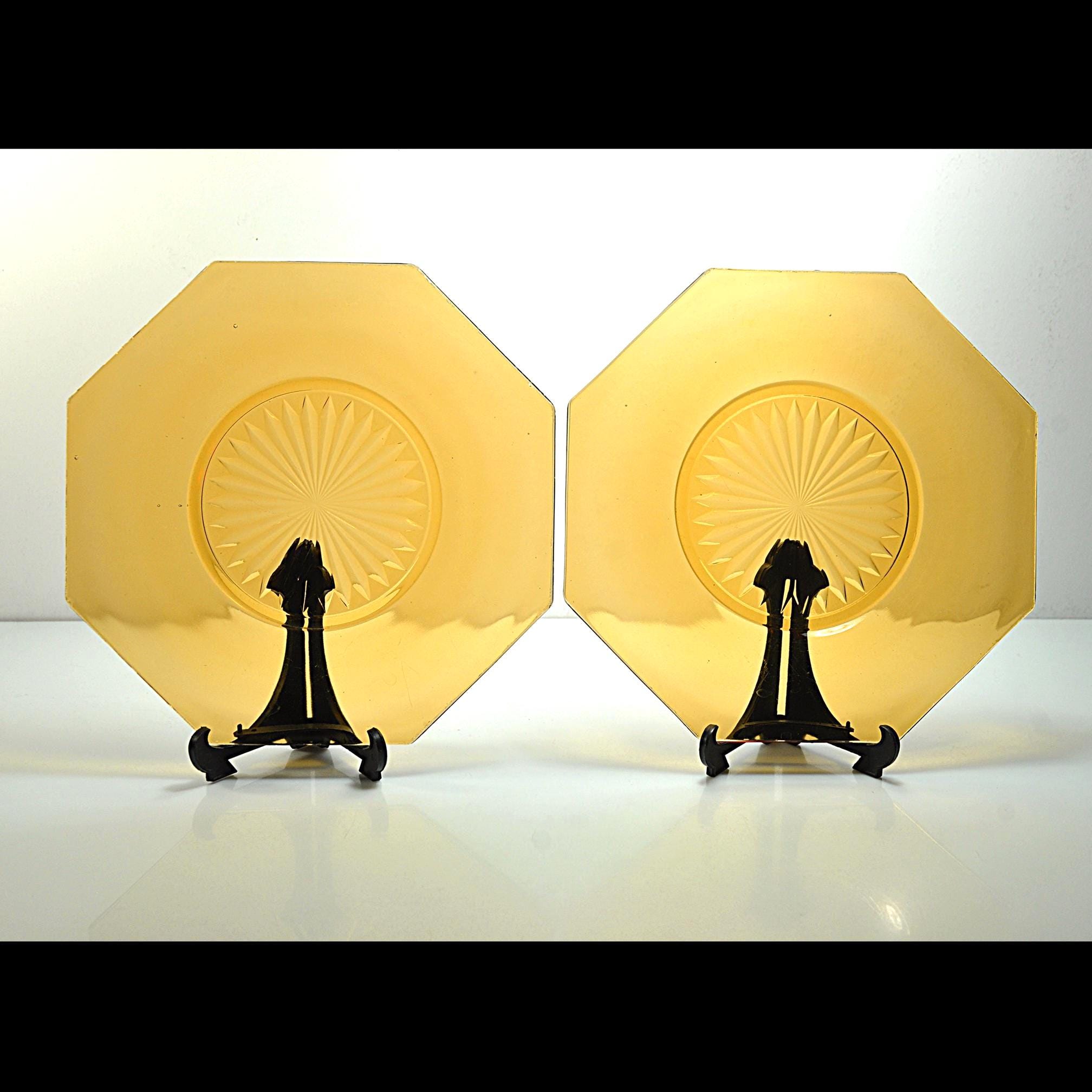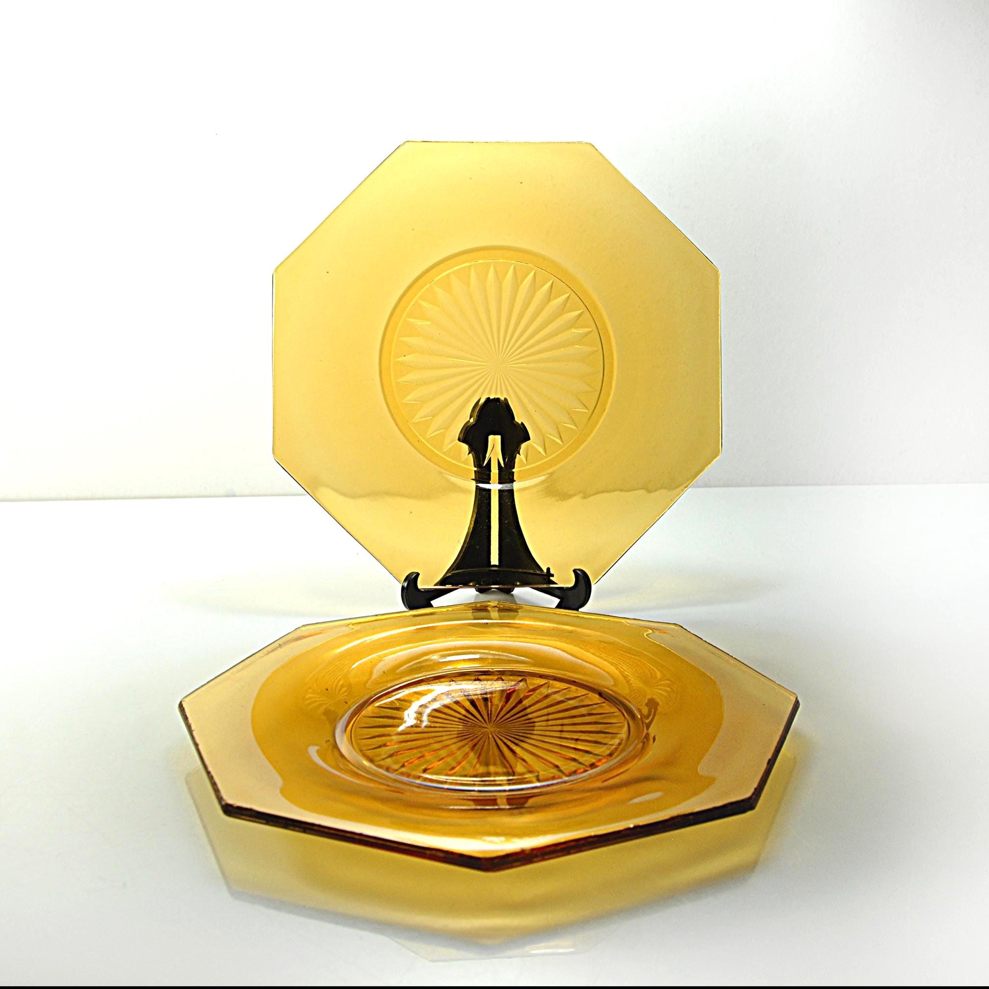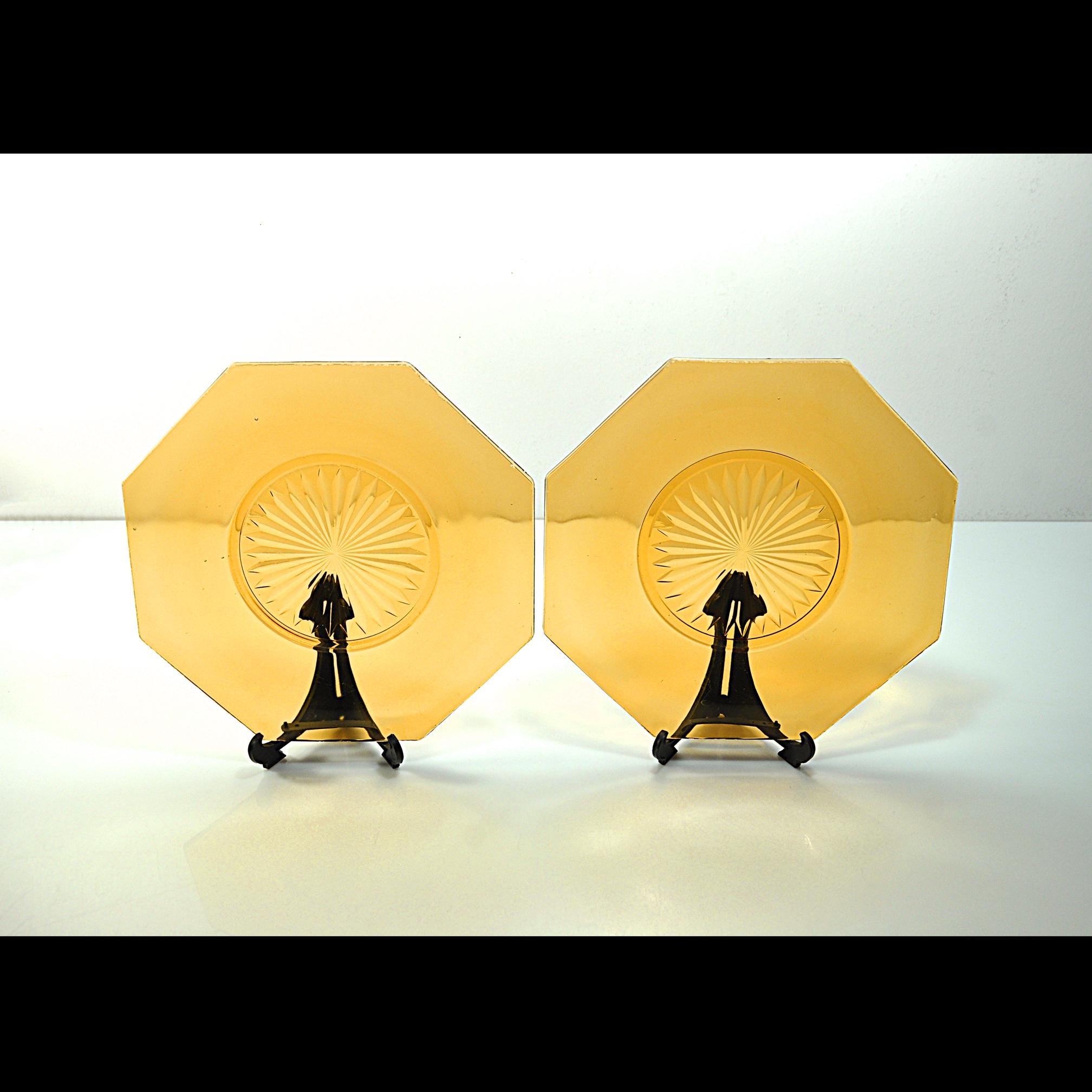 Amber glass always feels warm and welcoming on the table. These two vintage octagon plates have that beautiful deep amber color that was so popular in American homes during the Depression era. The plates feature a classic starburst pattern pressed into the center, a design that catches the light and gives the glass a little extra sparkle. Pieces like this were made to be used every day. Each plate measures about 8 inches across and has a distinctive octagon shape, giving them a subtle Art Deco feel. They make wonderful dessert or salad plates, and the amber color looks especially beautiful on a fall table or holiday setting. These plates are in good vintage condition overall. There are a few small flea-bite chips along parts of the rim, which is common for pressed glass pieces that have been around for nearly a century. There are no cracks, and the glass remains bright and clear.