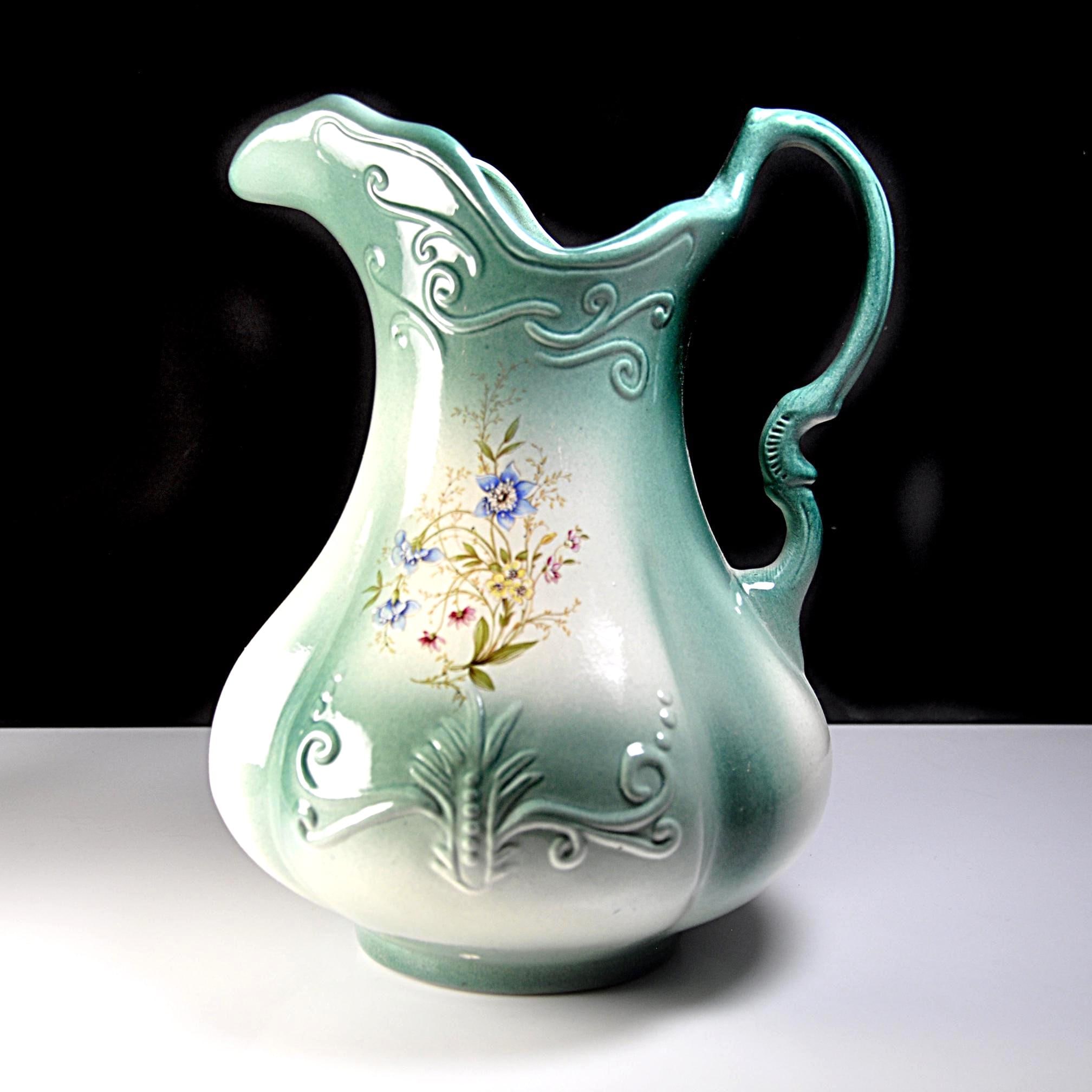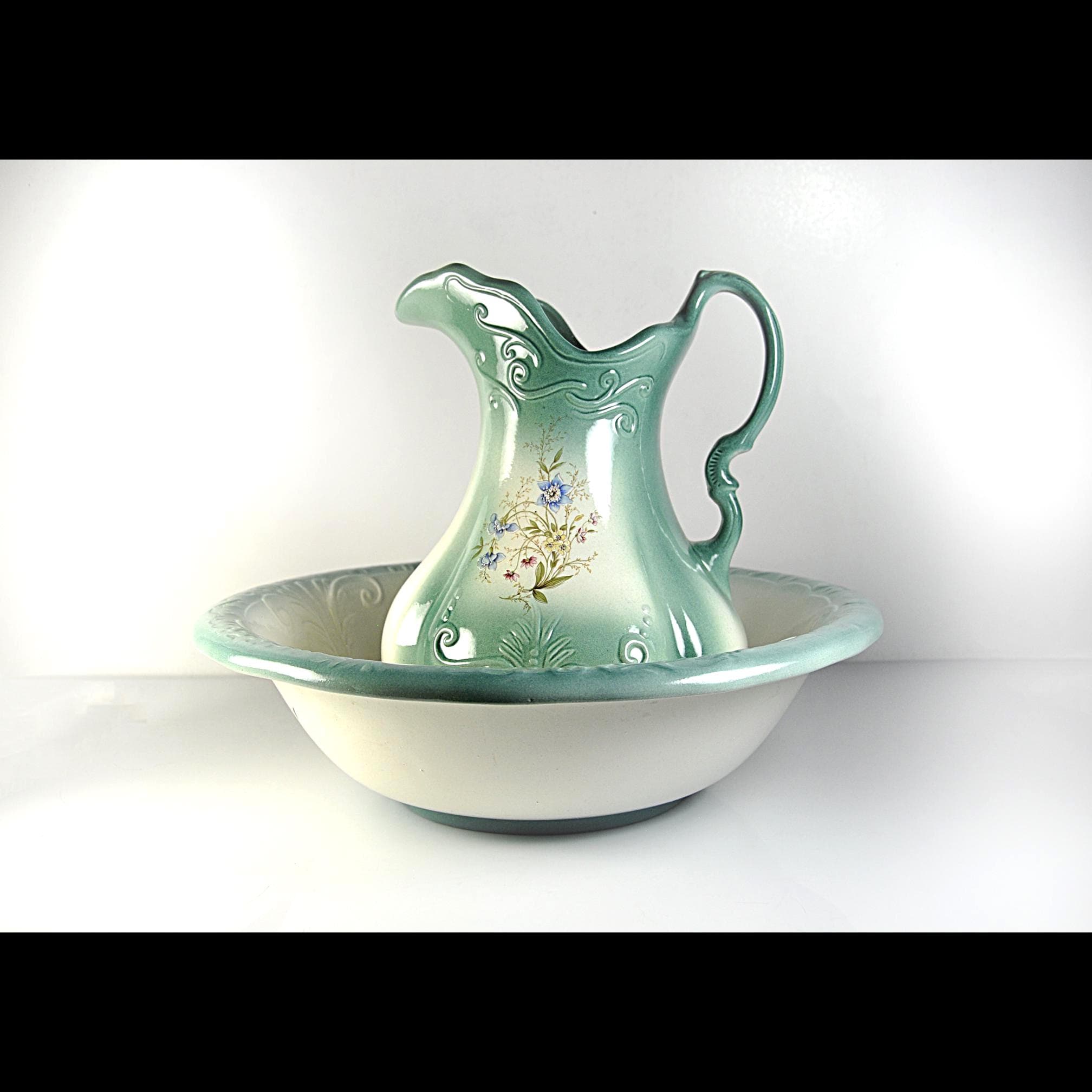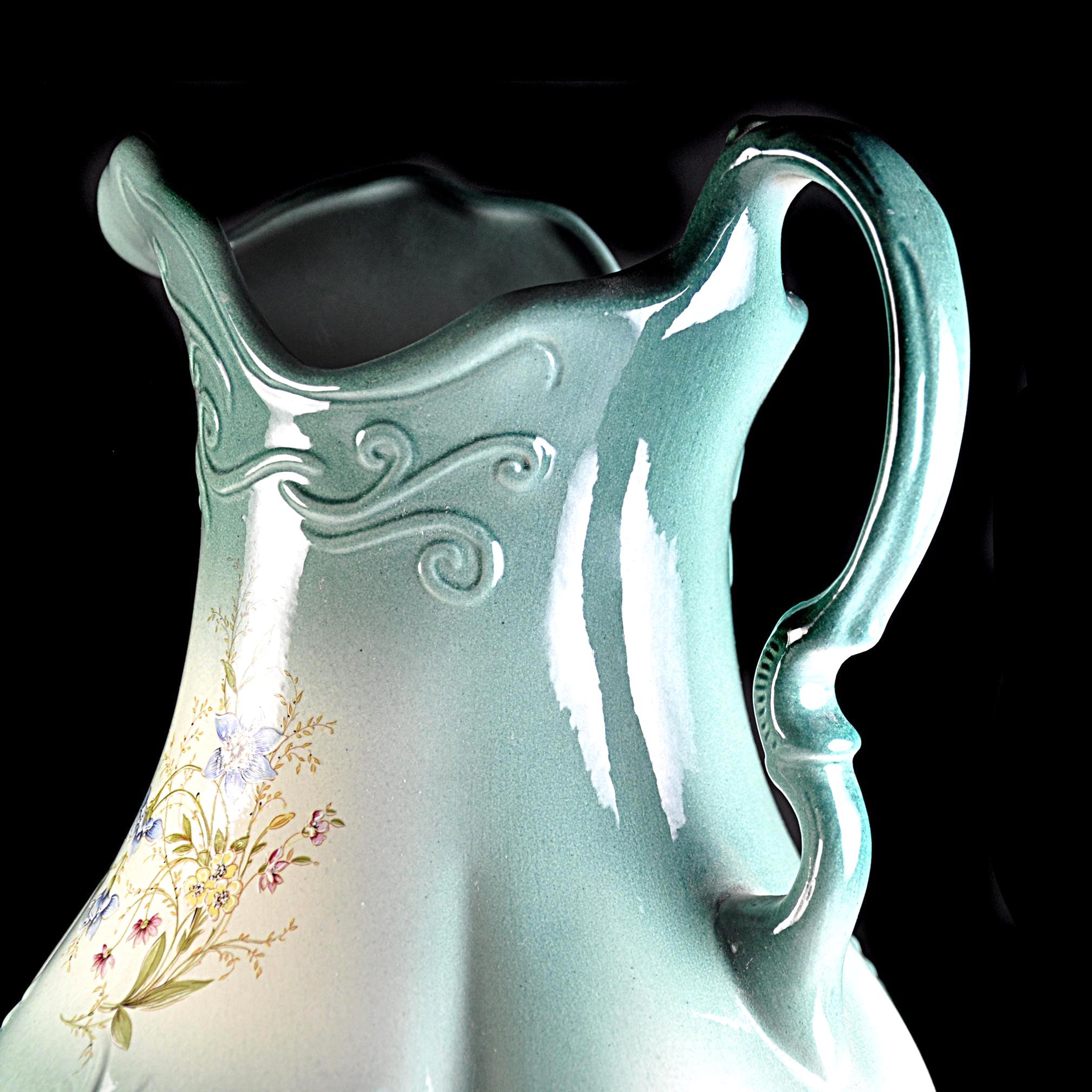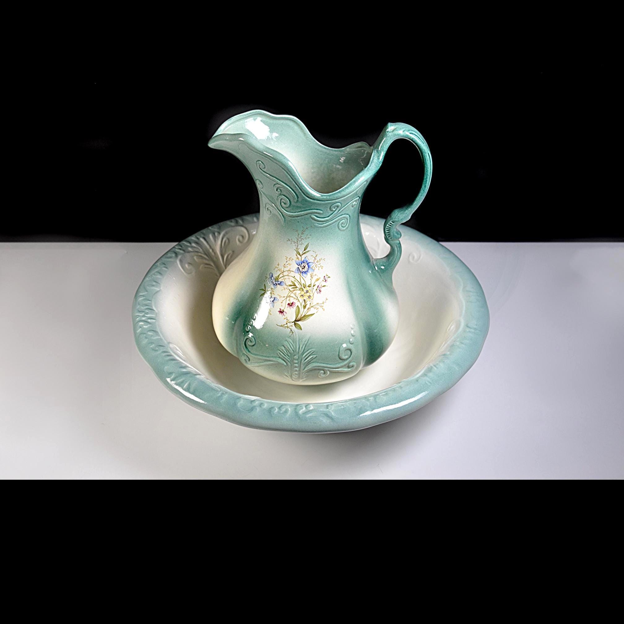 Before indoor plumbing became common, every bedroom had a washstand. Sitting on top of it would be a large bowl and pitcher just like this one, ready for the morning routine. Fresh water would be poured from the pitcher into the basin so hands and face could be washed before the day began. This ironstone wash bowl and pitcher set was made in England and carries the simple Ironstone England mark on the base. The design echoes the elegant Victorian washstand sets that were once found in homes throughout the late 1800s. What makes this set especially attractive is the soft aqua green shading around the edges. The color fades gently into creamy white ironstone and is accented by raised scrollwork molded into the pitcher and bowl. On the front of the pitcher is a delicate floral bouquet that adds a touch of old-fashioned charm. Today these sets are often used as decorative pieces. Many people place them on a washstand, dresser, or entry table. The large basin also makes a wonderful centerpiece filled with flowers or seasonal décor. A beautiful decorative washstand set that brings a bit of old-world charm into a modern home.
