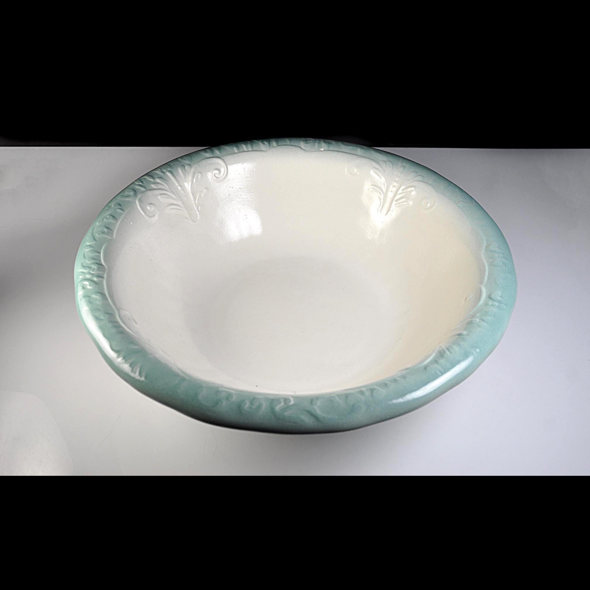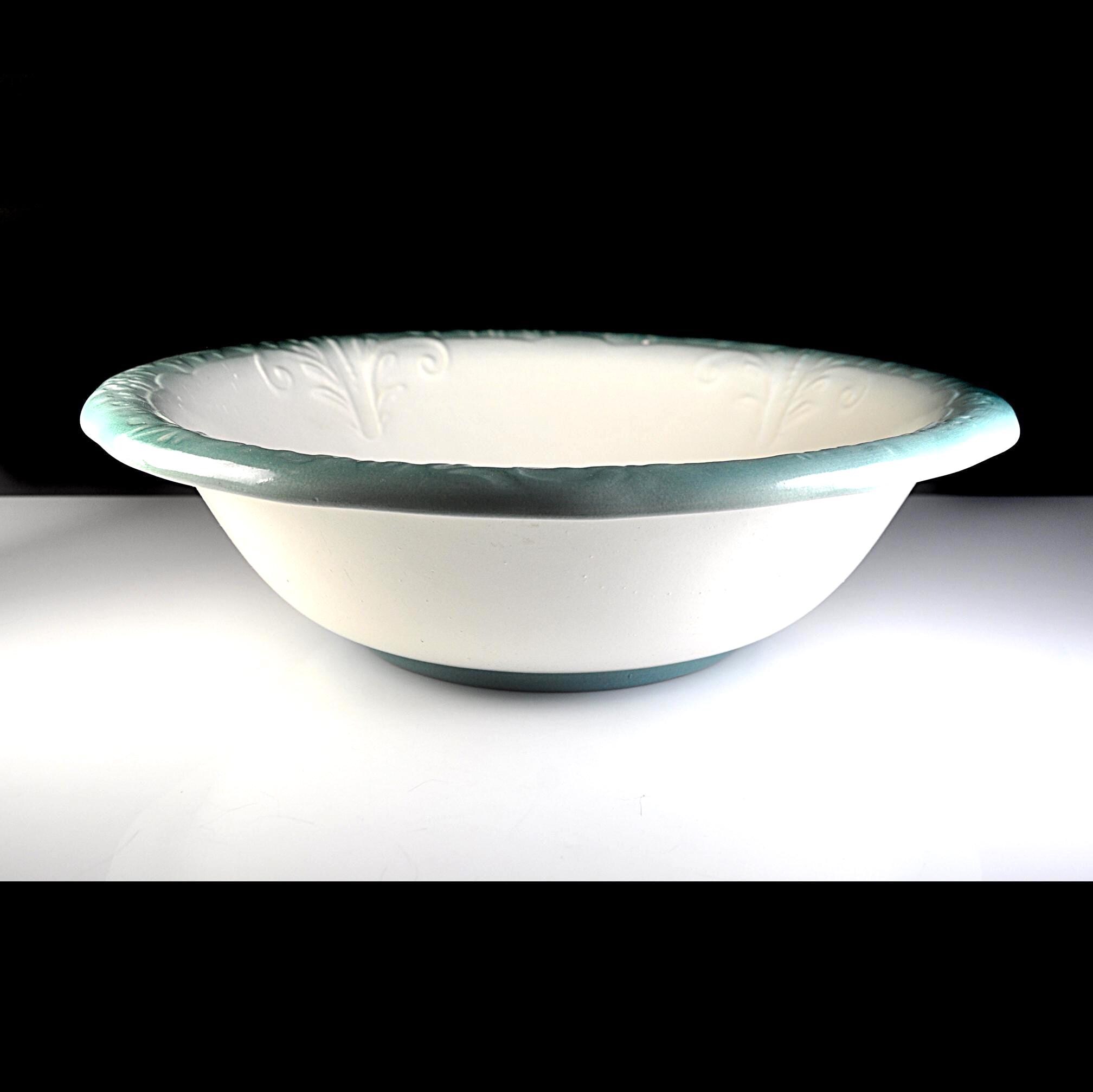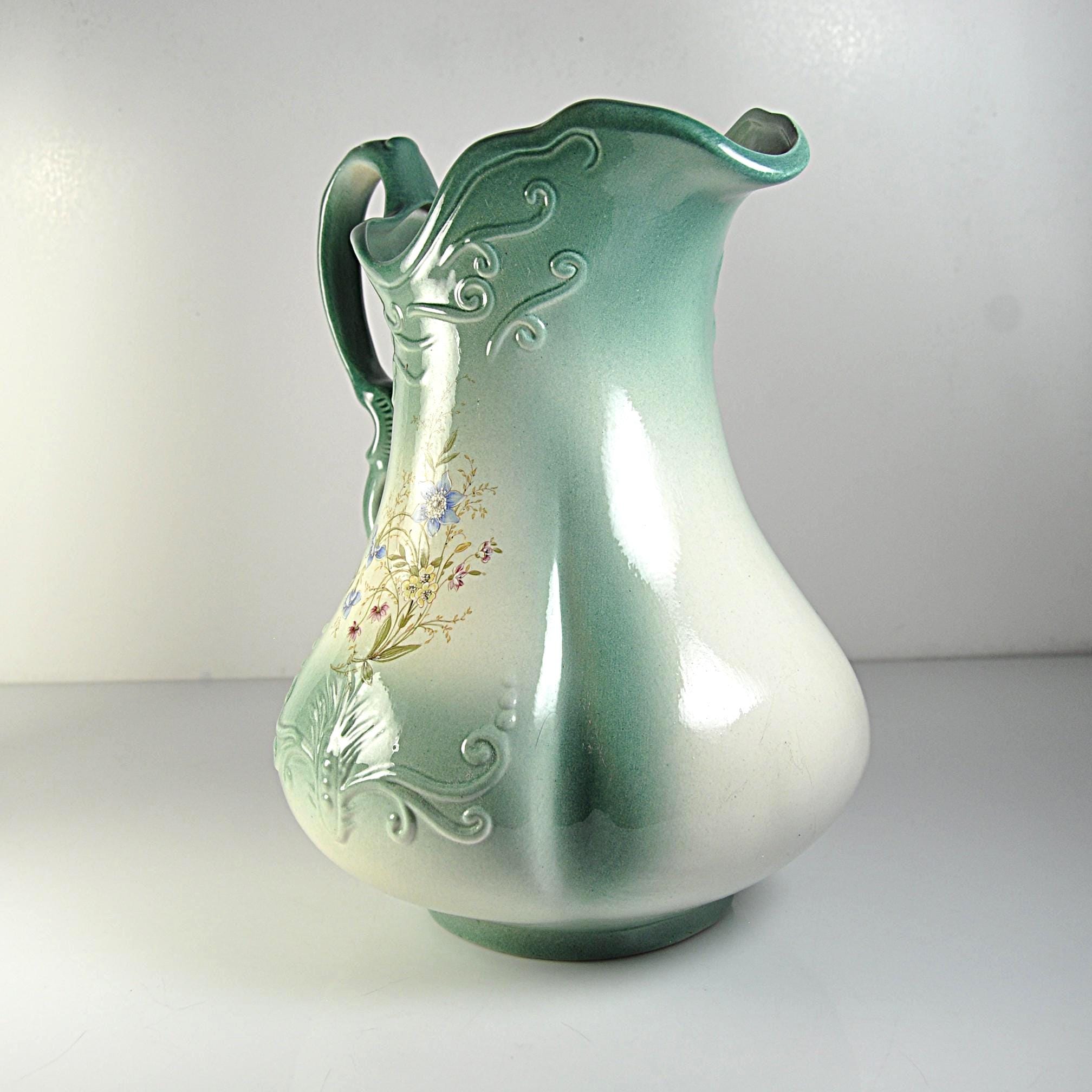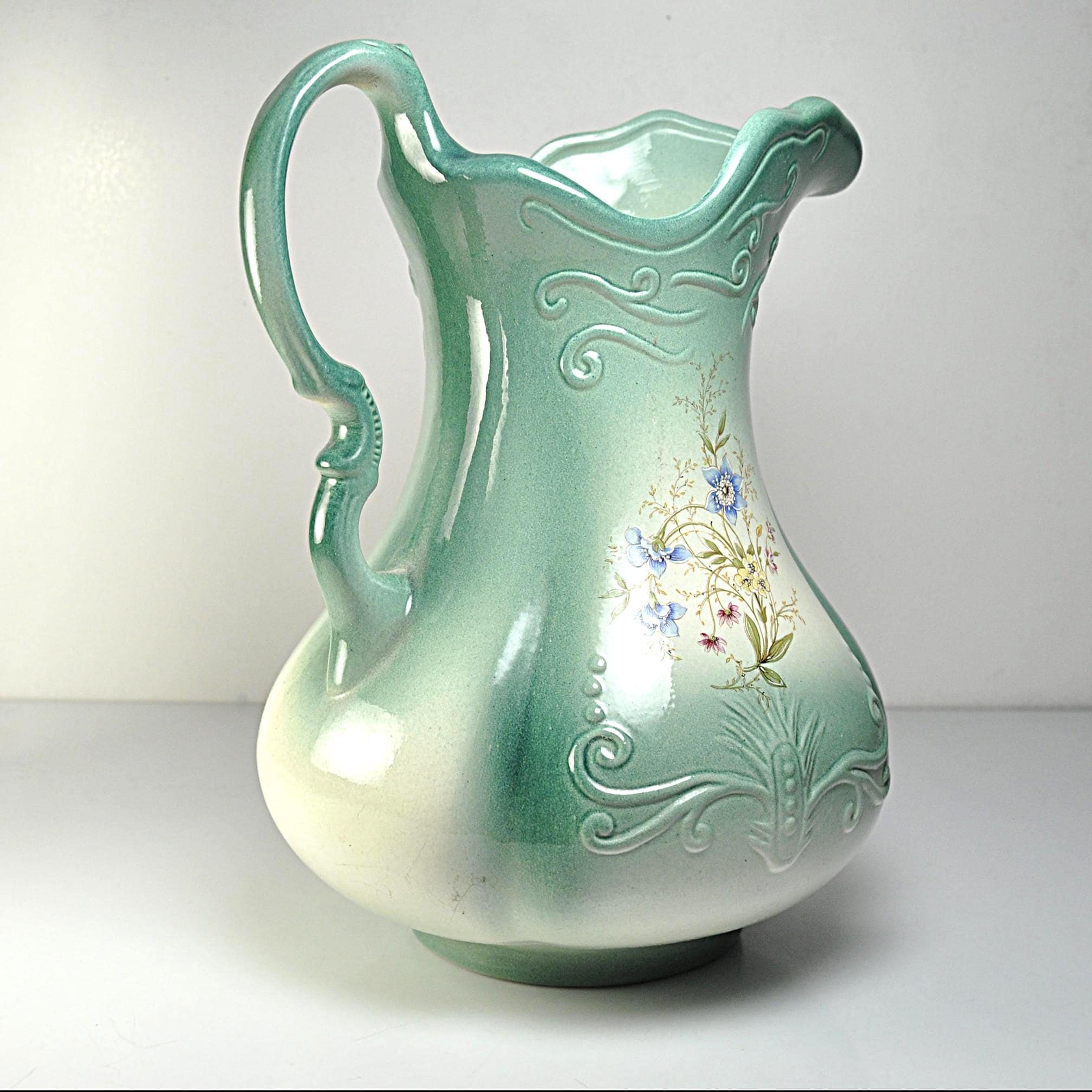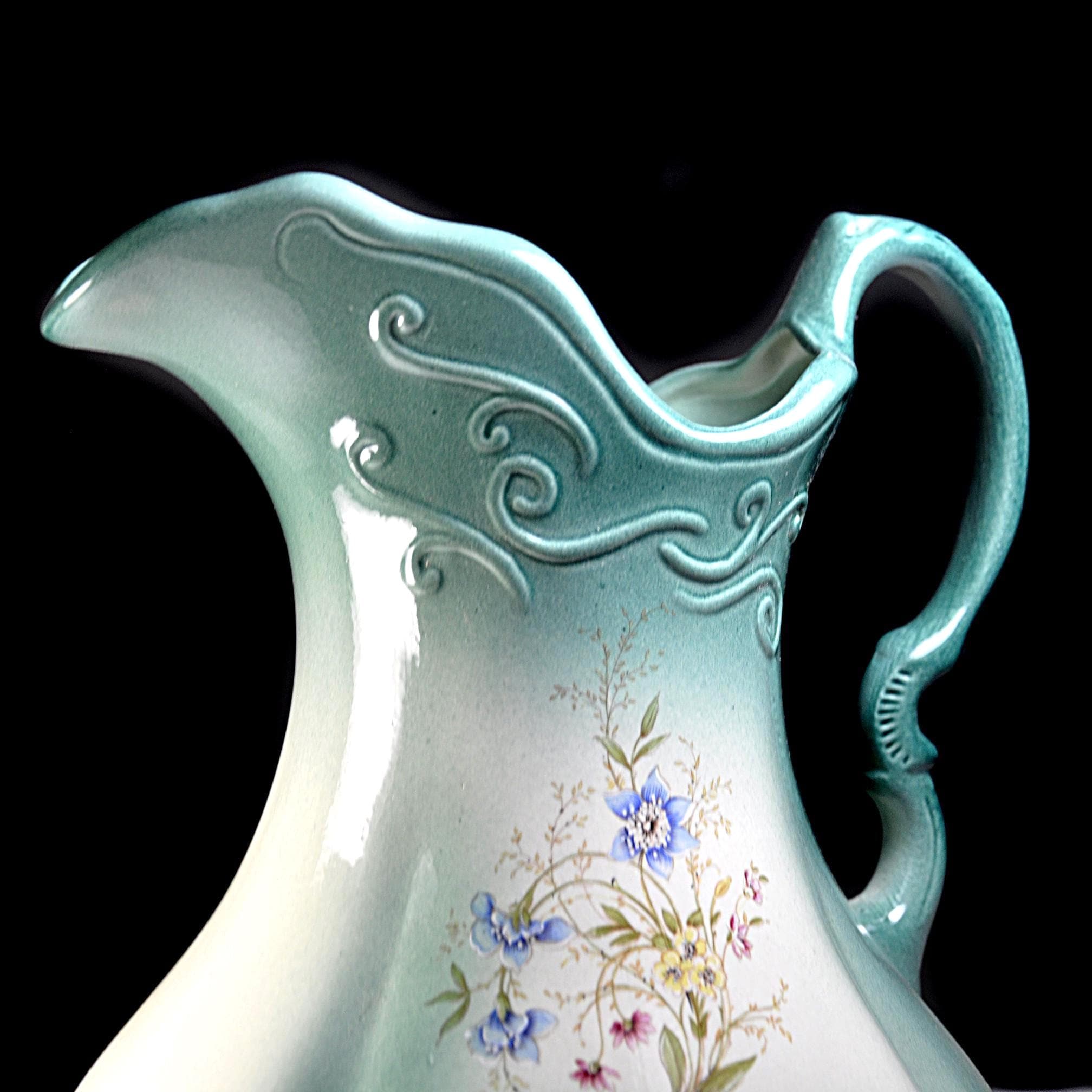 Before indoor plumbing became common, every bedroom had a washstand. Sitting on top of it would be a large bowl and pitcher just like this one, ready for the morning routine. Fresh water would be poured from the pitcher into the basin so hands and face could be washed before the day began. This ironstone wash bowl and pitcher set was made in England and carries the simple Ironstone England mark on the base. The design echoes the elegant Victorian washstand sets that were once found in homes throughout the late 1800s. What makes this set especially attractive is the soft aqua green shading around the edges. The color fades gently into creamy white ironstone and is accented by raised scrollwork molded into the pitcher and bowl. On the front of the pitcher is a delicate floral bouquet that adds a touch of old-fashioned charm. Today these sets are often used as decorative pieces. Many people place them on a washstand, dresser, or entry table. The large basin also makes a wonderful centerpiece filled with flowers or seasonal décor. A beautiful decorative washstand set that brings a bit of old-world charm into a modern home.