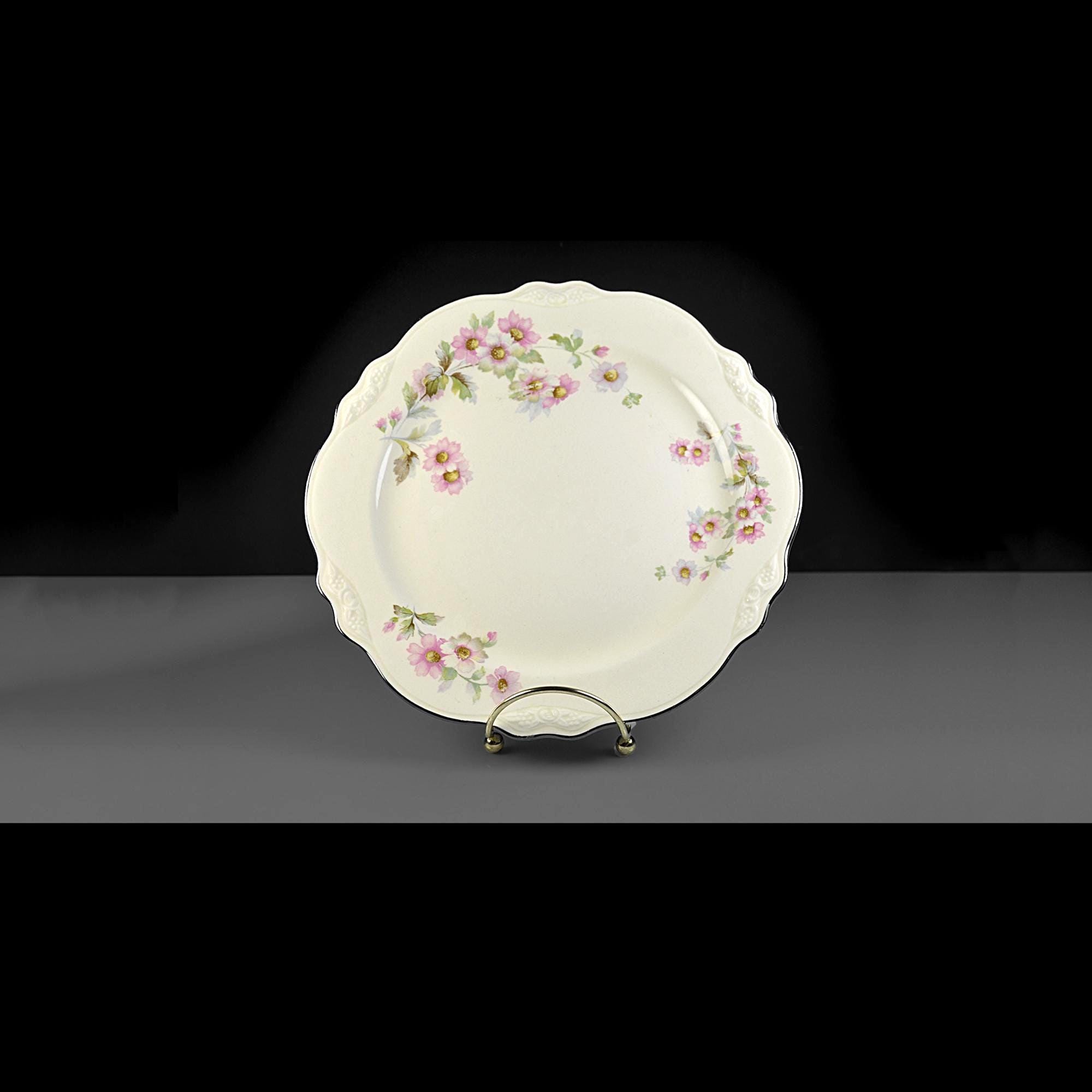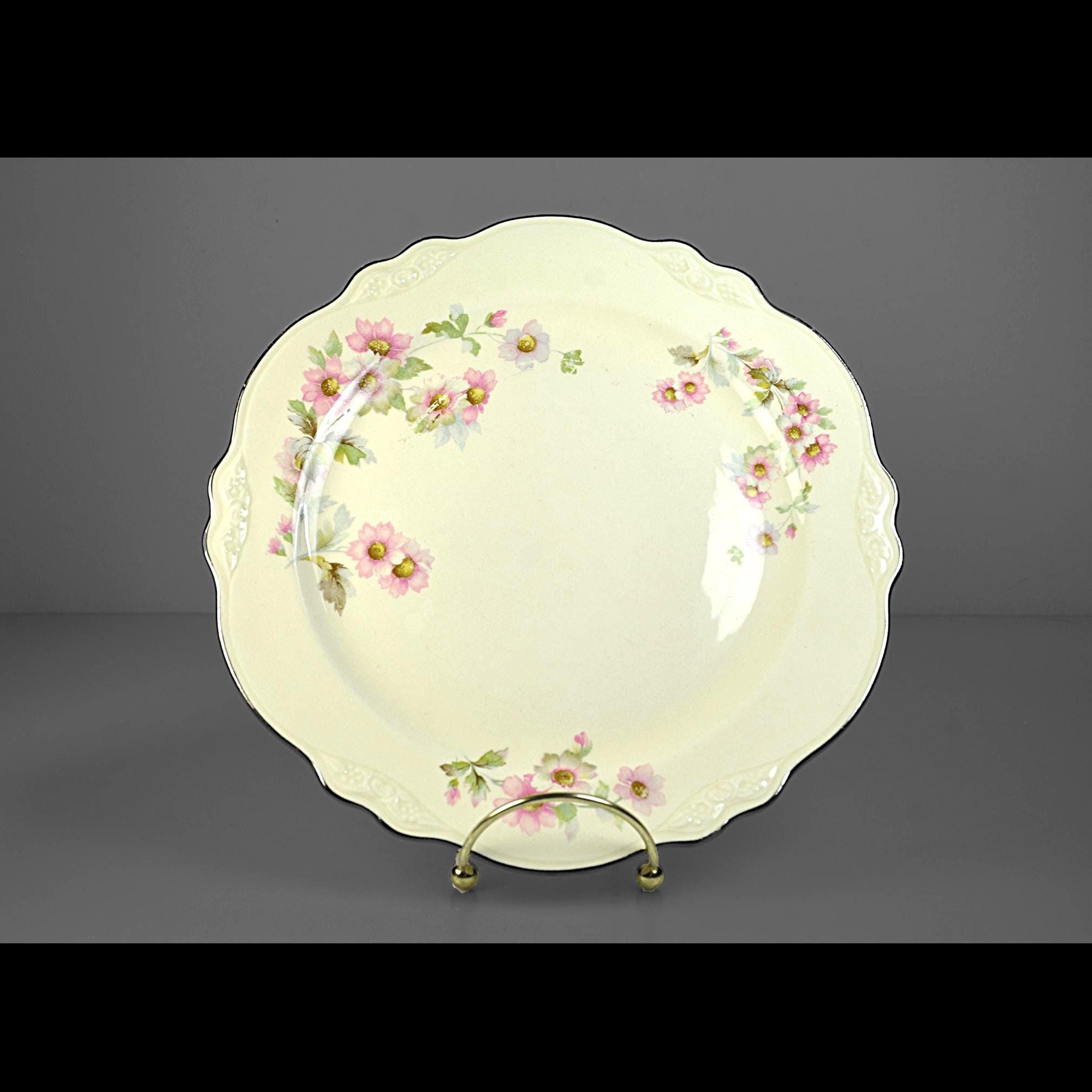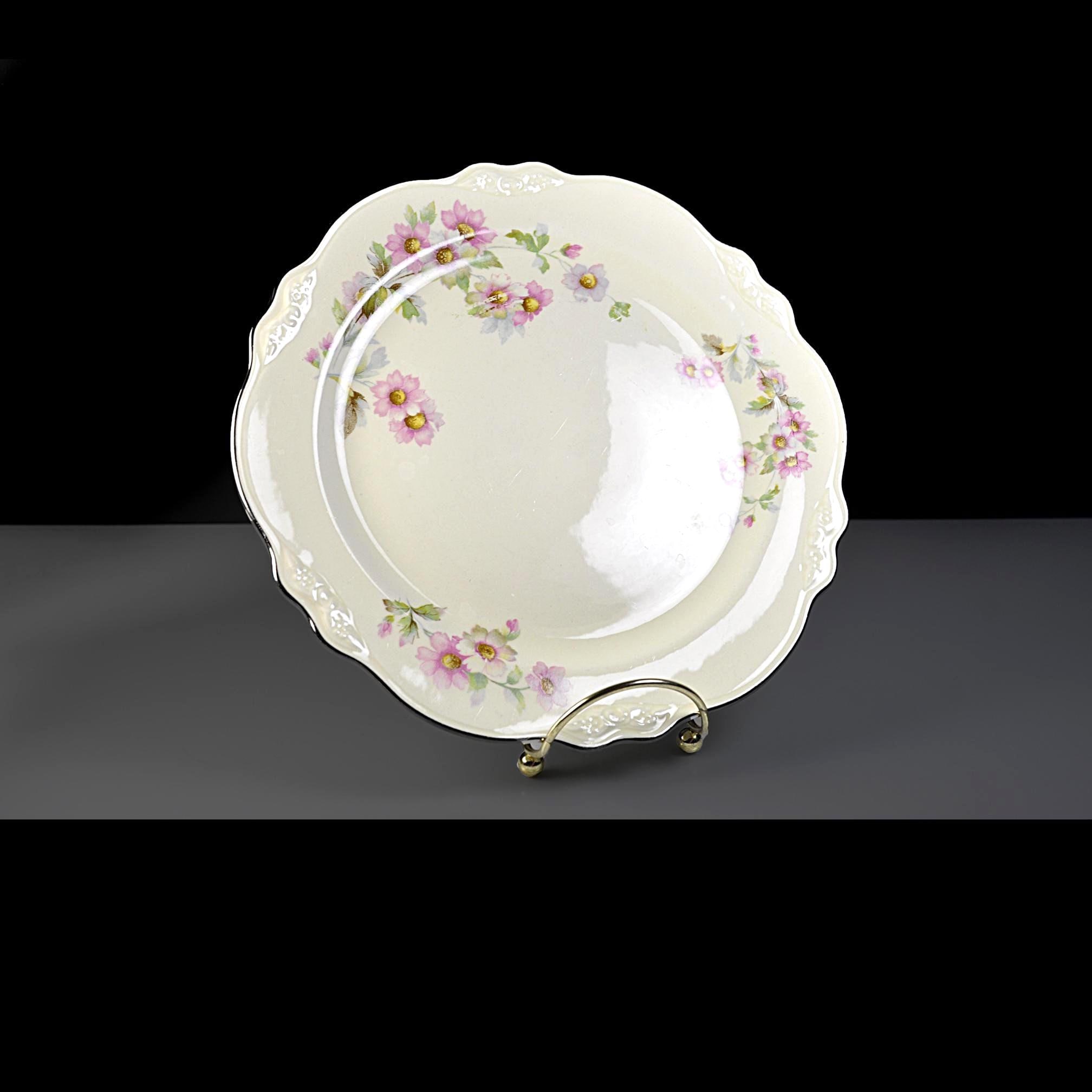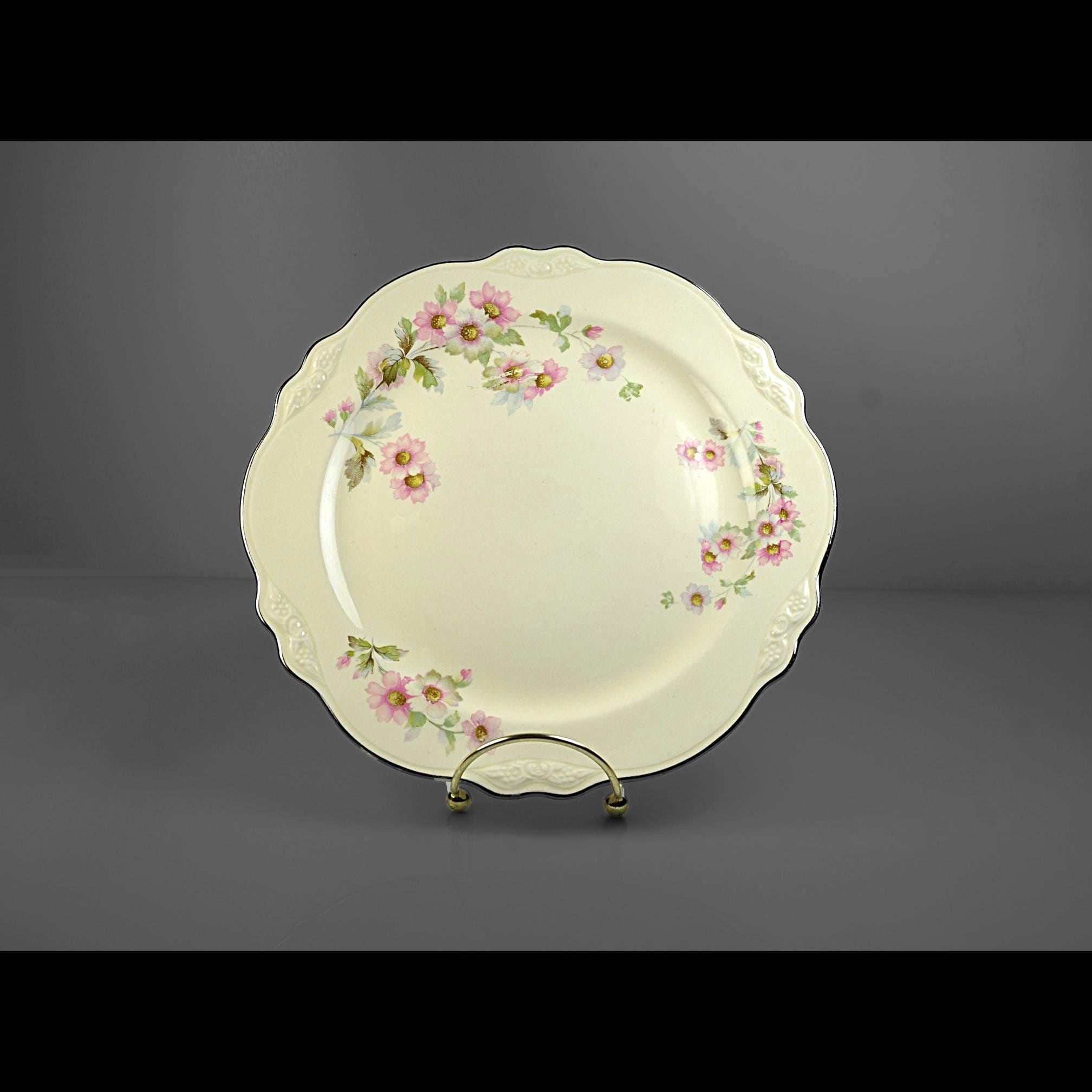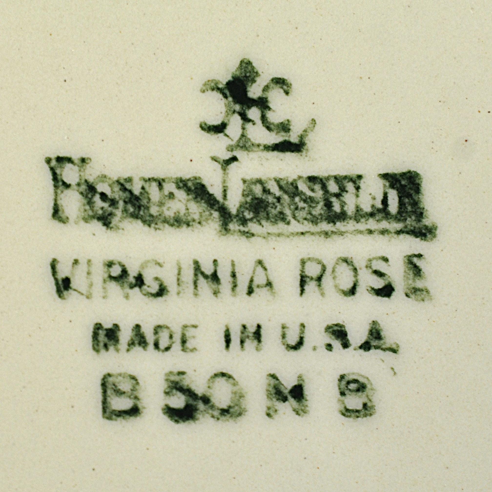 This Homer Laughlin luncheon plate has a quiet elegance about it. In the well-known Virginia Rose shape, it has that gently scalloped rim and soft embossed detail that gives it a nice graceful look. Across the ivory china surface are delicate clusters of pink flowers with soft green leaves, scattered lightly around the plate. The design feels cheerful and light, like something that would have been set on a sunny luncheon table decades ago. Around the edge is a thin platinum trim, which still shows nicely with only light rubbing from age and use. Homer Laughlin introduced the Virginia Rose shape in the early 1930s, and it remained popular for many years. This plate was made in 1950, when these floral luncheon sets were common in American homes. It’s a versatile piece of vintage china that works well for collectors looking to replace a missing plate, or simply for someone who enjoys mixing vintage pieces into everyday table settings.