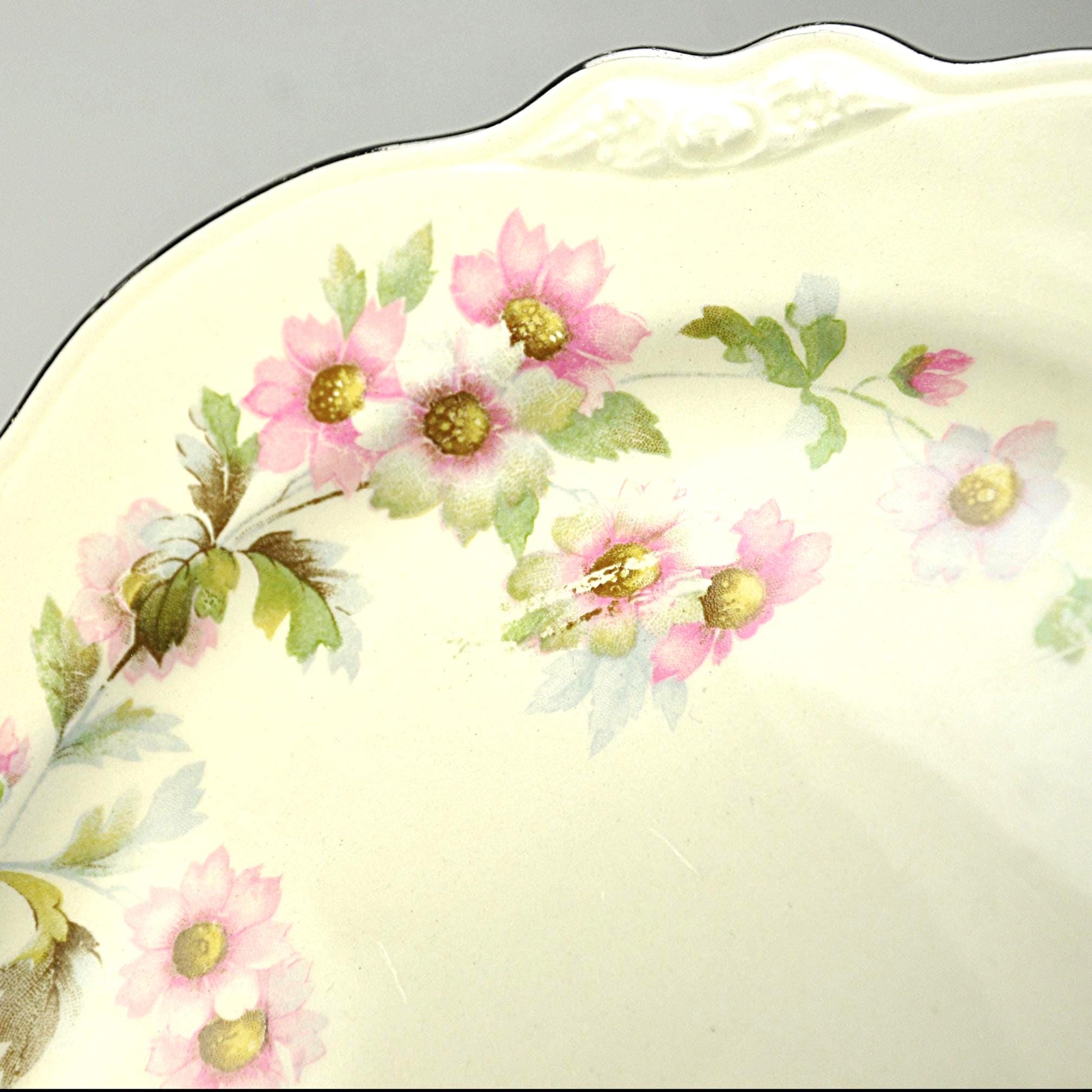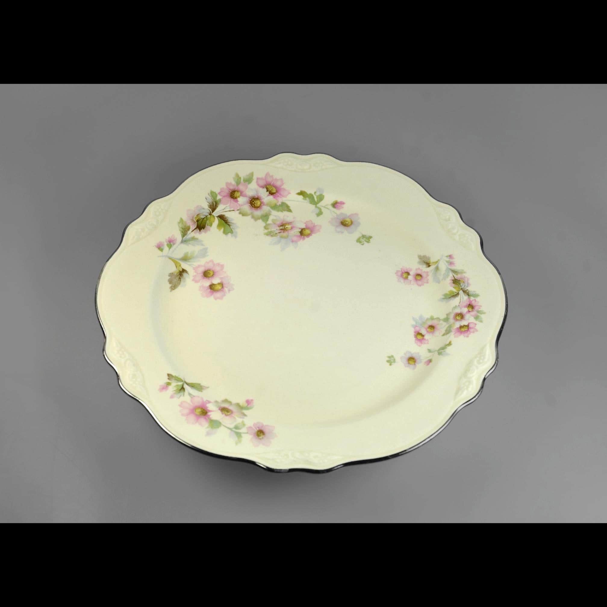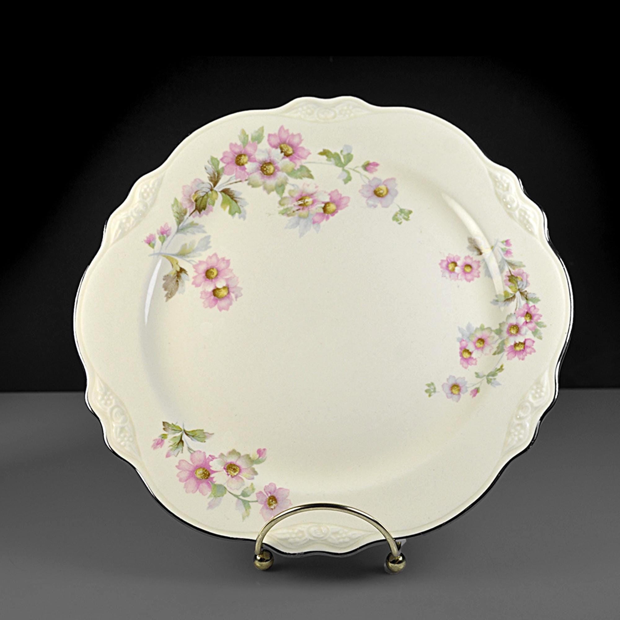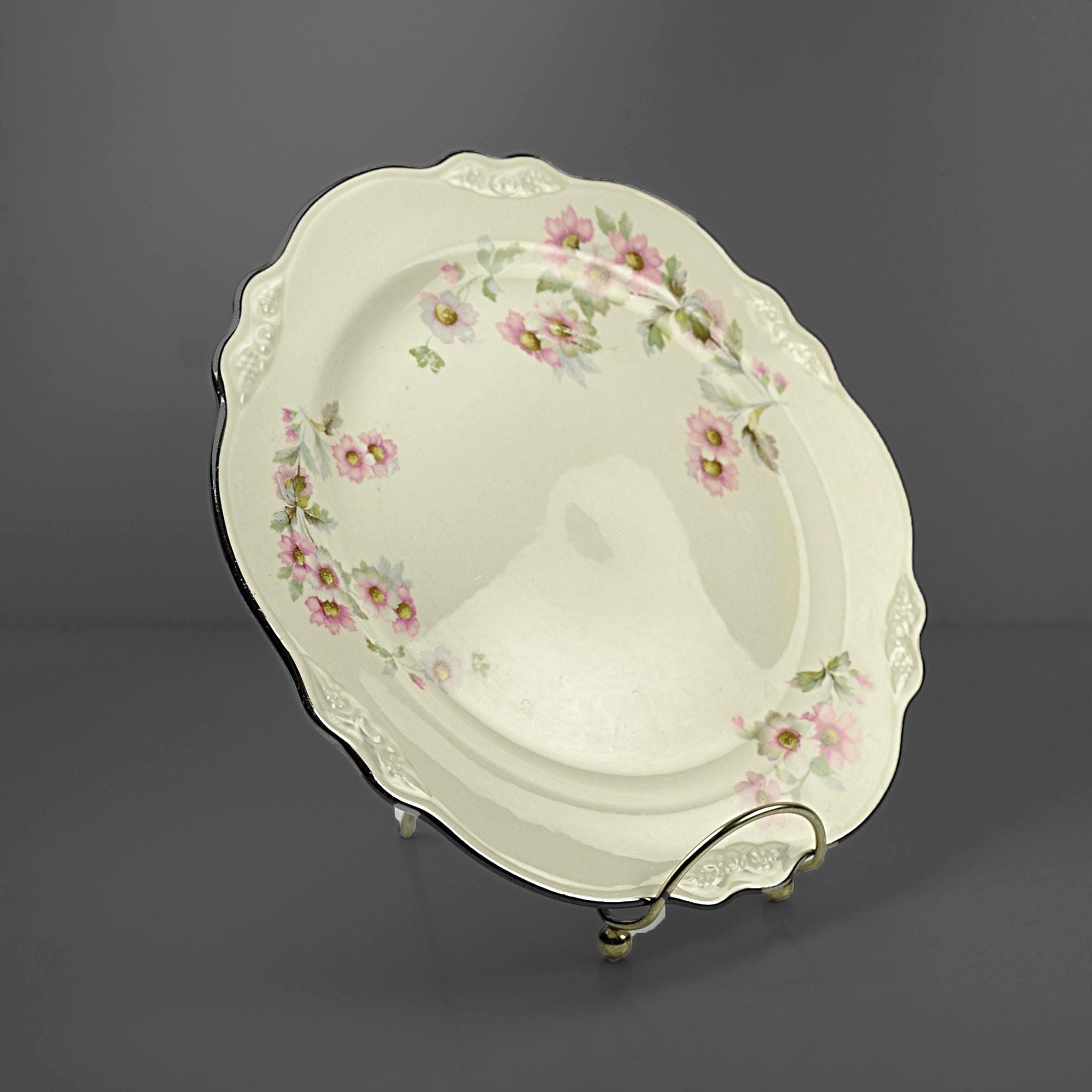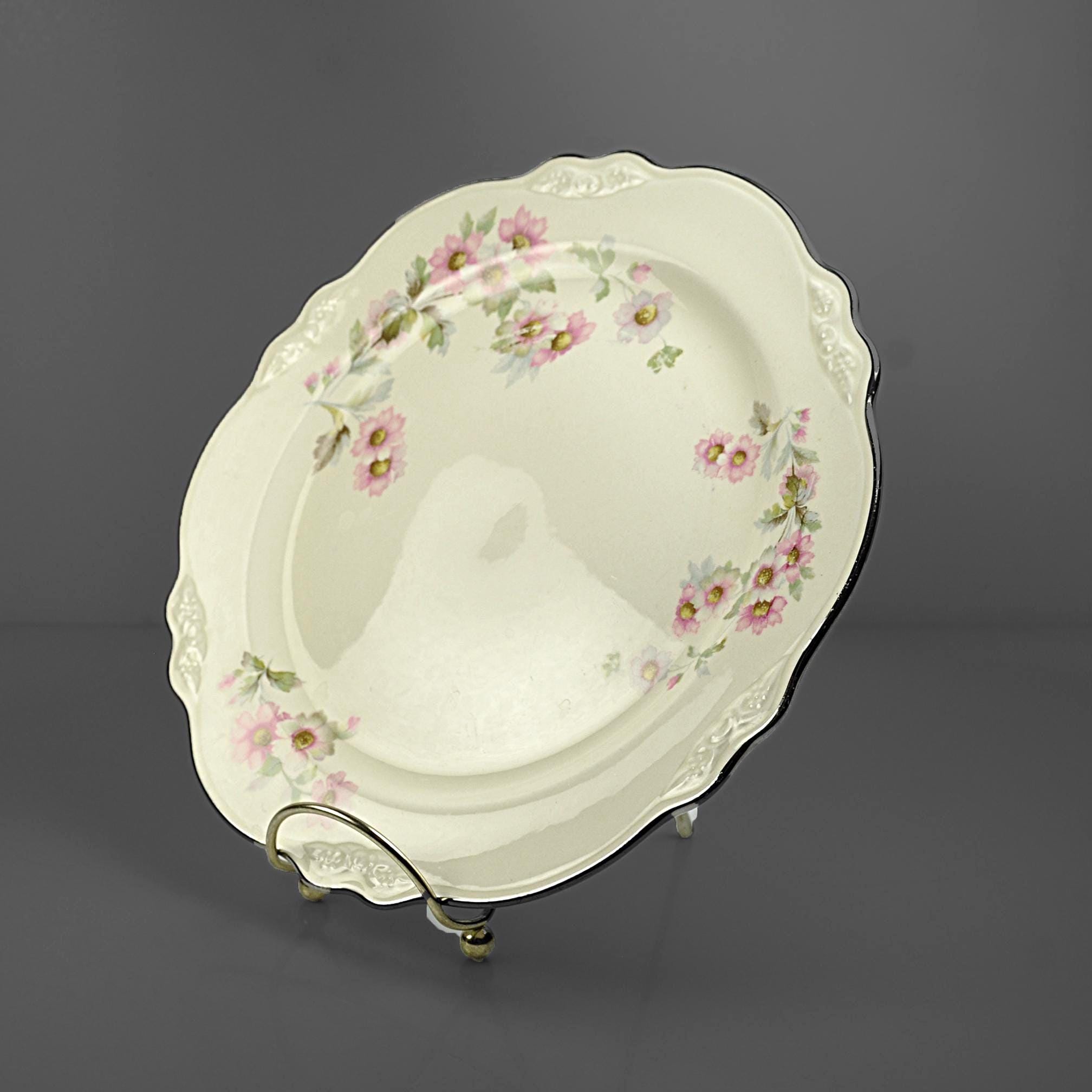 This Homer Laughlin luncheon plate has a quiet elegance about it. In the well-known Virginia Rose shape, it has that gently scalloped rim and soft embossed detail that gives it a nice graceful look. Across the ivory china surface are delicate clusters of pink flowers with soft green leaves, scattered lightly around the plate. The design feels cheerful and light, like something that would have been set on a sunny luncheon table decades ago. Around the edge is a thin platinum trim, which still shows nicely with only light rubbing from age and use. Homer Laughlin introduced the Virginia Rose shape in the early 1930s, and it remained popular for many years. This plate was made in 1950, when these floral luncheon sets were common in American homes. It’s a versatile piece of vintage china that works well for collectors looking to replace a missing plate, or simply for someone who enjoys mixing vintage pieces into everyday table settings.