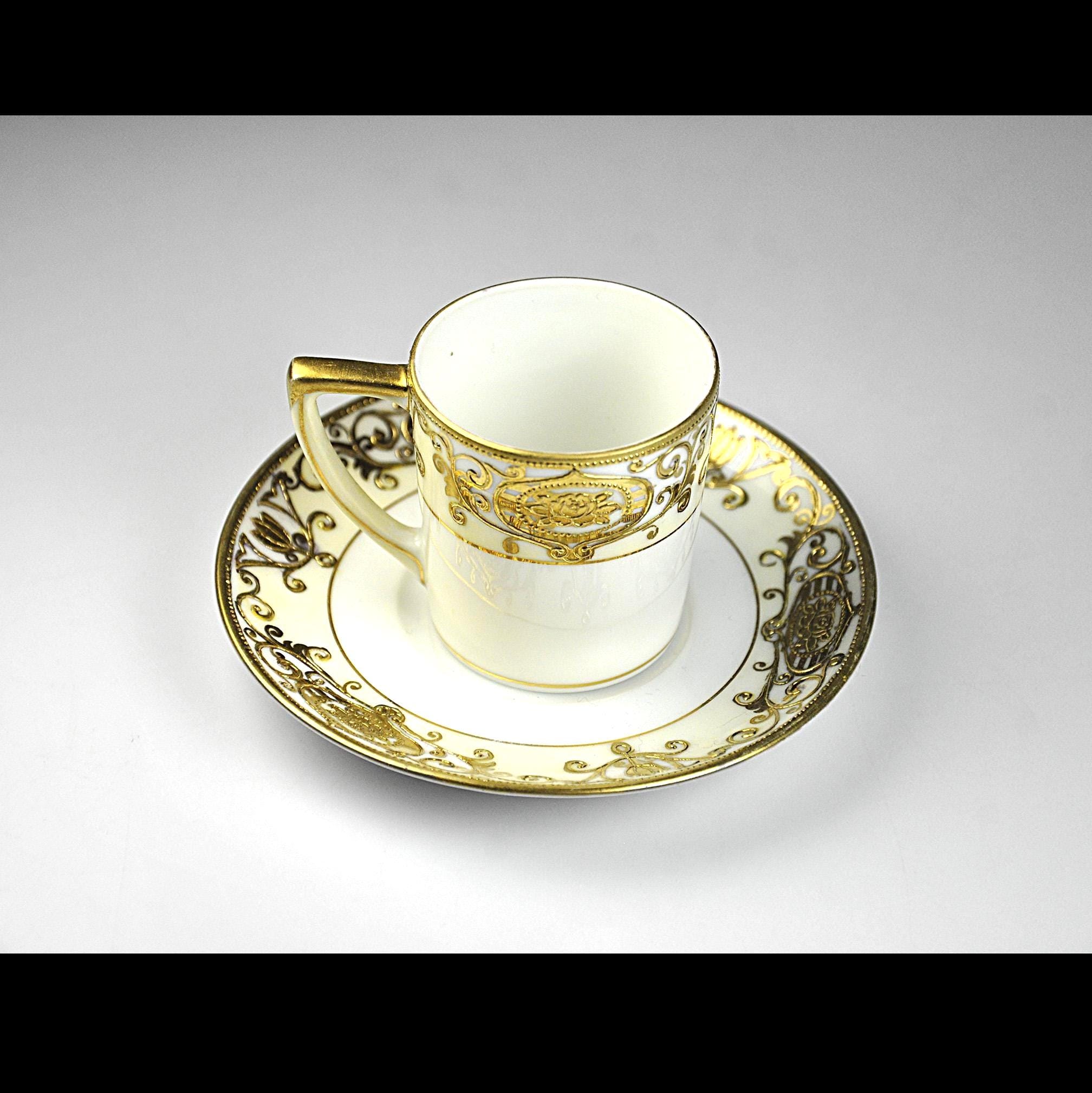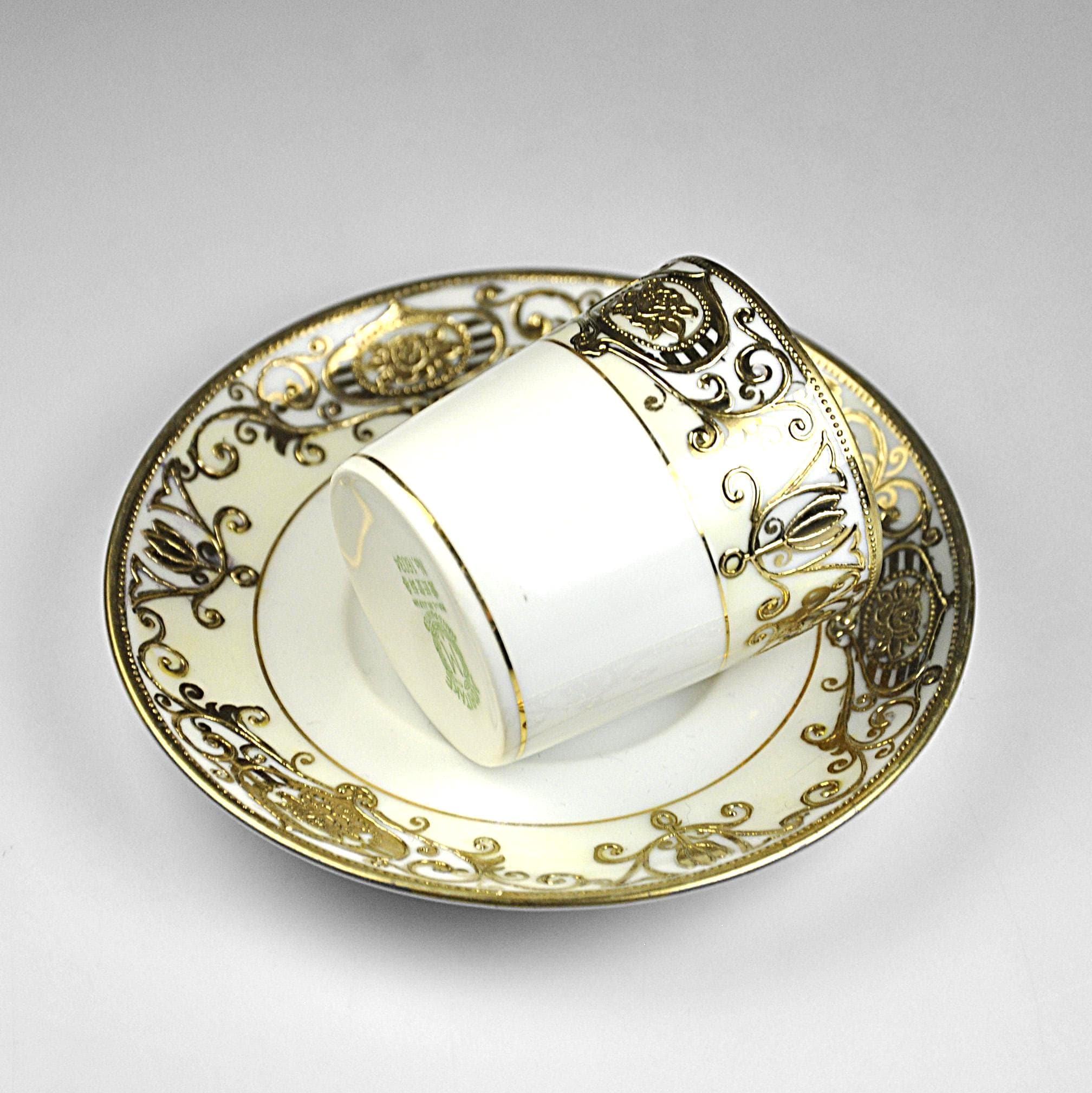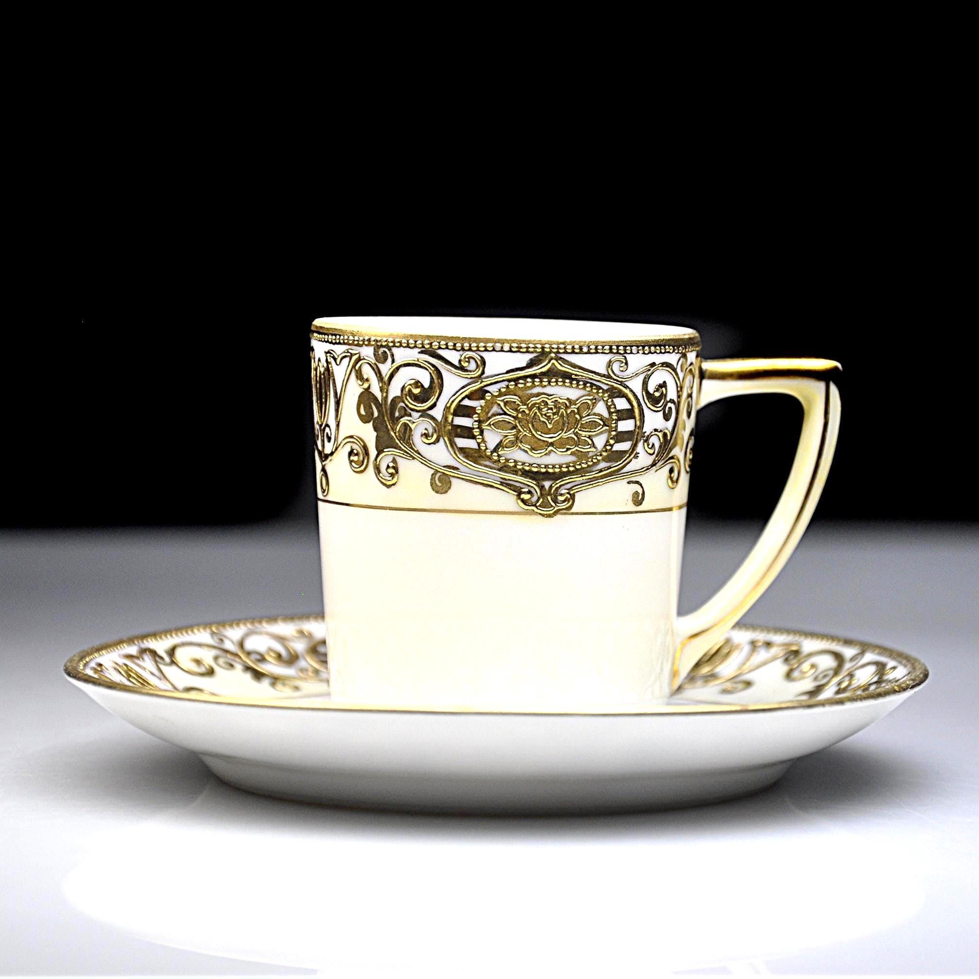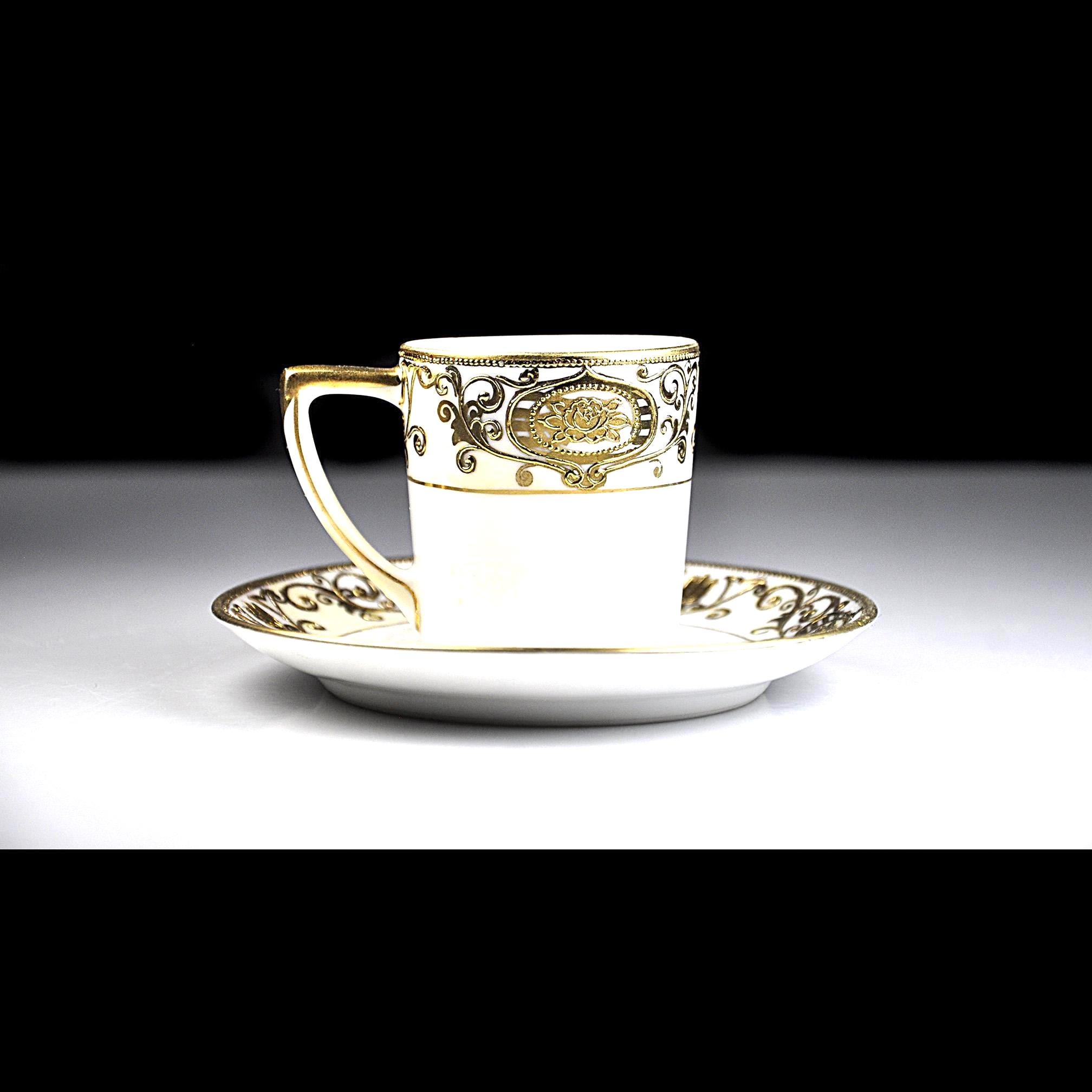 This Noritake demitasse china set pattern catches your eye right away. The gold decoration on this little cup and saucer is wonderfully detailed, with scrolling vines, small rose medallions, and delicate beading that almost looks like jewelry wrapped around the porcelain.