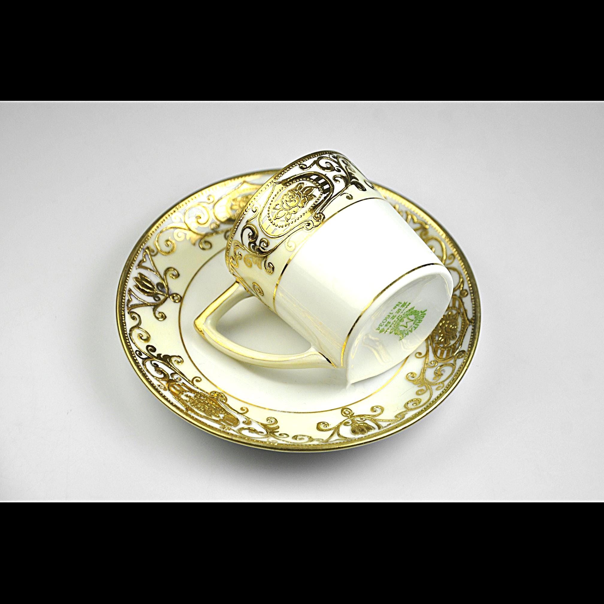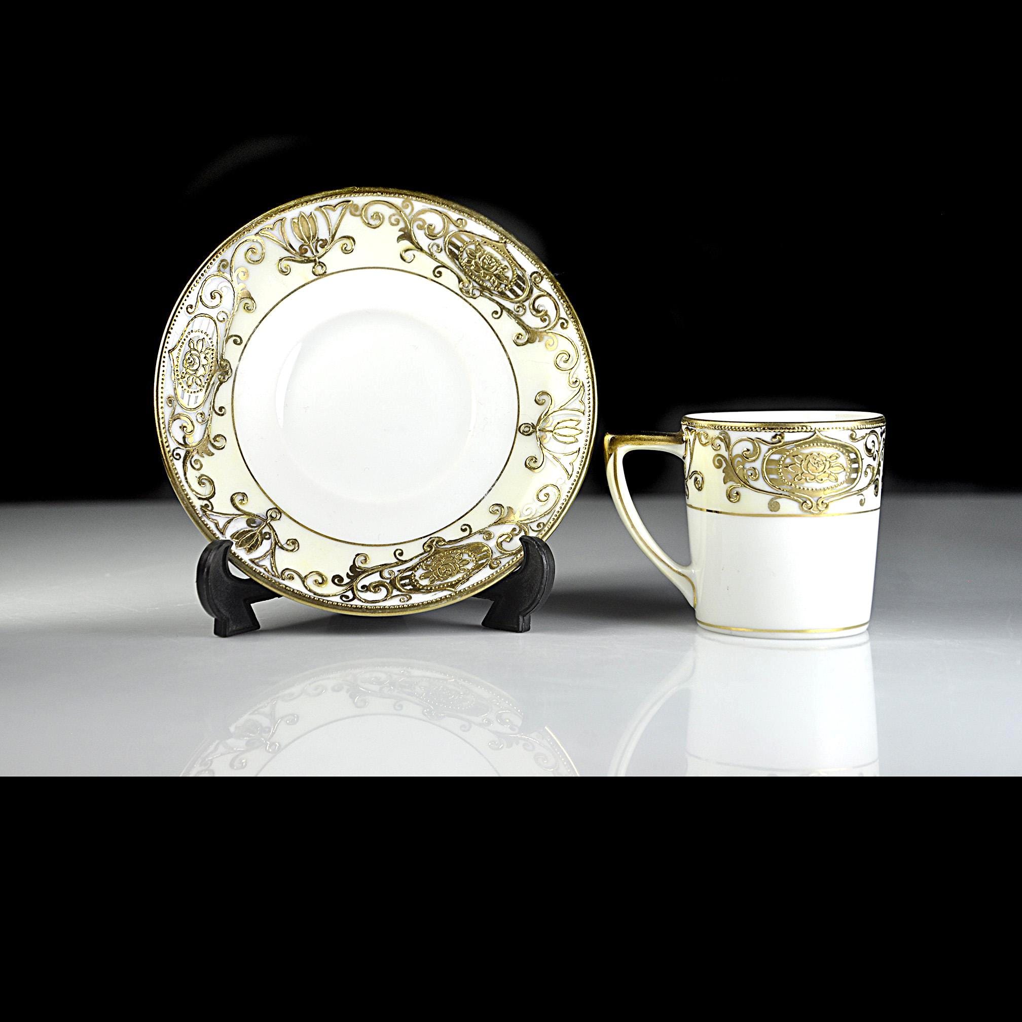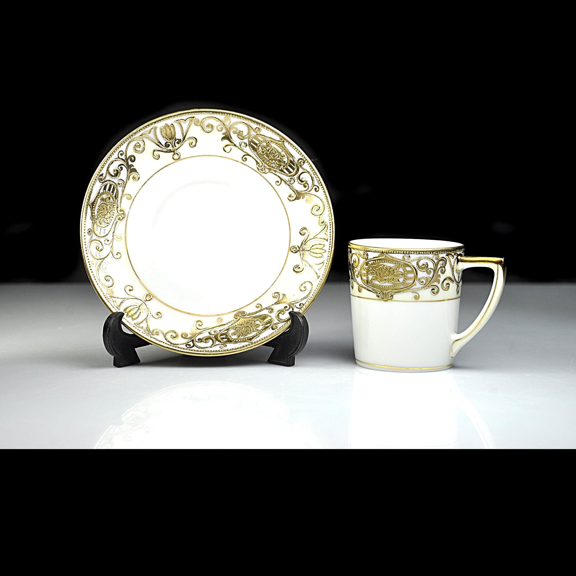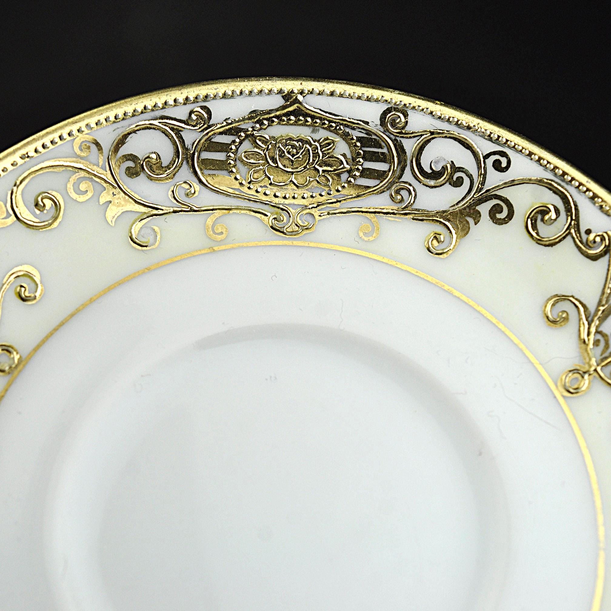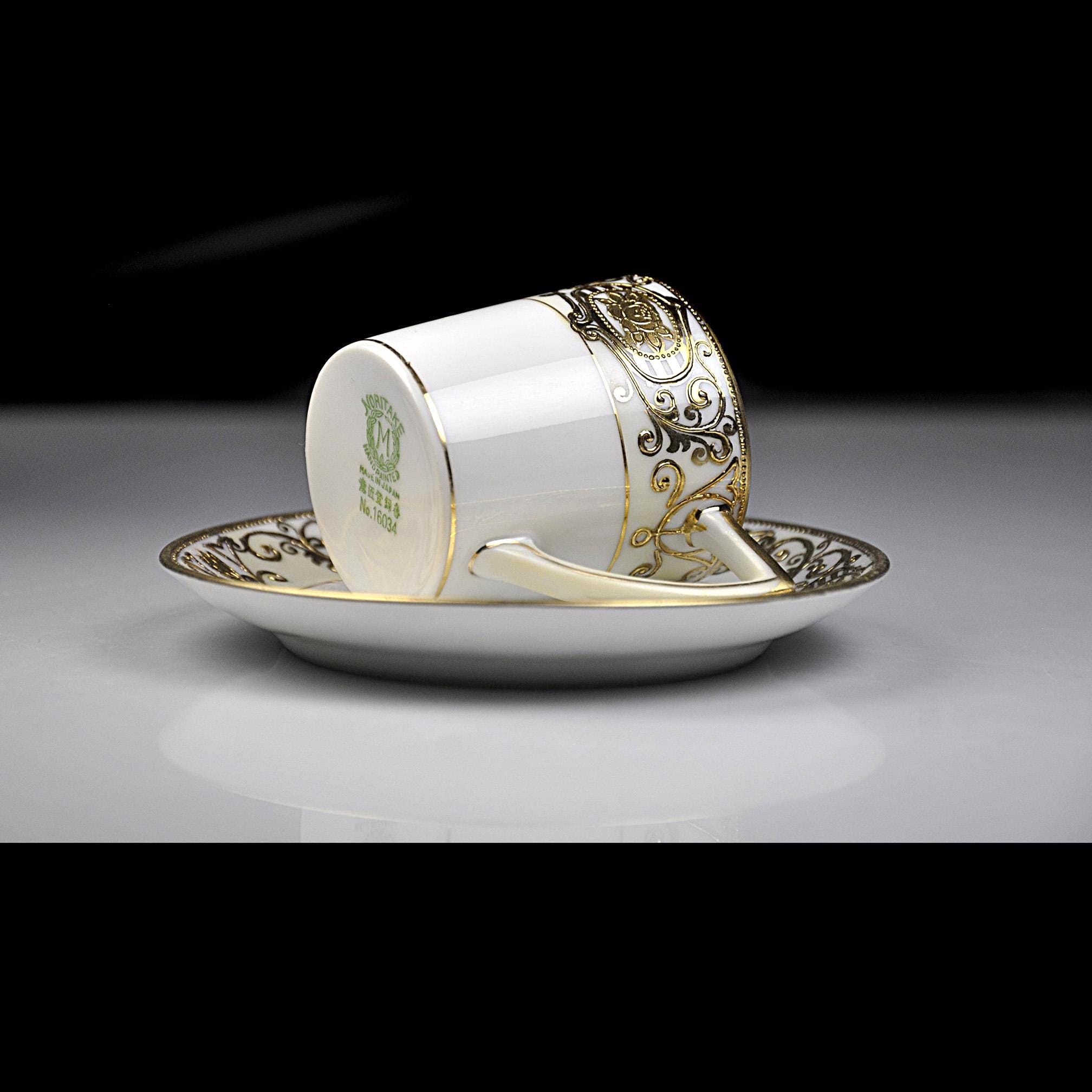 This Noritake demitasse china set pattern catches your eye right away. The gold decoration on this little cup and saucer is wonderfully detailed, with scrolling vines, small rose medallions, and delicate beading that almost looks like jewelry wrapped around the porcelain.