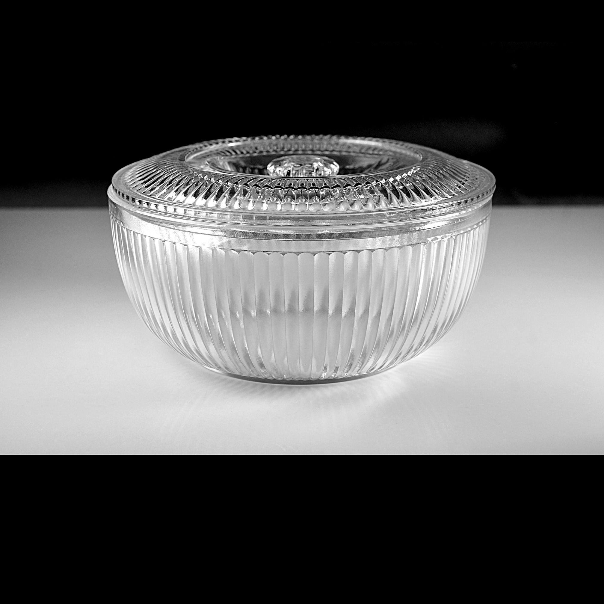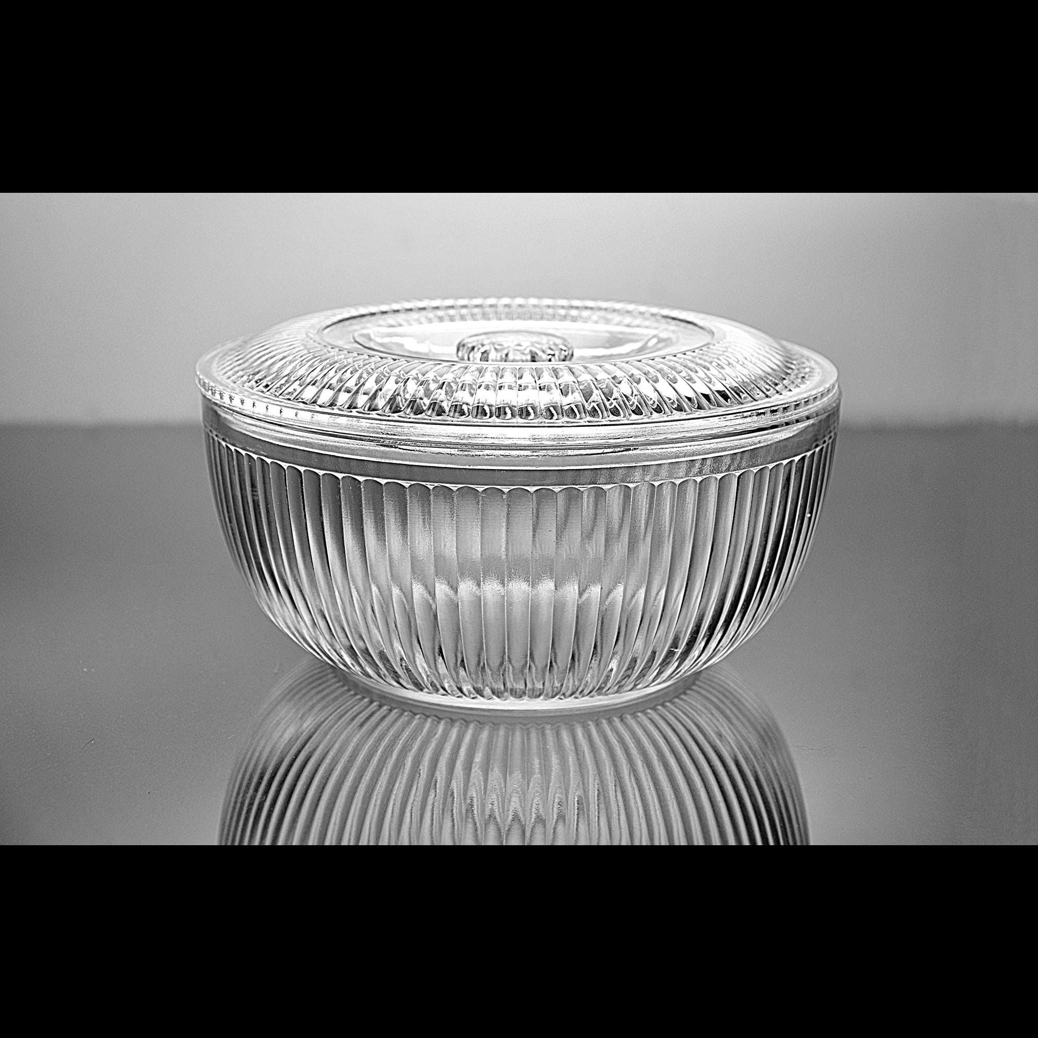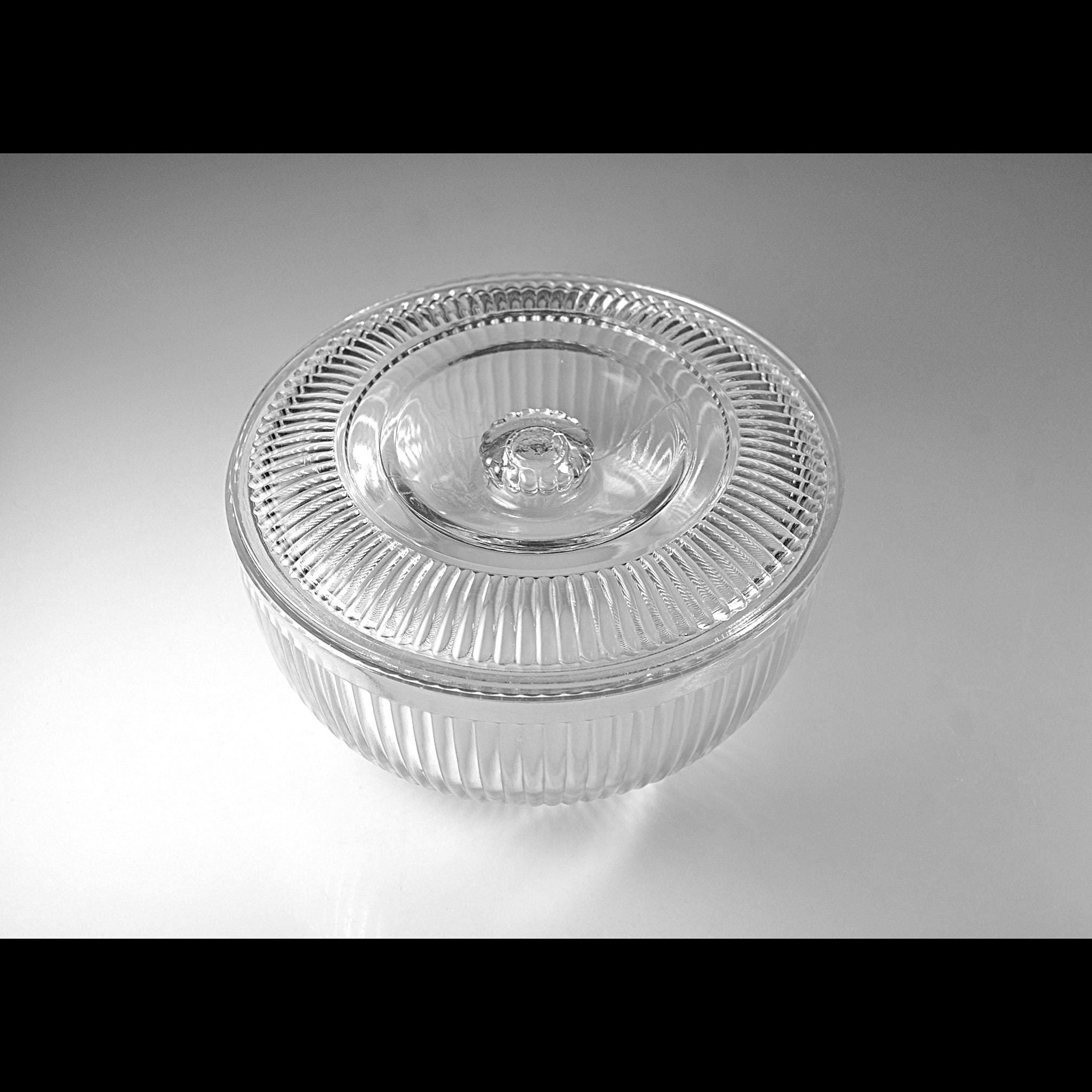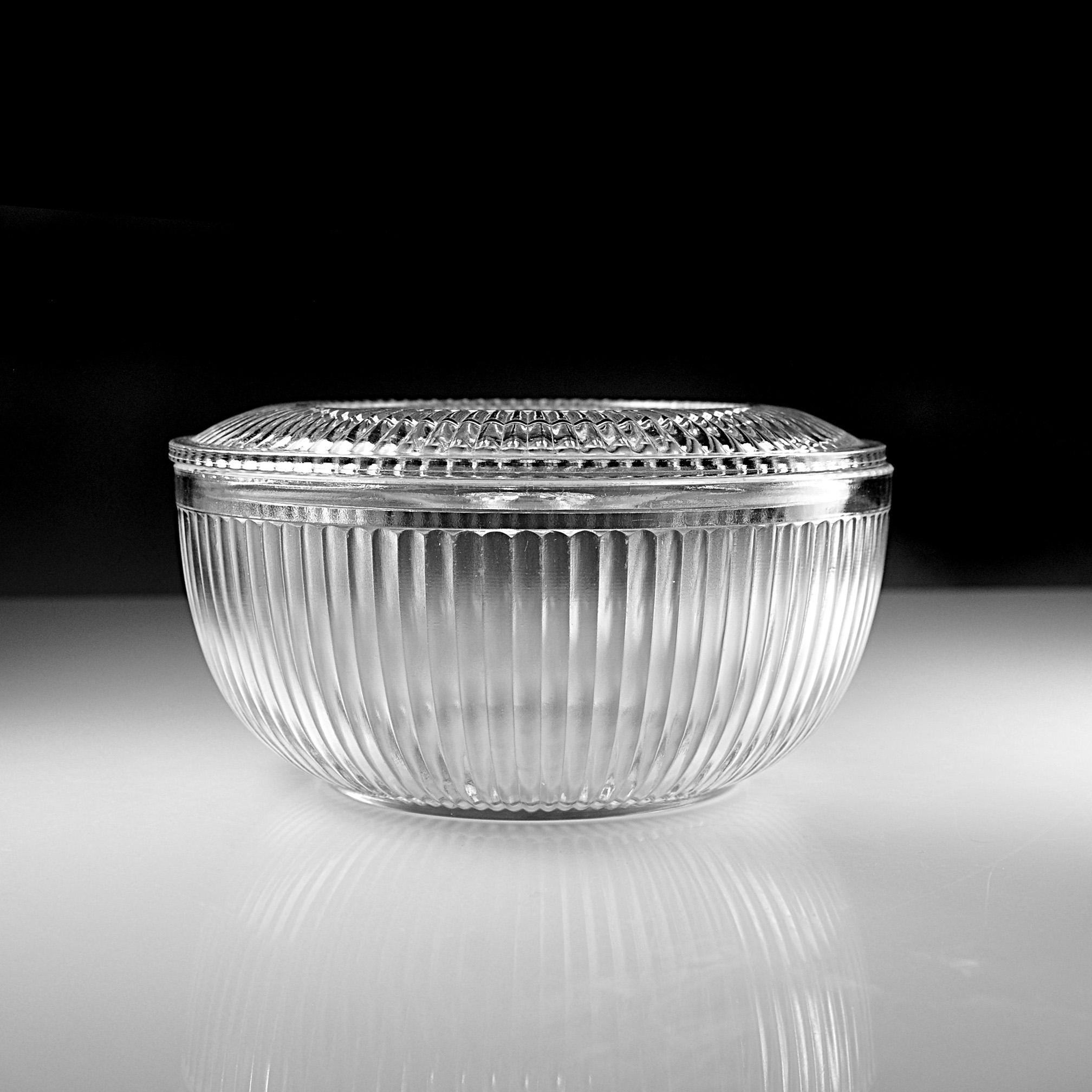 This ribbed glass bowl comes from the Queen Mary pattern made by Anchor Hocking during the Depression glass era. Introduced in 1936, Queen Mary pieces were designed to be both useful and attractive, with clean vertical ribbing that catches the light beautifully. Covered bowls like this were often used on a kitchen table or sideboard. Even today they make a charming little storage dish or decorative piece in a farmhouse or vintage-inspired kitchen. The bowl itself is in excellent condition, and the lid still fits nicely, though there are two small chips on the inside edge of the lid that should be noted.