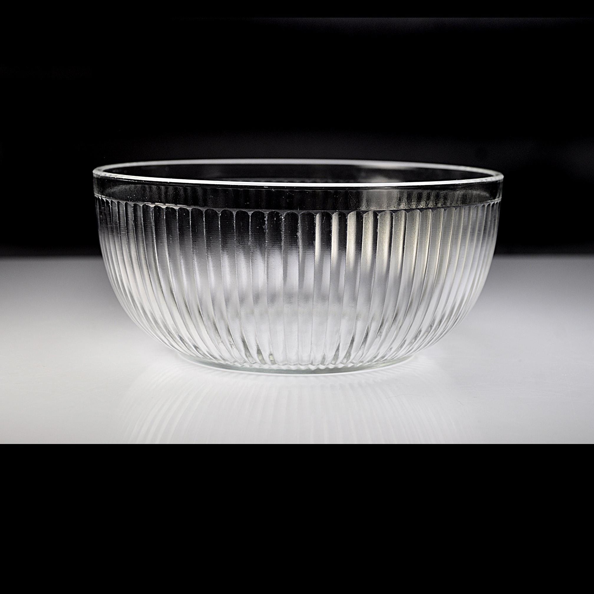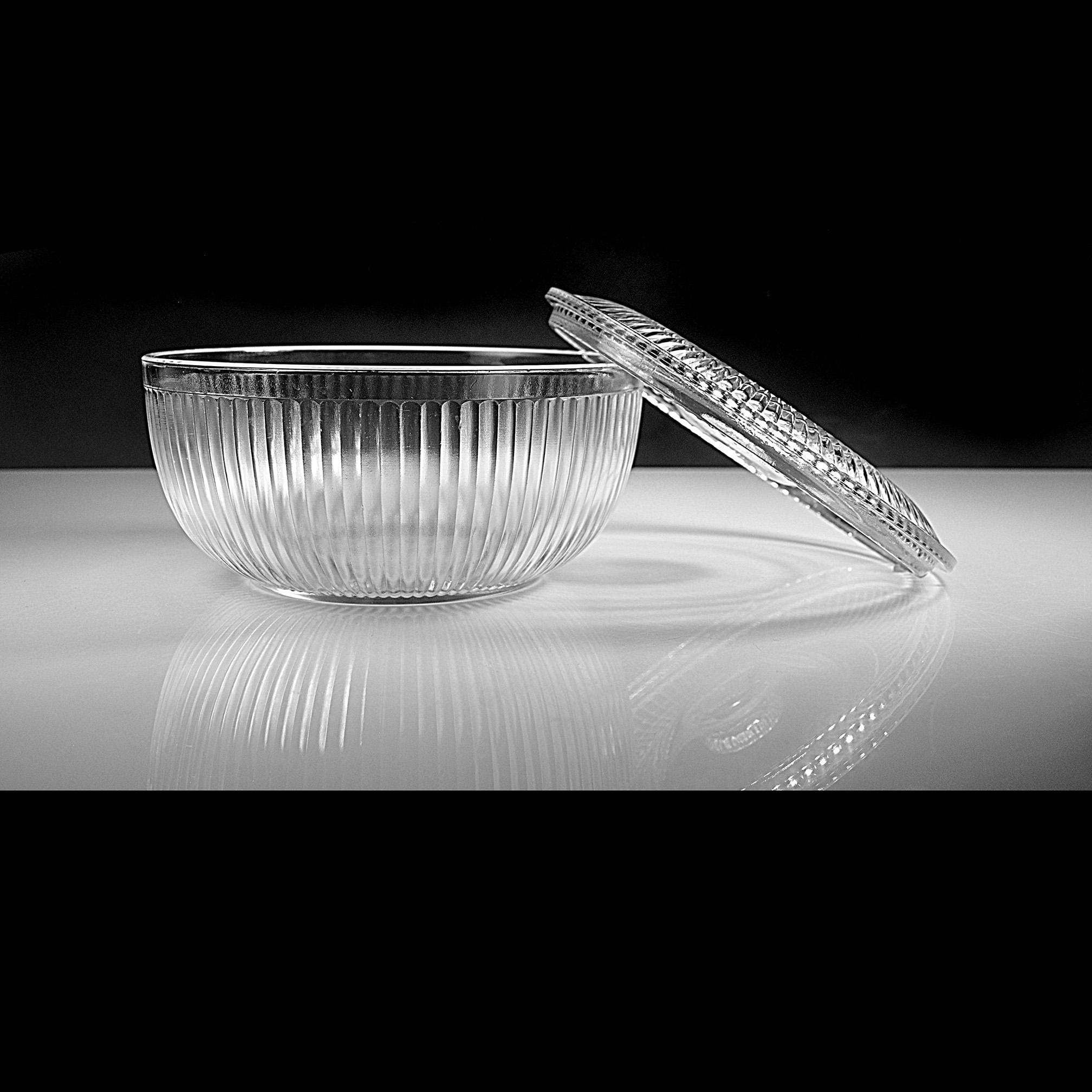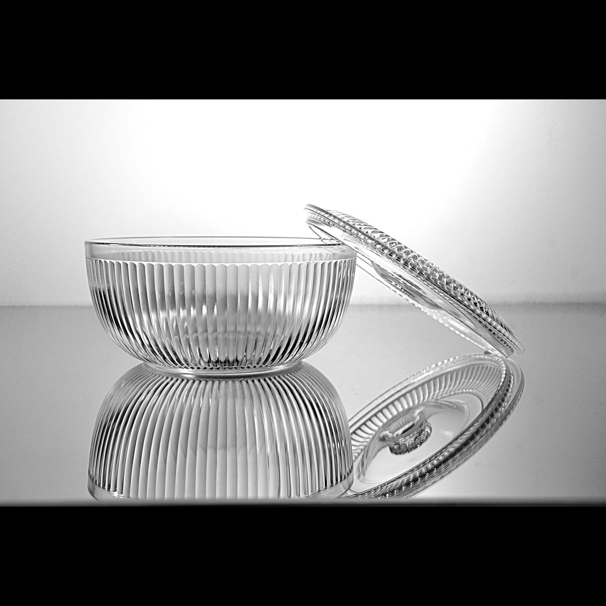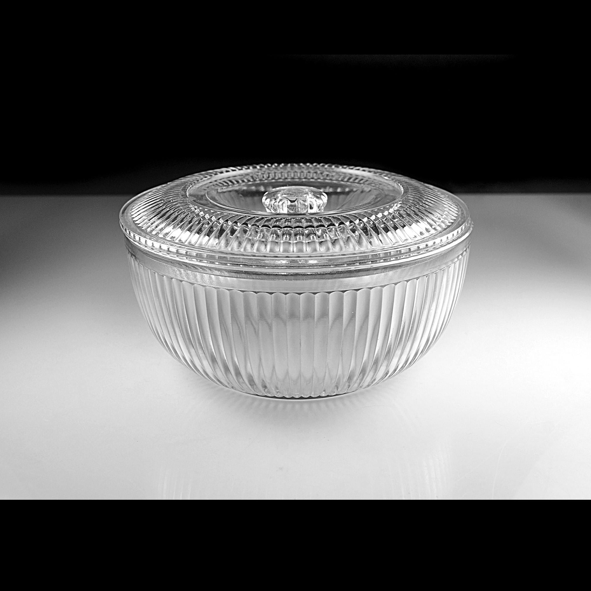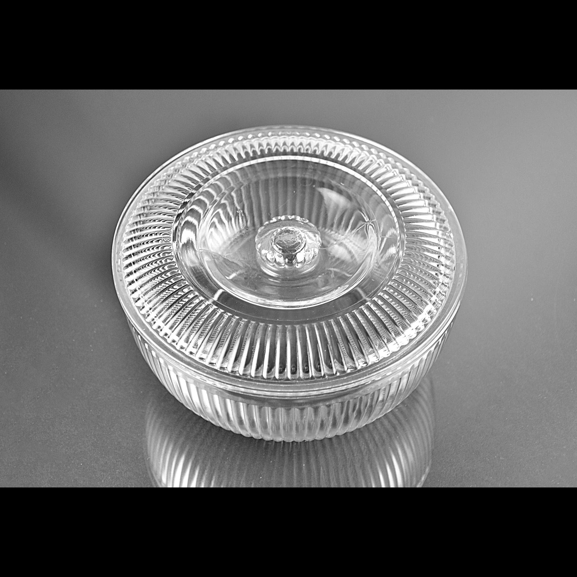 This ribbed glass bowl comes from the Queen Mary pattern made by Anchor Hocking during the Depression glass era. Introduced in 1936, Queen Mary pieces were designed to be both useful and attractive, with clean vertical ribbing that catches the light beautifully. Covered bowls like this were often used on a kitchen table or sideboard. Even today they make a charming little storage dish or decorative piece in a farmhouse or vintage-inspired kitchen. The bowl itself is in excellent condition, and the lid still fits nicely, though there are two small chips on the inside edge of the lid that should be noted.