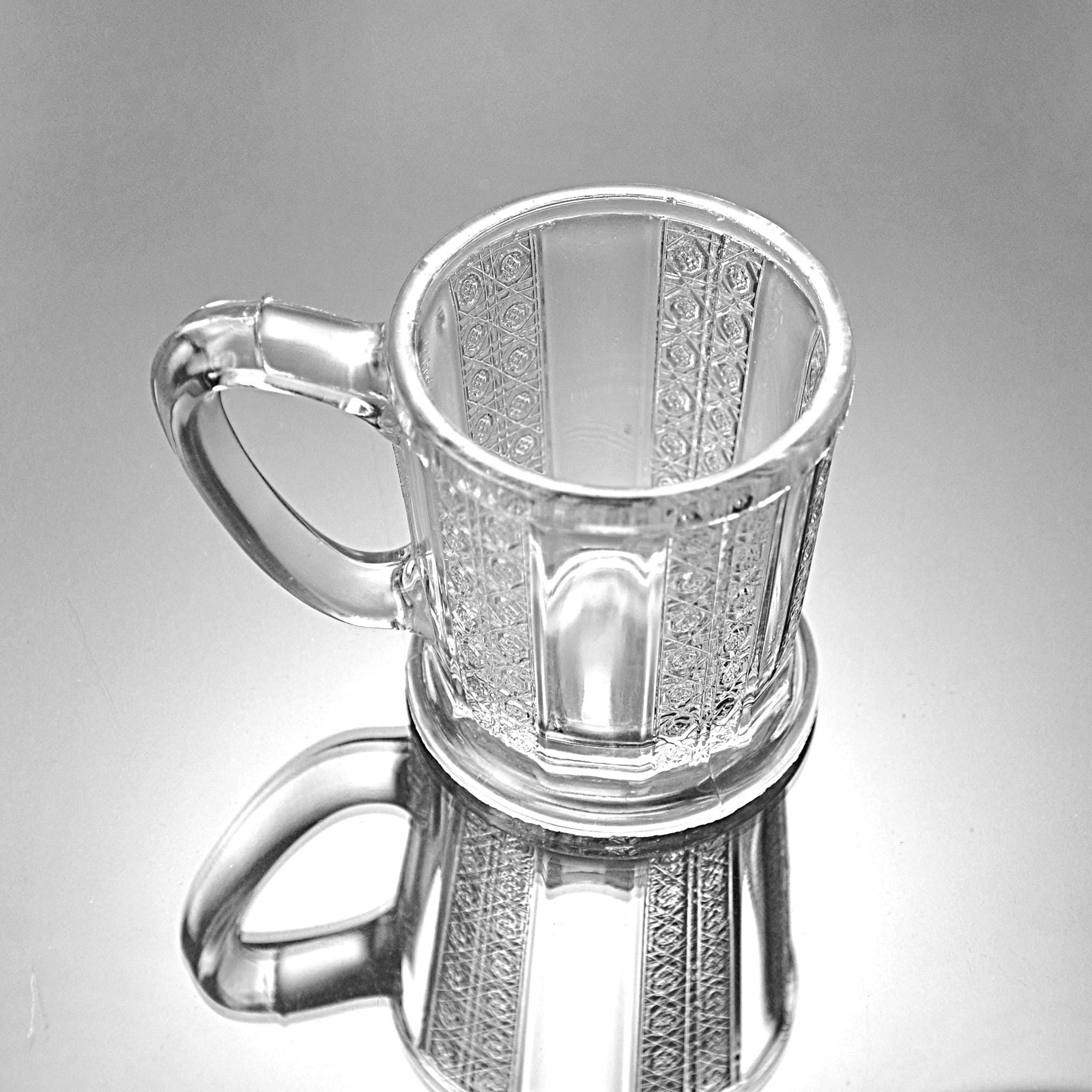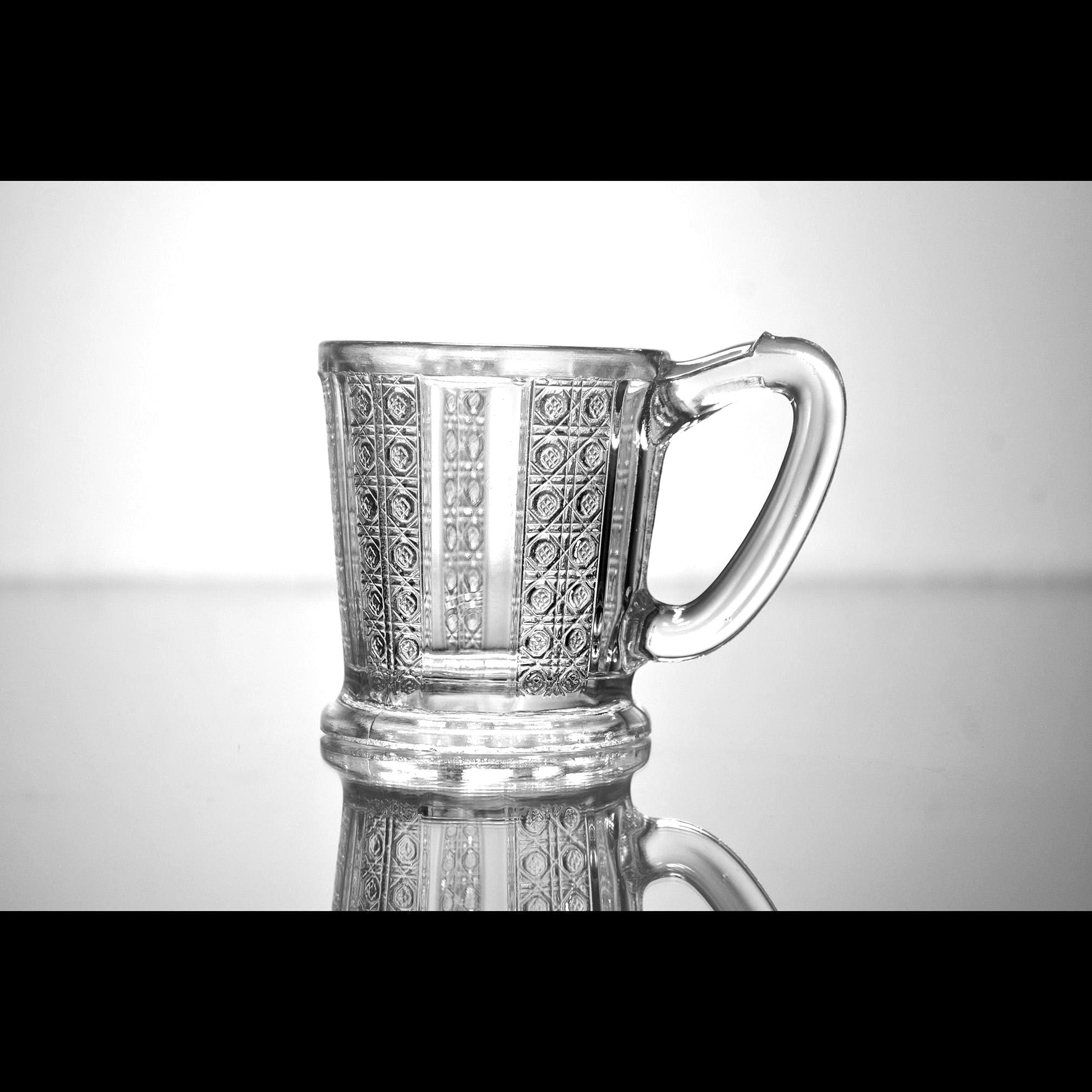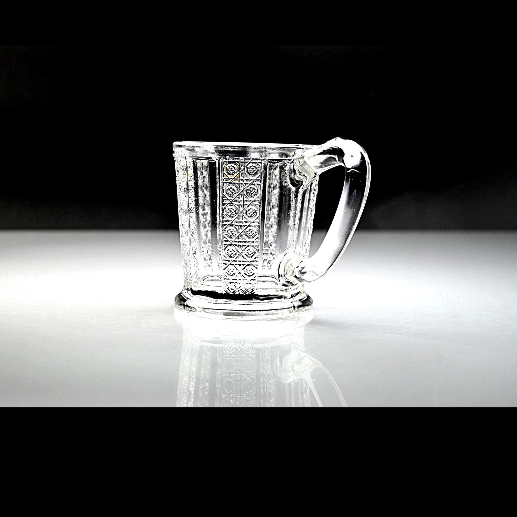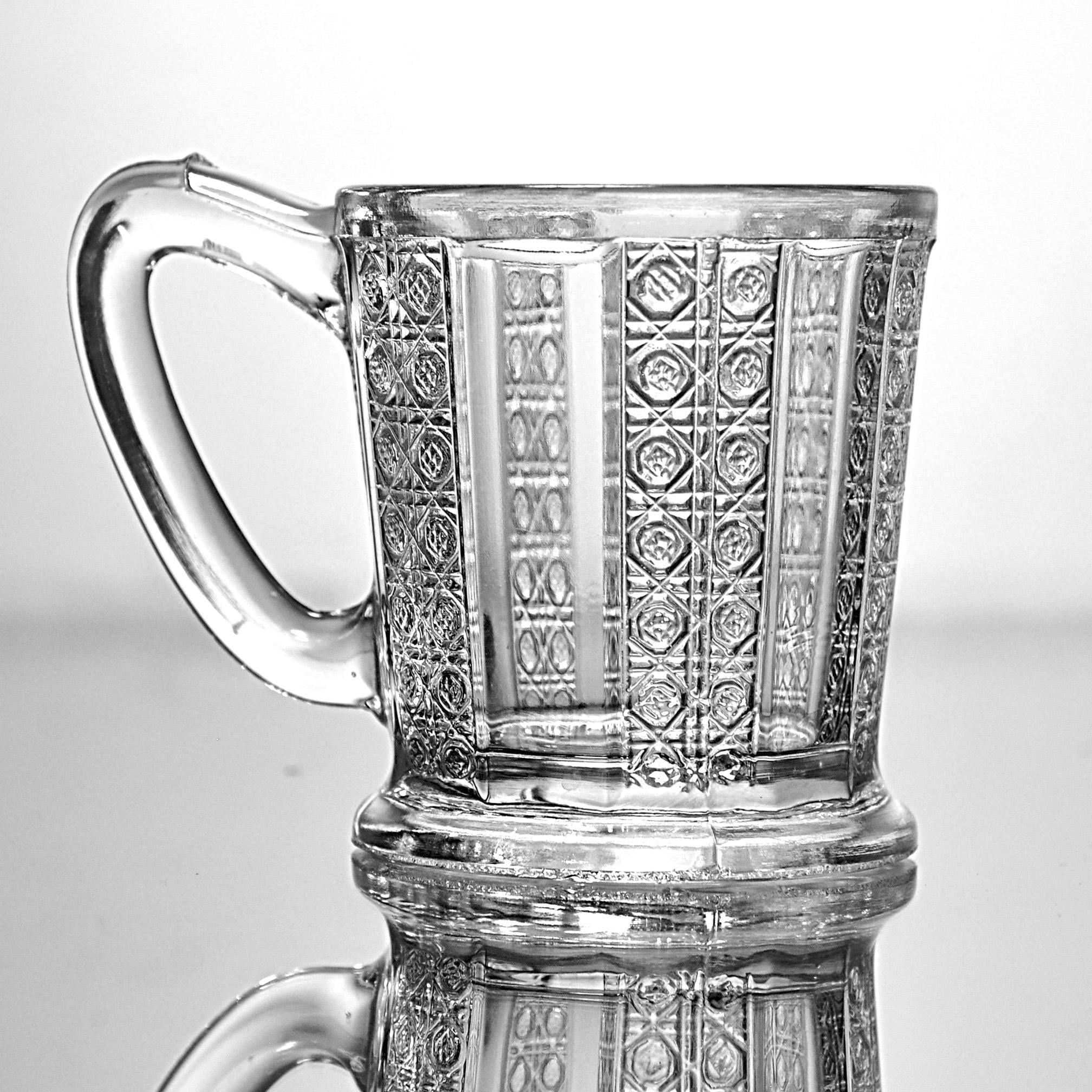 Victorian pressed glass has a way of catching the light that modern glass just can't match. This little mug is a good example of that old craftsmanship. Made by George Duncan & Sons of Pittsburgh, this small mug features the Paneled Cane pattern, also known as Cane Column, a design introduced in the late 1870s during the height of Early American Pressed Glass production. The pattern alternates smooth panels with beautifully detailed cane columns filled with tiny rosette designs. When light hits the glass those details really stand out. At 2¾ inches tall and 2⅜ inches across, this is a smaller mug than most people expect. Pieces like this were often used in the Victorian era as a child’s mug, small whiskey mug, or personal drinking cup. This piece is well over 140 years old and still displays beautifully. A wonderful little example of Victorian Early American Pressed Glass that would look right at home in a collection or displayed in a small cabinet.