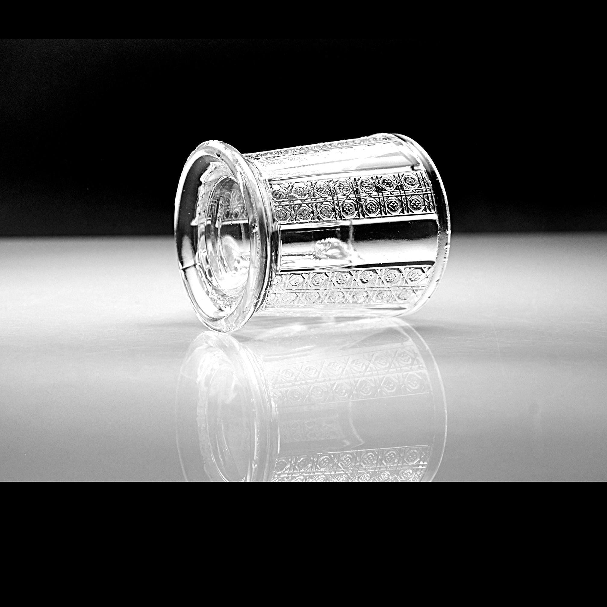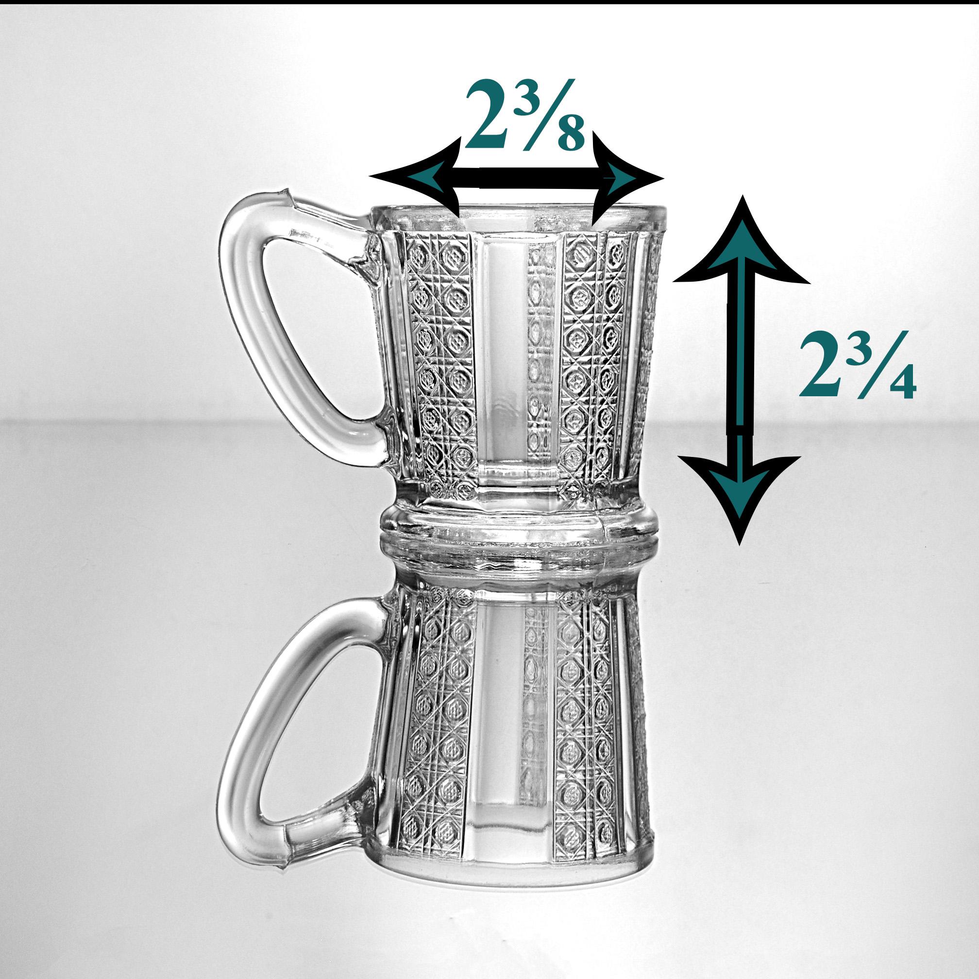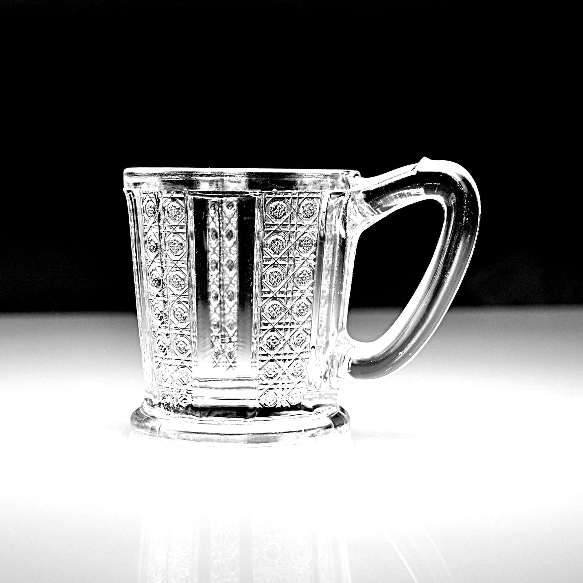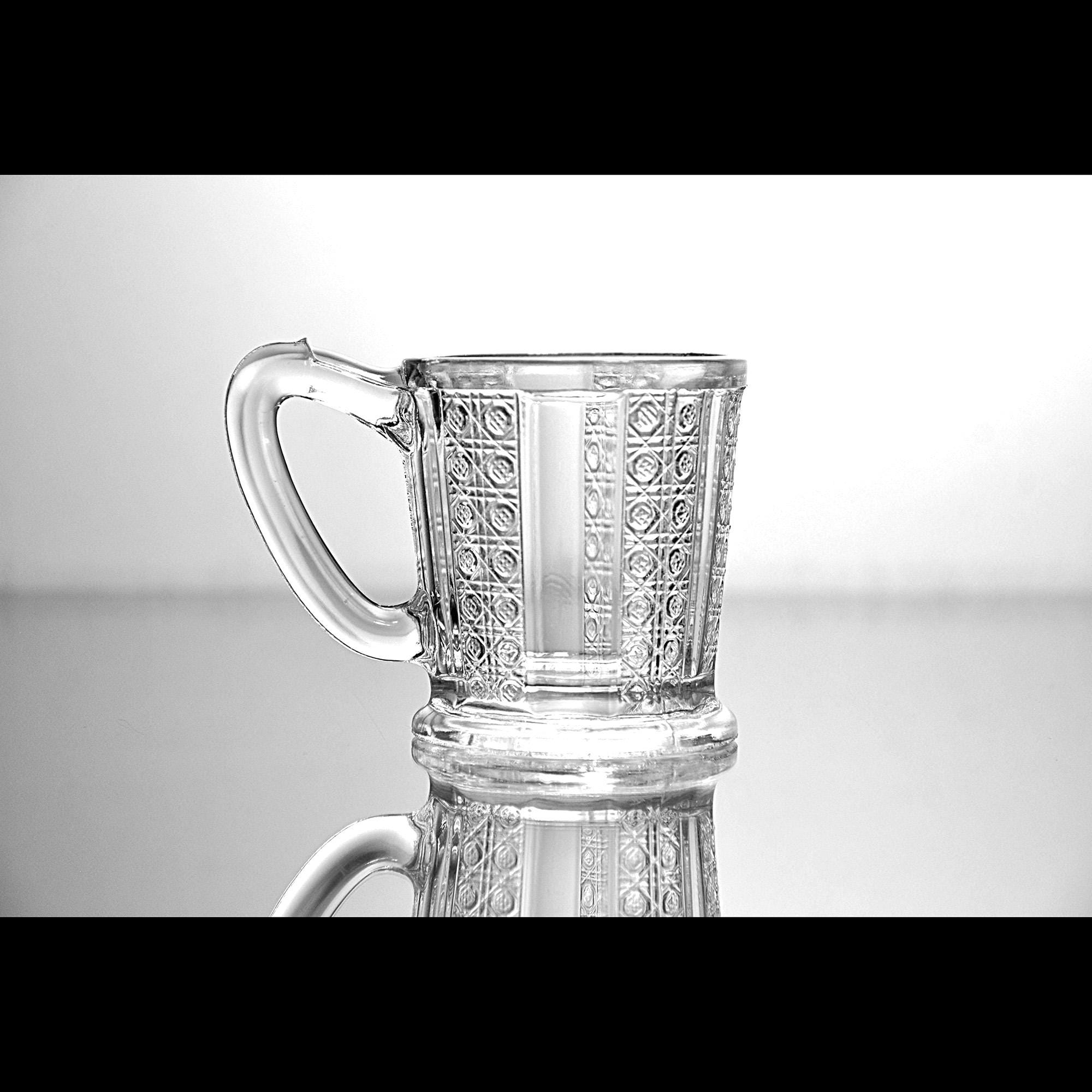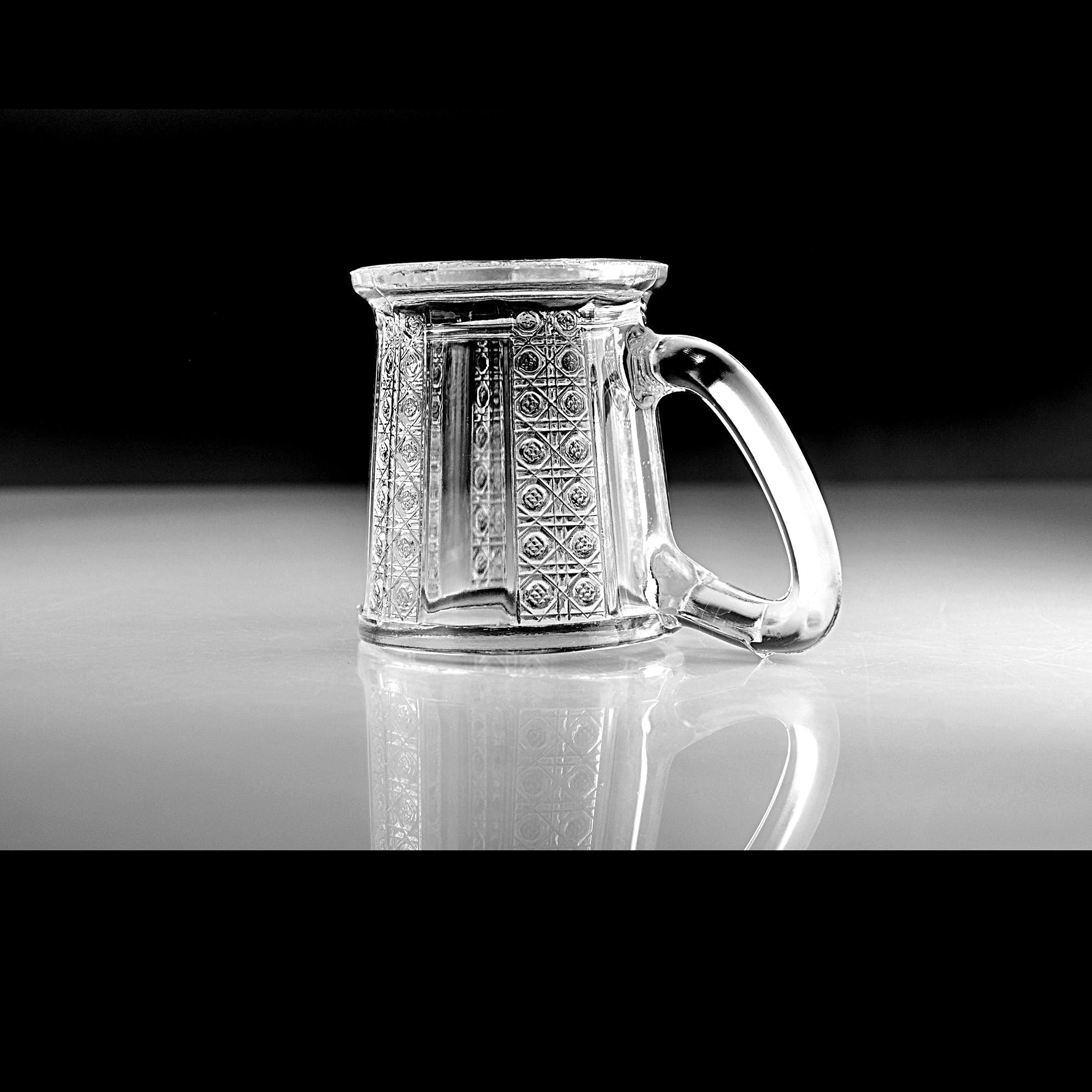 Victorian pressed glass has a way of catching the light that modern glass just can't match. This little mug is a good example of that old craftsmanship. Made by George Duncan & Sons of Pittsburgh, this small mug features the Paneled Cane pattern, also known as Cane Column, a design introduced in the late 1870s during the height of Early American Pressed Glass production. The pattern alternates smooth panels with beautifully detailed cane columns filled with tiny rosette designs. When light hits the glass those details really stand out. At 2¾ inches tall and 2⅜ inches across, this is a smaller mug than most people expect. Pieces like this were often used in the Victorian era as a child’s mug, small whiskey mug, or personal drinking cup. This piece is well over 140 years old and still displays beautifully. A wonderful little example of Victorian Early American Pressed Glass that would look right at home in a collection or displayed in a small cabinet.