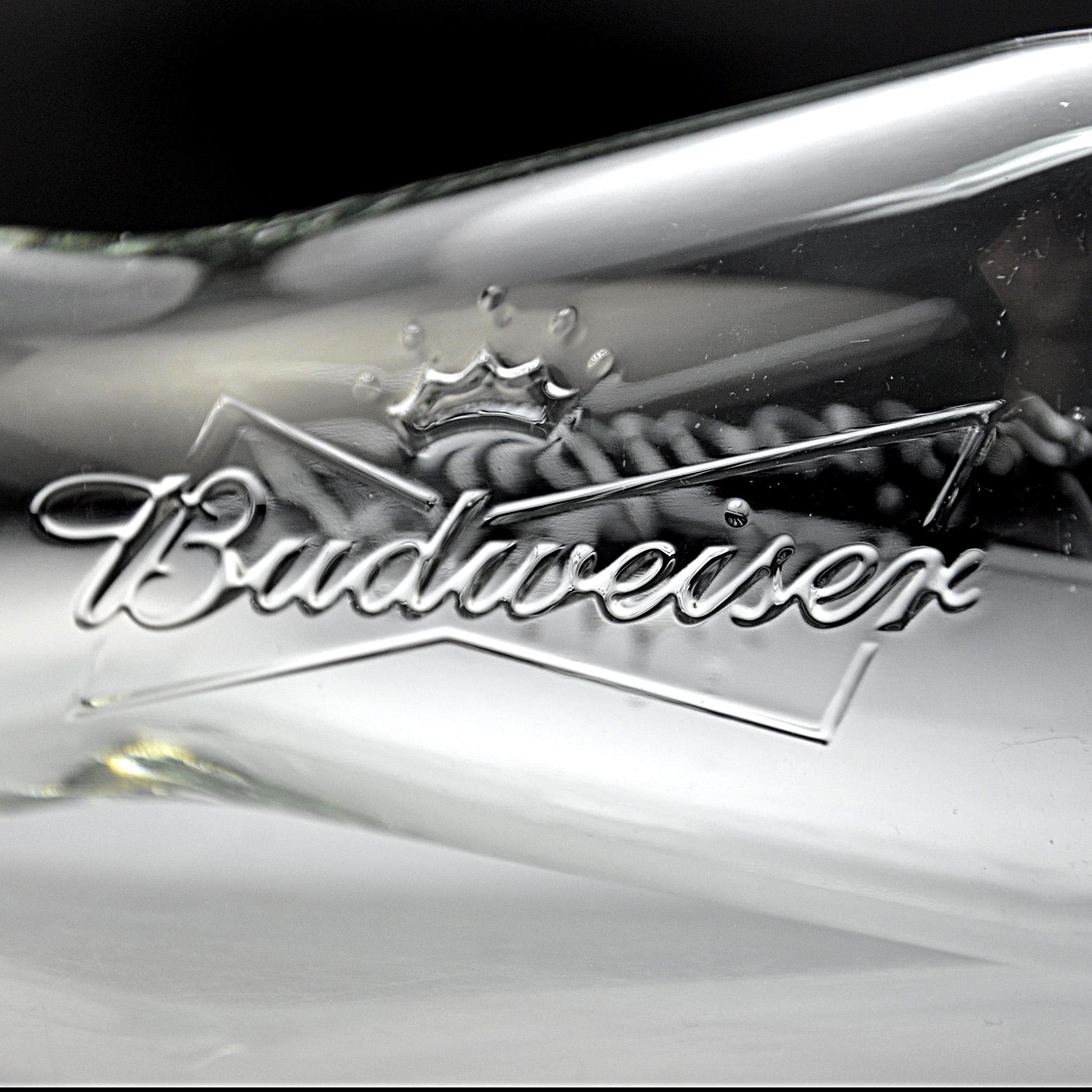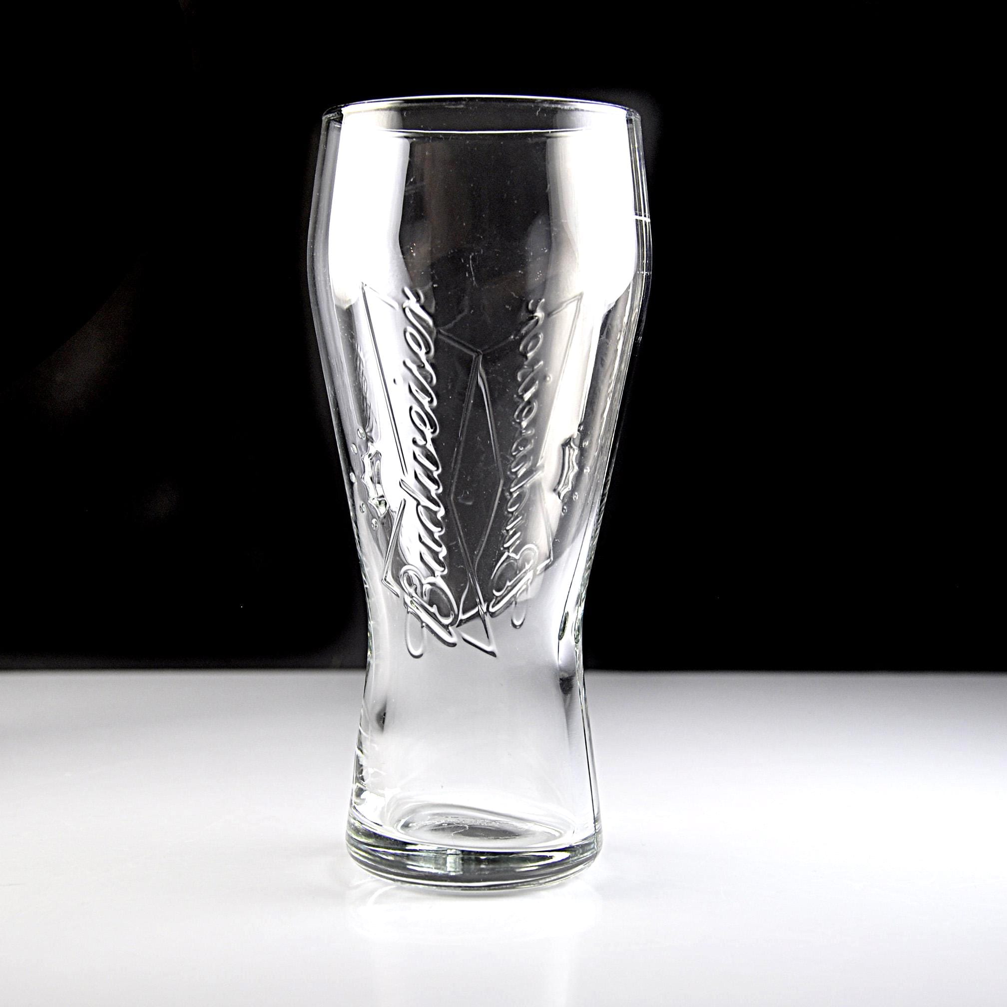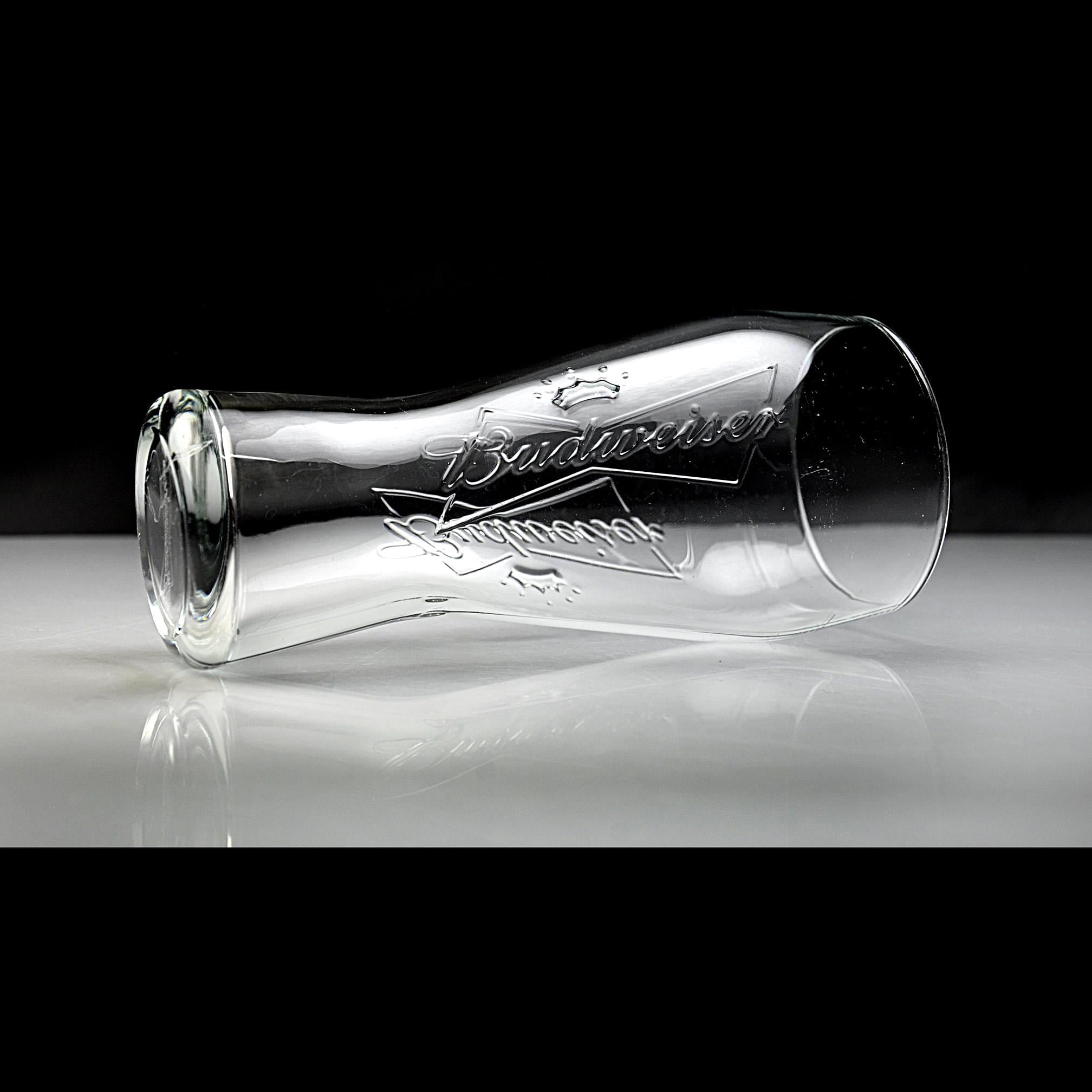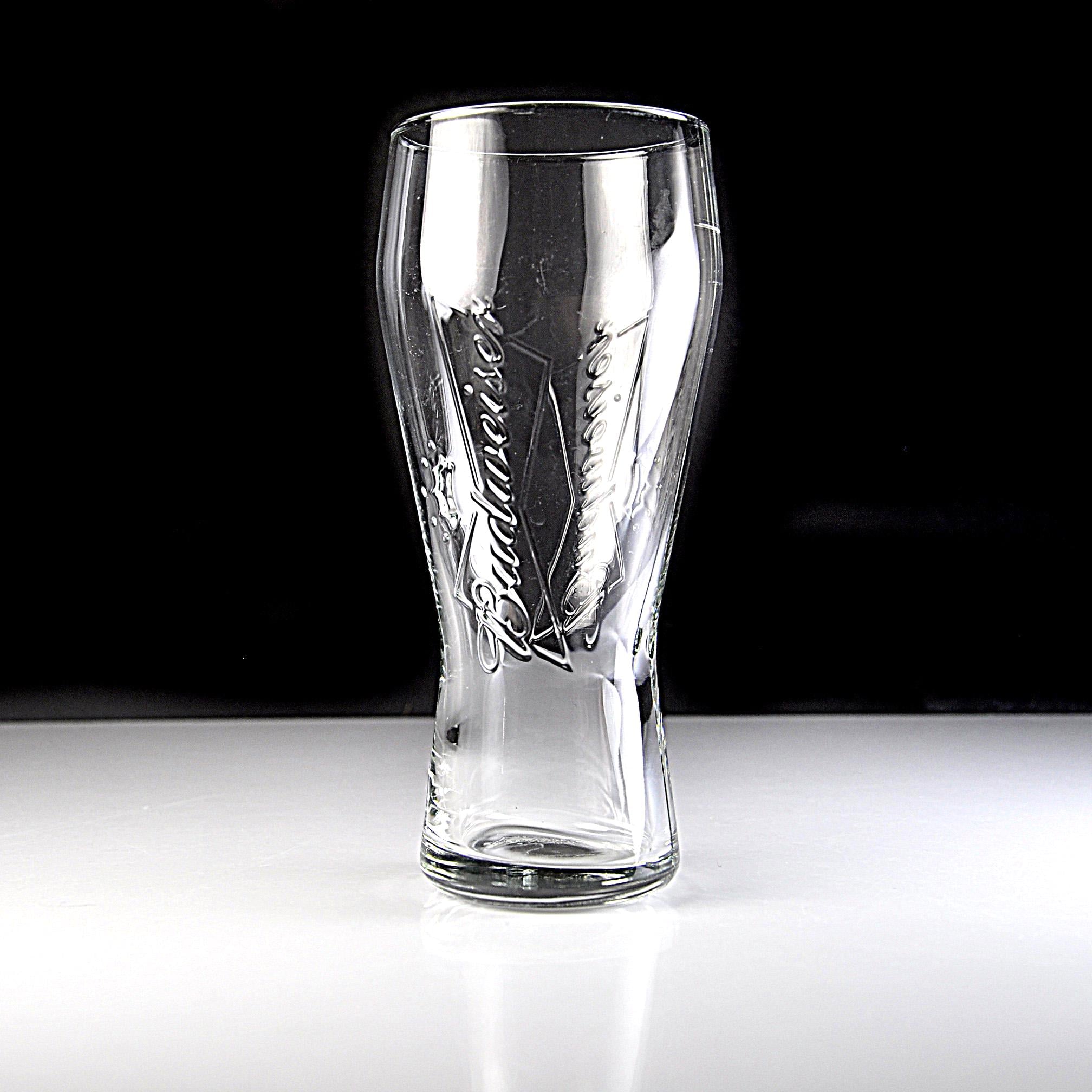 Budweiser has been part of American barrooms for generations, and this classic pilsner glass brings back a bit of that old tavern feel. This clear glass features the embossed Budweiser script and crown logo molded right into the glass, rather than printed on the surface. That raised design was made to stand up to years of use in bars and restaurants where glasses went through constant washing. The shape is the familiar pilsner style, slightly narrower through the middle and wider at the top, which was designed to show off the color and head of the beer. This glass holds 12 ounces and stands 7 inches tall, a standard size used in many bars. It would be a nice addition to a home bar, brewery collection, or Budweiser memorabilia display. A classic piece of American barware from Anheuser-Busch.