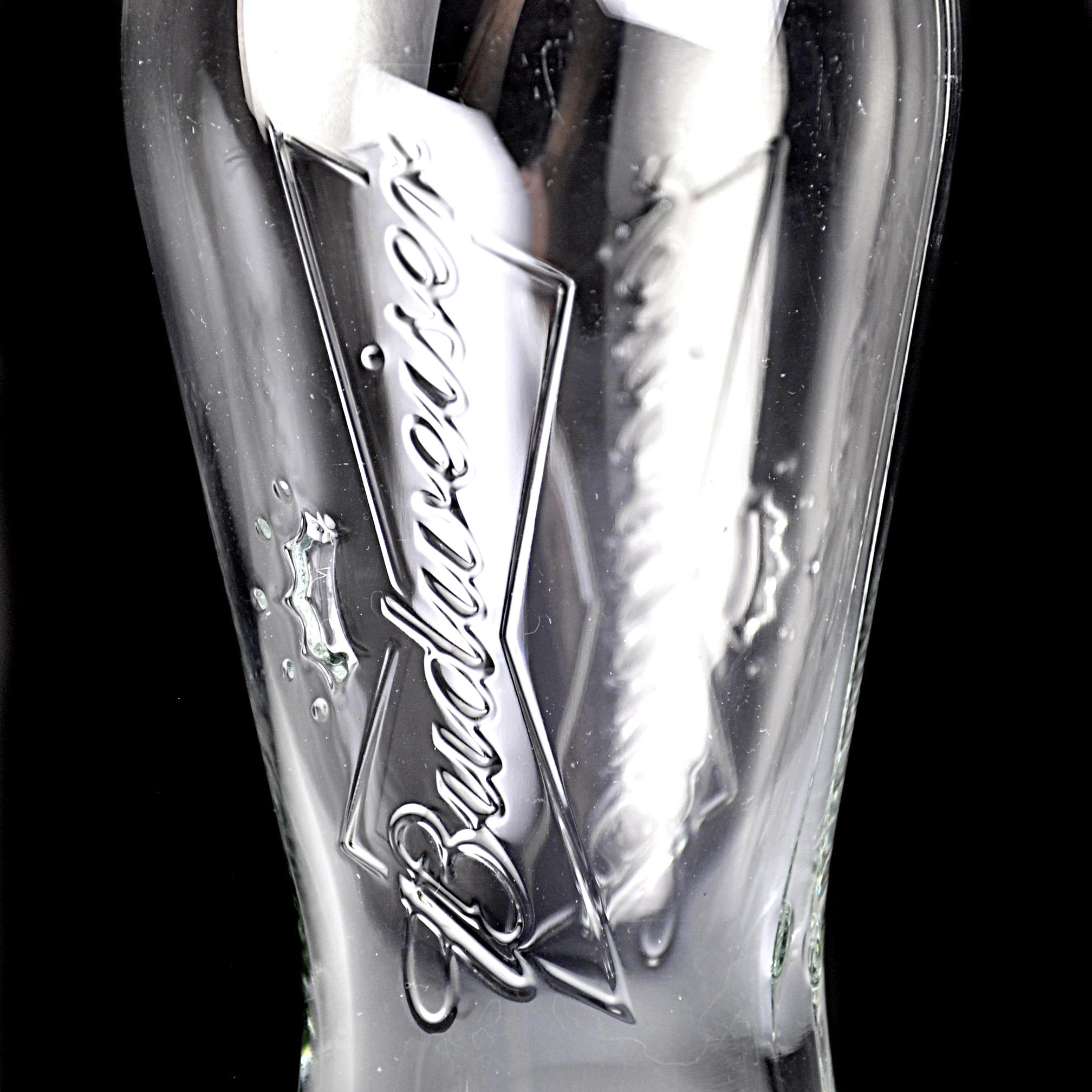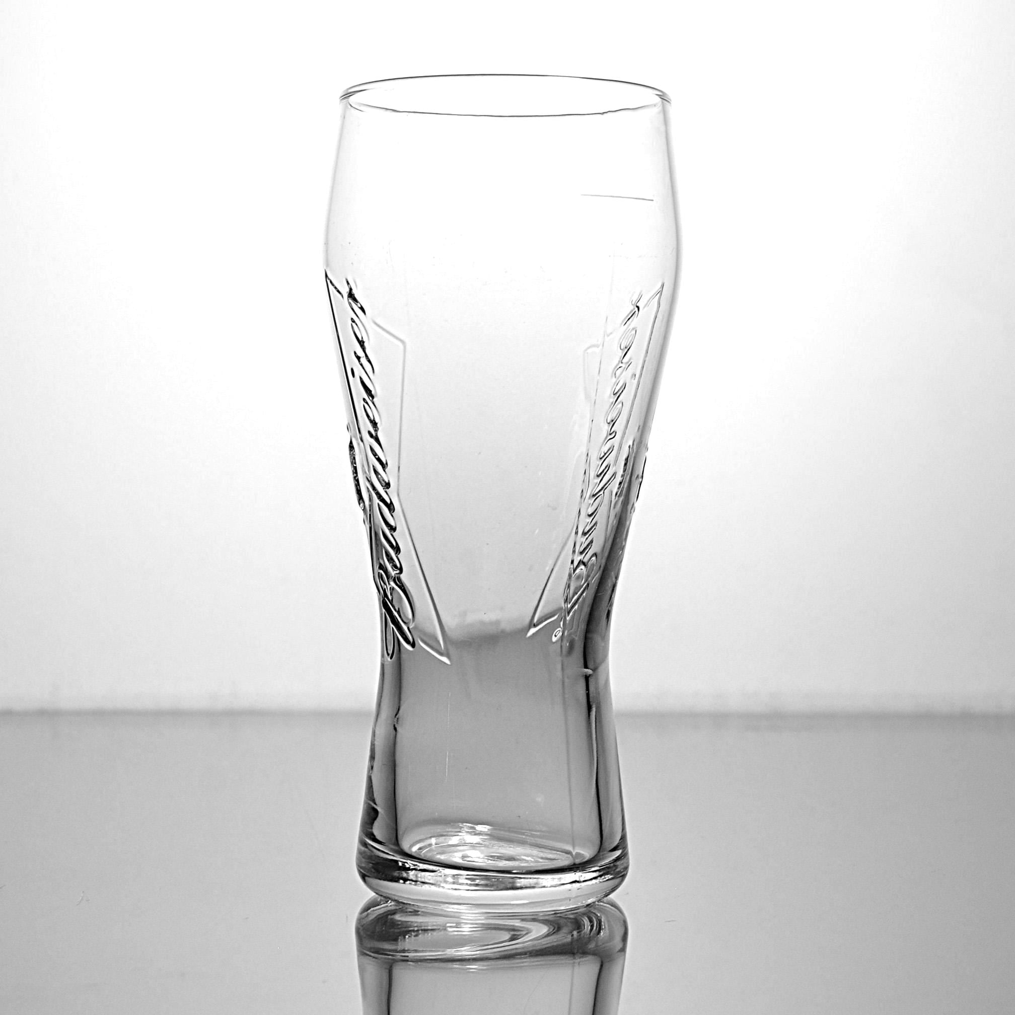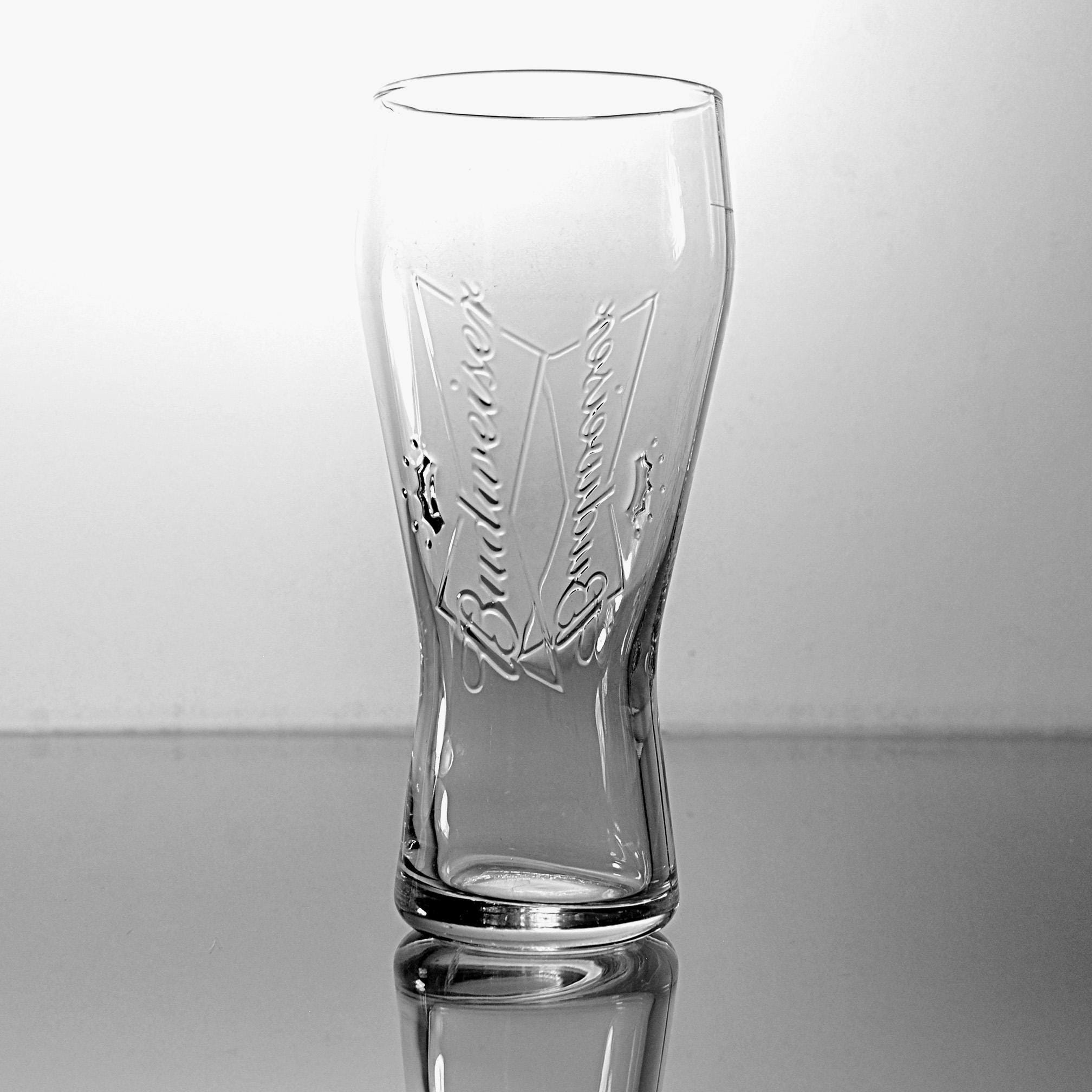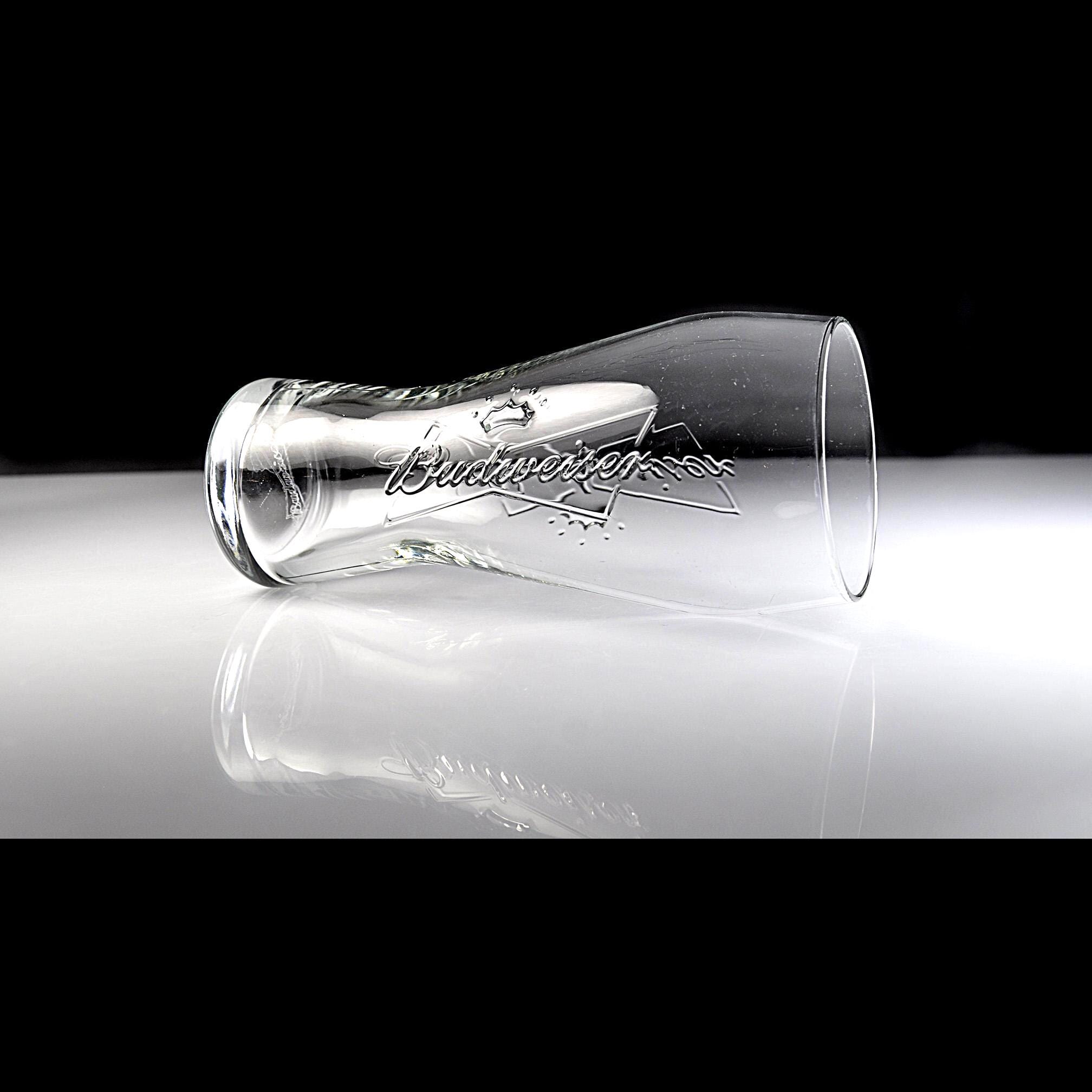 Budweiser has been part of American barrooms for generations, and this classic pilsner glass brings back a bit of that old tavern feel. This clear glass features the embossed Budweiser script and crown logo molded right into the glass, rather than printed on the surface. That raised design was made to stand up to years of use in bars and restaurants where glasses went through constant washing. The shape is the familiar pilsner style, slightly narrower through the middle and wider at the top, which was designed to show off the color and head of the beer. This glass holds 12 ounces and stands 7 inches tall, a standard size used in many bars. It would be a nice addition to a home bar, brewery collection, or Budweiser memorabilia display. A classic piece of American barware from Anheuser-Busch.