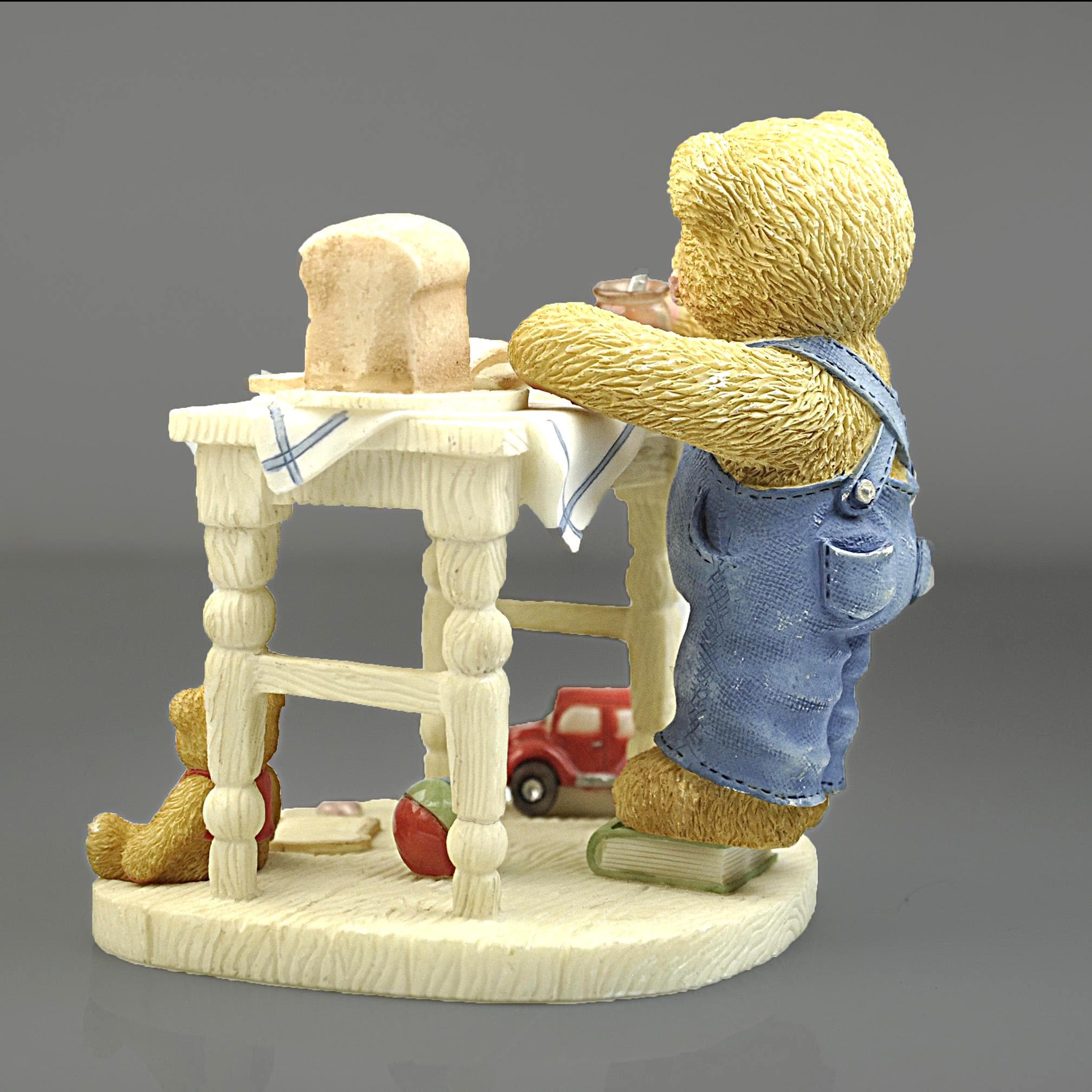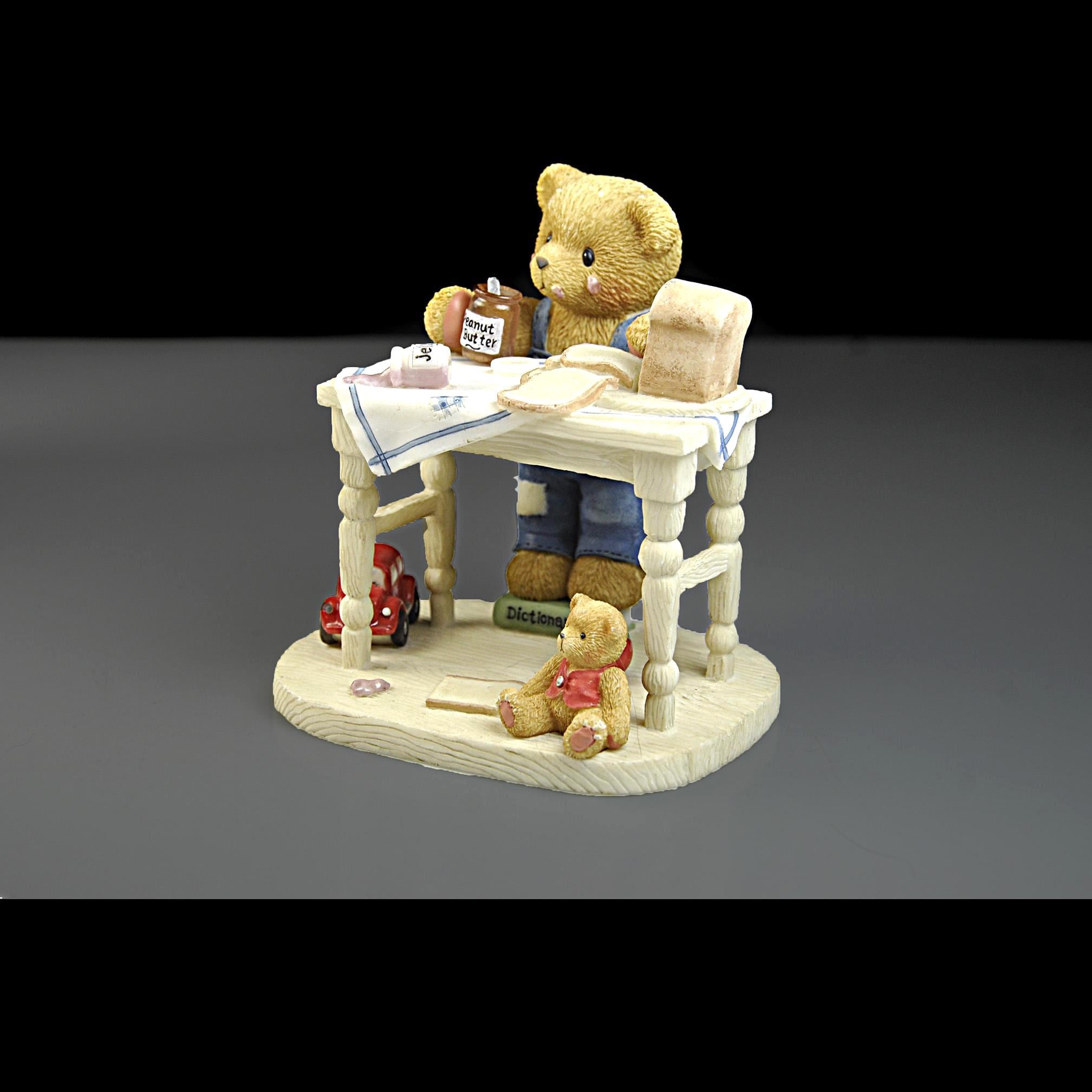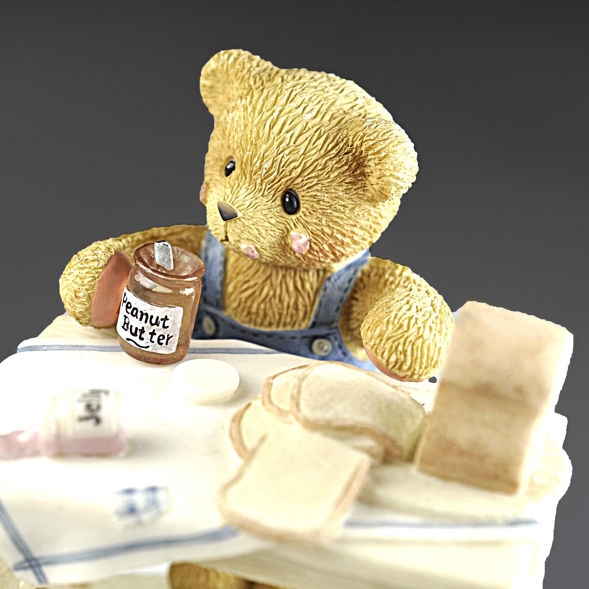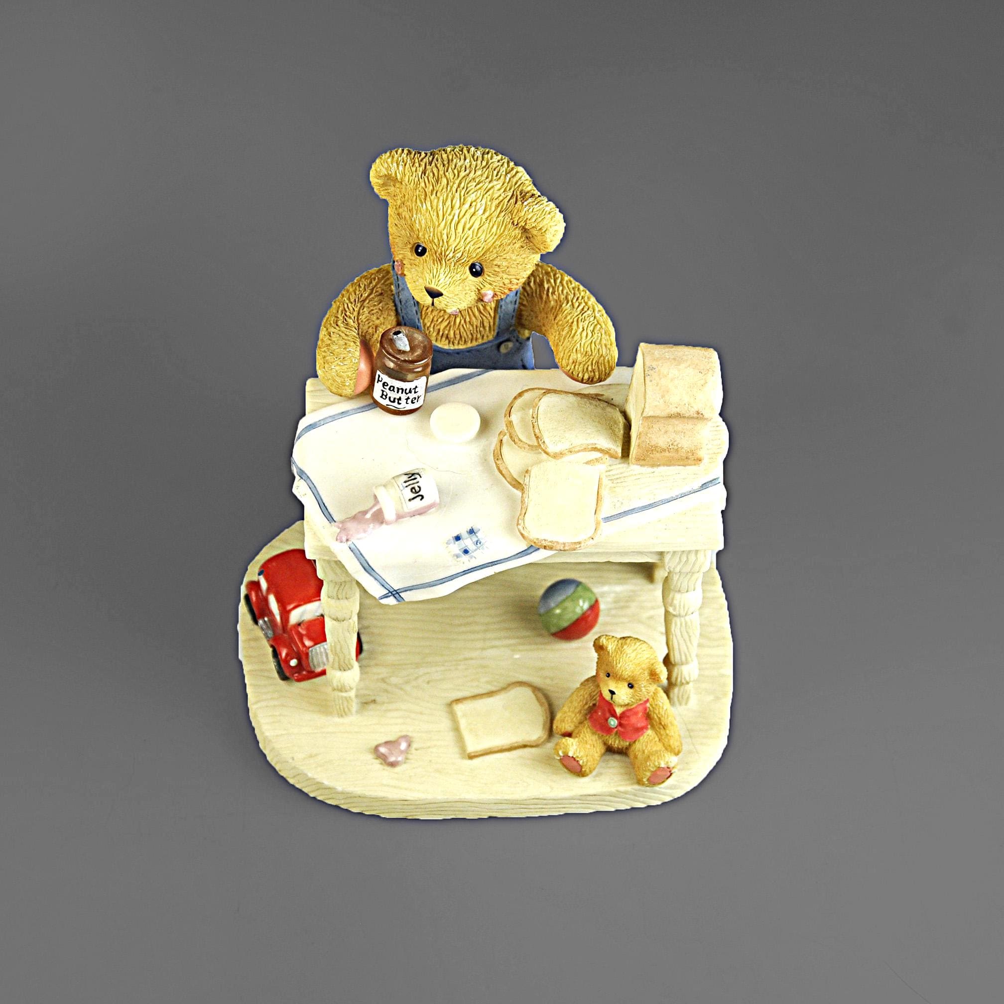 This sweet little figurine is part of the beloved Cherished Teddies collection, created by artist Priscilla Hillman and produced by Enesco Corporation. The piece is titled "You’re the Best Thing Since Sliced Bread.” Fred is standing at a small kitchen table making a peanut butter and jelly sandwich, surrounded by all the little details that made these figurines so popular. You can see the loaf of bread, the slices on the table, the peanut butter jar in his paw, a spilled jar of jelly on the table and even a small toy car and teddy bear sitting below the table. The bear himself stands on a dictionary book, which adds another charming touch to the scene. Like many pieces from the Cherished Teddies line introduced in the early 1990s, this figurine has a warm, nostalgic feel that collectors and gift buyers still enjoy today. A charming addition for a Cherished Teddies collector, teddy bear display, or nostalgic figurine collection.