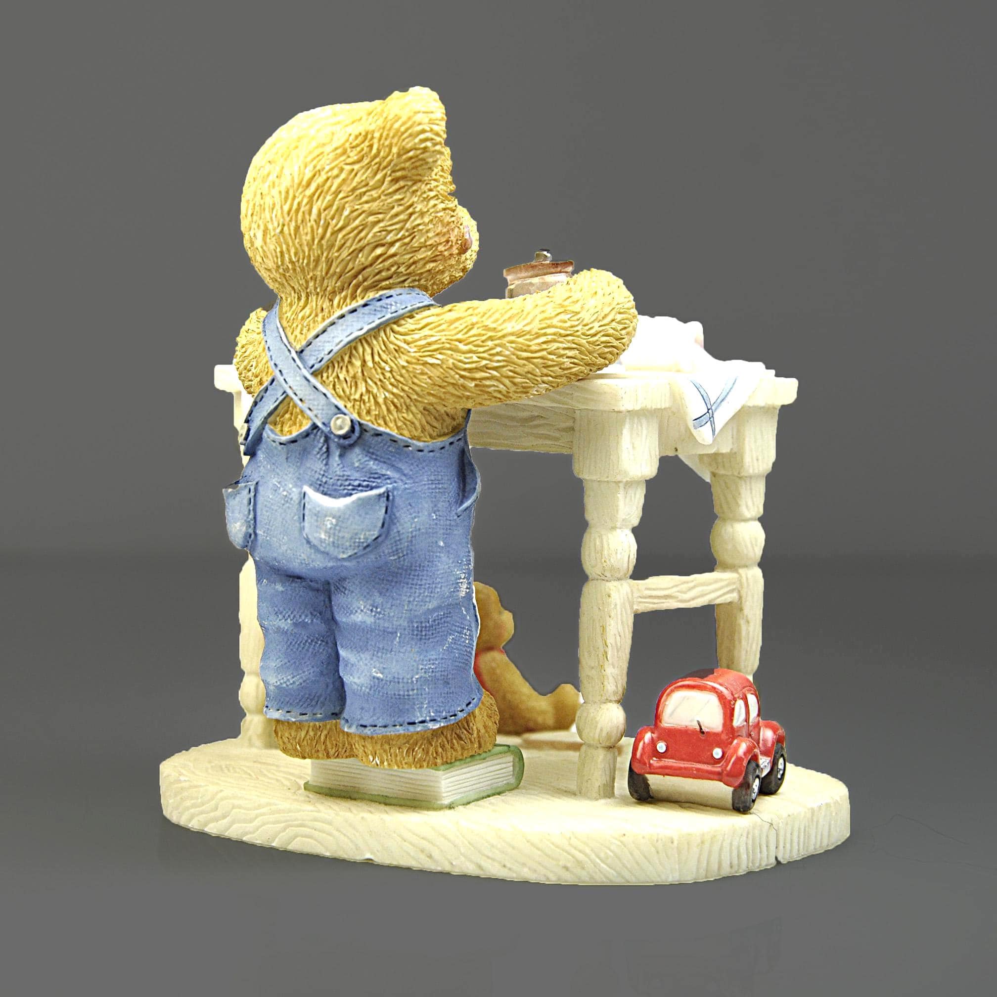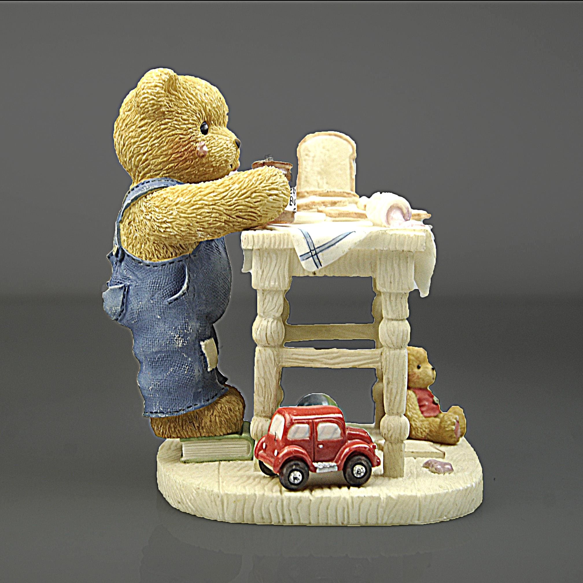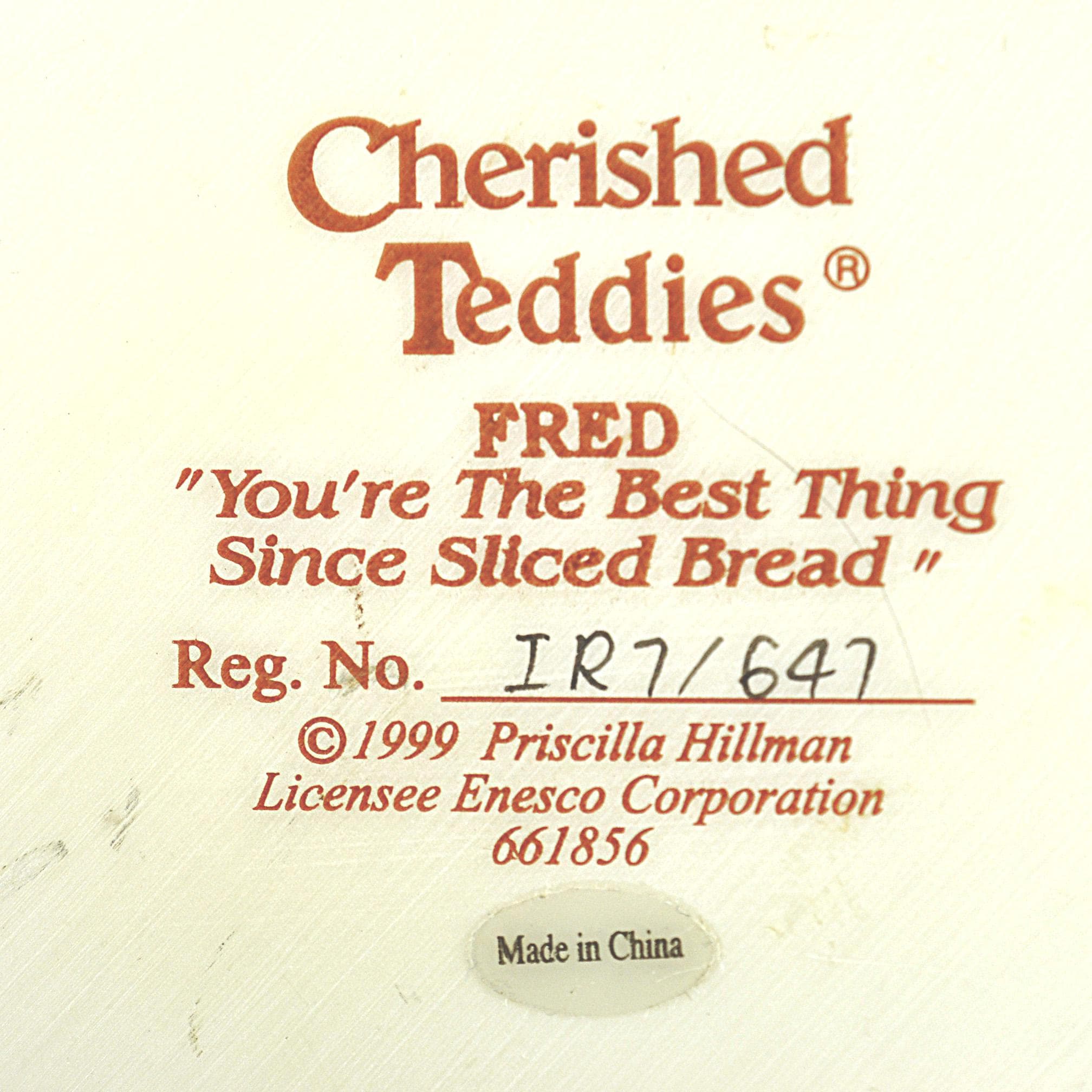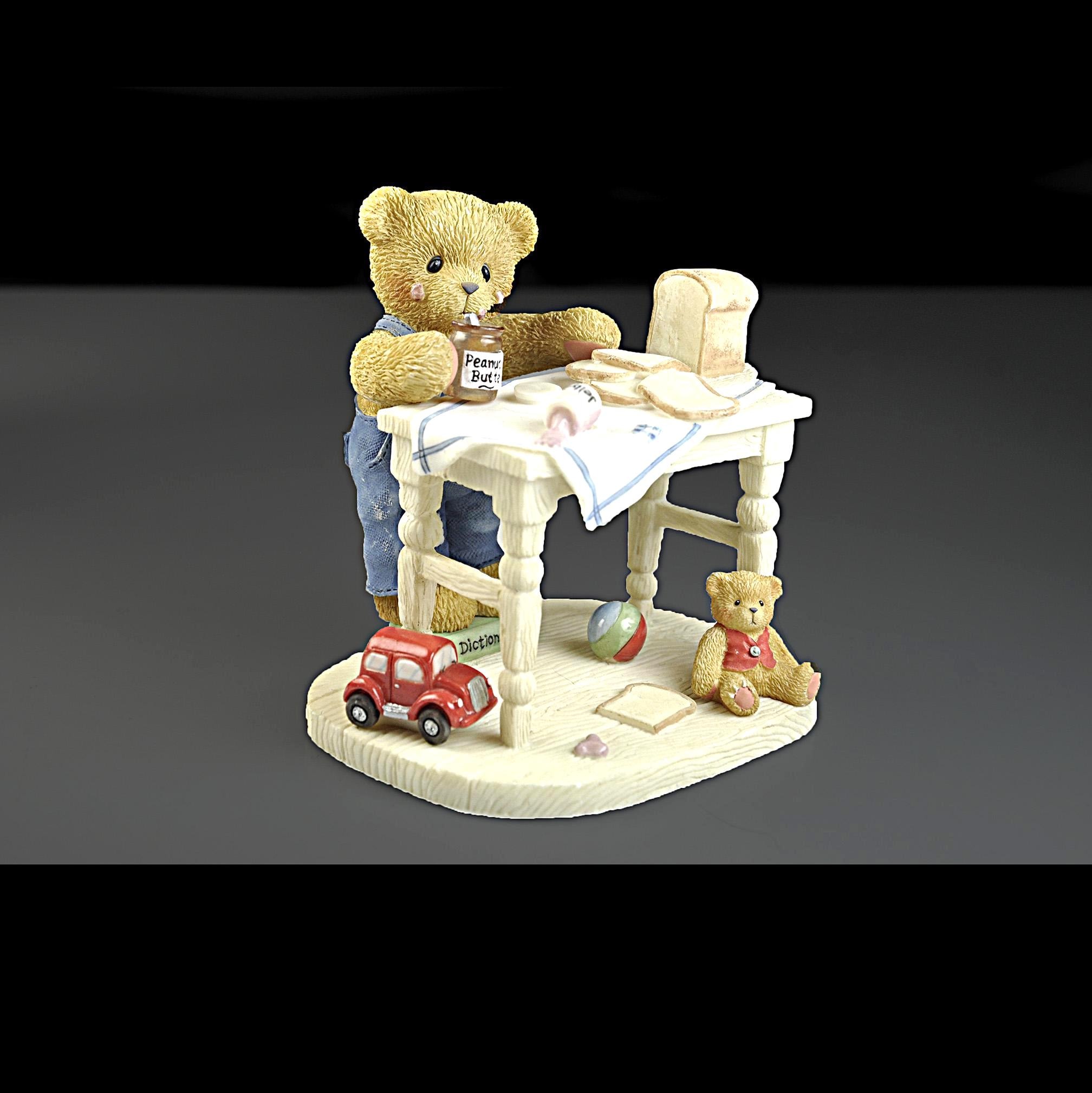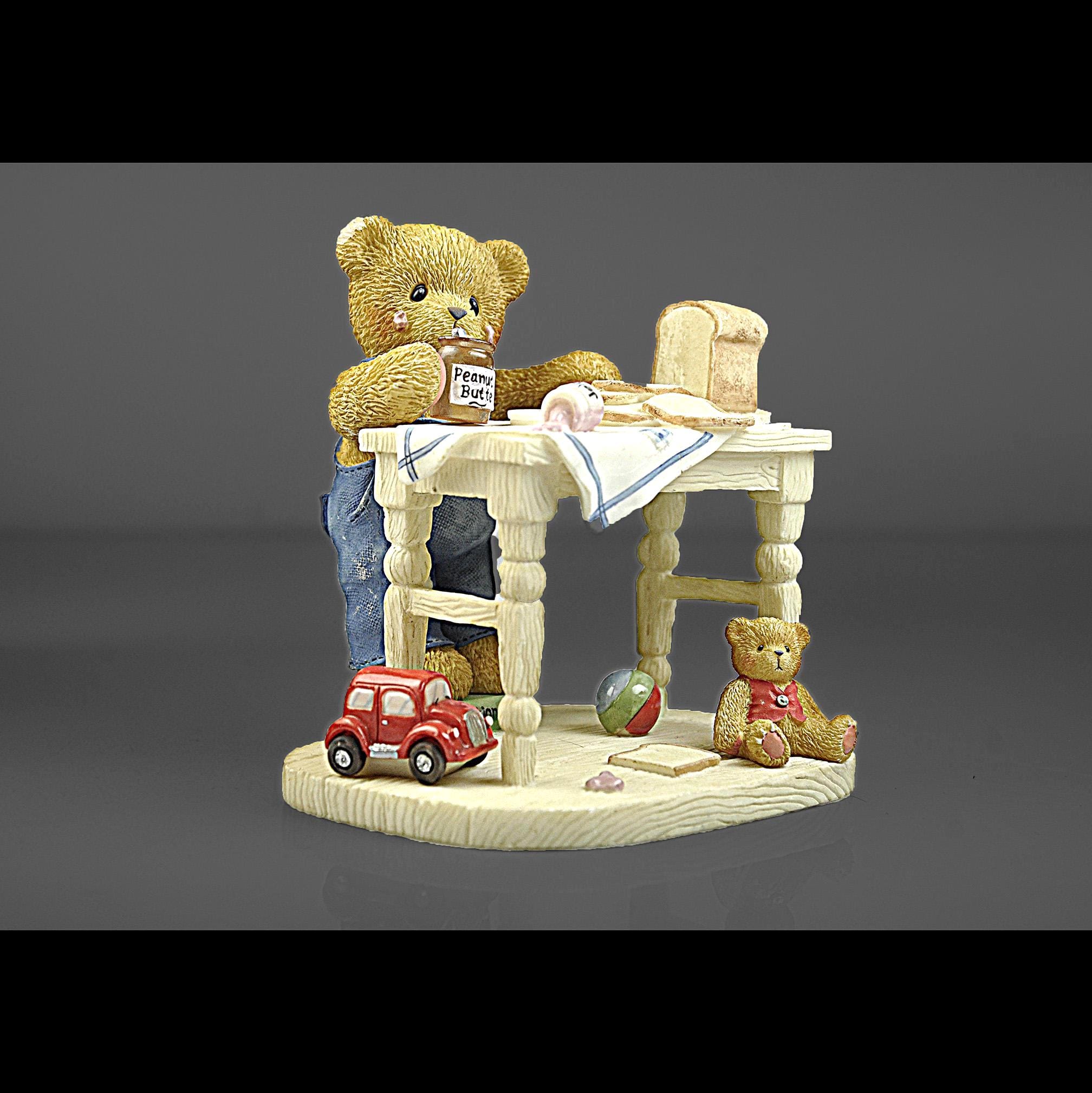 This sweet little figurine is part of the beloved Cherished Teddies collection, created by artist Priscilla Hillman and produced by Enesco Corporation. The piece is titled "You’re the Best Thing Since Sliced Bread.” Fred is standing at a small kitchen table making a peanut butter and jelly sandwich, surrounded by all the little details that made these figurines so popular. You can see the loaf of bread, the slices on the table, the peanut butter jar in his paw, a spilled jar of jelly on the table and even a small toy car and teddy bear sitting below the table. The bear himself stands on a dictionary book, which adds another charming touch to the scene. Like many pieces from the Cherished Teddies line introduced in the early 1990s, this figurine has a warm, nostalgic feel that collectors and gift buyers still enjoy today. A charming addition for a Cherished Teddies collector, teddy bear display, or nostalgic figurine collection.
