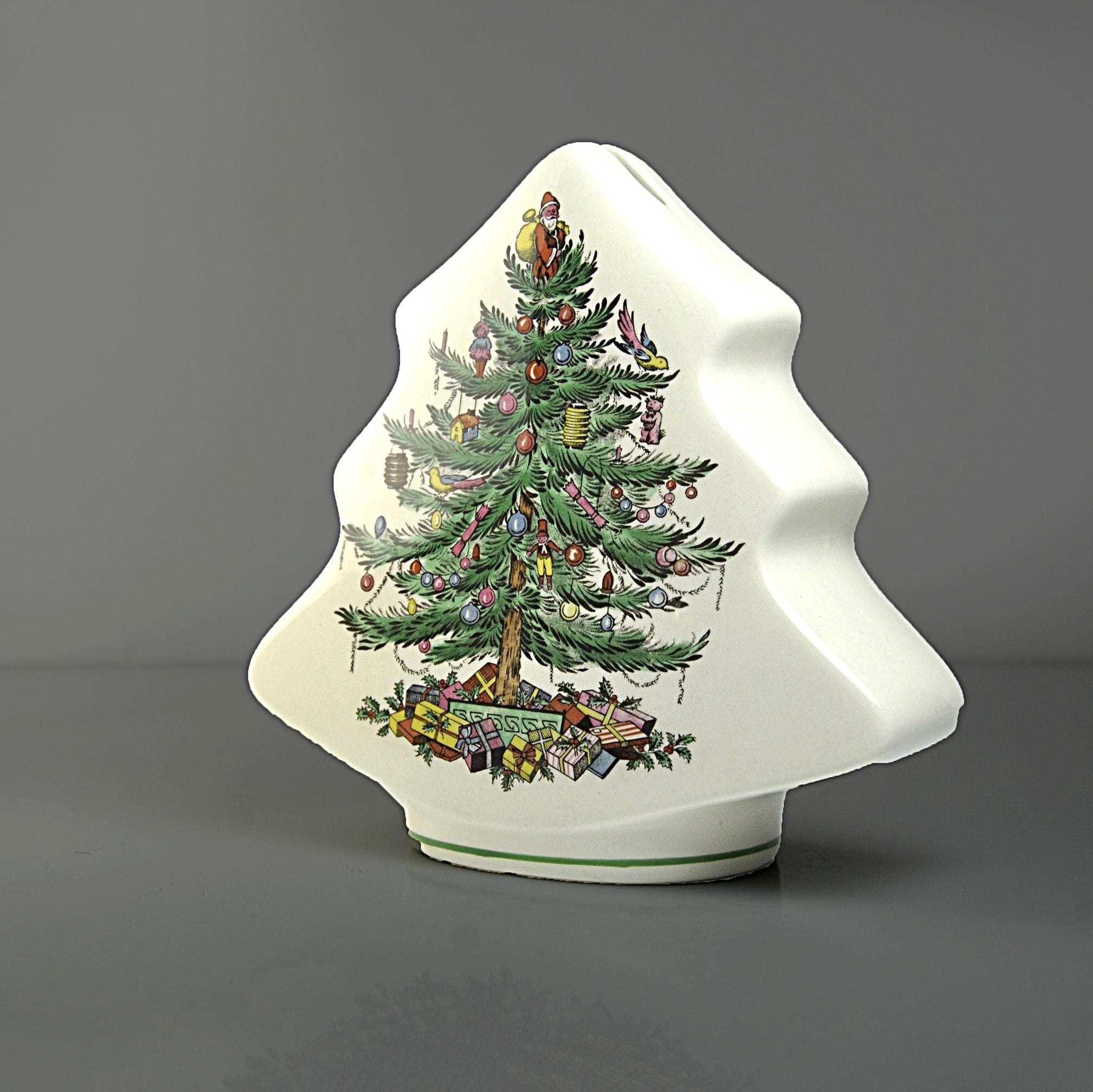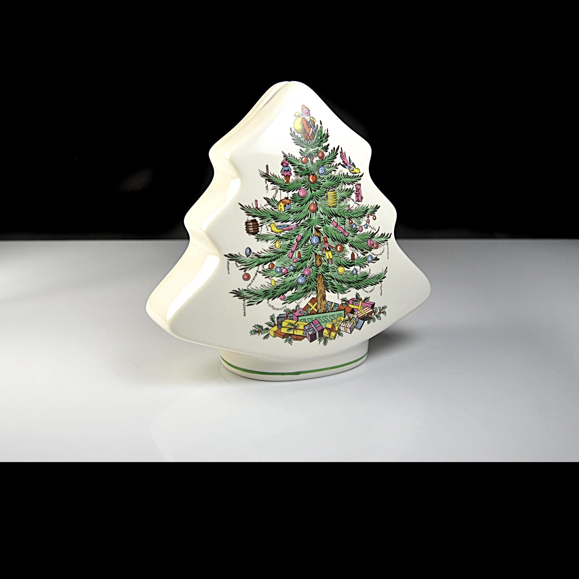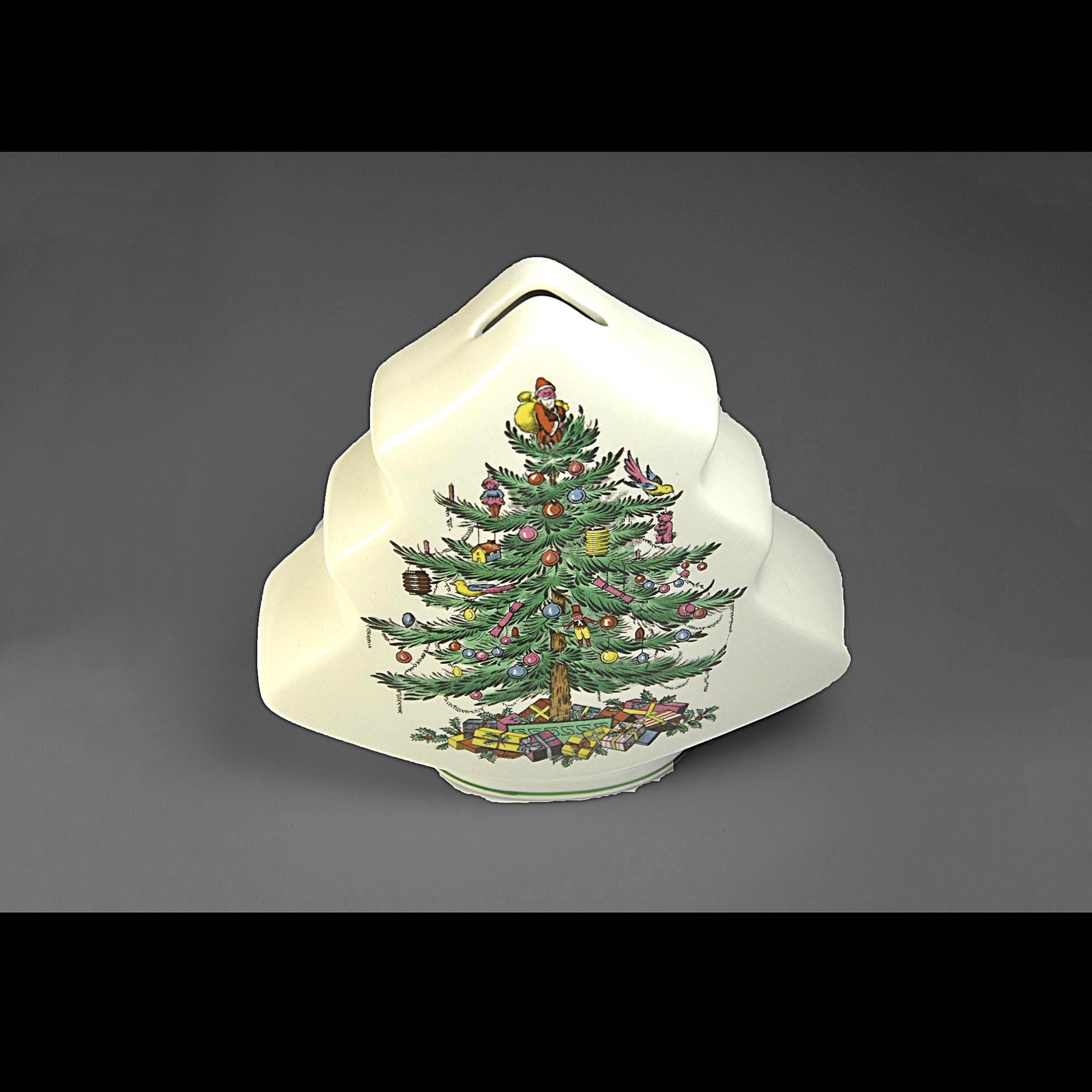 This charming little bank comes from the well-known Spode Christmas Tree collection, one of the most recognizable holiday patterns ever made. The design features a beautifully decorated Christmas tree filled with tiny ornaments and toys, with colorful wrapped gifts gathered underneath. The shape of the piece itself follows the outline of the tree, making it both decorative and practical as a coin bank. The Spode Christmas Tree pattern was first introduced in 1938 and quickly became a favorite holiday design. Over the years the pattern appeared on everything from dinnerware to ornaments and novelty pieces like this bank.