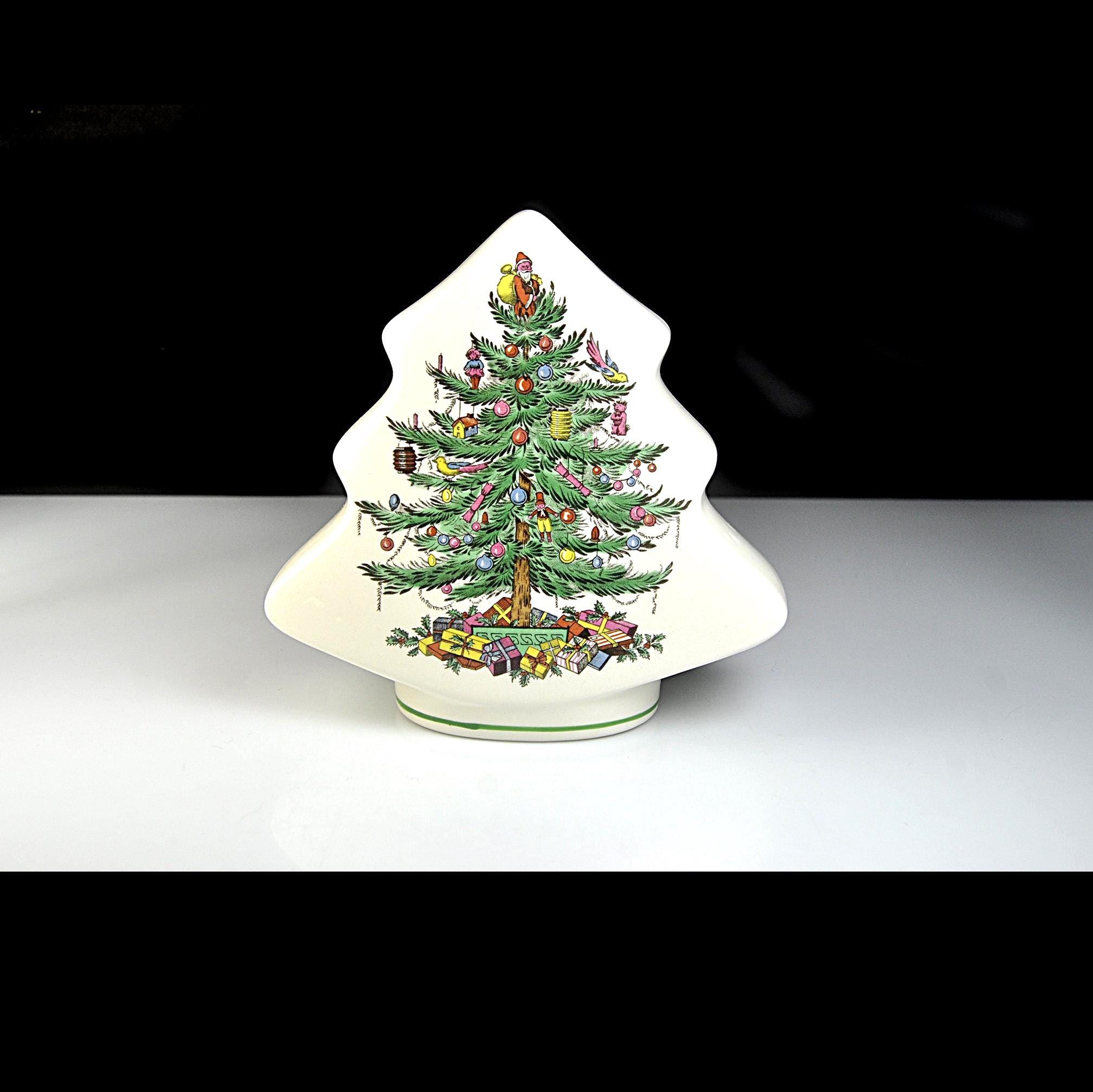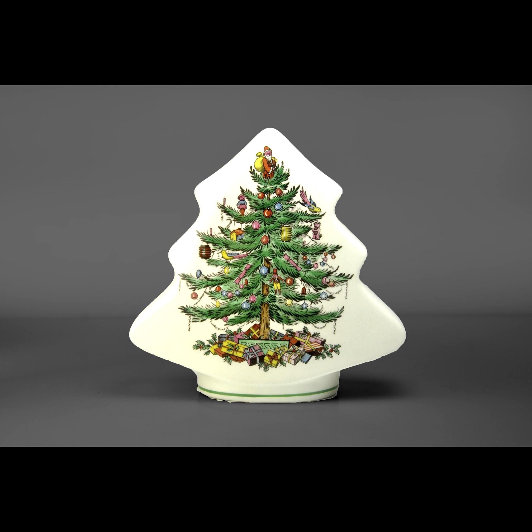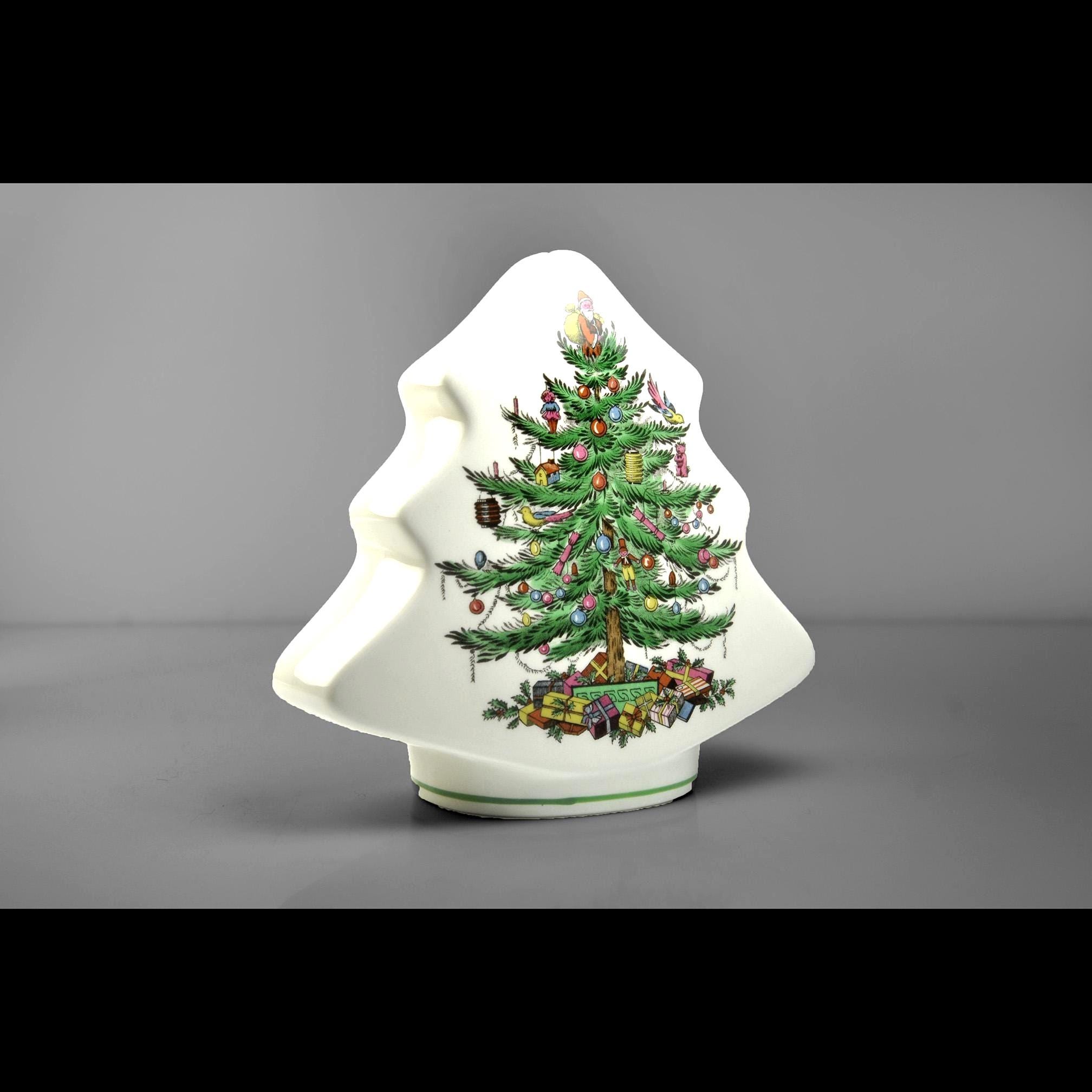 This charming little bank comes from the well-known Spode Christmas Tree collection, one of the most recognizable holiday patterns ever made. The design features a beautifully decorated Christmas tree filled with tiny ornaments and toys, with colorful wrapped gifts gathered underneath. The shape of the piece itself follows the outline of the tree, making it both decorative and practical as a coin bank. The Spode Christmas Tree pattern was first introduced in 1938 and quickly became a favorite holiday design. Over the years the pattern appeared on everything from dinnerware to ornaments and novelty pieces like this bank.