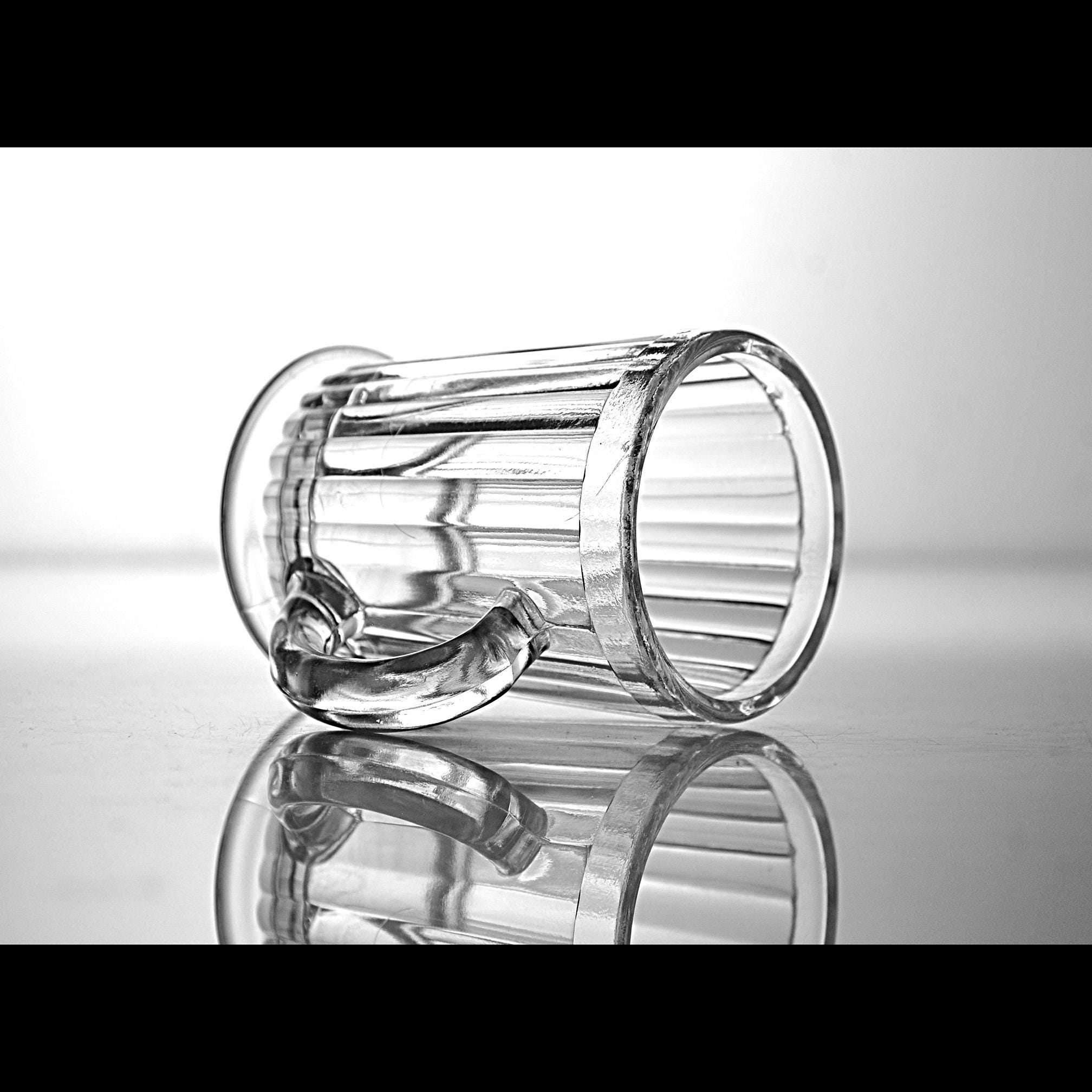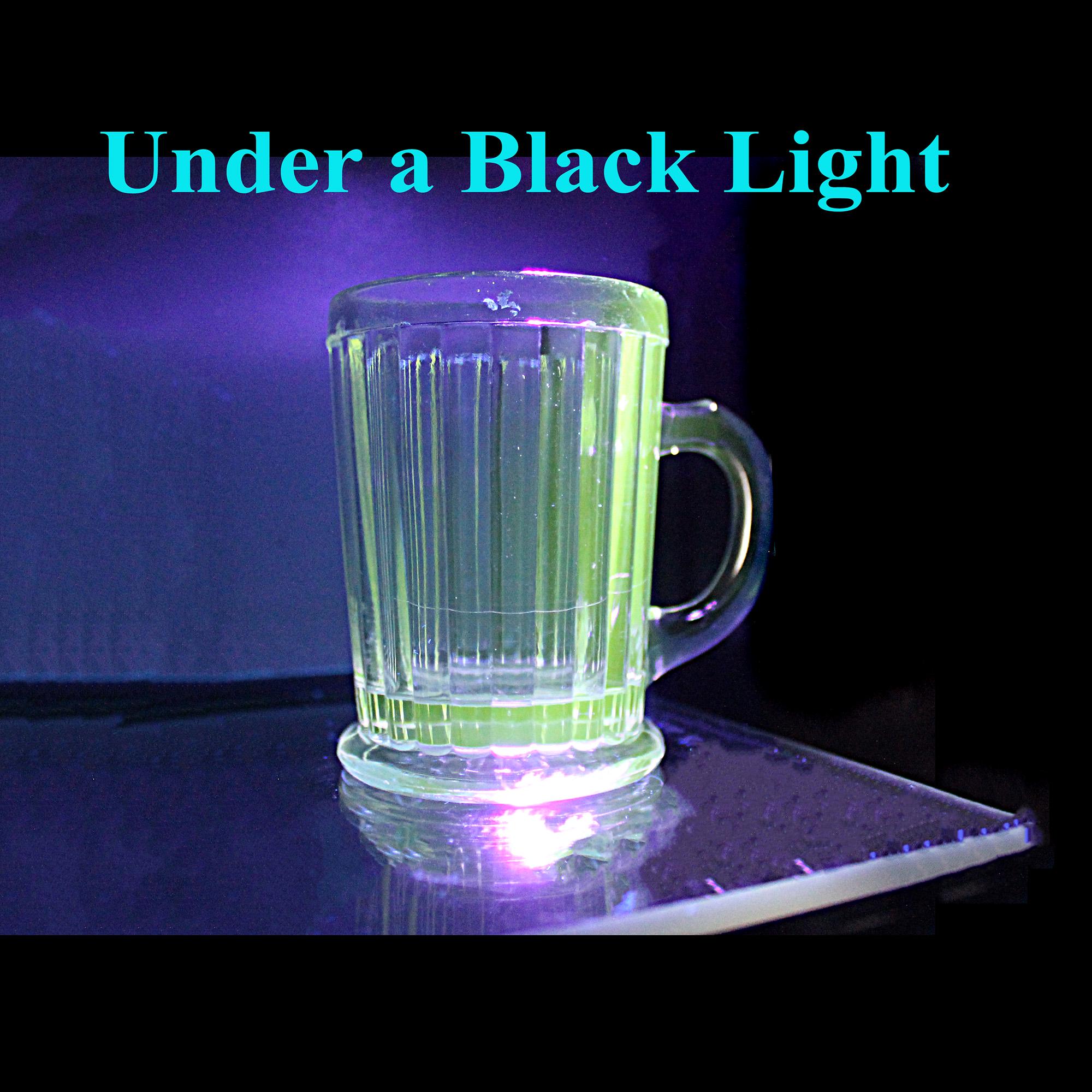 Under a black light the glass glows a bright green, showing that it contains magnesium, which was commonly used in glassmaking during this time period. This glass is a favorite with collectors because of its unique glow. The exact maker of this mug cannot be identified. Many glass factories in the Ohio and Pennsylvania glassmaking regions produced similar ribbed mugs, and molds were often shared between companies.