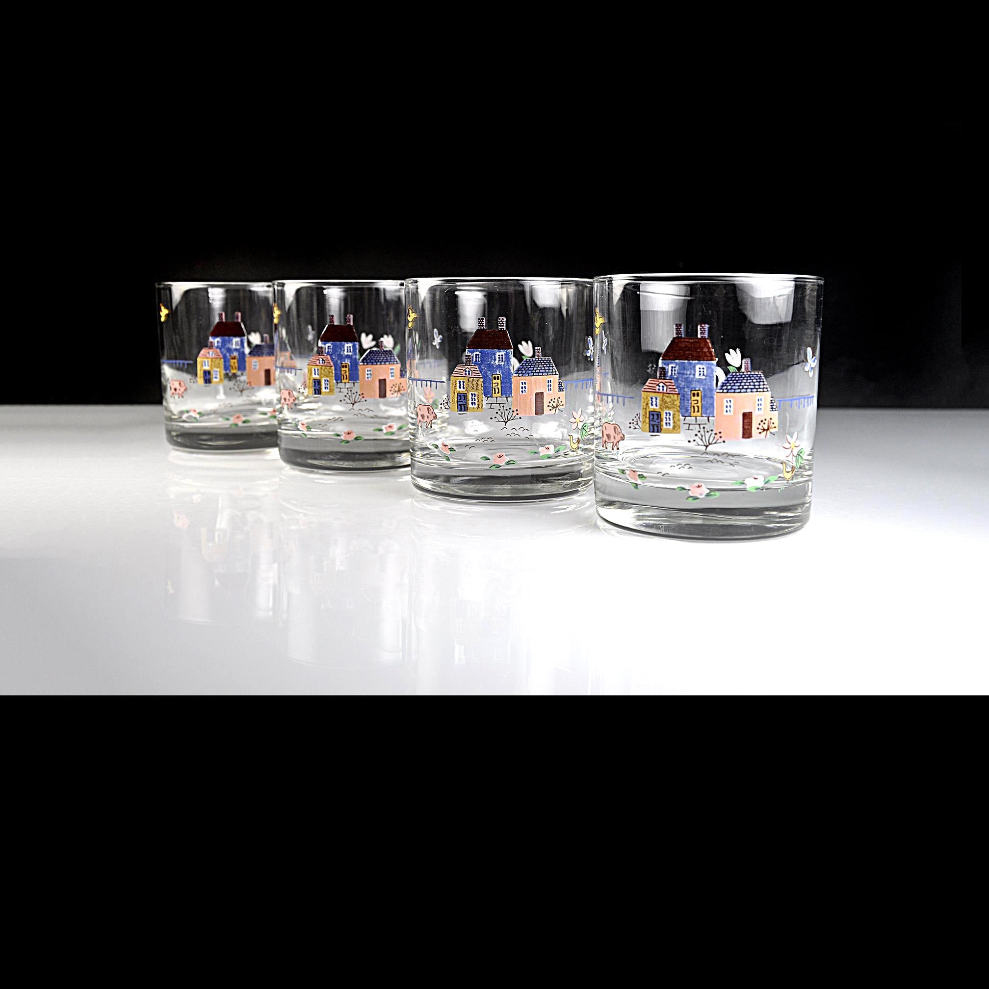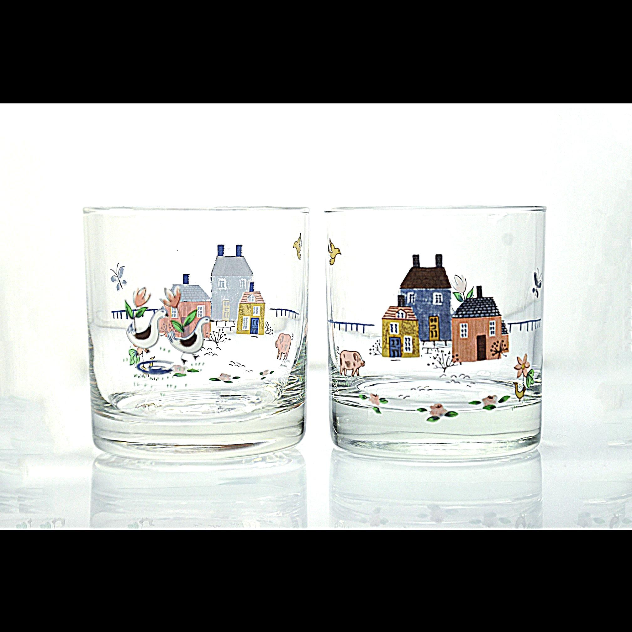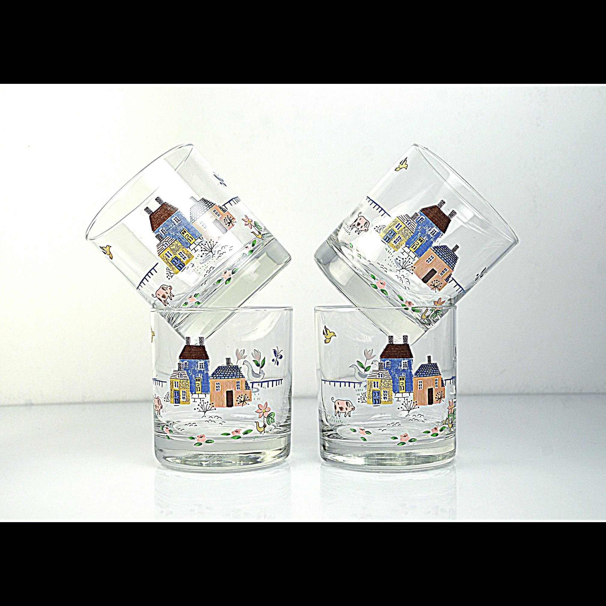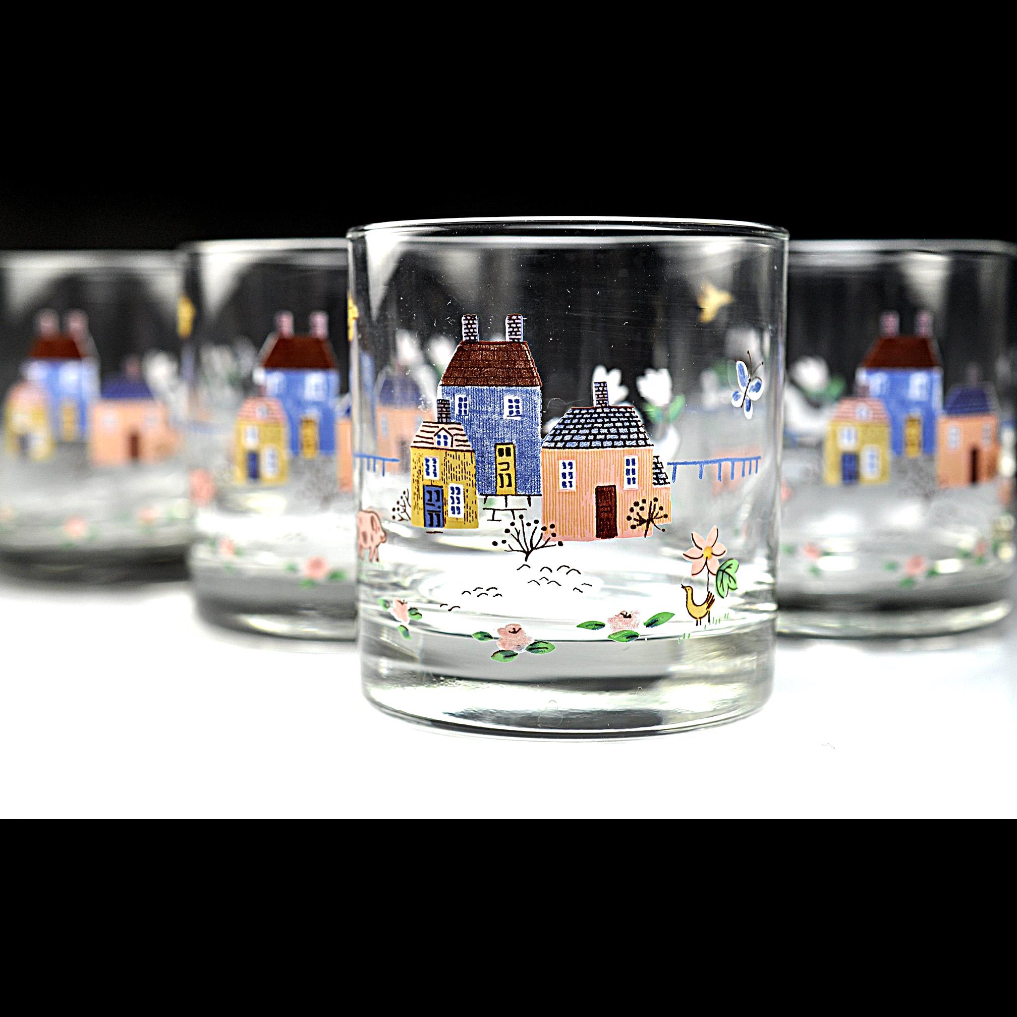 These cheerful rock glasses come from the Heartland pattern by International and capture the cozy country style that was so popular in the 1980s. Each glass is decorated with a charming countryside scene featuring cottages, flowers, birds, and farm animals. The soft colors and whimsical design give them a warm farmhouse feel that fits perfectly in a country kitchen or on a vintage bar cart. The glasses have a sturdy, thick base and hold approximately 8 ounces, making them ideal for whiskey, cocktails, juice, or everyday use.