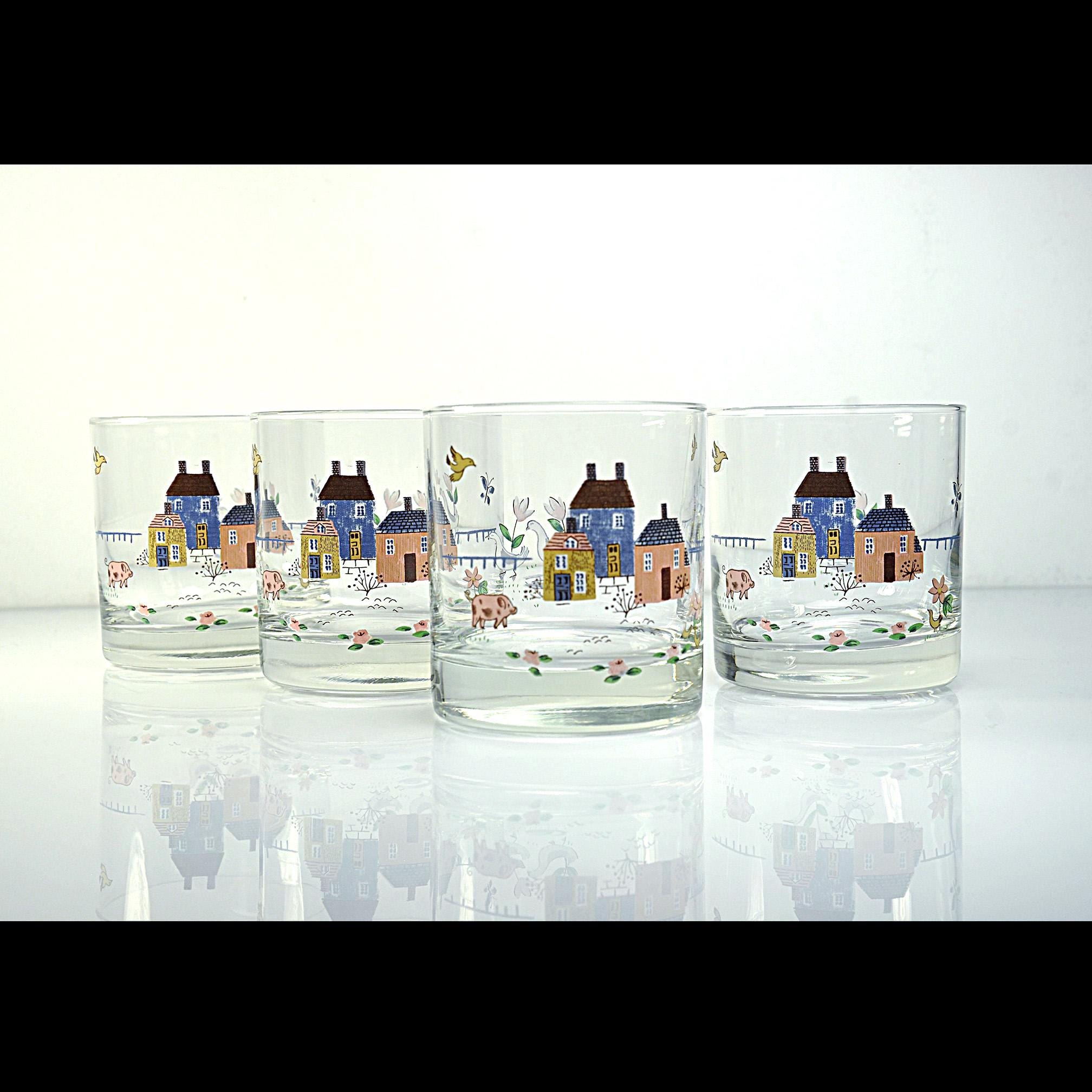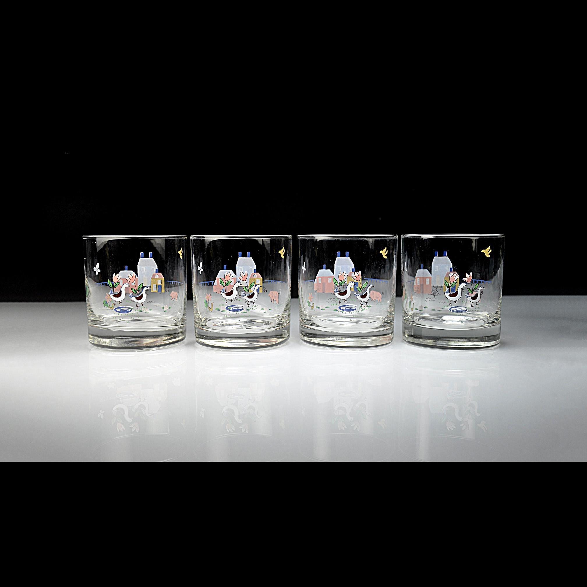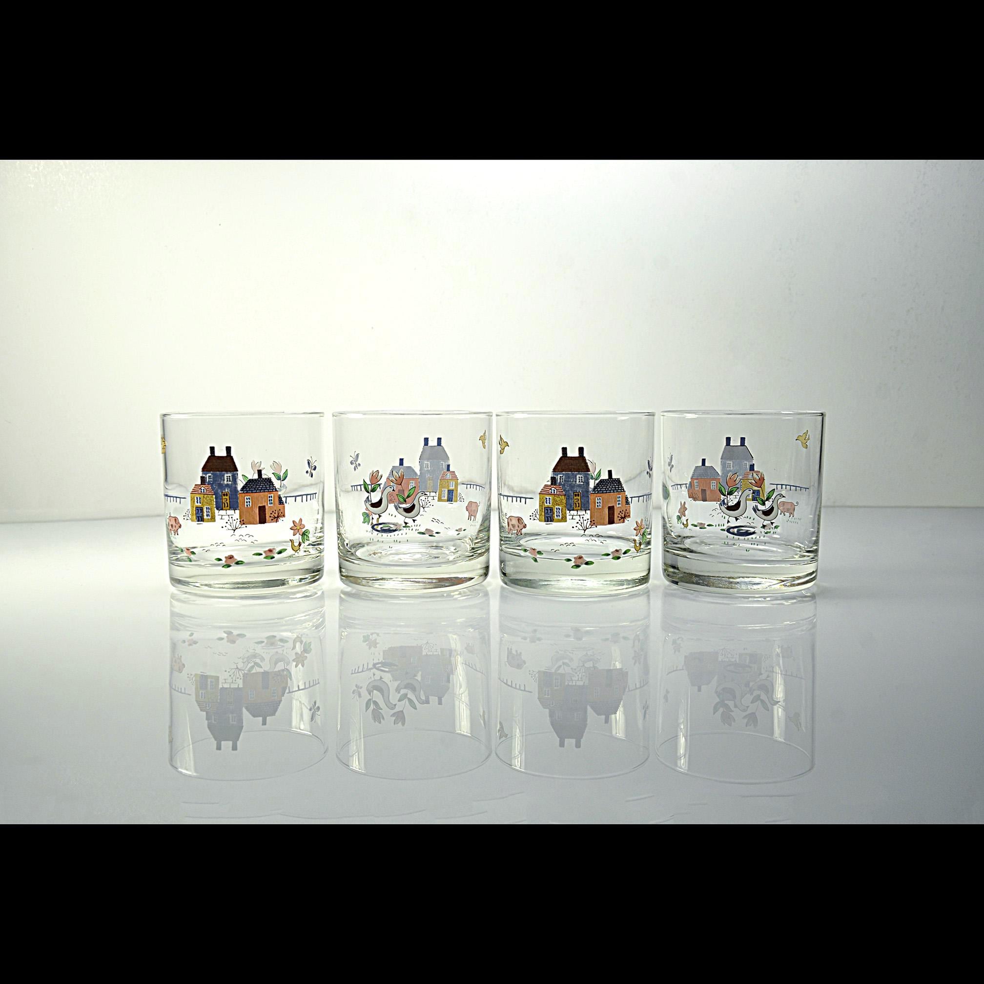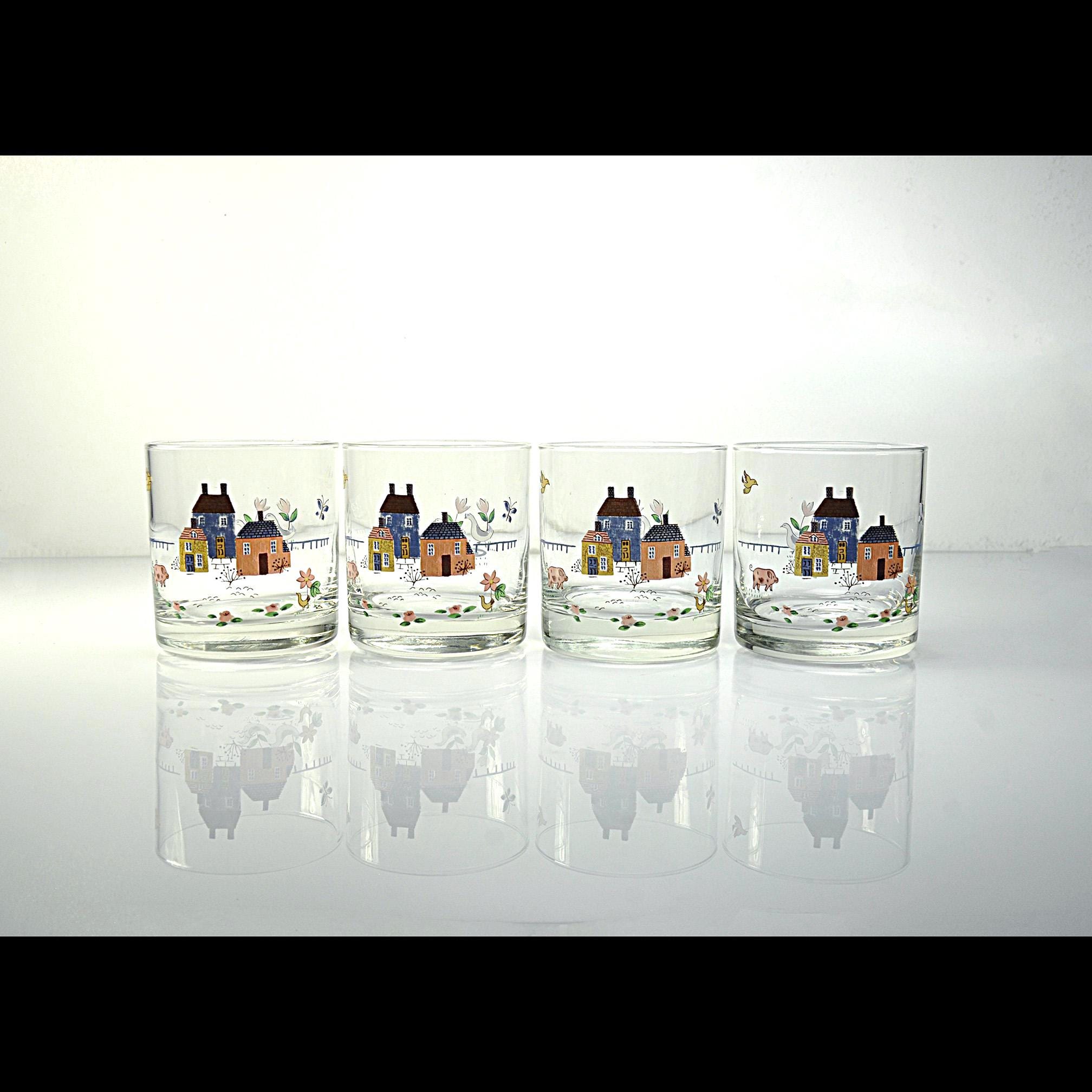 These cheerful rock glasses come from the Heartland pattern by International and capture the cozy country style that was so popular in the 1980s. Each glass is decorated with a charming countryside scene featuring cottages, flowers, birds, and farm animals. The soft colors and whimsical design give them a warm farmhouse feel that fits perfectly in a country kitchen or on a vintage bar cart. The glasses have a sturdy, thick base and hold approximately 8 ounces, making them ideal for whiskey, cocktails, juice, or everyday use.