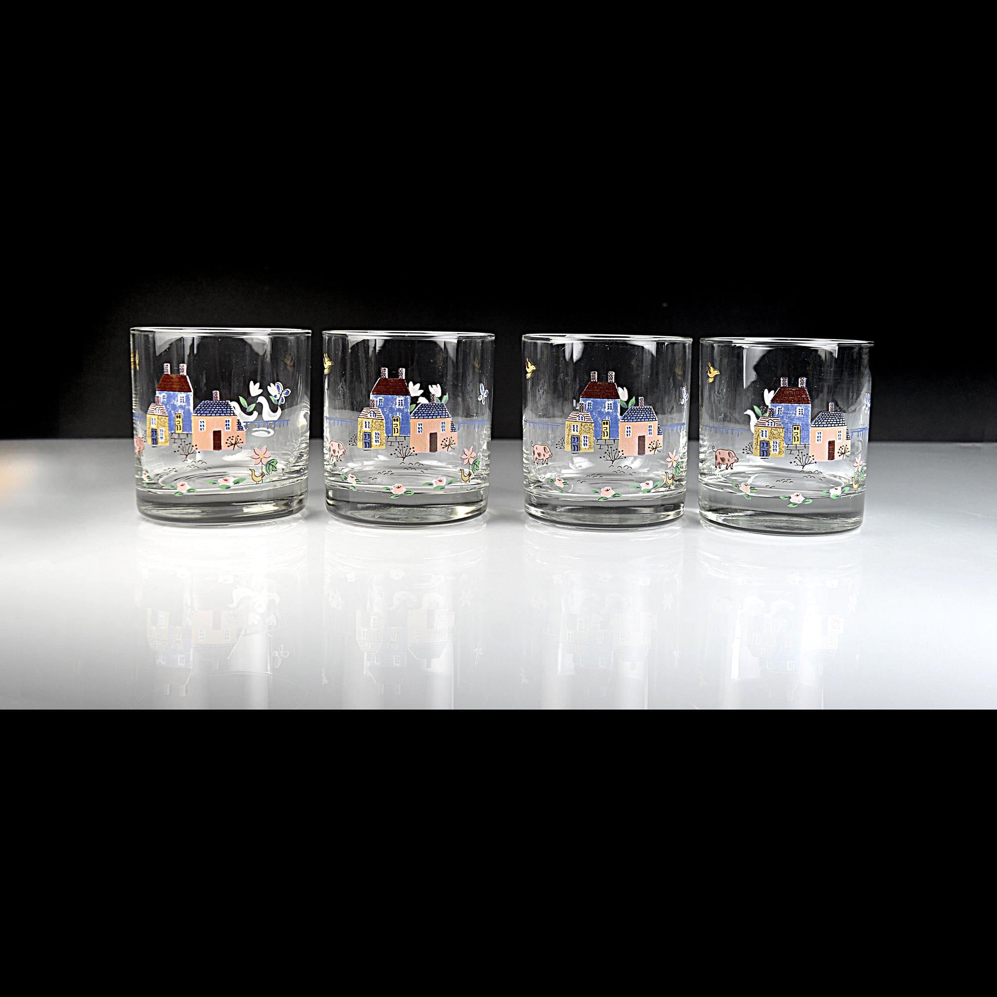 This listing is for a set of four matching glasses. They are in excellent vintage condition with no chips or cracks. The enamel decoration is bright and intact with no fading, scratches or damage.