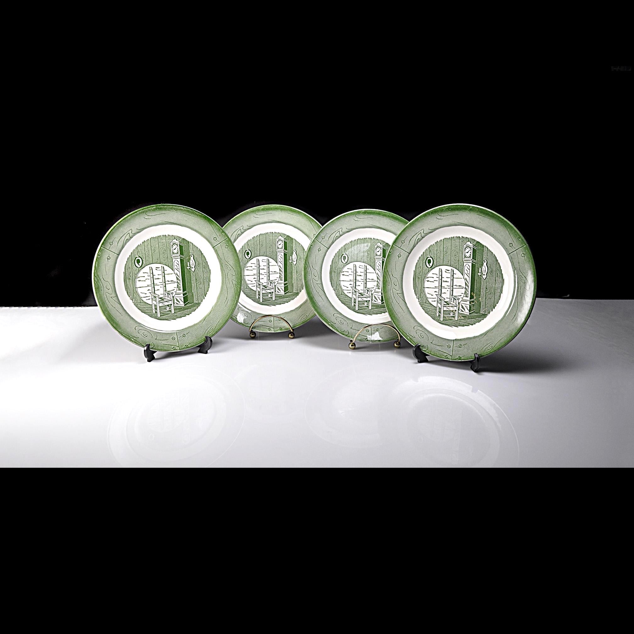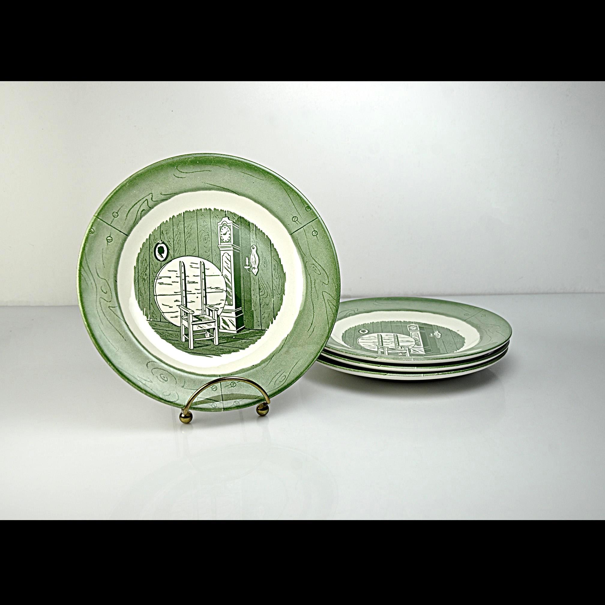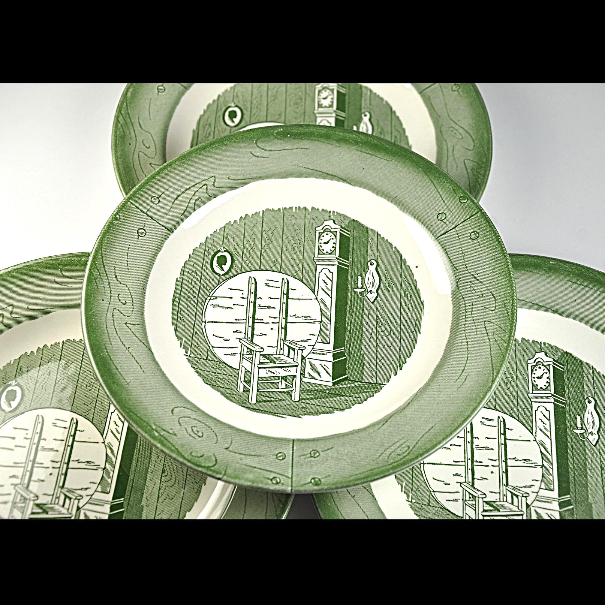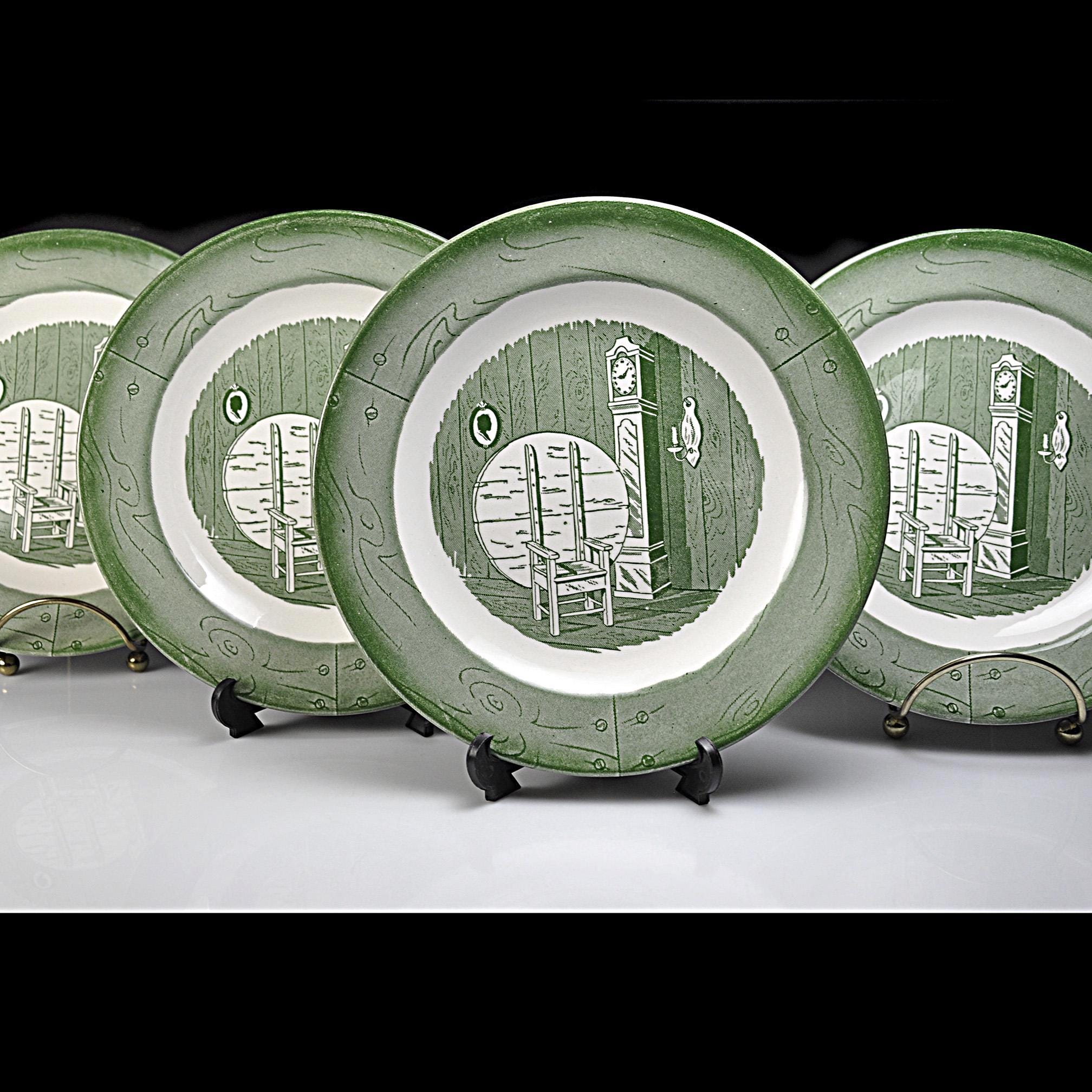 These vintage salad plates were made by the Royal China Company of Sebring, Ohio and come from their Colonial Homestead Green pattern. The design has that classic early American look that was very popular in mid-century kitchens. Each plate shows a cozy colonial room scene with a rocking chair and tall grandfather clock, surrounded by a soft green border. It has the kind of simple country charm that fits right in with farmhouse or cottage style kitchens. Royal China produced this pattern around the late 1940s into the 1950s, when many American families were setting up their first homes after the war. These were everyday dishes meant to be used, which is why they were made sturdy enough to last.