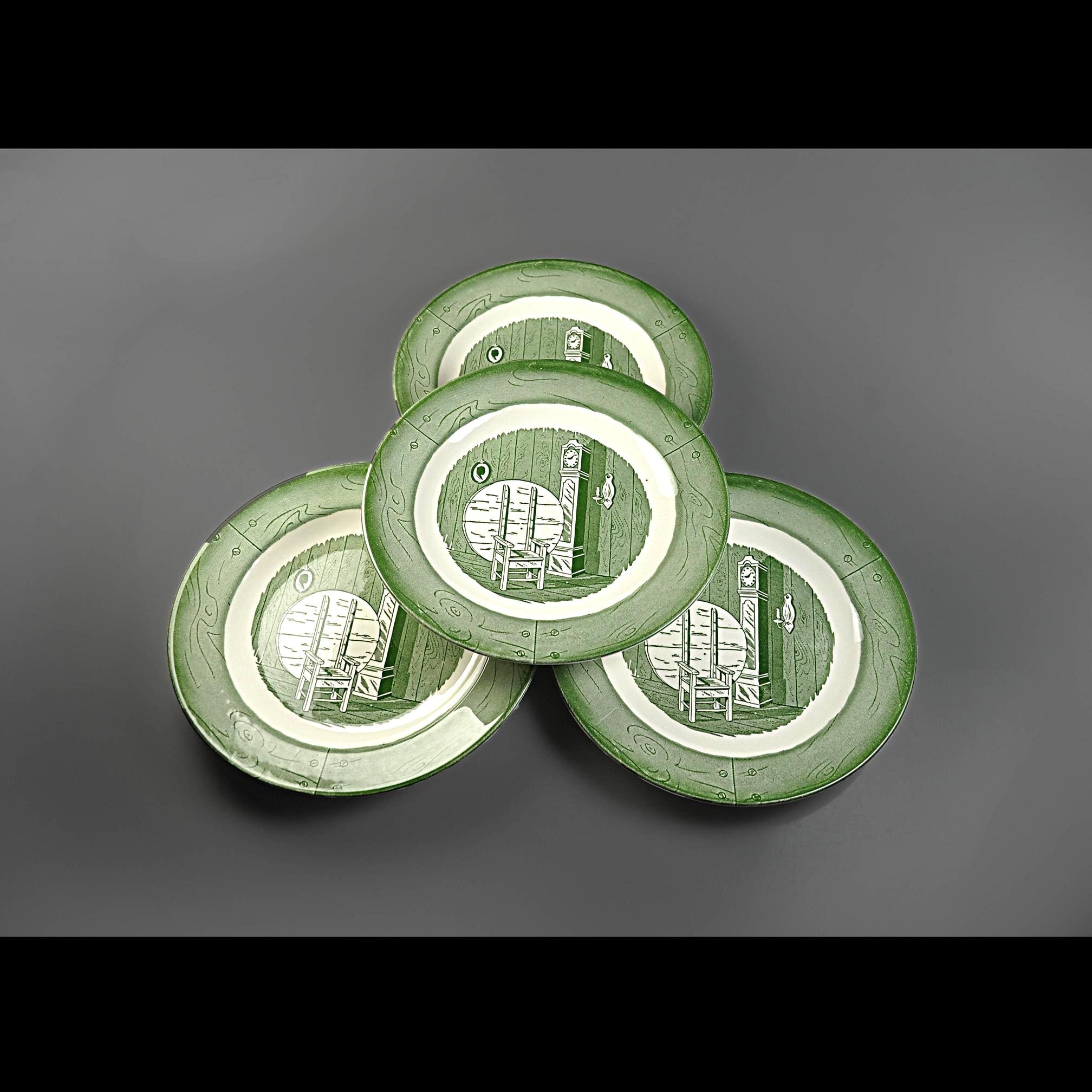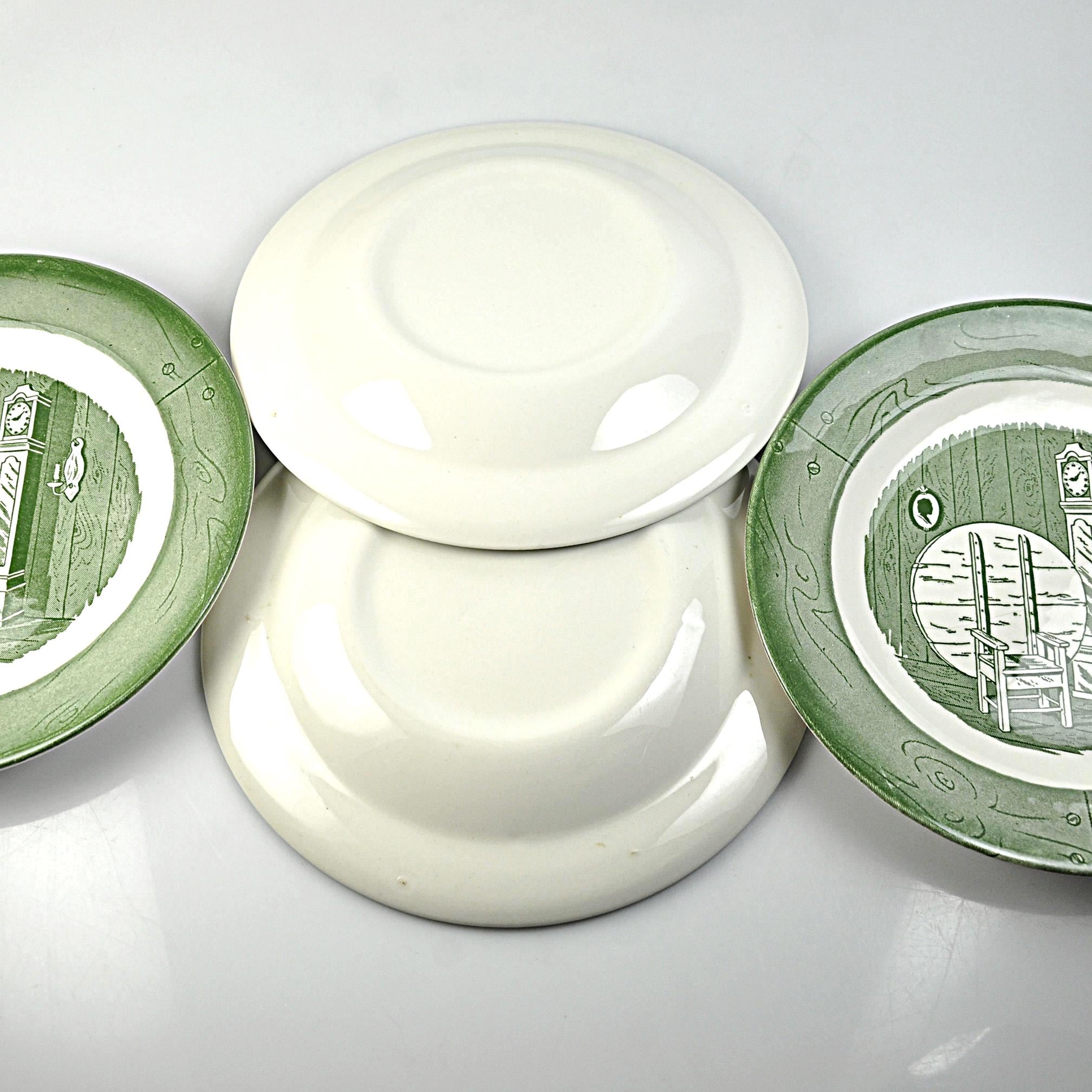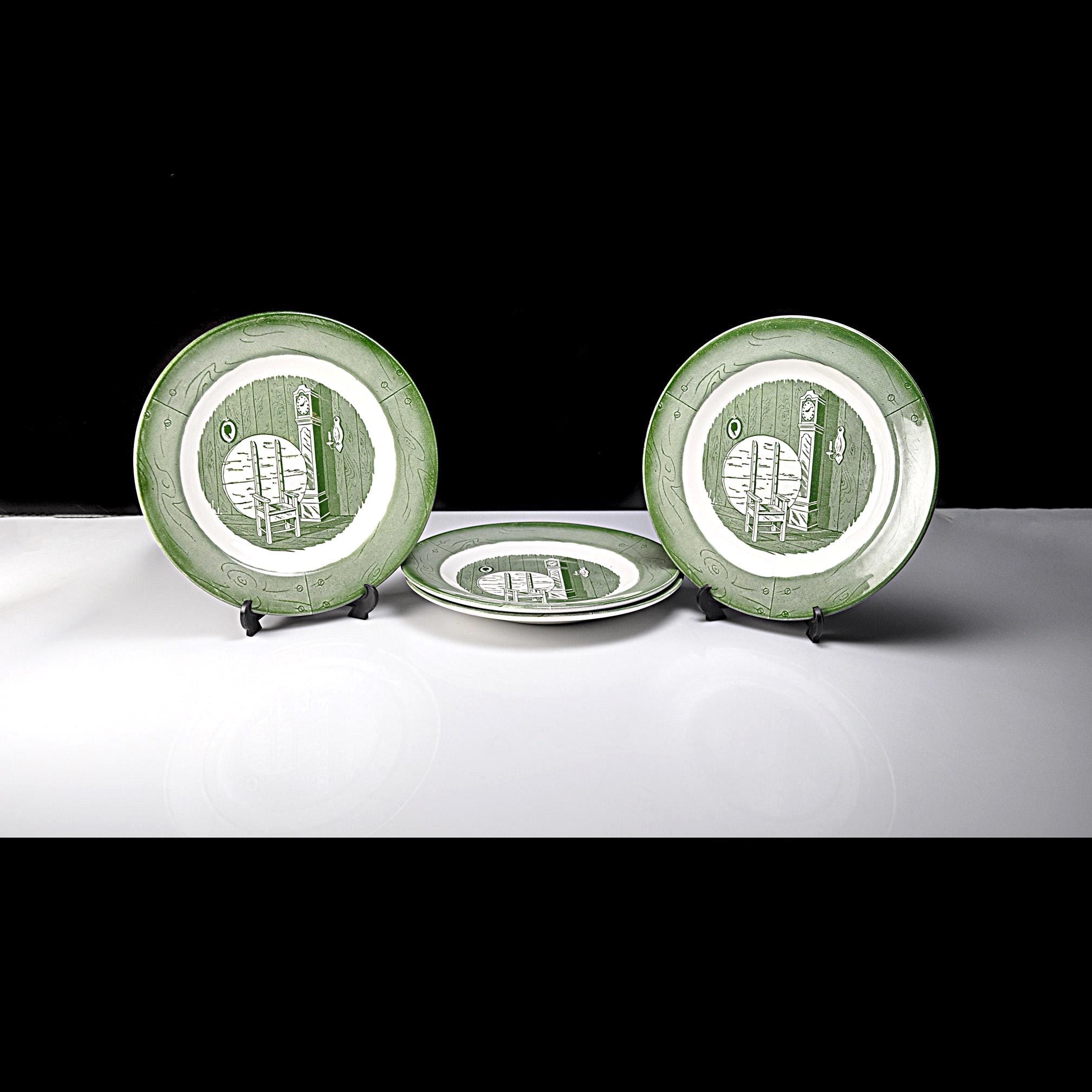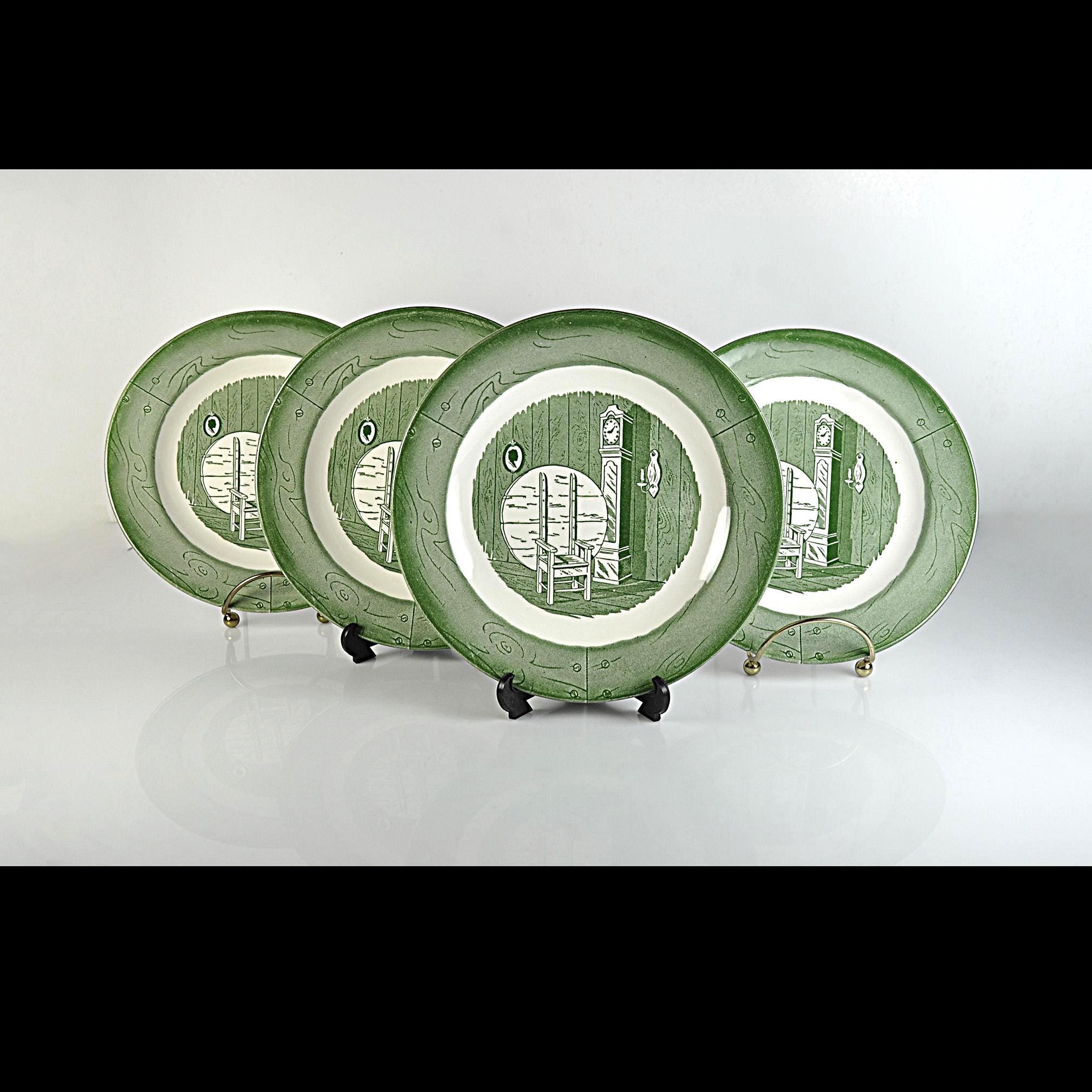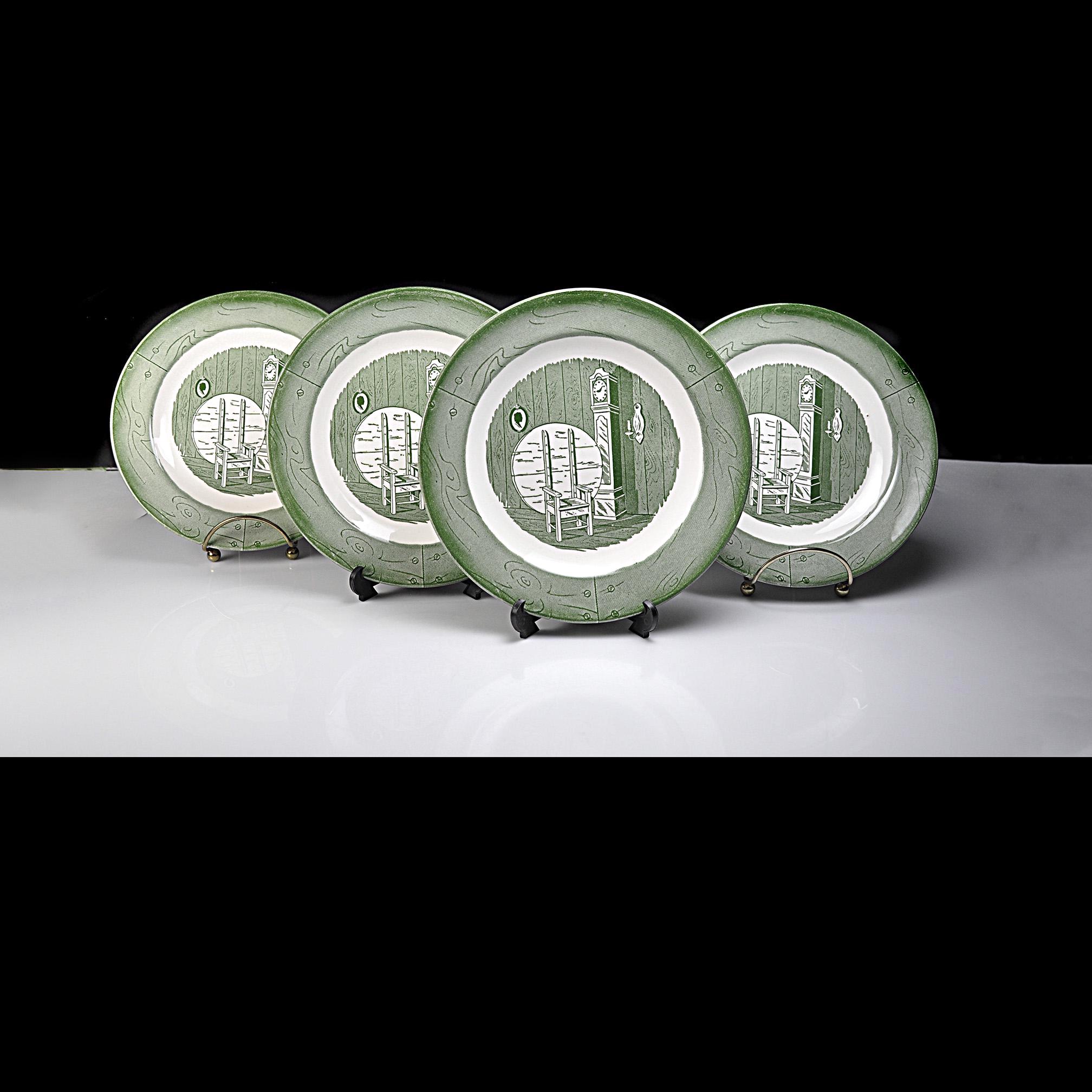 This listing is for a set of four salad plates. They are a nice size for salads, sandwiches, or desserts and the green pattern still displays beautifully. They would look great on the table, in a farmhouse kitchen, or added to an existing Colonial Homestead set.