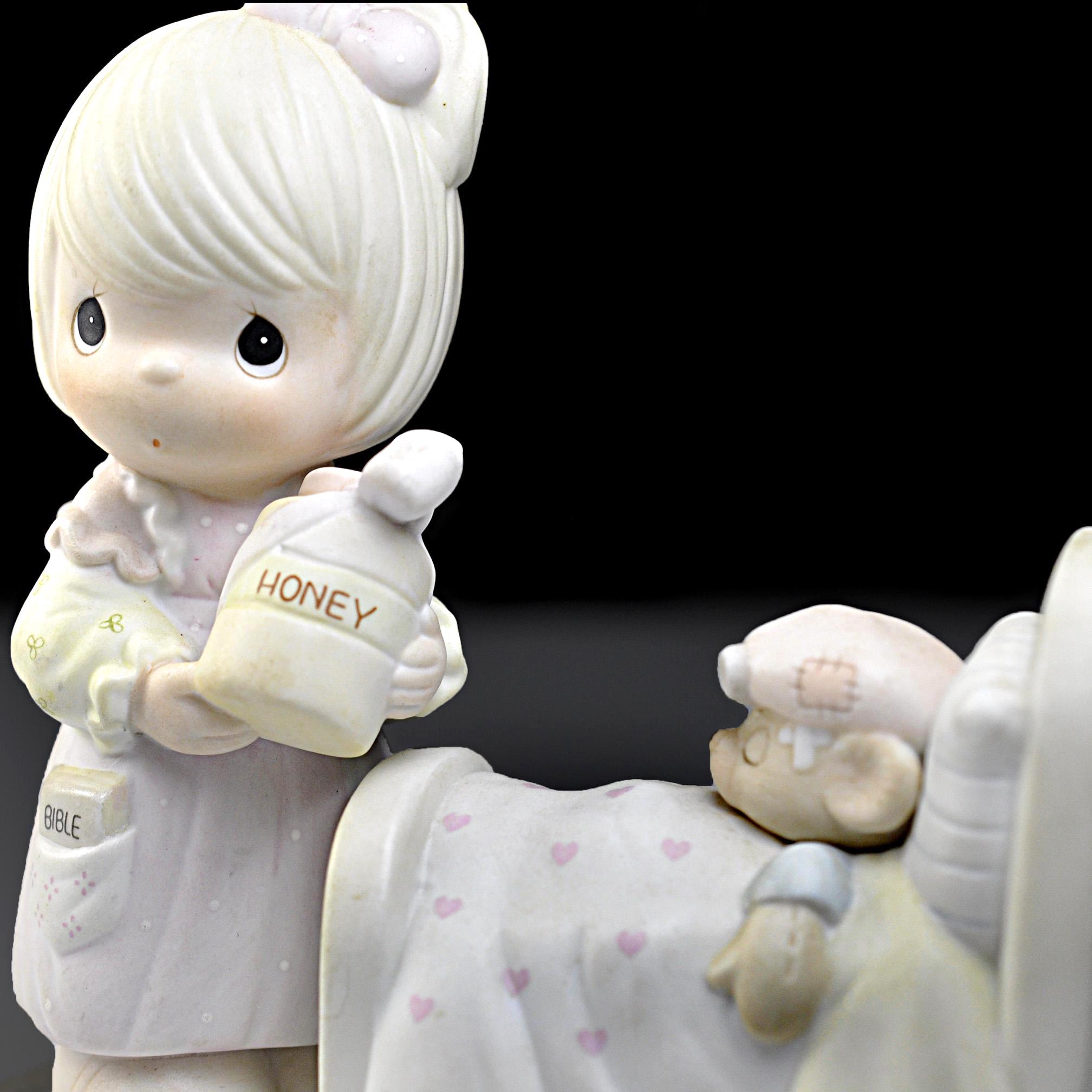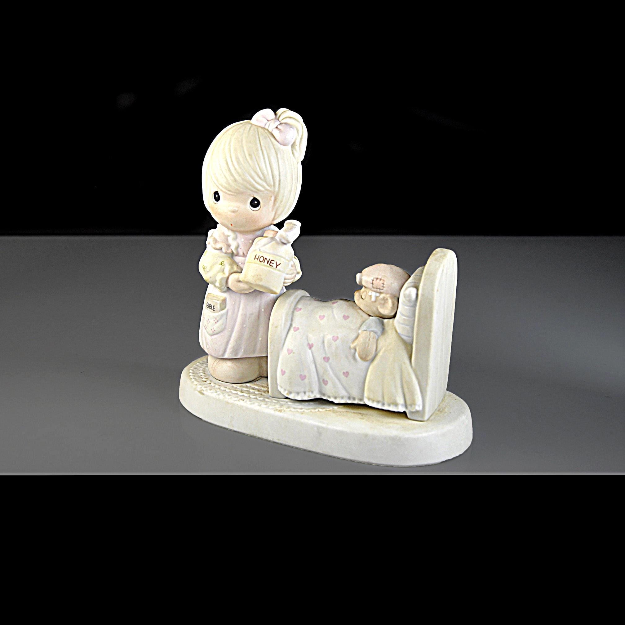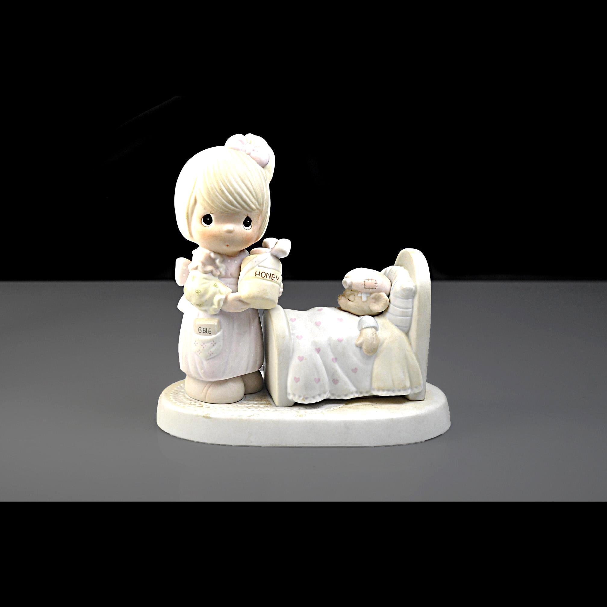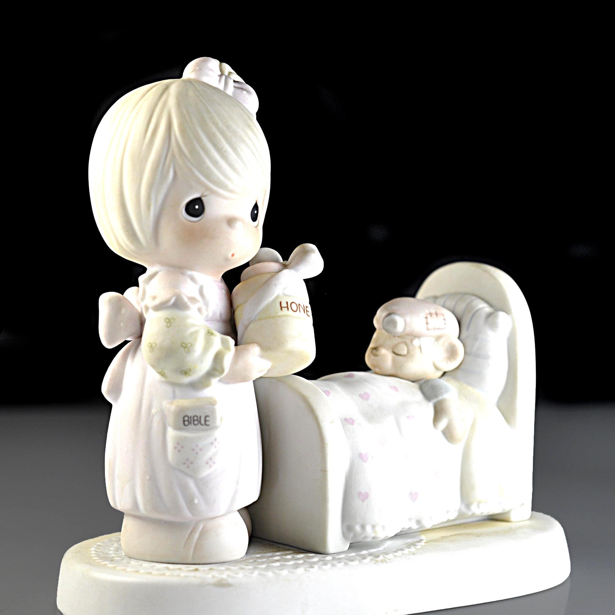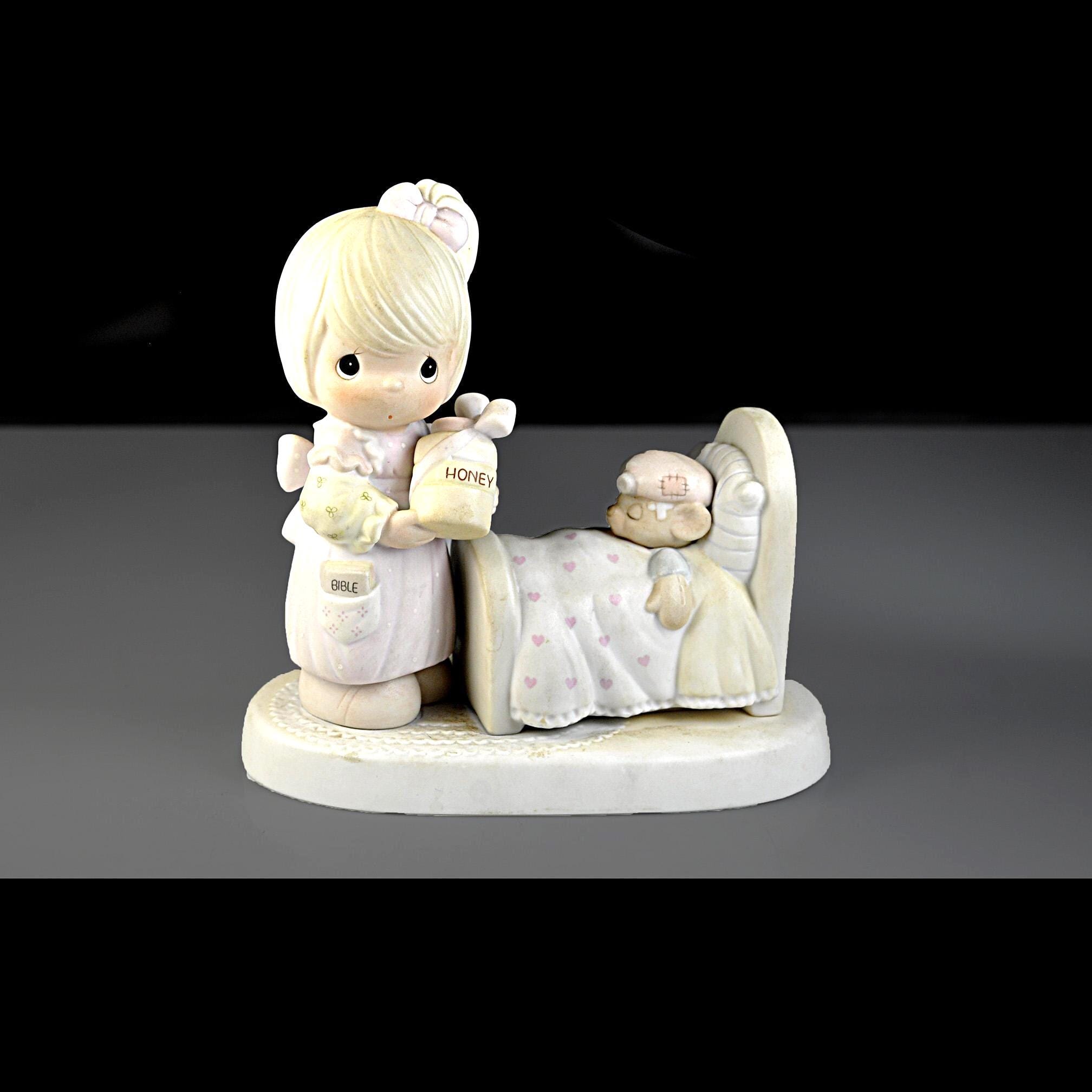 This Precious Moments figurine is titled “Make Me A Blessing.” It shows a caring nurse standing beside a little patient tucked into bed. The nurse is holding a jar of honey and has a small Bible tucked into her pocket, a gentle reminder of kindness and caring for others. This piece was designed by Samuel J. Butcher and produced by Enesco in the 1980s as part of the well-known Precious Moments figurine collection. The bottom of the figurine shows the copyright date of 1986 and the cedar tree production mark, which was used on pieces produced in 1987. It is a sweet scene and one that many people connect with right away. Pieces like this were often given as gifts to nurses, caregivers, or anyone who spends their time helping others. The figurine measures approximately 5½ inches high, 5½ inches long, and 3 inches wide. It displays beautifully and would make a thoughtful gift or a nice addition to a Precious Moments collection.