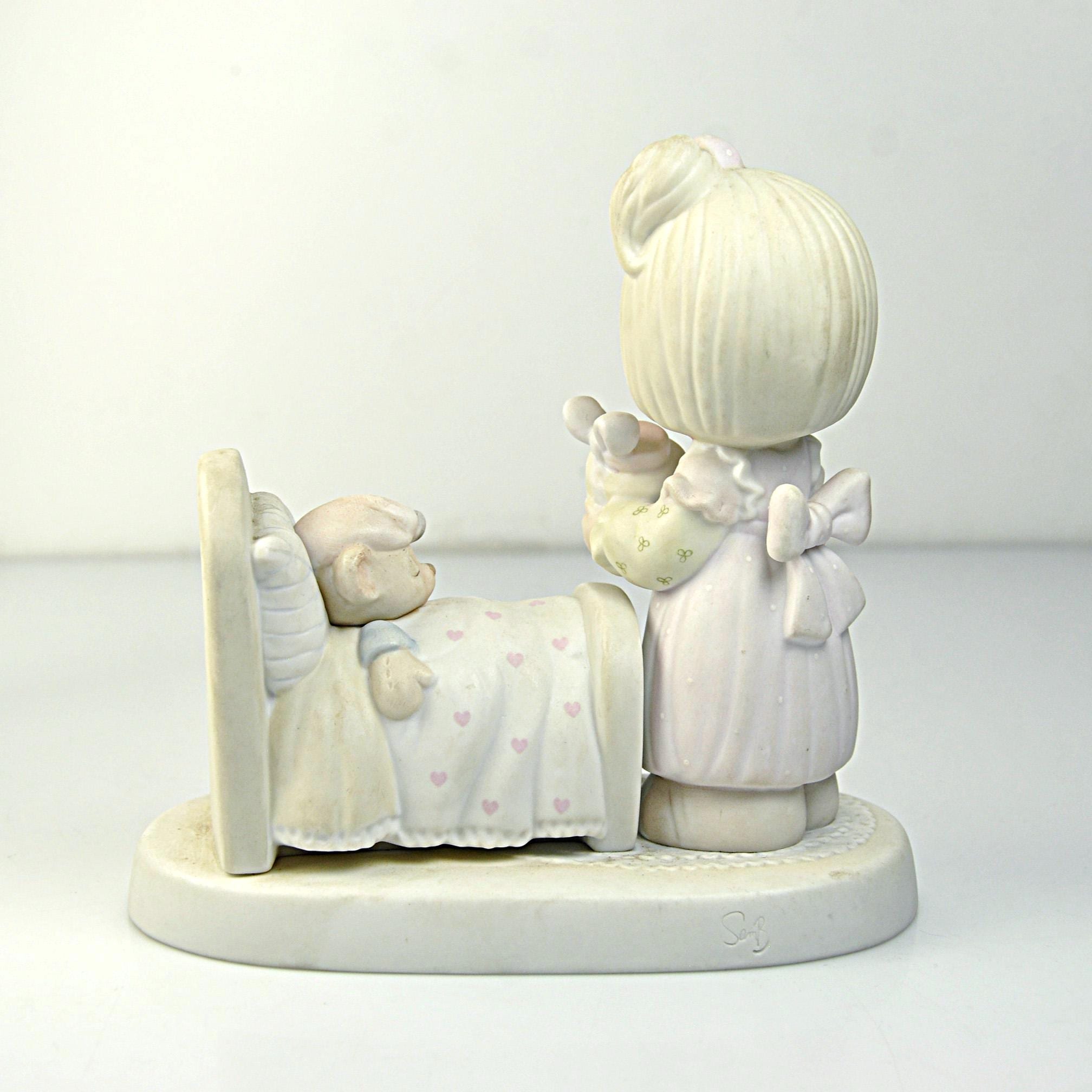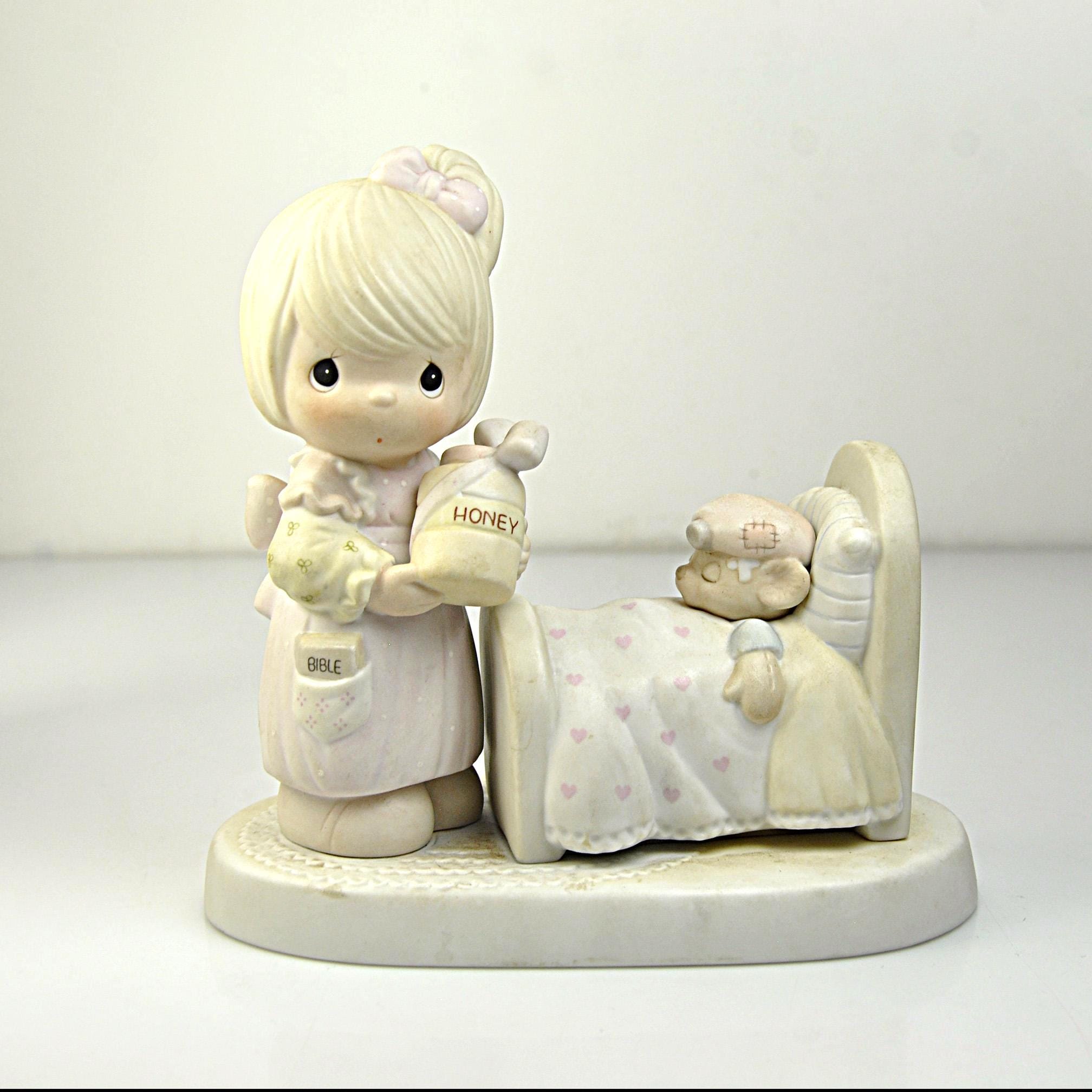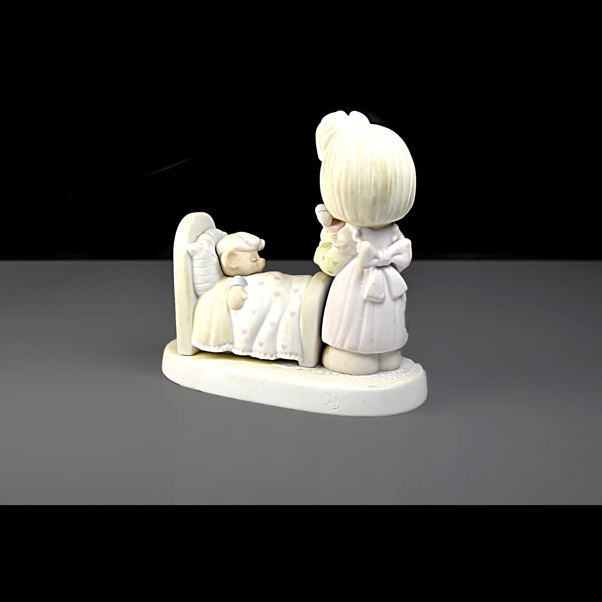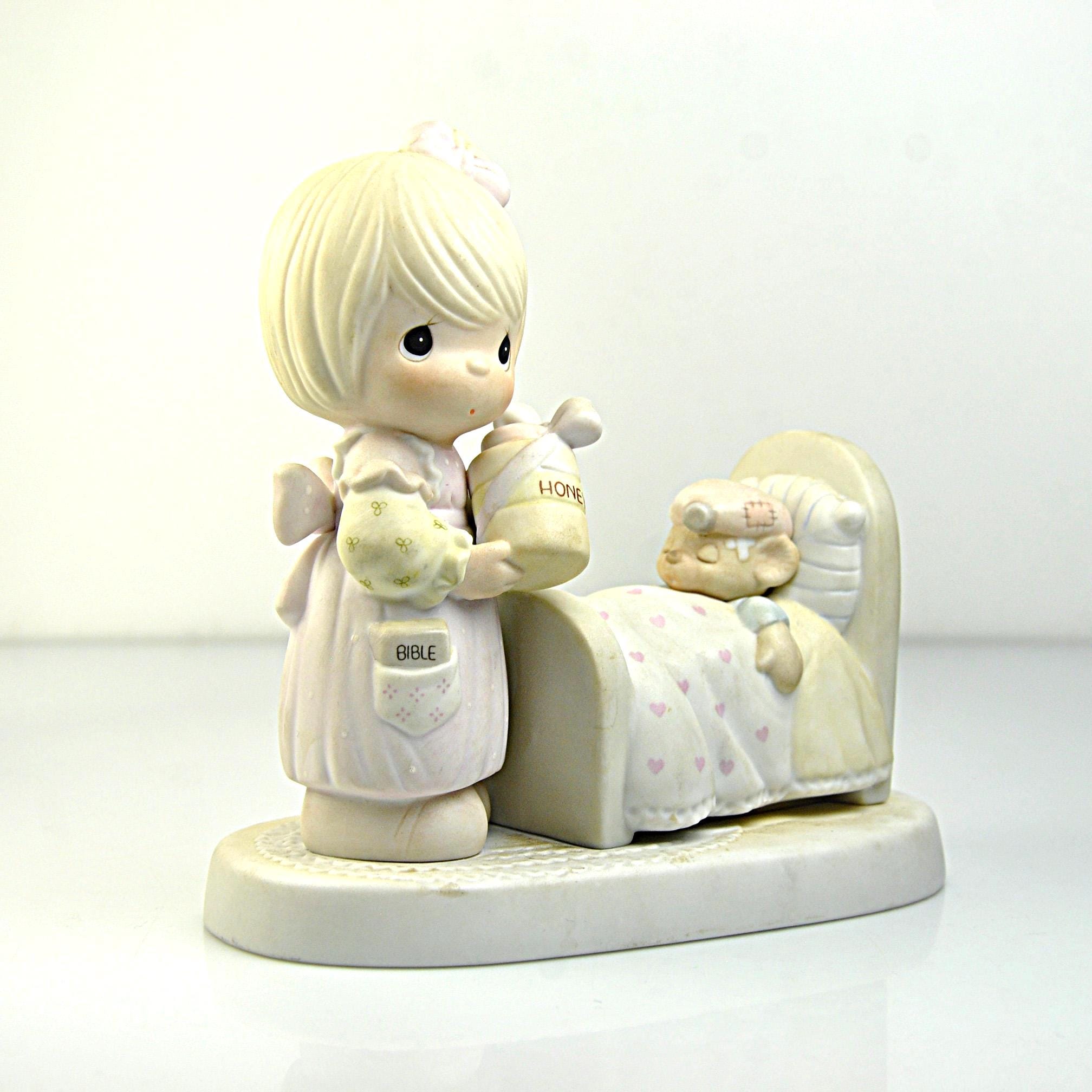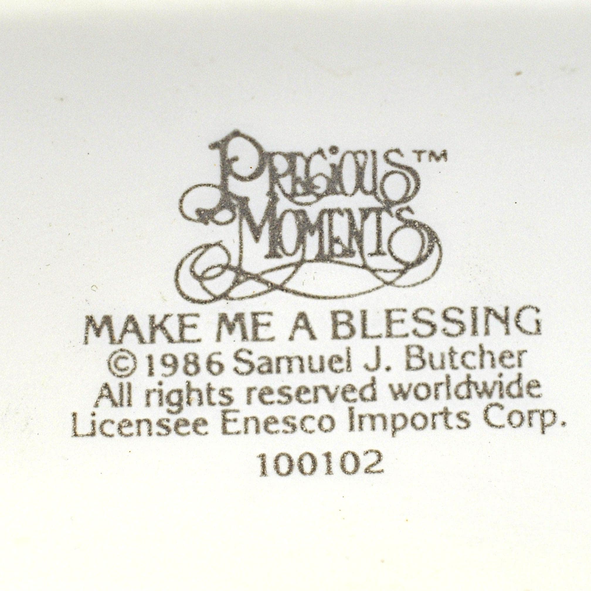 This Precious Moments figurine is titled “Make Me A Blessing.” It shows a caring nurse standing beside a little patient tucked into bed. The nurse is holding a jar of honey and has a small Bible tucked into her pocket, a gentle reminder of kindness and caring for others. This piece was designed by Samuel J. Butcher and produced by Enesco in the 1980s as part of the well-known Precious Moments figurine collection. The bottom of the figurine shows the copyright date of 1986 and the cedar tree production mark, which was used on pieces produced in 1987. It is a sweet scene and one that many people connect with right away. Pieces like this were often given as gifts to nurses, caregivers, or anyone who spends their time helping others. The figurine measures approximately 5½ inches high, 5½ inches long, and 3 inches wide. It displays beautifully and would make a thoughtful gift or a nice addition to a Precious Moments collection.