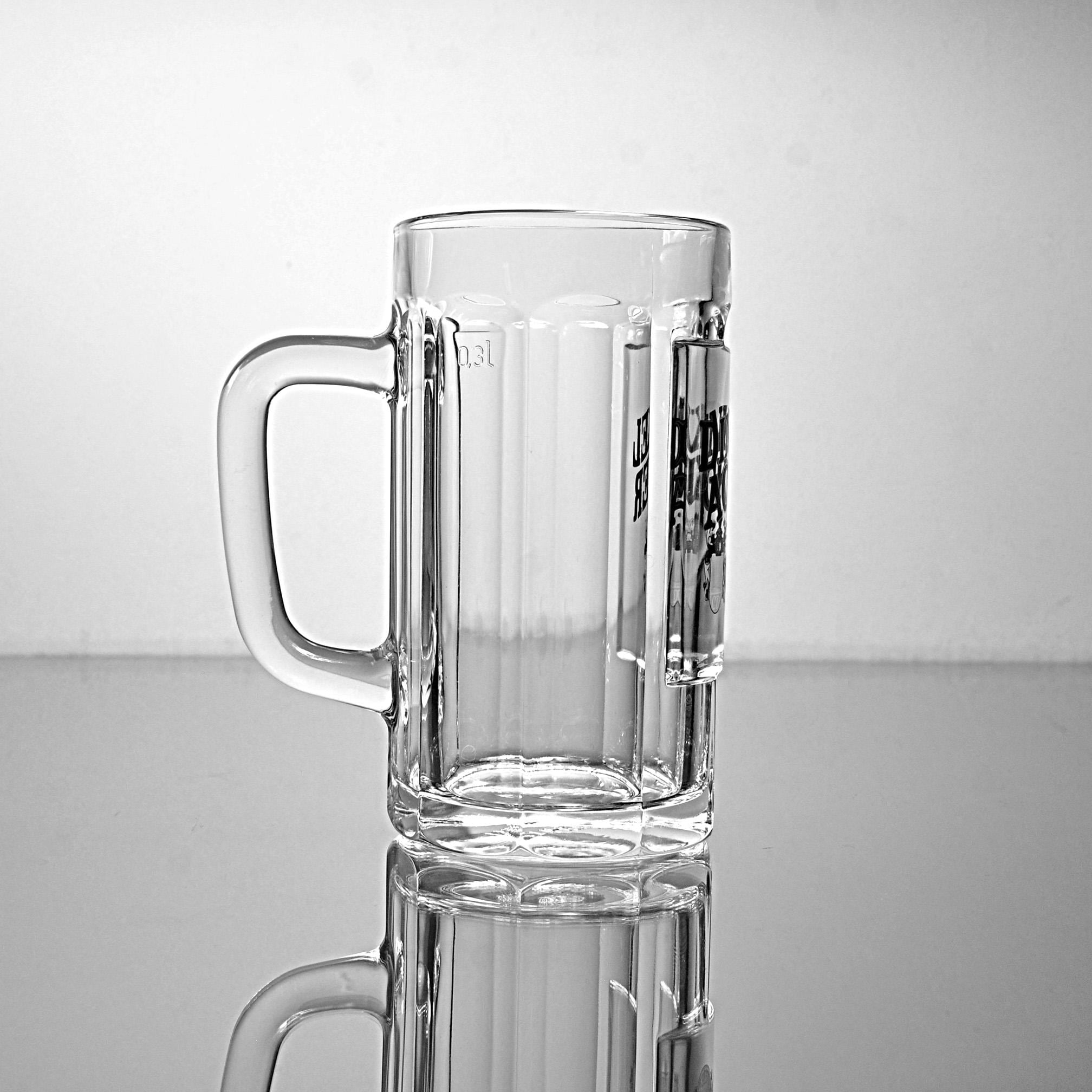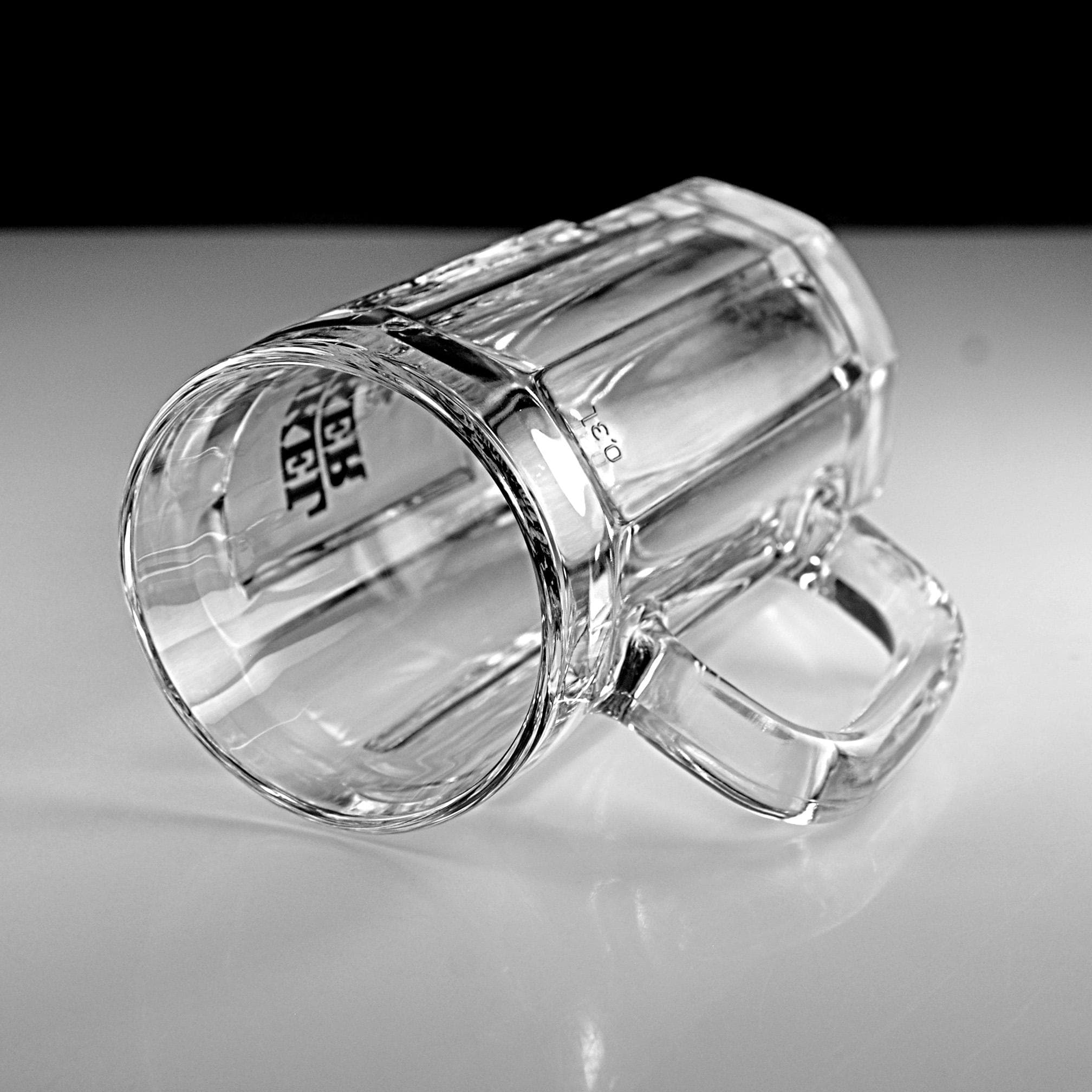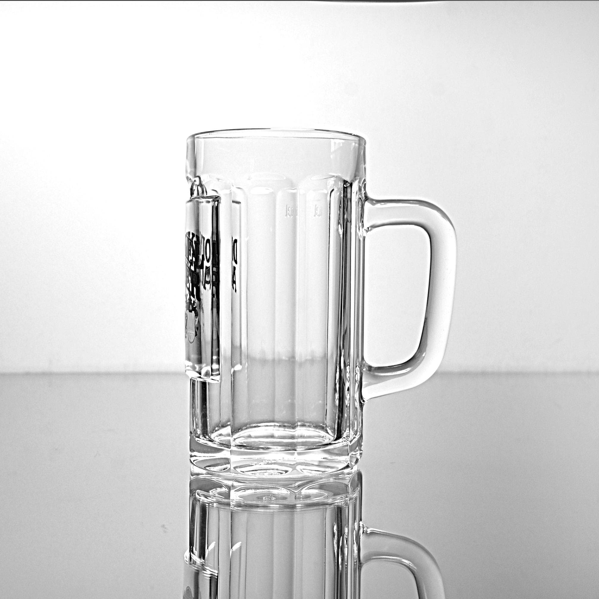 The mug was produced by SAHM, a respected German glassmaker that has supplied breweries and pubs with branded glassware for more than a century. Pieces like this were commonly used in bars or distributed as brewery promotional glassware. The glass has a solid, heavy feel with a comfortable handle and the traditional 0.3 liter serving mark, which equals about 10 ounces. That size is typical for German beer service and makes it a great everyday mug.