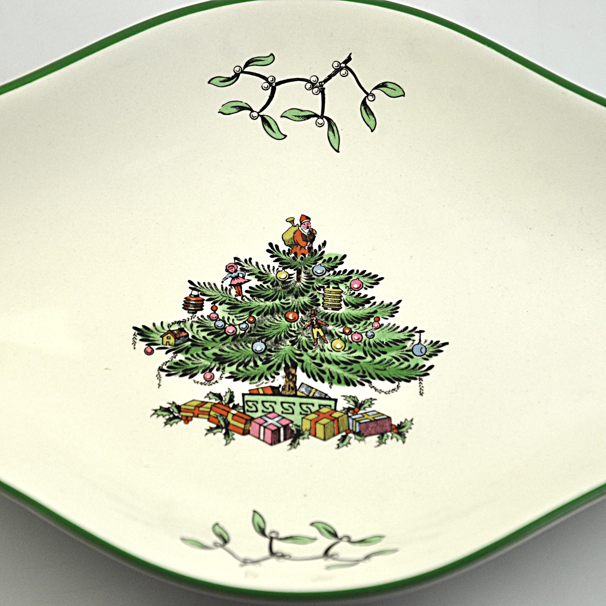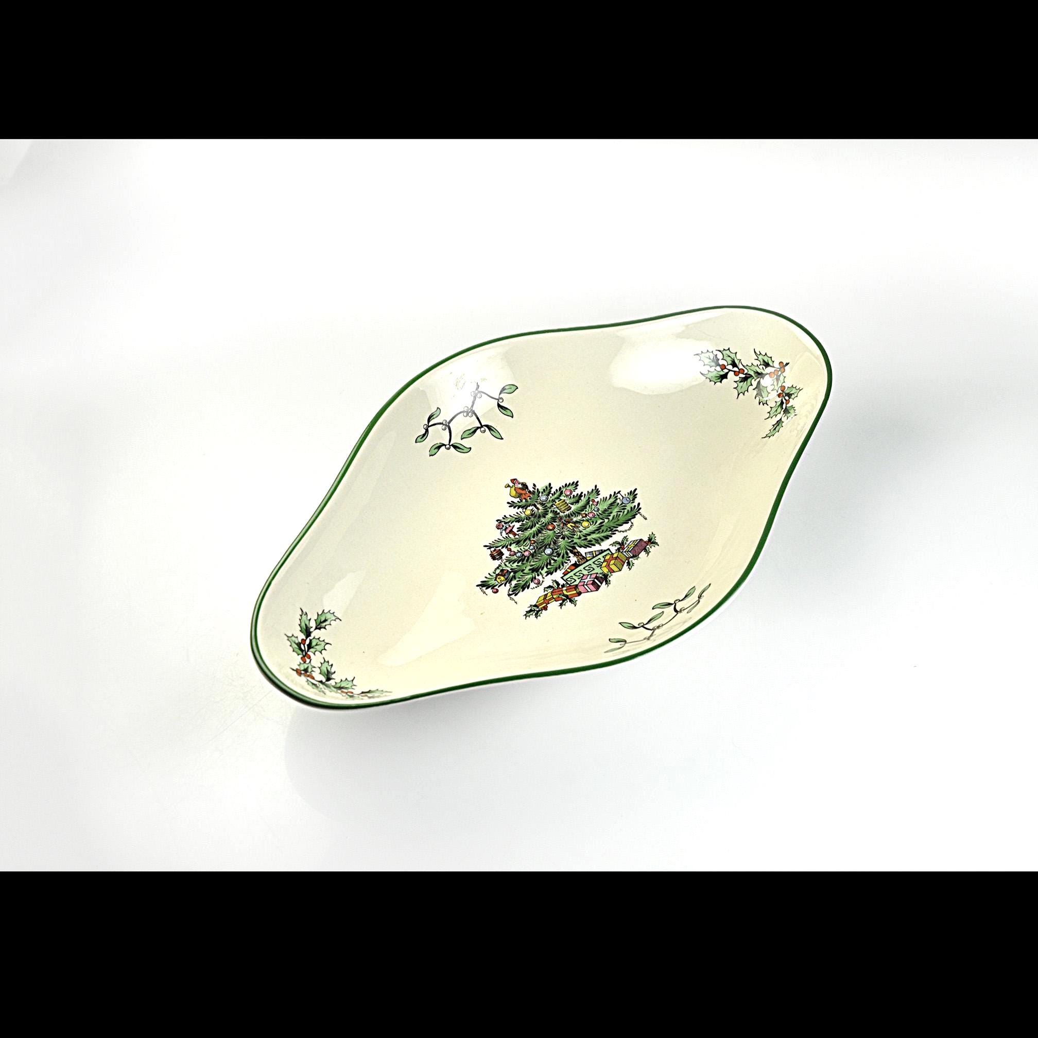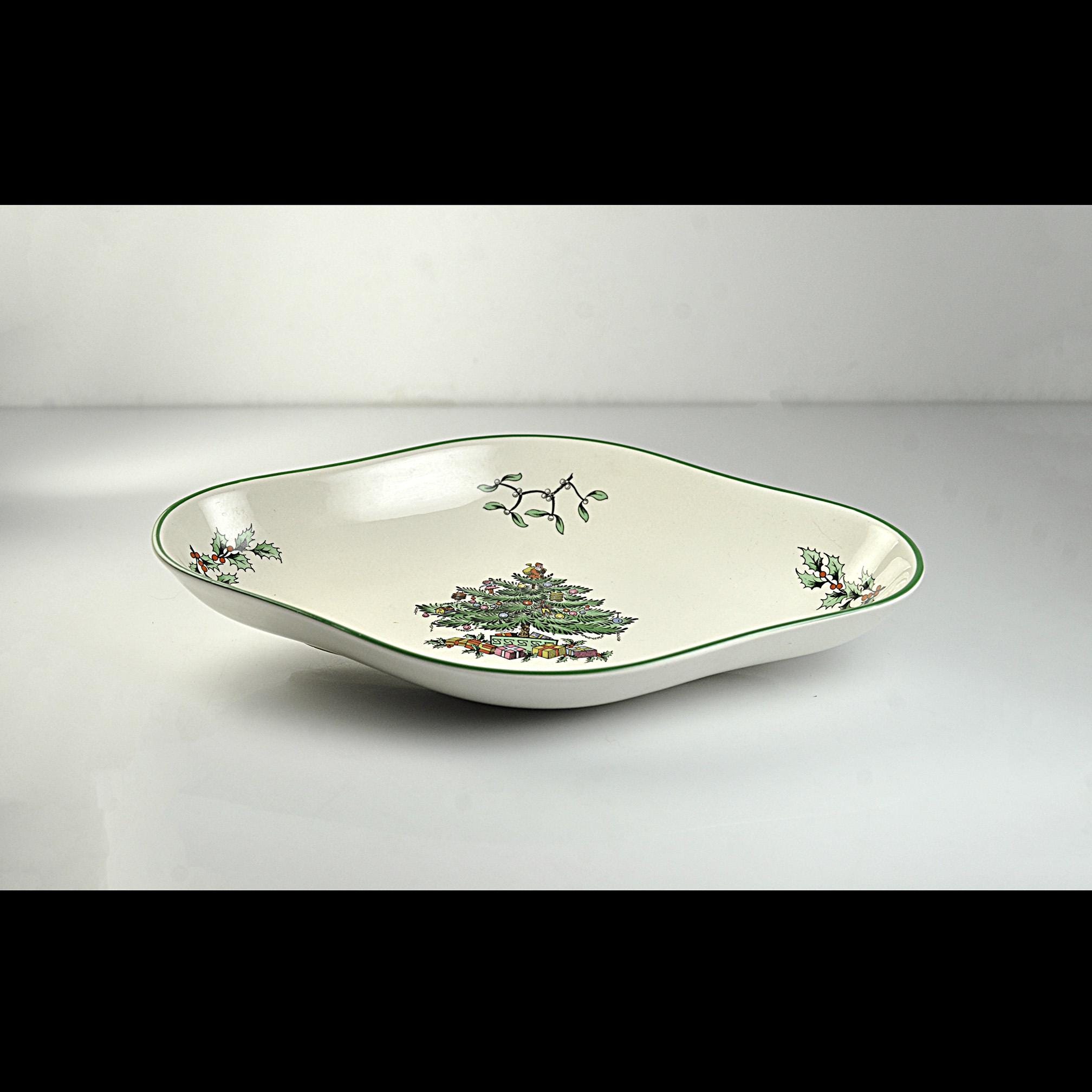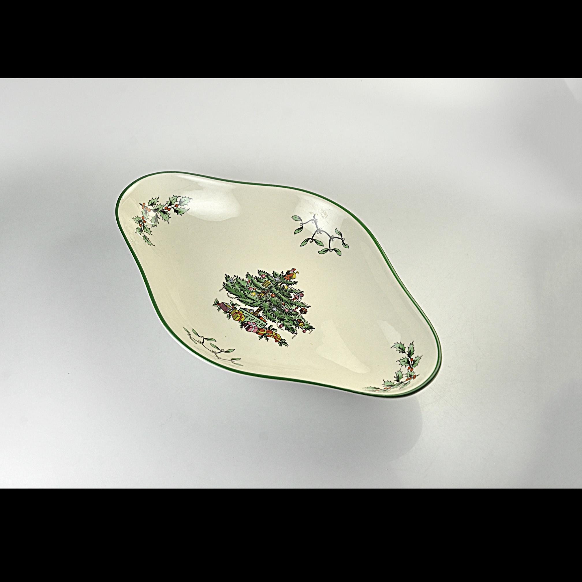 Some holiday dishes just bring Christmas memories with them, and the Spode Christmas Tree pattern is one of those. This lovely diamond shaped serving bowl by Spode of England features the classic Christmas tree decorated with ornaments and surrounded by wrapped gifts. Small holly sprigs decorate the sides; all finished with a traditional green rim. The Christmas Tree pattern was first introduced by Spode in 1938 and quickly became a favorite holiday dinnerware pattern. Many families still bring these pieces out every December as part of their Christmas table traditions. This smaller serving dish is a nice versatile size. It works well for holiday candies, nuts, relishes, or small treats and also makes a beautiful display piece during the Christmas season. The backstamp shows Spode England S3324 Christmas Tree, placing the production of this piece in the late twentieth century when many of these classic holiday pieces were still made in England. Whether you are adding to an existing Spode Christmas Tree collection or starting one of your own, this charming dish is ready to be part of the celebration.