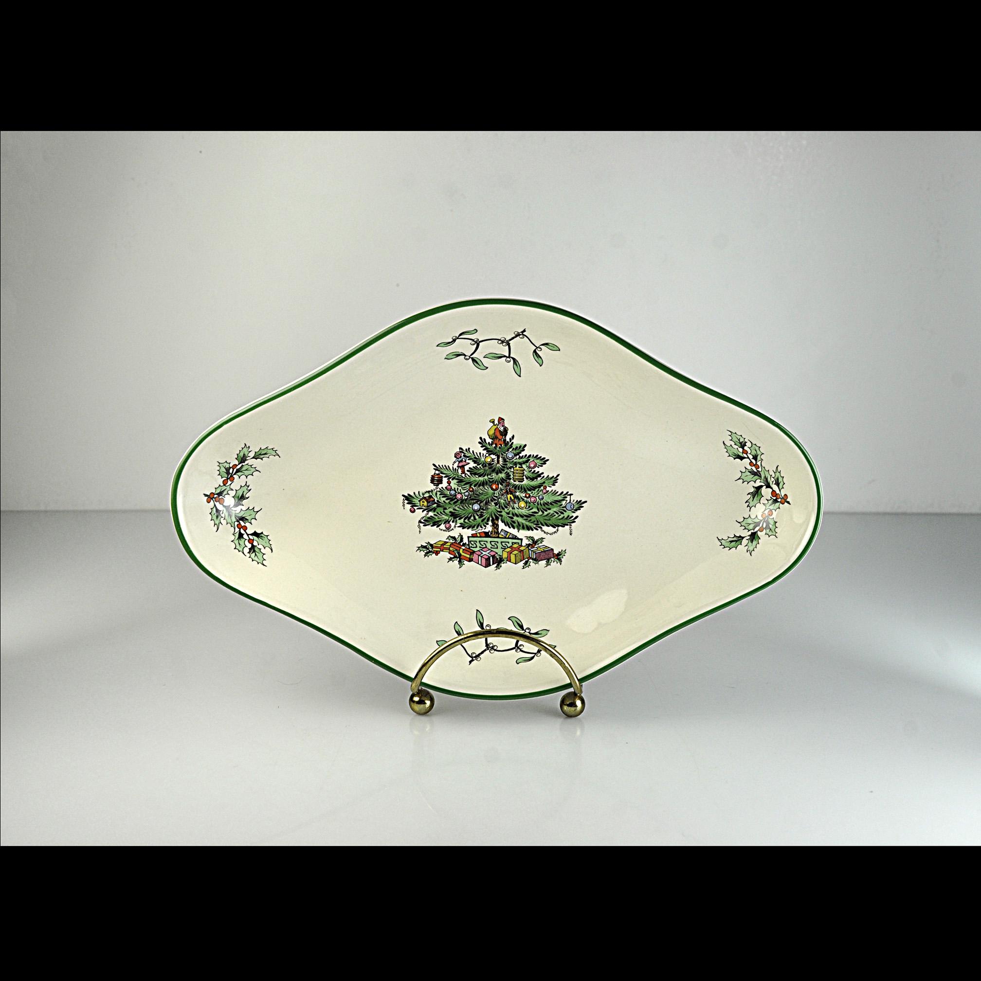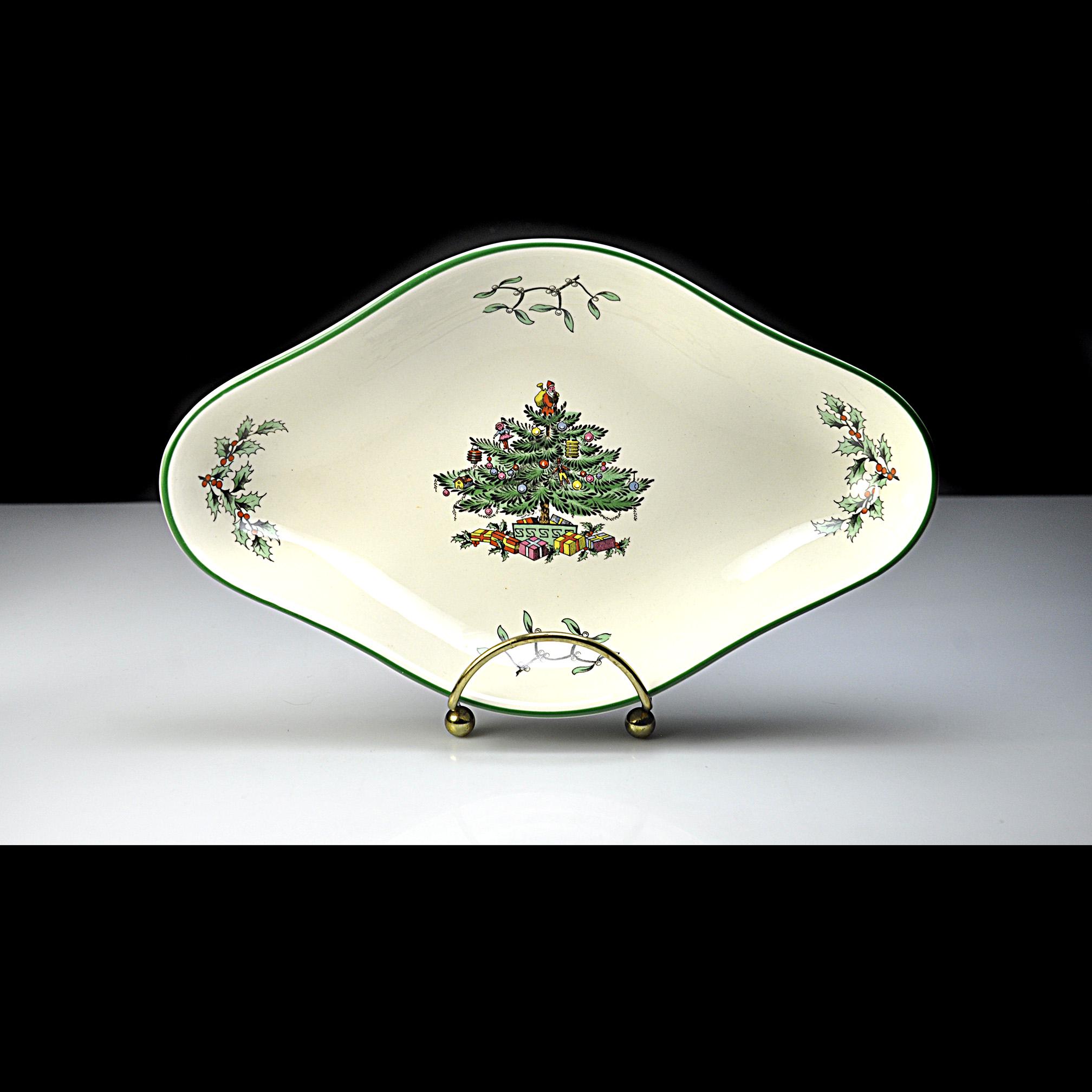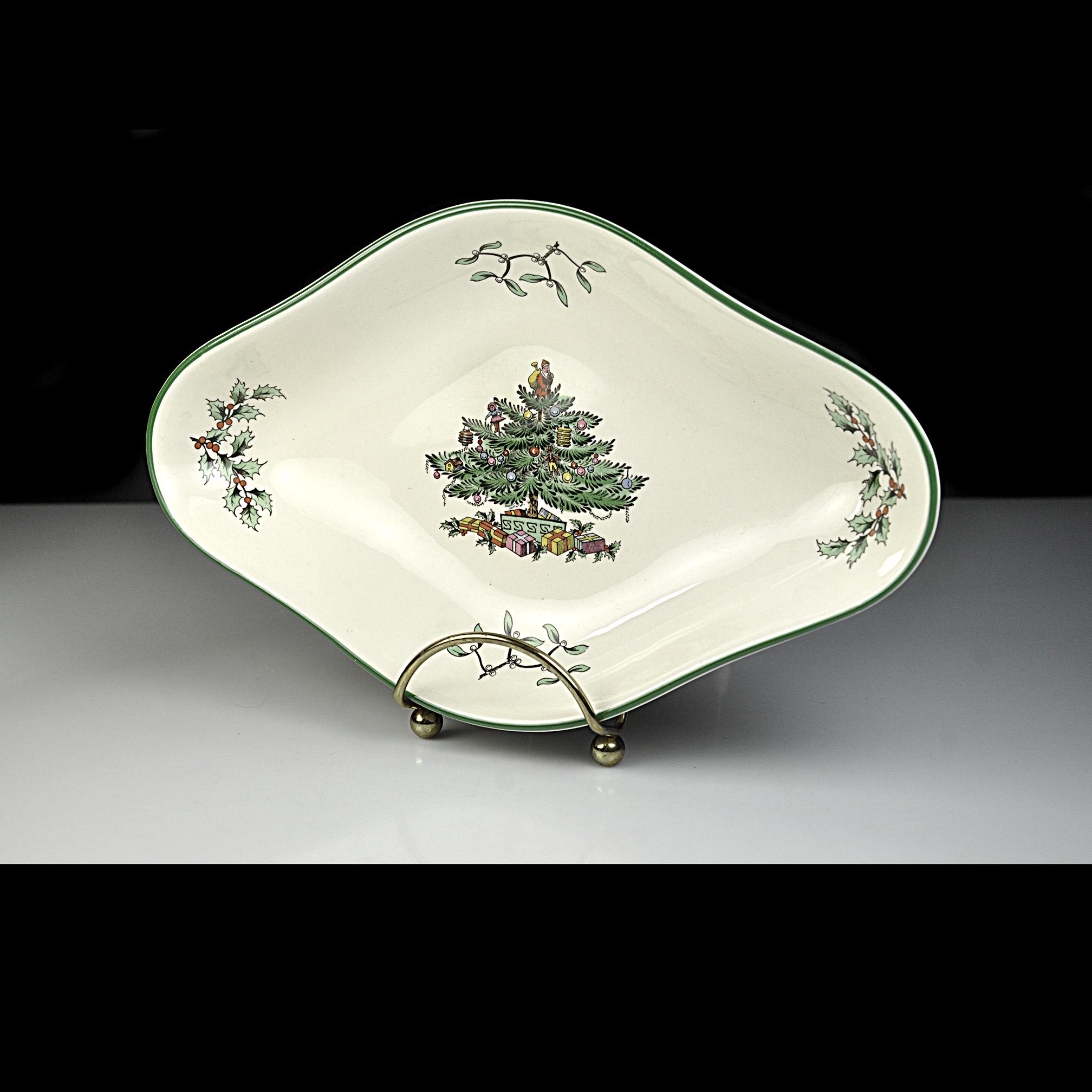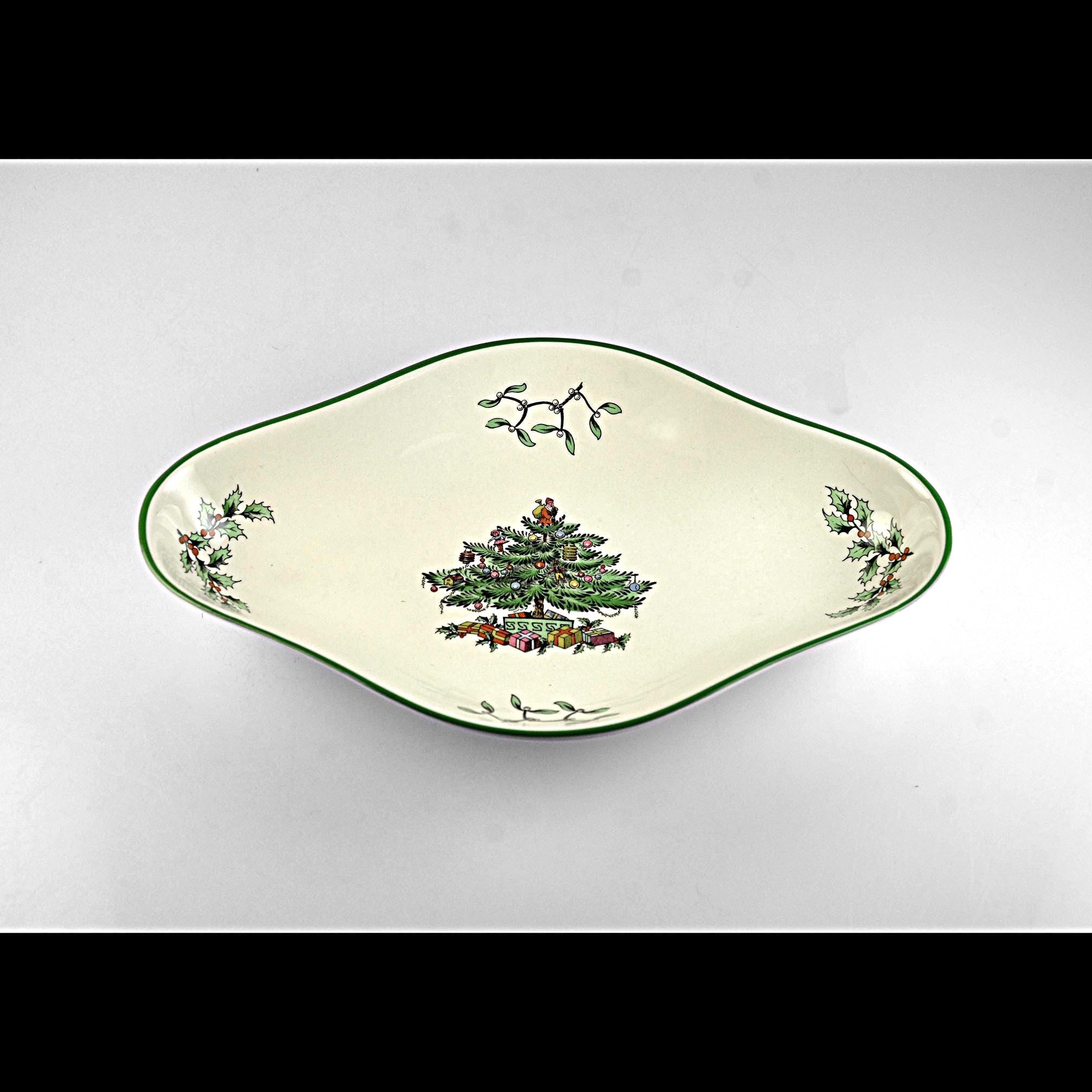 Some holiday dishes just bring Christmas memories with them, and the Spode Christmas Tree pattern is one of those. This lovely diamond shaped serving bowl by Spode of England features the classic Christmas tree decorated with ornaments and surrounded by wrapped gifts. Small holly sprigs decorate the sides; all finished with a traditional green rim. The Christmas Tree pattern was first introduced by Spode in 1938 and quickly became a favorite holiday dinnerware pattern. Many families still bring these pieces out every December as part of their Christmas table traditions. This smaller serving dish is a nice versatile size. It works well for holiday candies, nuts, relishes, or small treats and also makes a beautiful display piece during the Christmas season. The backstamp shows Spode England S3324 Christmas Tree, placing the production of this piece in the late twentieth century when many of these classic holiday pieces were still made in England. Whether you are adding to an existing Spode Christmas Tree collection or starting one of your own, this charming dish is ready to be part of the celebration.