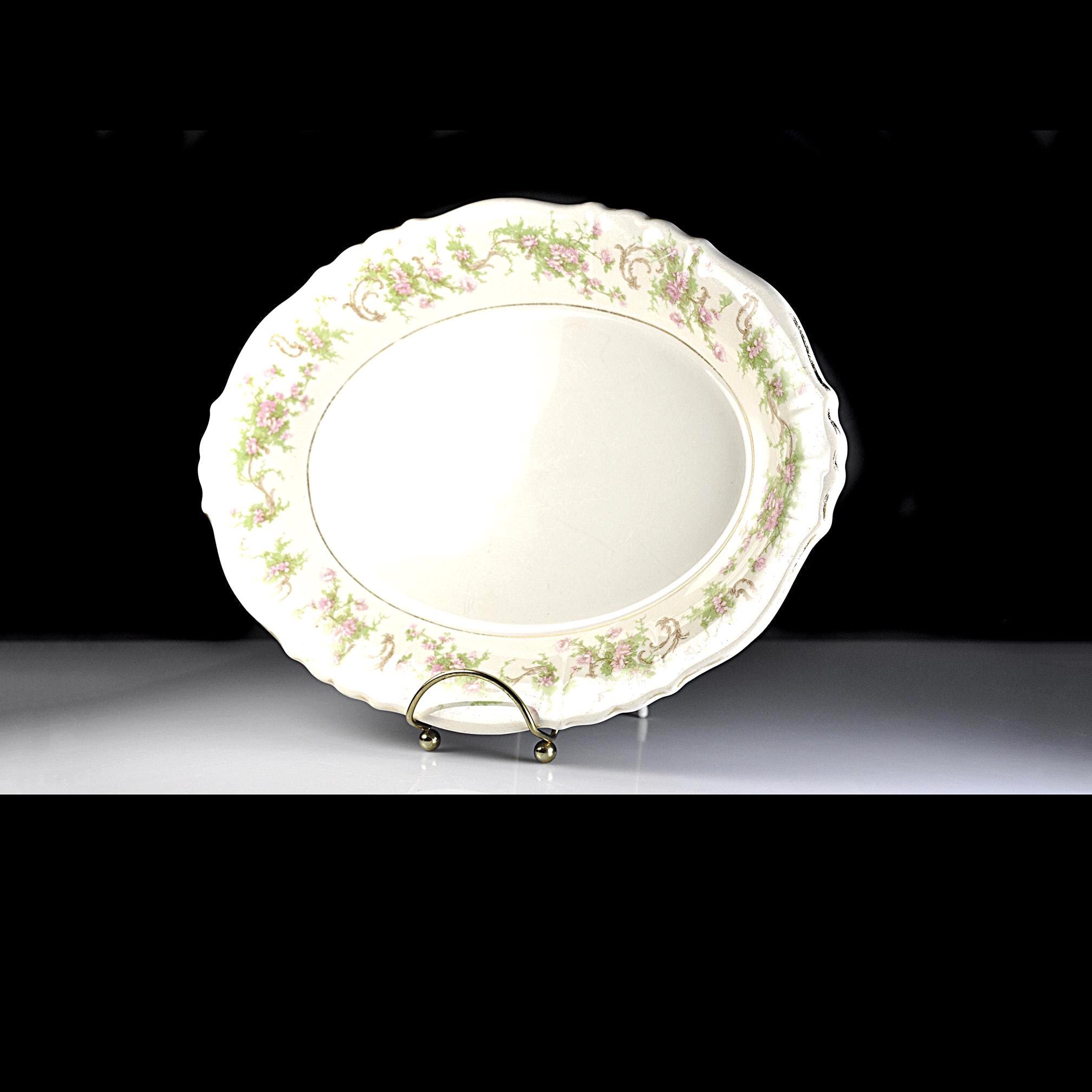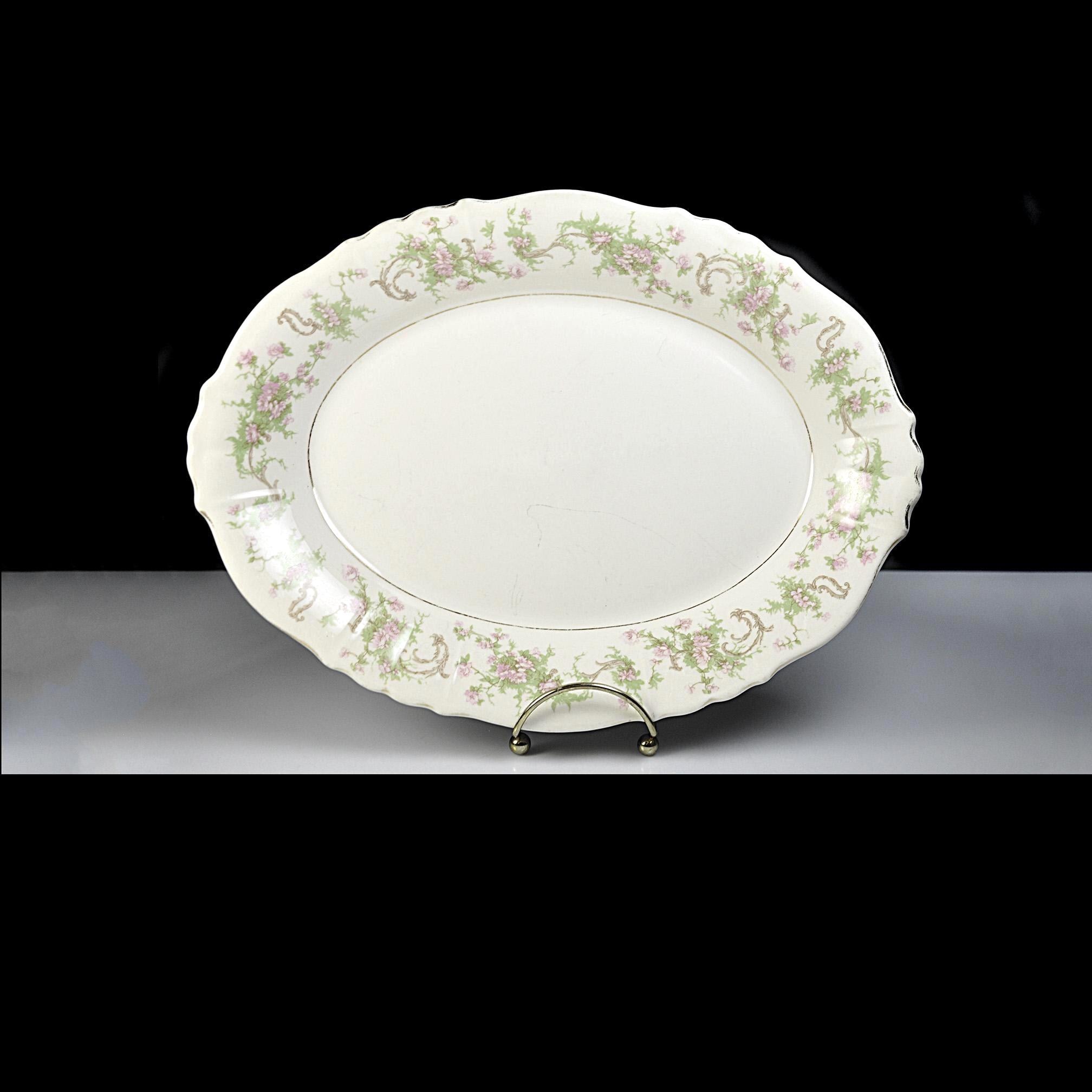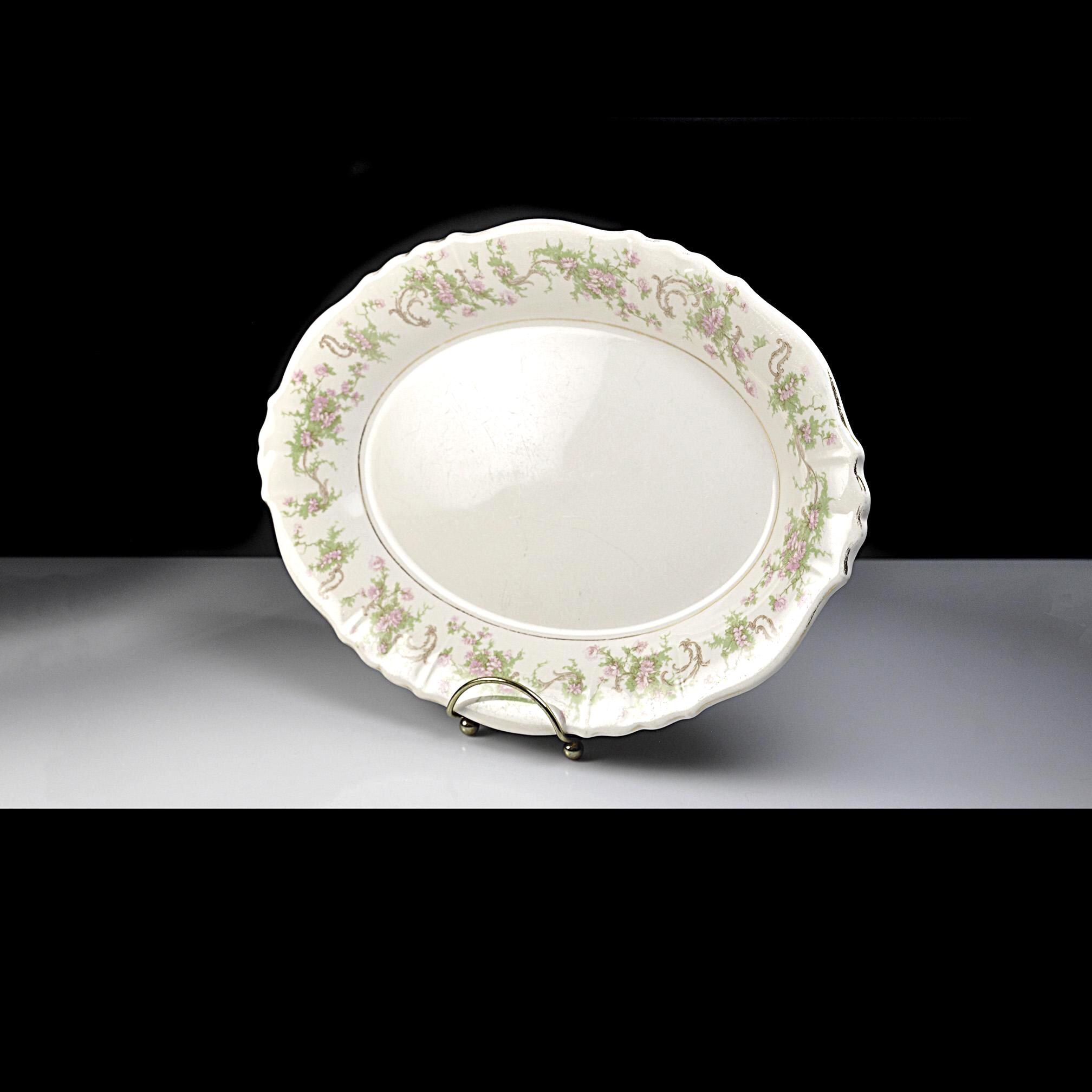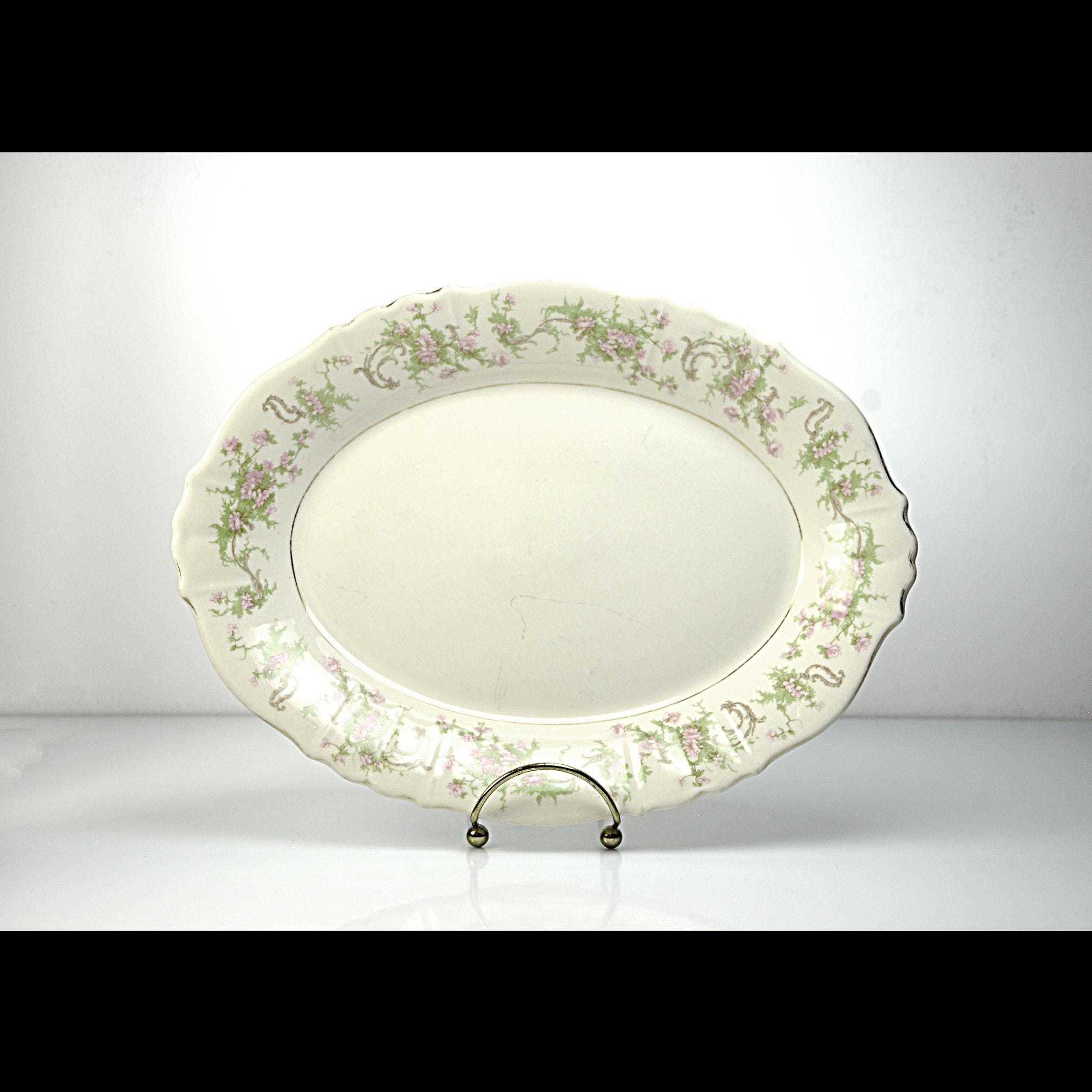 This is a vintage Syracuse China platter in the Dearborn pattern. The soft cream china platter is decorated with a delicate border of pink flowers and green vines, finished with what was once a bright gold trim. Made by Syracuse China in New York, this platter dates to around the late 1930s to early 1950s, a time when American china companies were producing durable pieces meant to be used every day. And this one certainly was. The gold trim along the edge shows heavy wear, and the center has utensil marks from years of serving meals. Even so, the platter still has a nice shine and the floral pattern remains beautiful around the border. It’s the kind of piece that carries a little history with it — the kind of platter that likely held roast chicken, potatoes, or Sunday ham more times than anyone could count. Today it would make a lovely addition to a vintage table setting, farmhouse kitchen, or simply as a display piece with a story behind it.