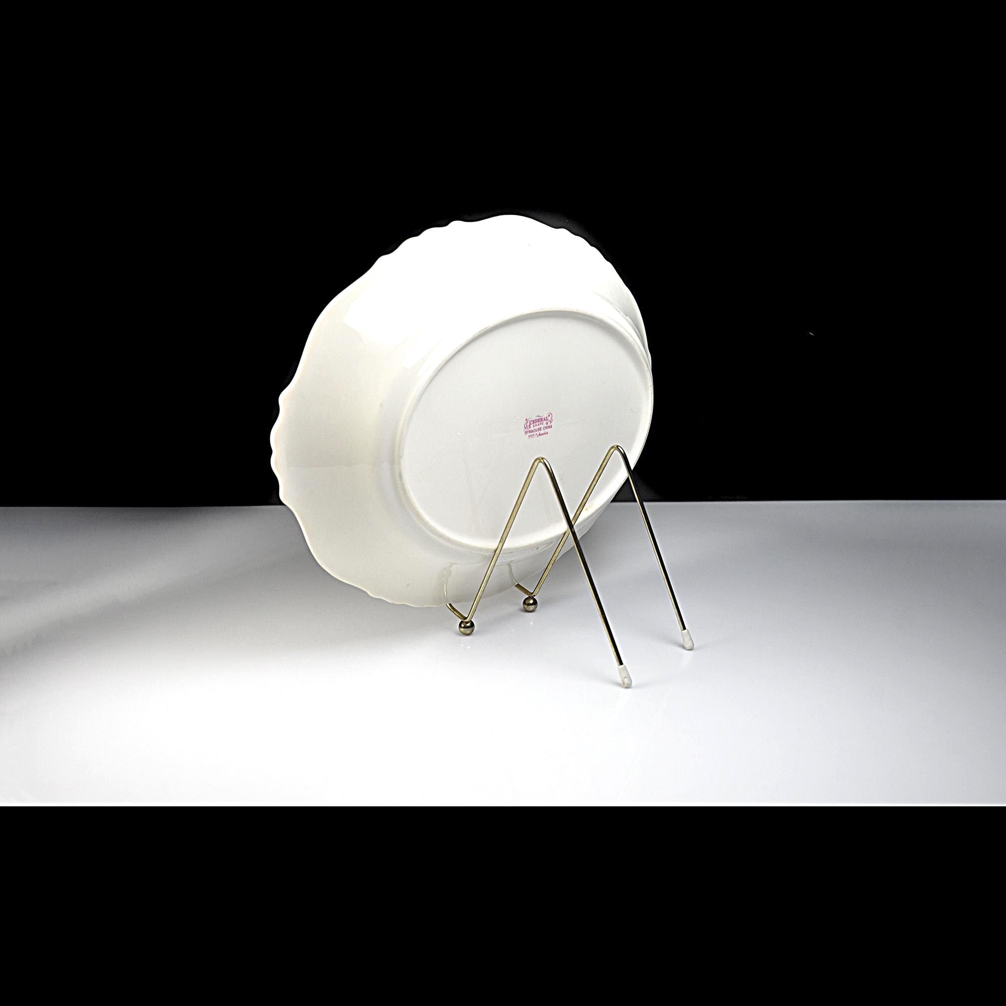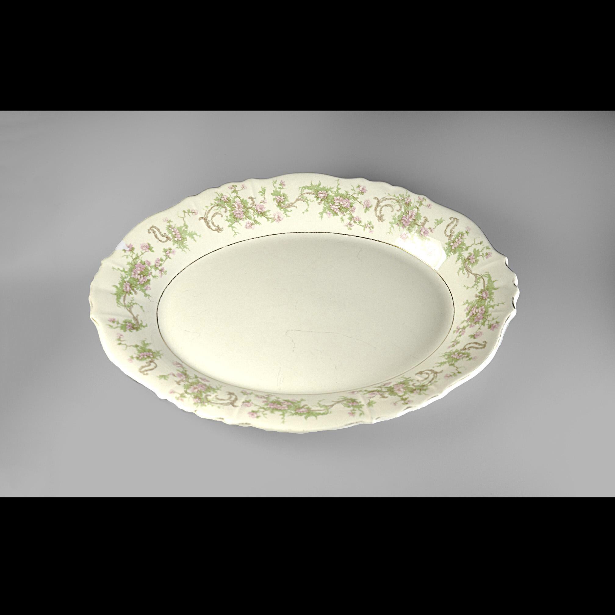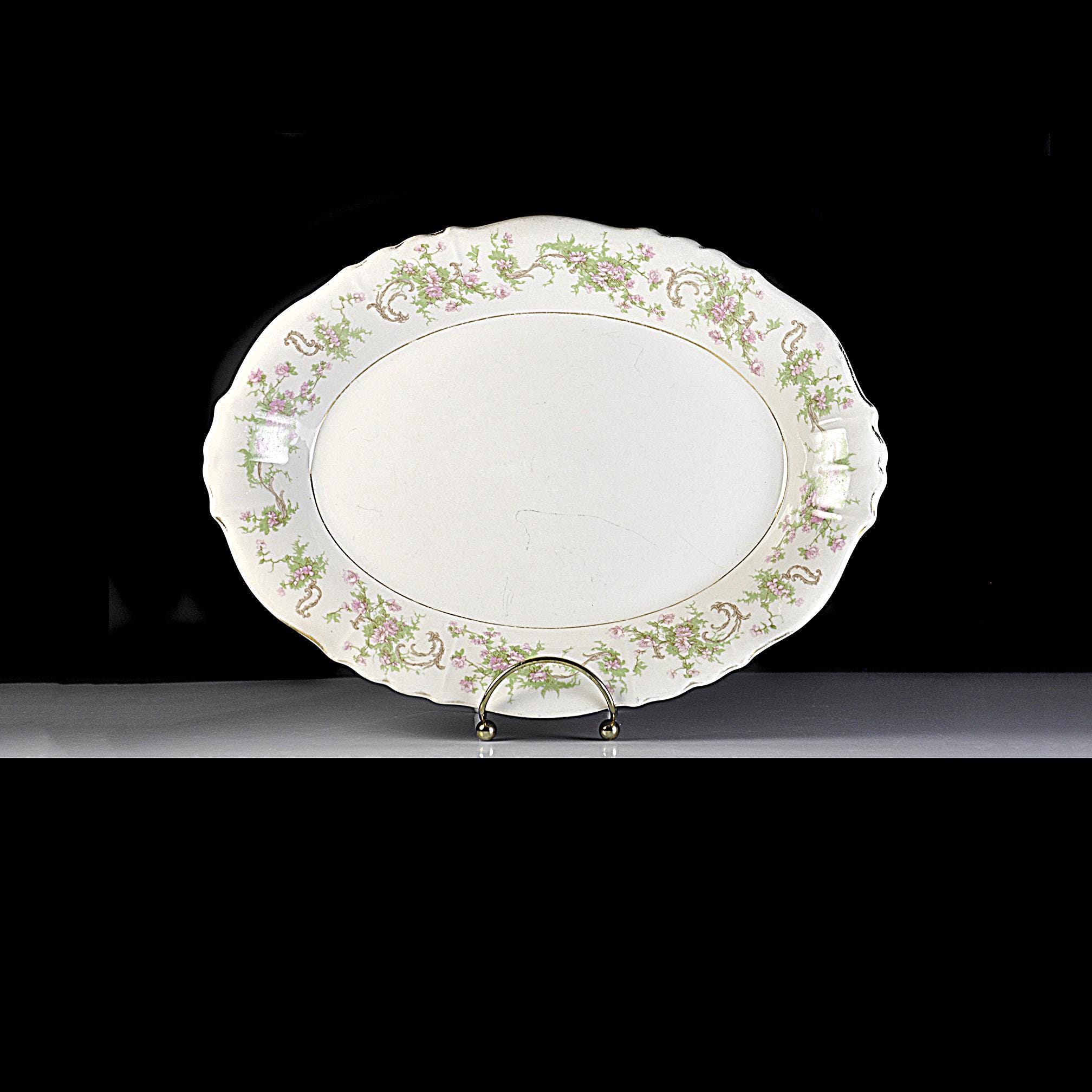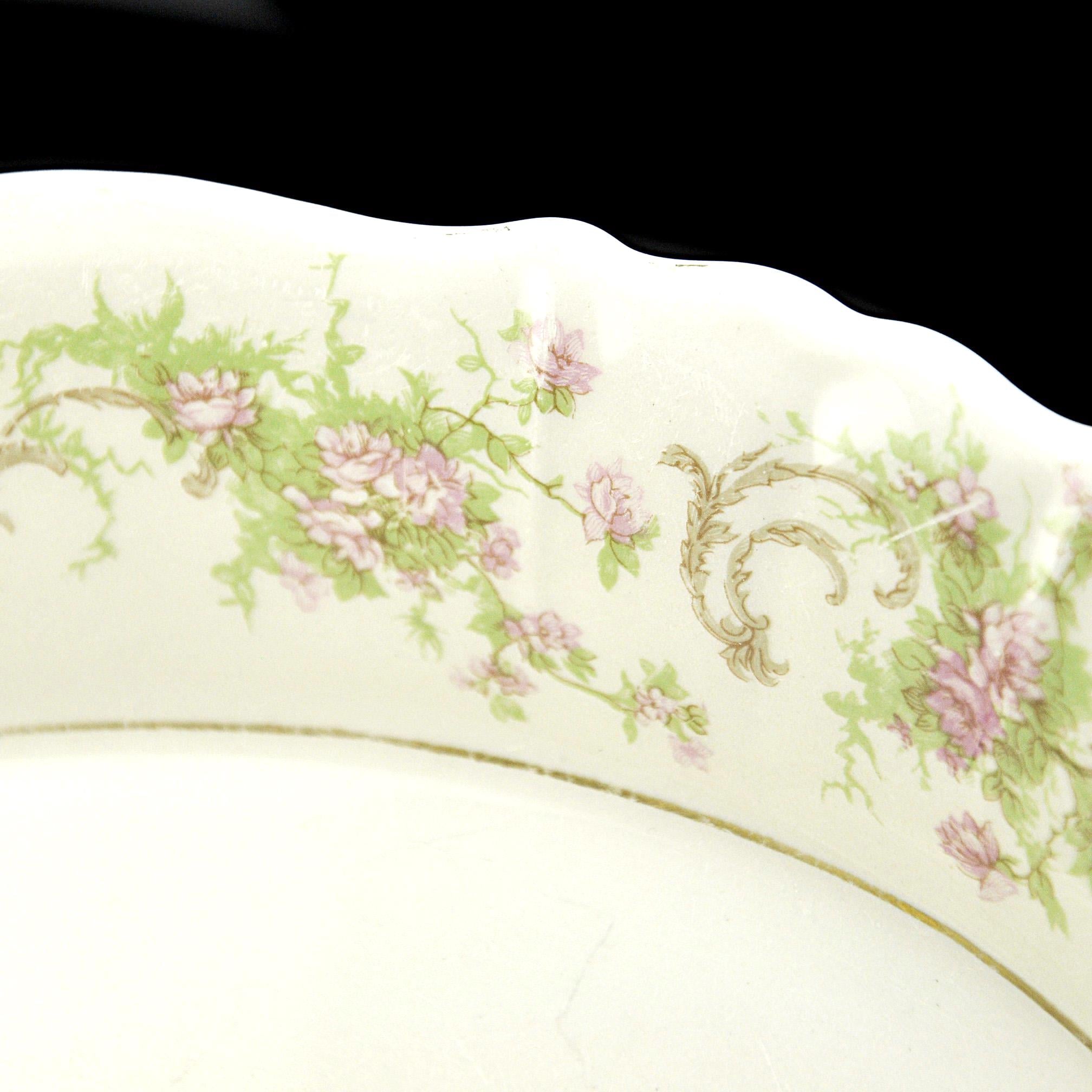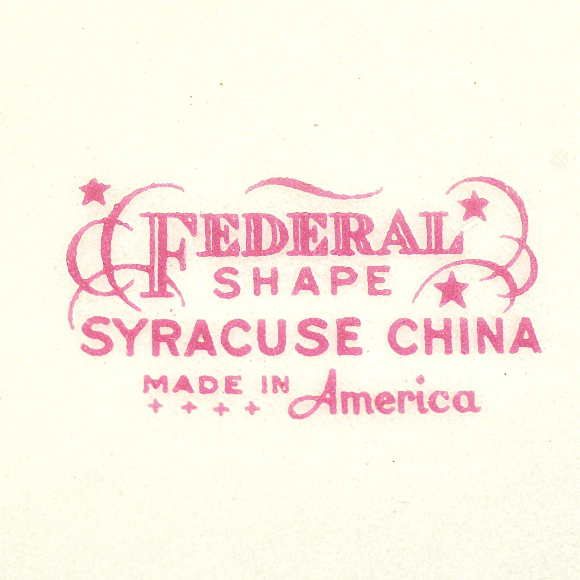 This is a vintage Syracuse China platter in the Dearborn pattern. The soft cream china platter is decorated with a delicate border of pink flowers and green vines, finished with what was once a bright gold trim. Made by Syracuse China in New York, this platter dates to around the late 1930s to early 1950s, a time when American china companies were producing durable pieces meant to be used every day. And this one certainly was. The gold trim along the edge shows heavy wear, and the center has utensil marks from years of serving meals. Even so, the platter still has a nice shine and the floral pattern remains beautiful around the border. It’s the kind of piece that carries a little history with it — the kind of platter that likely held roast chicken, potatoes, or Sunday ham more times than anyone could count. Today it would make a lovely addition to a vintage table setting, farmhouse kitchen, or simply as a display piece with a story behind it.