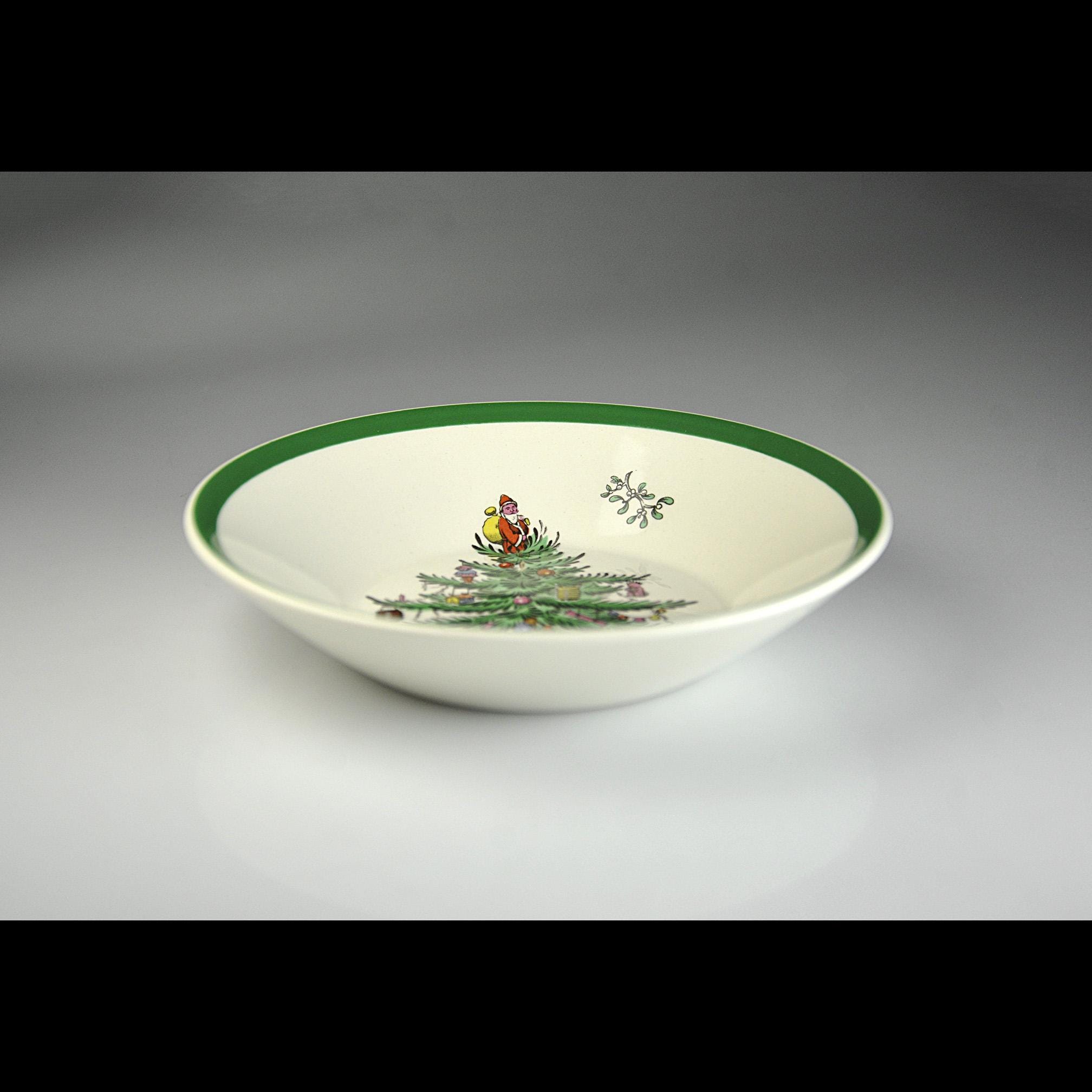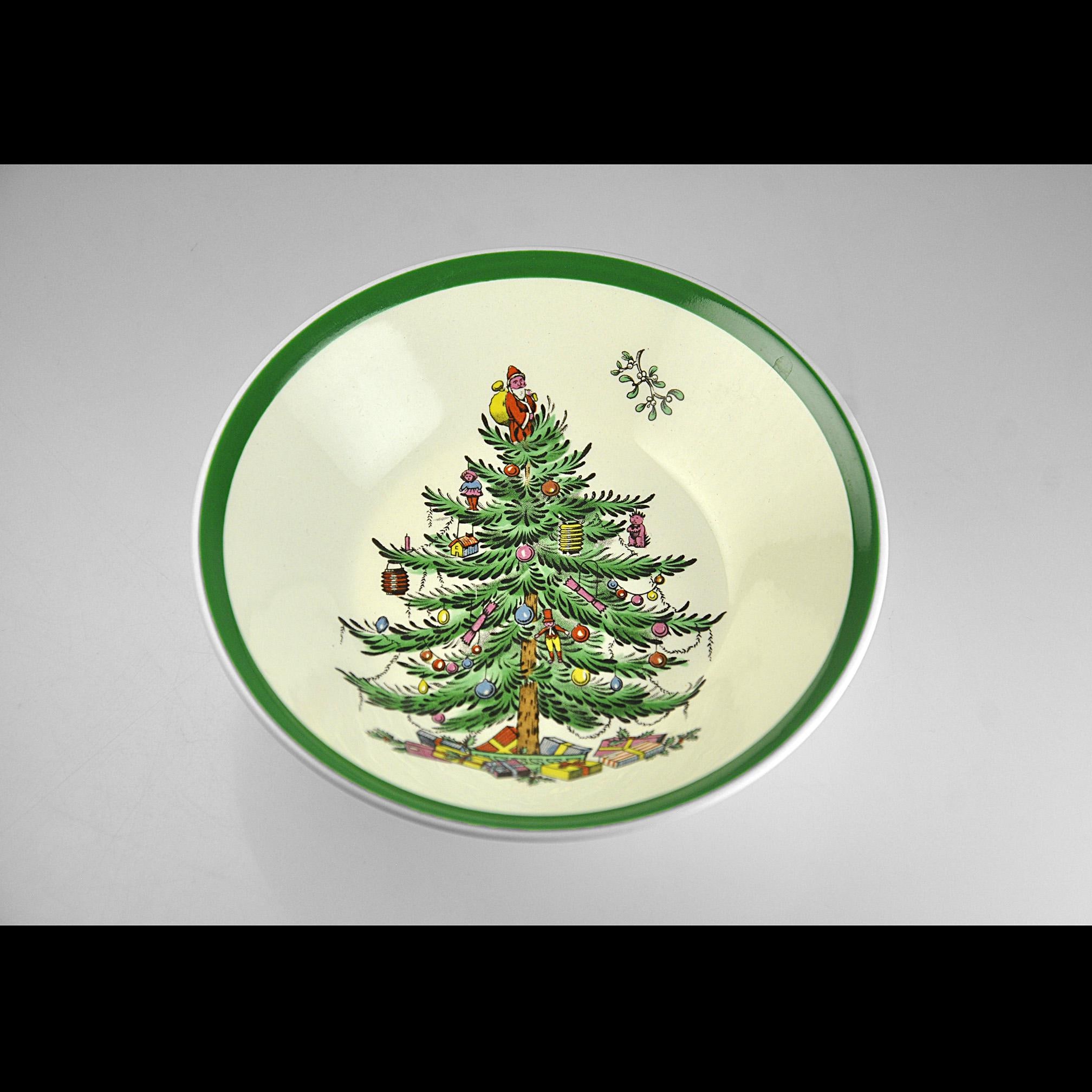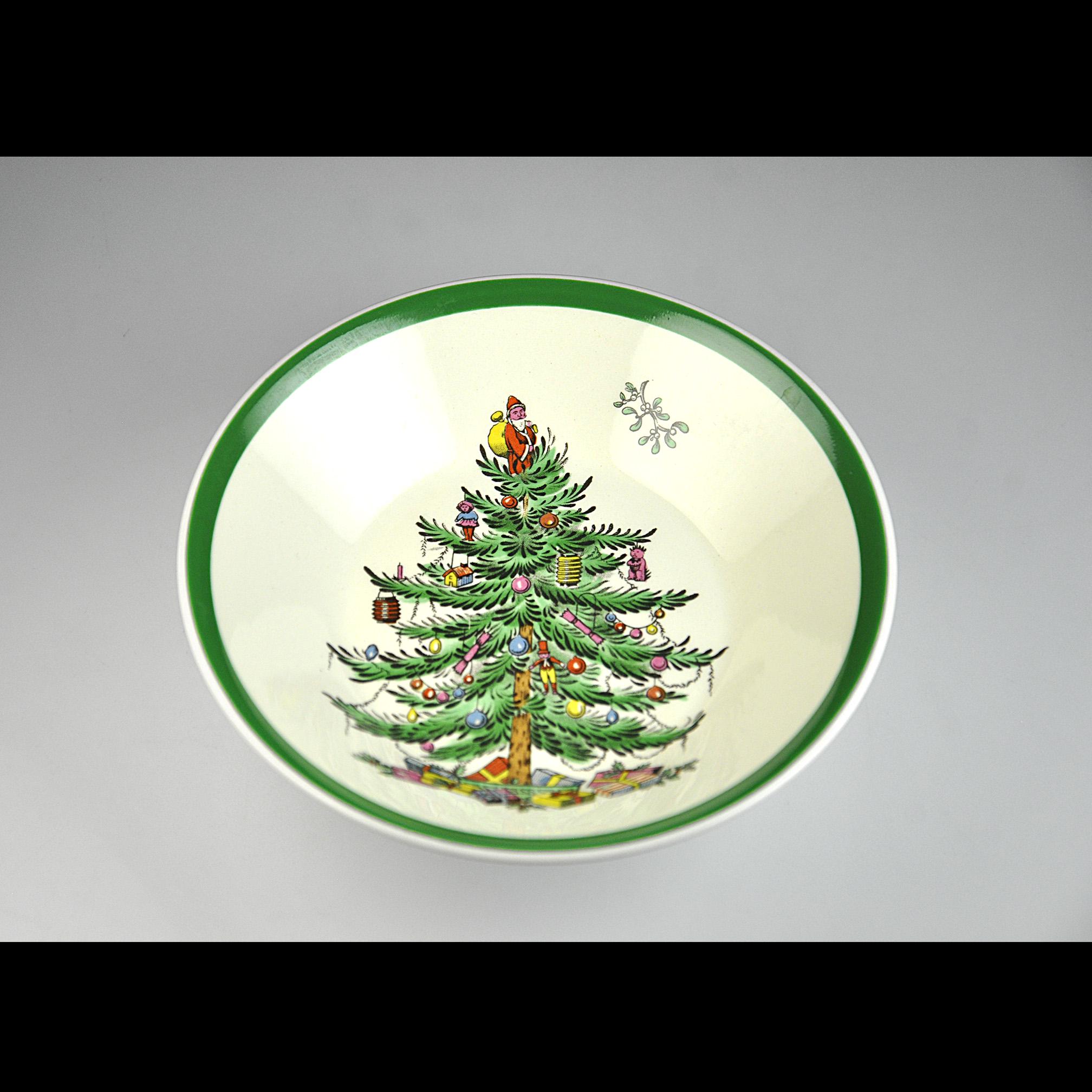 This is a small bowl in Spode’s well-known Christmas Tree pattern. If you grew up with holiday china, chances are you have seen this pattern before. It has been around since the late 1930s and it still shows up on a lot of family tables every December. The center of the bowl shows the decorated Christmas tree with little ornaments, toys, and Santa standing at the top. Around the edge is the classic green rim that Spode used on this pattern for years. This bowl measures 5¼ inches in diameter making them perfect for serving a variety of foods. A nice piece to add to a holiday table or to replace a missing bowl from a Spode Christmas Tree set.