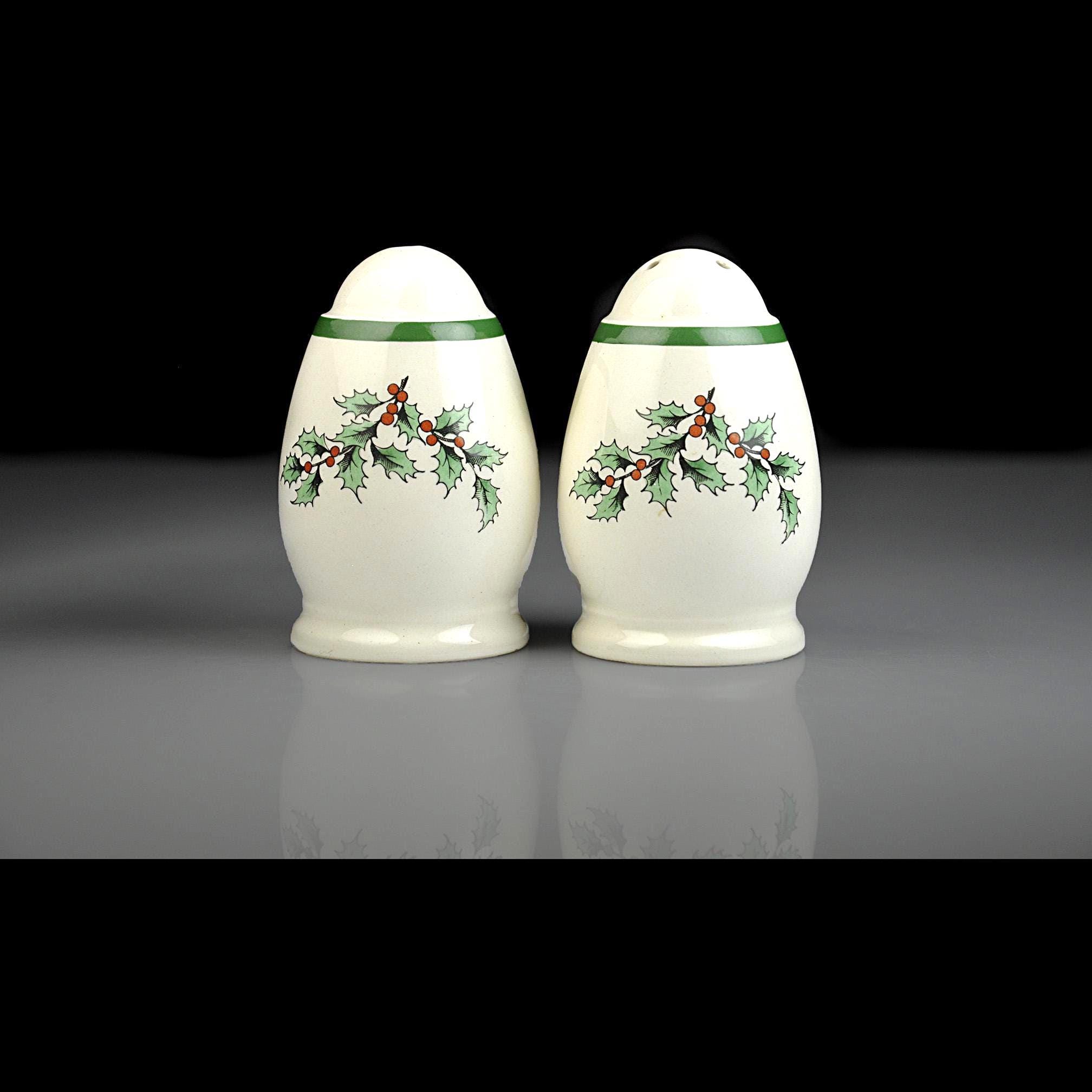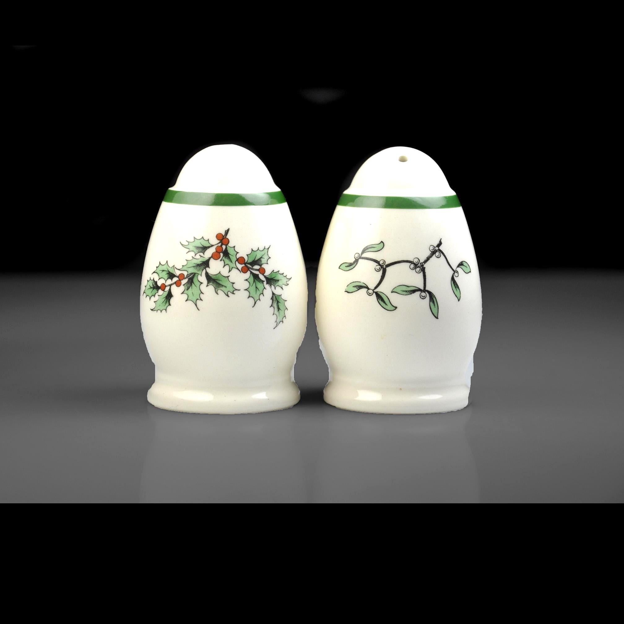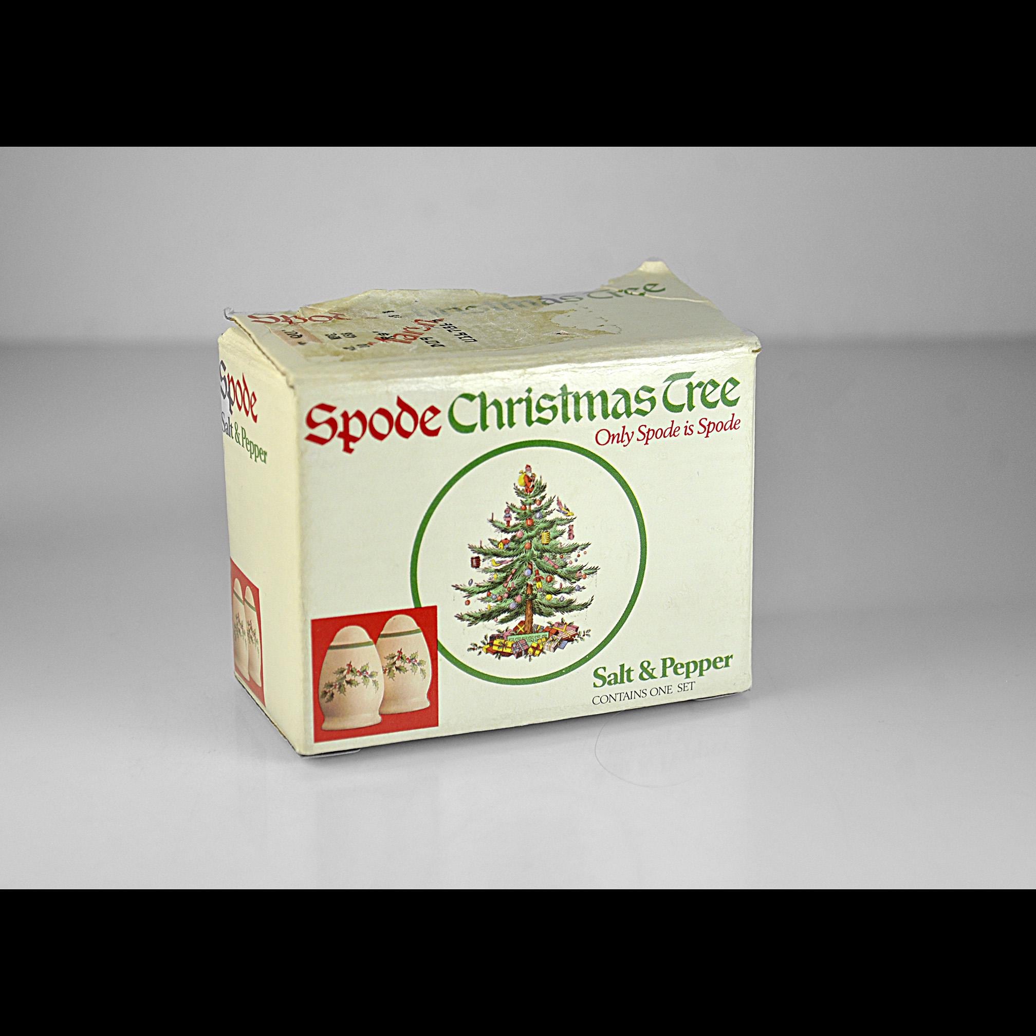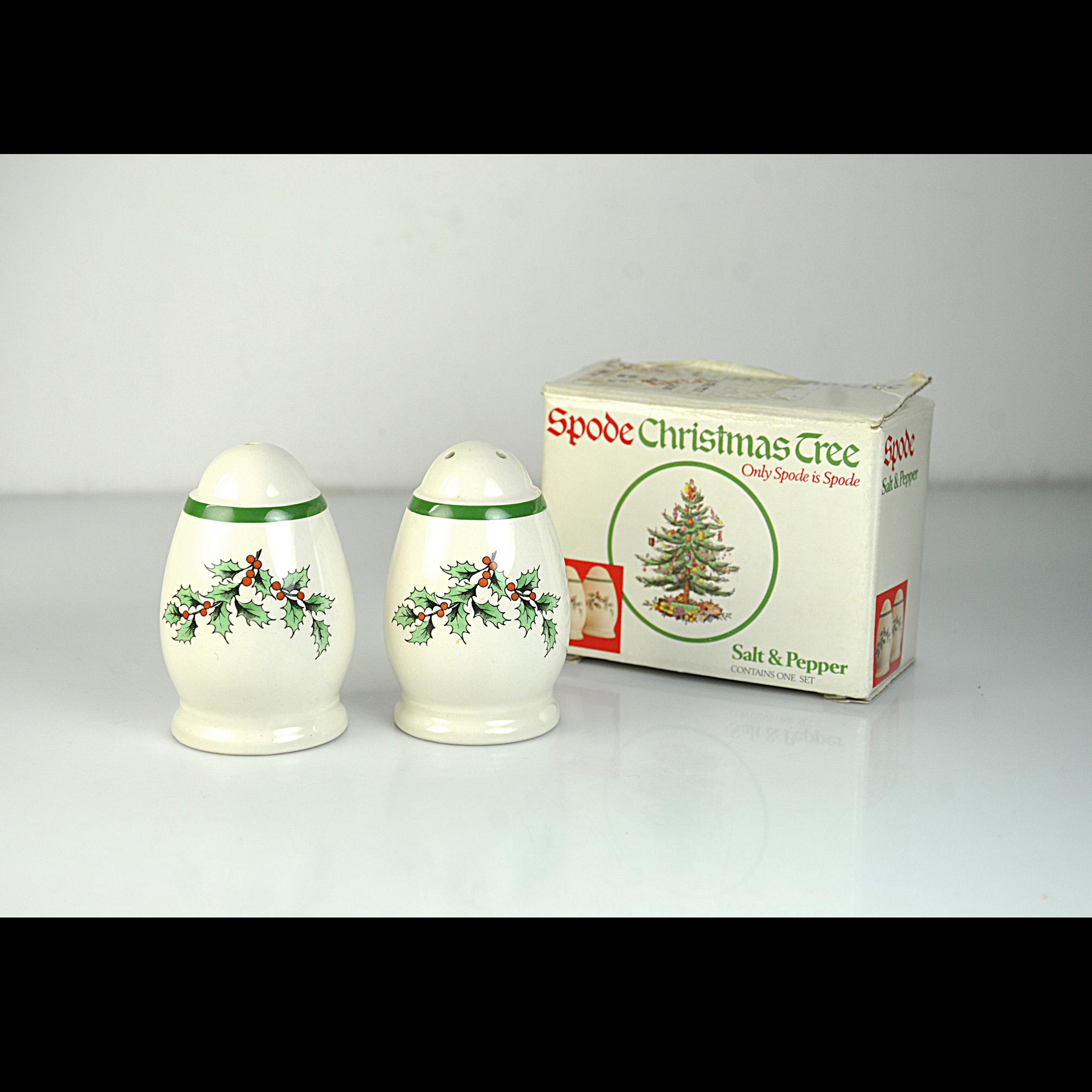 A beautiful set of Spode salt and pepper shakers in the well-known Christmas Tree holiday pattern. If you have ever seen Spode Christmas dishes on a holiday table, you probably recognize the look right away. These small shakers have the holly and berry design with the green band near the top that ties in with the rest of the Christmas Tree pattern pieces. They were made in England and still come with their original Spode box, which is always nice to have when these pieces have been around for a few decades. Spode introduced the Christmas Tree pattern back in 1938, and it quickly became one of the most recognizable holiday china patterns ever made. These shakers are a good size for the table and fit nicely with the rest of the Spode Christmas dinnerware. A nice addition to a holiday table or a great replacement set for someone collecting Spode Christmas Tree pieces.