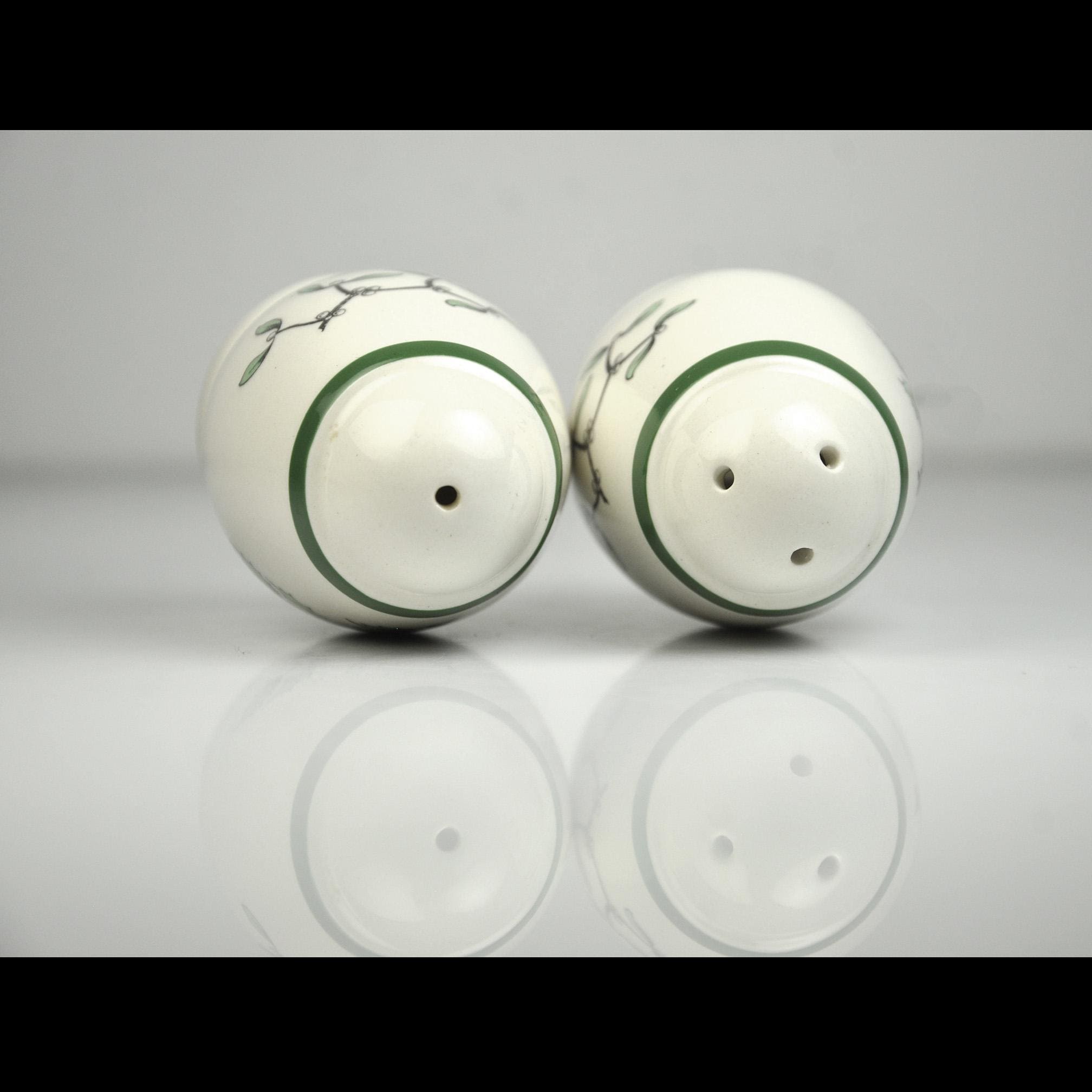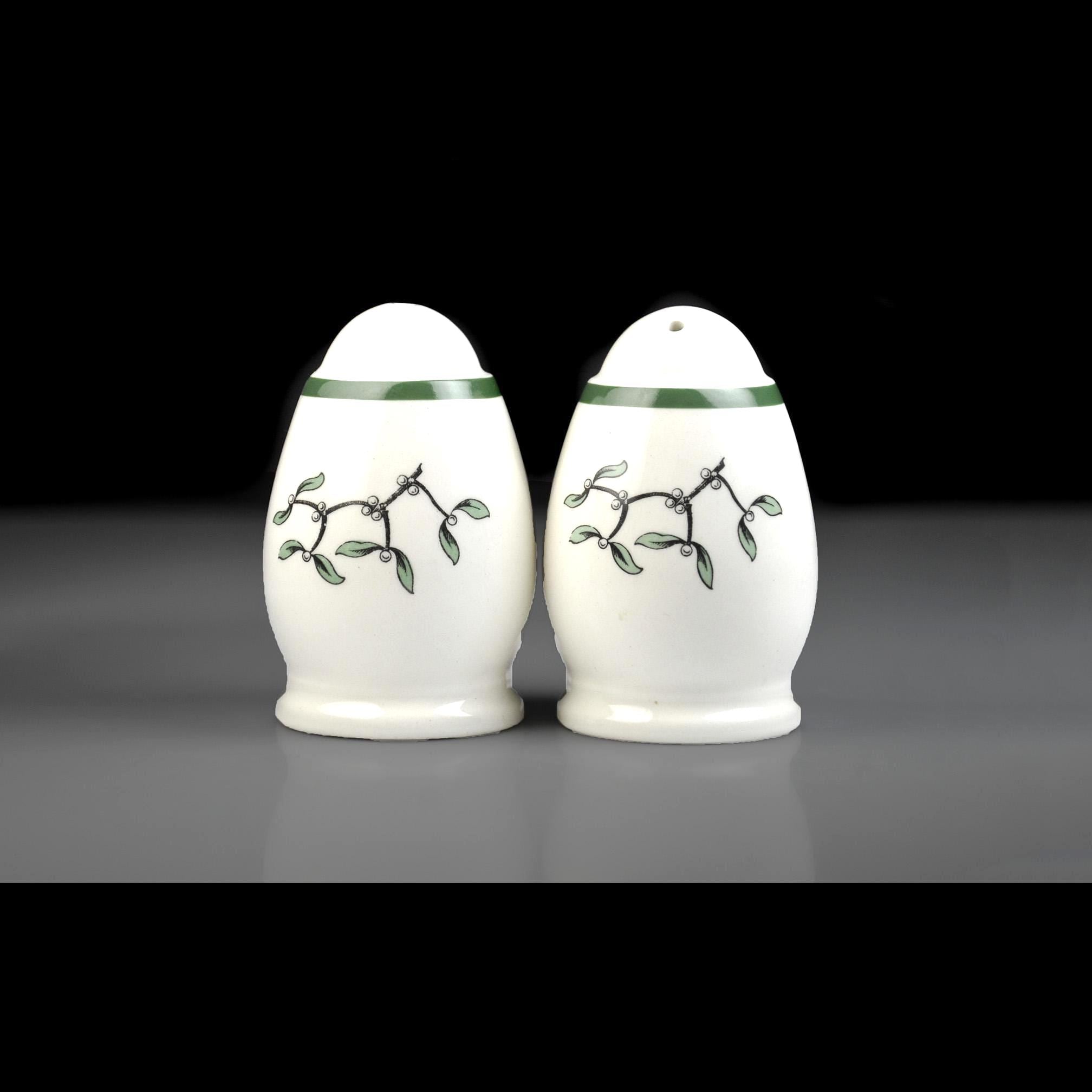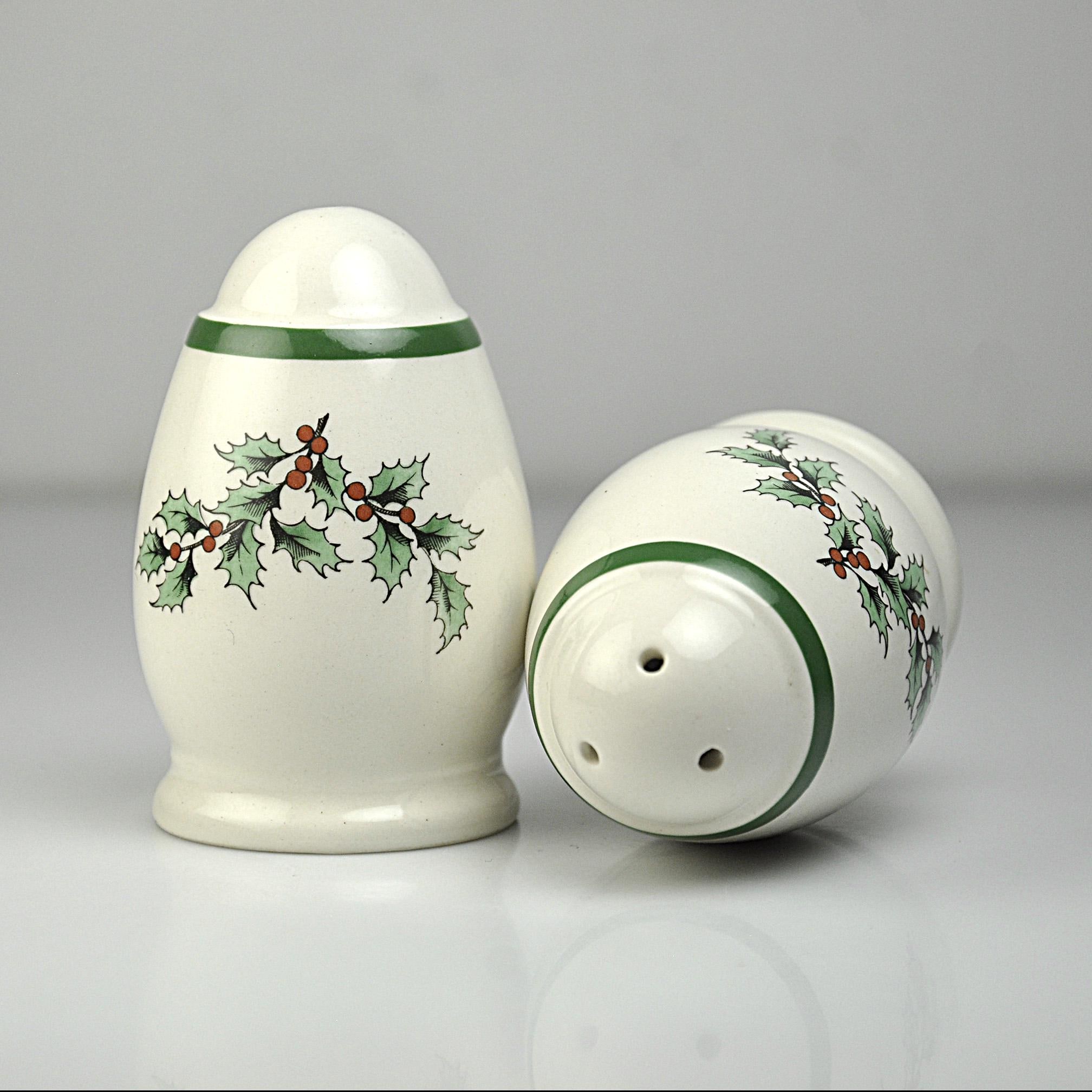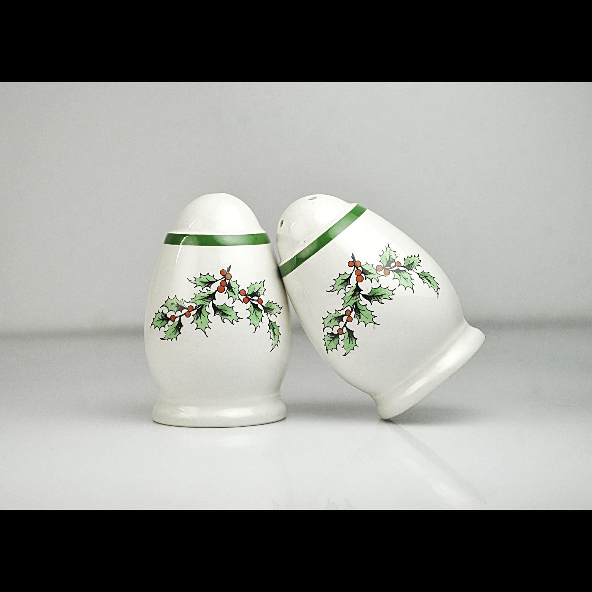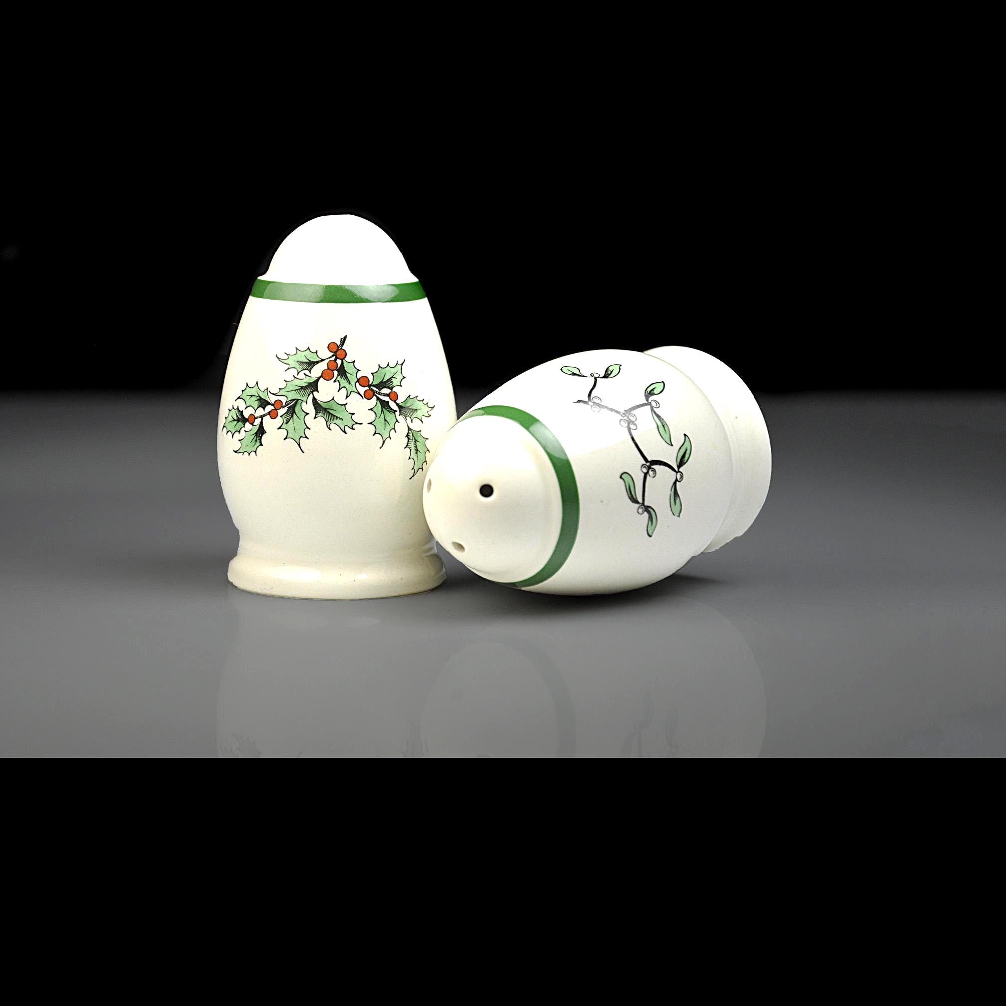 A beautiful set of Spode salt and pepper shakers in the well-known Christmas Tree holiday pattern. If you have ever seen Spode Christmas dishes on a holiday table, you probably recognize the look right away. These small shakers have the holly and berry design with the green band near the top that ties in with the rest of the Christmas Tree pattern pieces. They were made in England and still come with their original Spode box, which is always nice to have when these pieces have been around for a few decades. Spode introduced the Christmas Tree pattern back in 1938, and it quickly became one of the most recognizable holiday china patterns ever made. These shakers are a good size for the table and fit nicely with the rest of the Spode Christmas dinnerware. A nice addition to a holiday table or a great replacement set for someone collecting Spode Christmas Tree pieces.