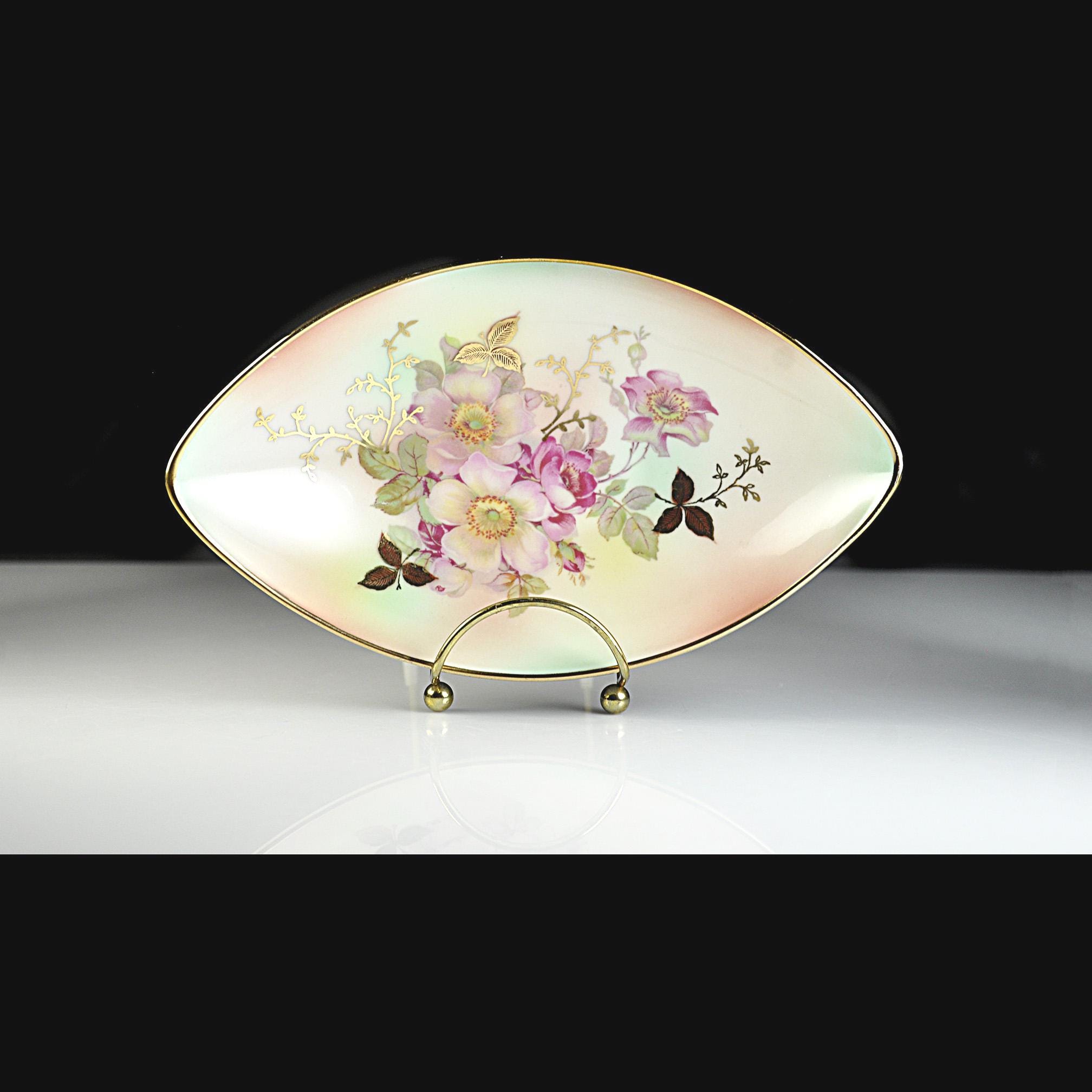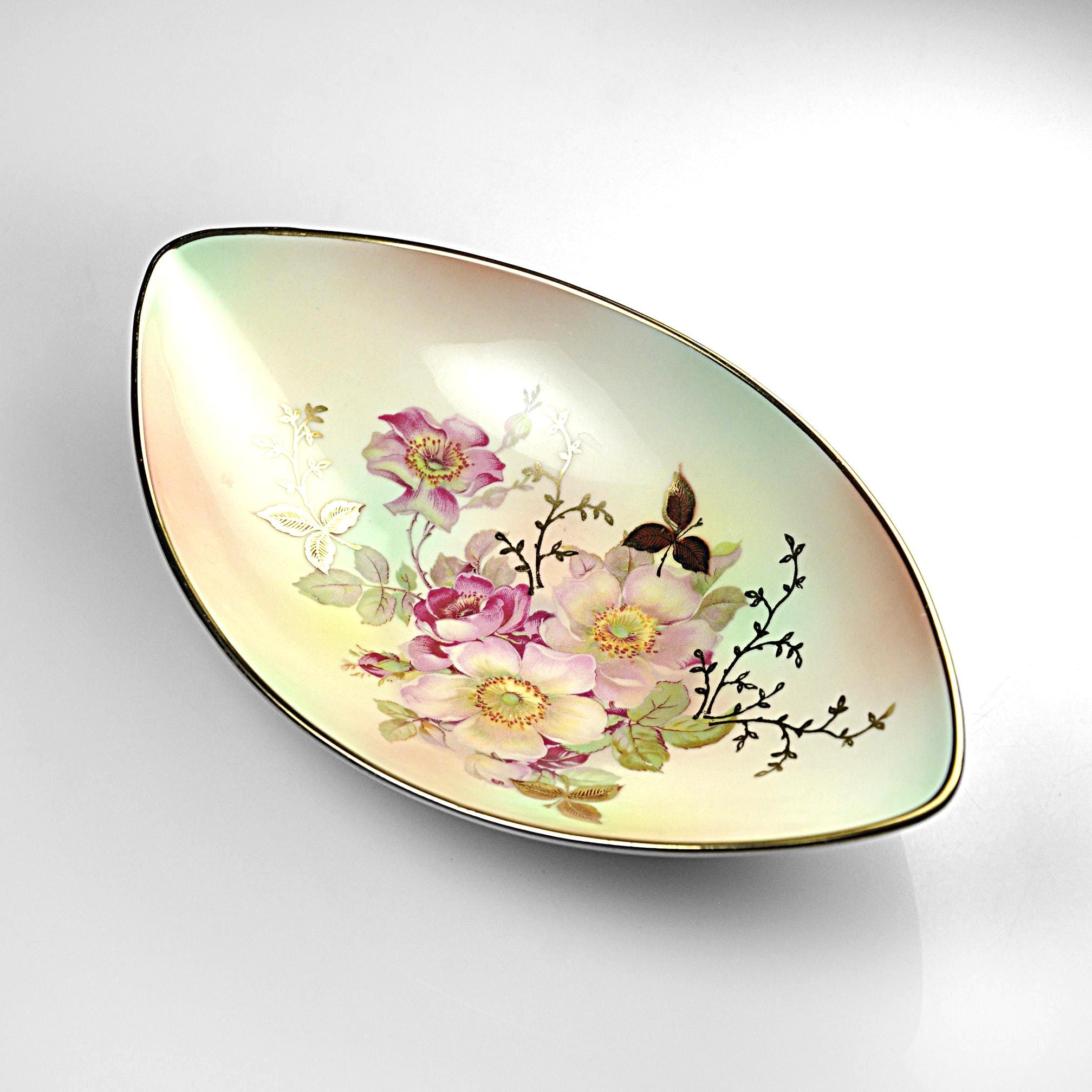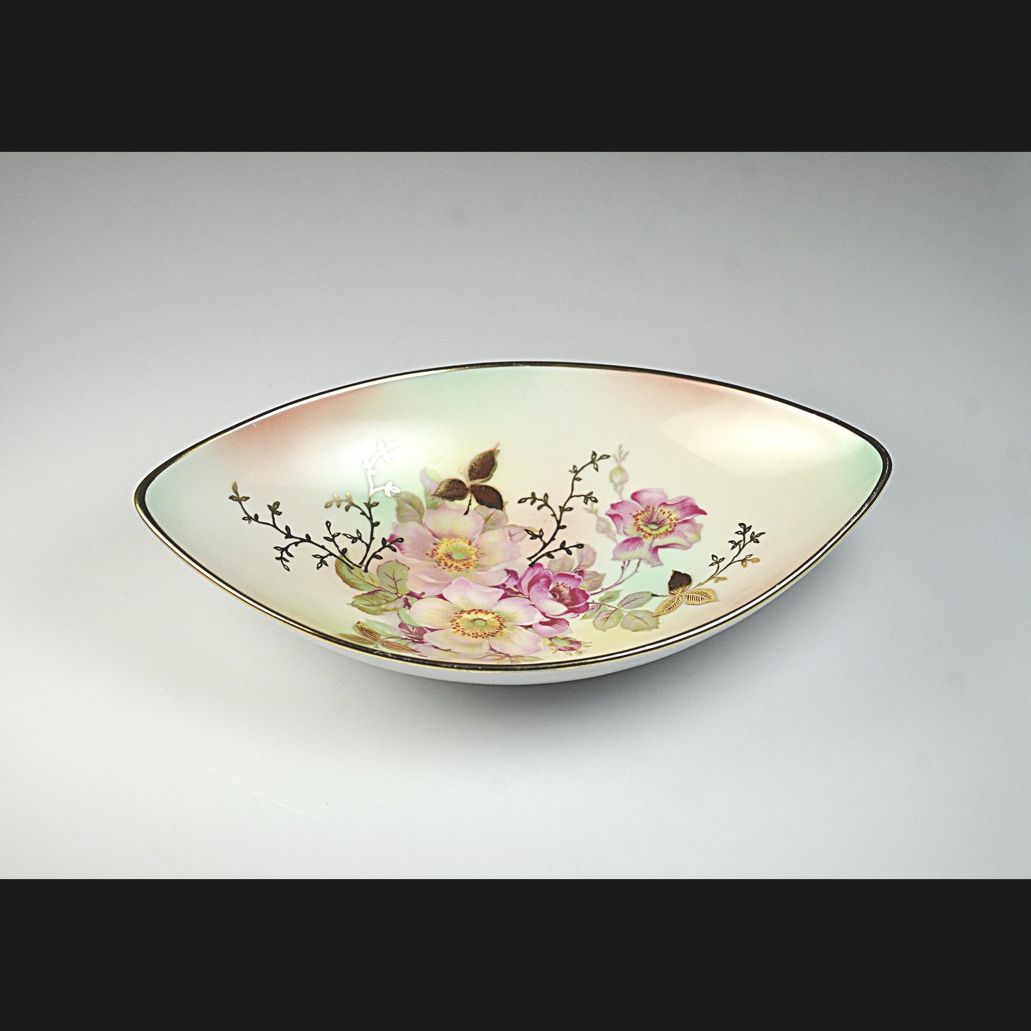 Some porcelain pieces were made to be the center of attention on a table, and this one certainly has that kind of presence. This elegant dish was made by Schumann Arzberg of Bavaria, Germany, a company known for producing fine porcelain that was exported all over the world during the mid-20th century. The delicate pink wild roses and soft green leaves sit against a gentle pastel background, while touches of gold highlight the flowers and trace the rim of the dish. The shape is what first catches your eye. Long and softly pointed at both ends, it has a graceful look that feels very much like the European tableware designs of the 1950s and 1960s. Pieces like this were often used as small serving dishes for candies, nuts, olives, or relishes, though many people today enjoy displaying them simply for their beauty.