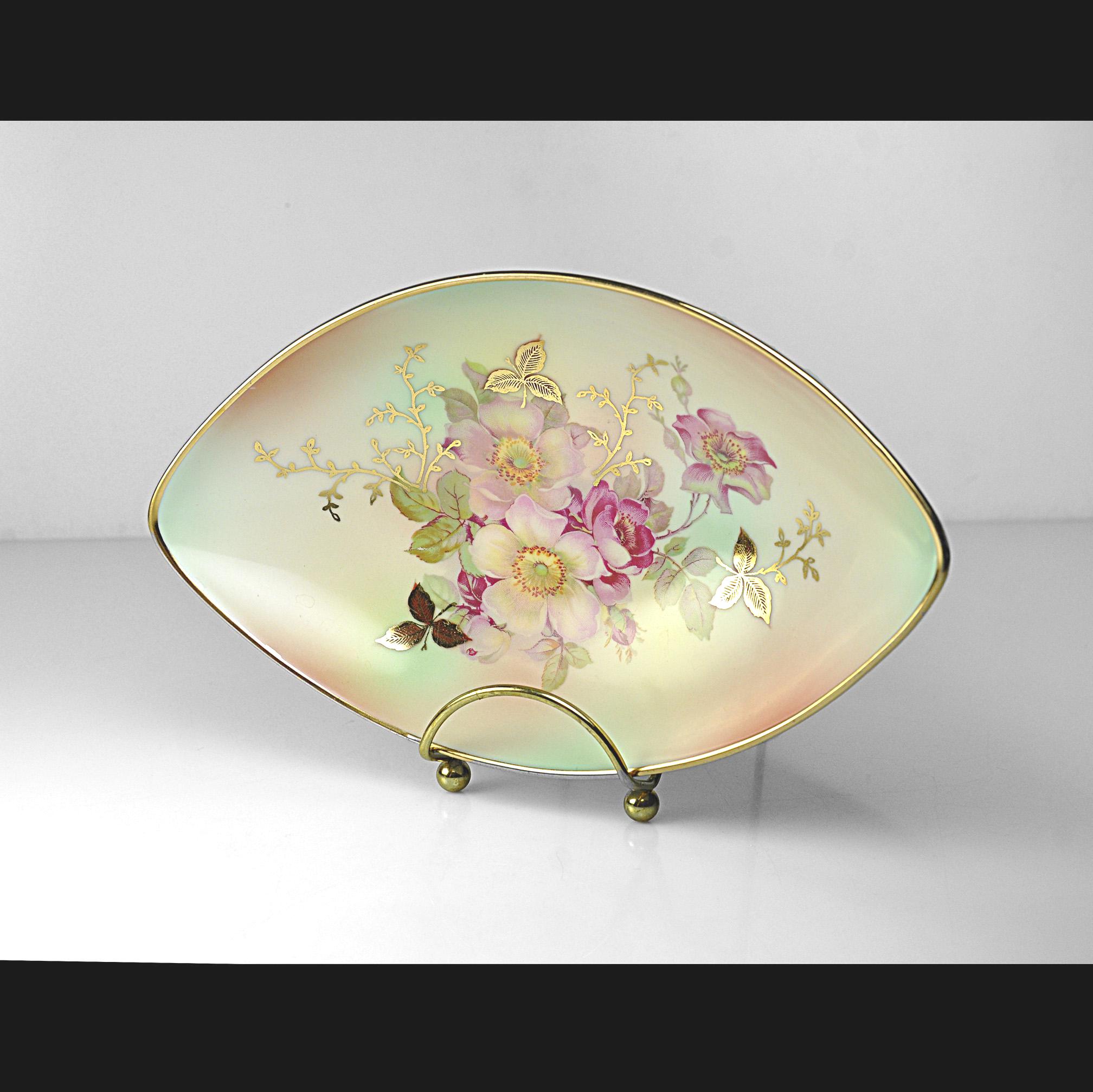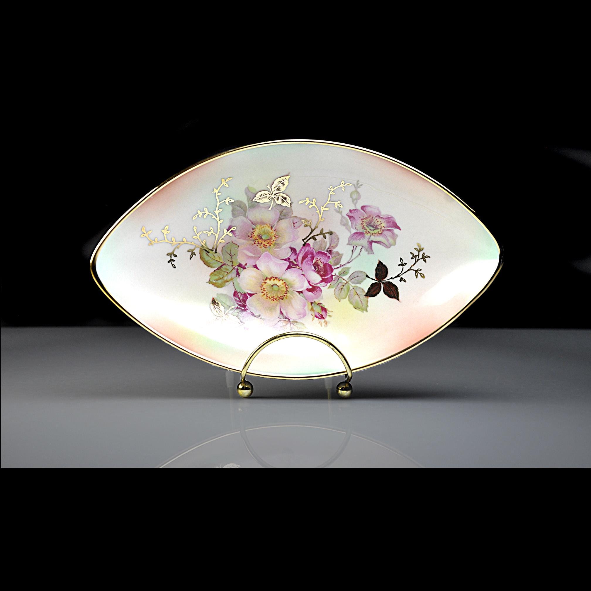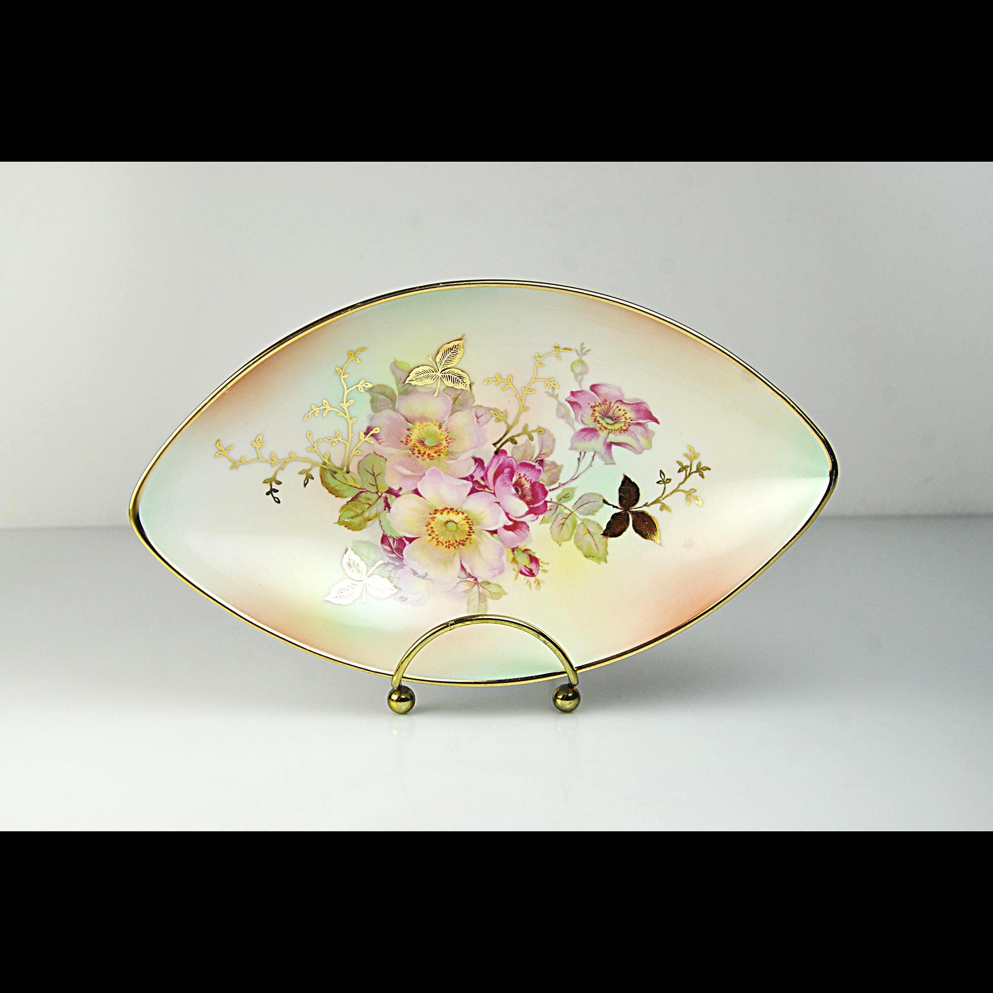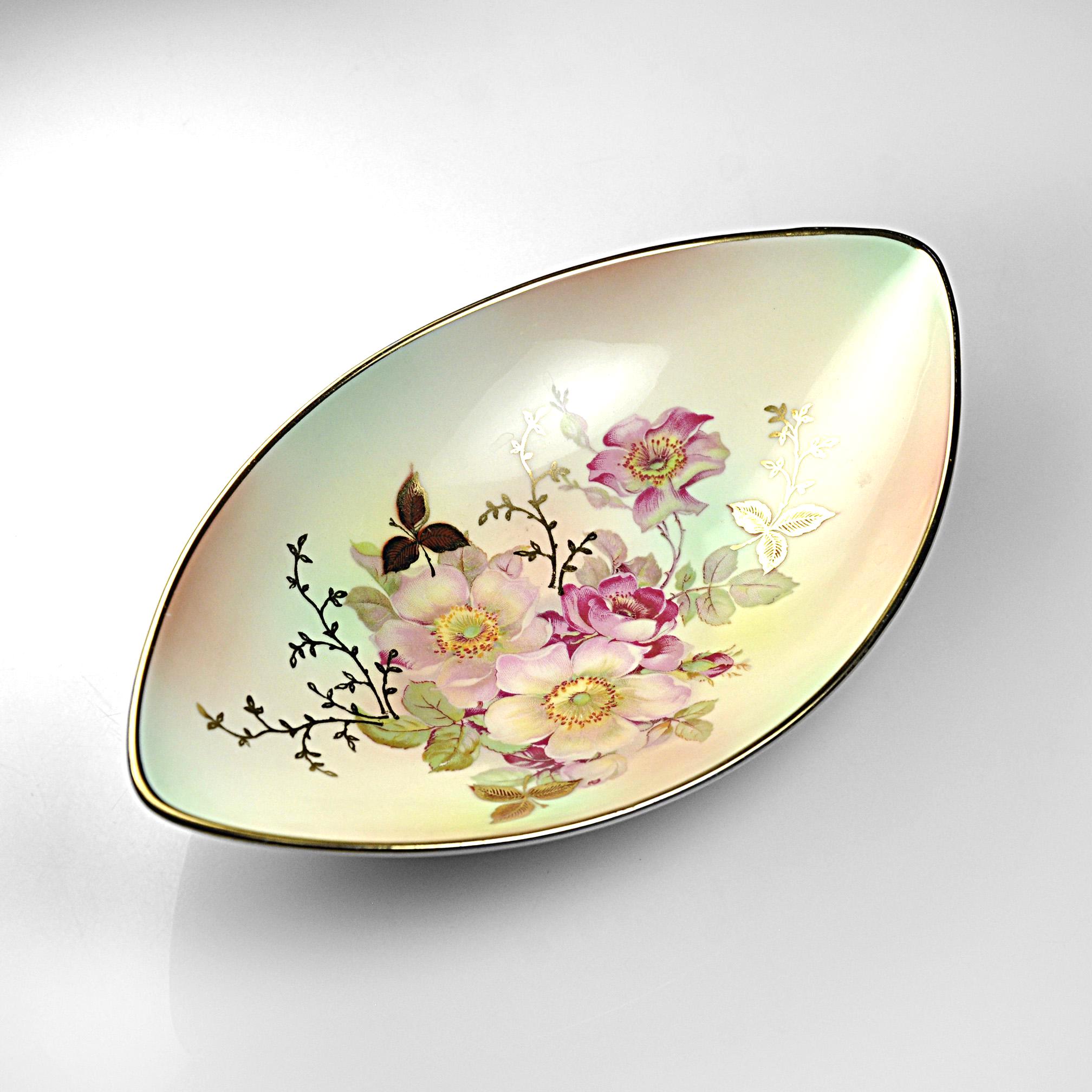 Some porcelain pieces were made to be the center of attention on a table, and this one certainly has that kind of presence. This elegant dish was made by Schumann Arzberg of Bavaria, Germany, a company known for producing fine porcelain that was exported all over the world during the mid-20th century. The delicate pink wild roses and soft green leaves sit against a gentle pastel background, while touches of gold highlight the flowers and trace the rim of the dish. The shape is what first catches your eye. Long and softly pointed at both ends, it has a graceful look that feels very much like the European tableware designs of the 1950s and 1960s. Pieces like this were often used as small serving dishes for candies, nuts, olives, or relishes, though many people today enjoy displaying them simply for their beauty.