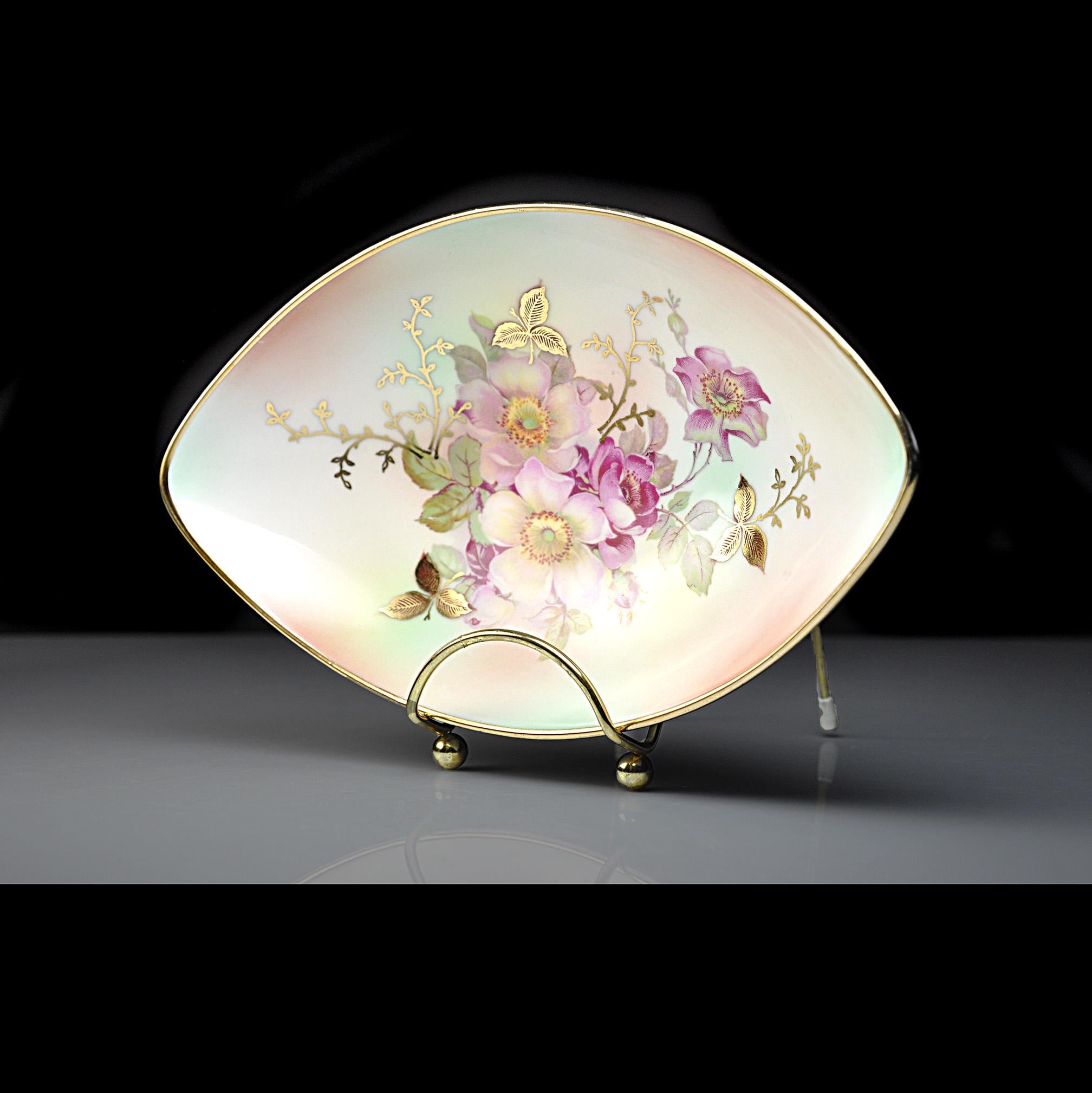 The Wild Rose pattern has always been a favorite among collectors because of its soft floral design and the little gold accents woven through the decoration. When placed on a stand, as shown in the photos, it becomes a lovely decorative piece for a cabinet, shelf, or table. This dish is in excellent vintage condition, which is not always easy to find with porcelain that has gold trim. The porcelain is glossy and clean, and the gold remains bright and intact.