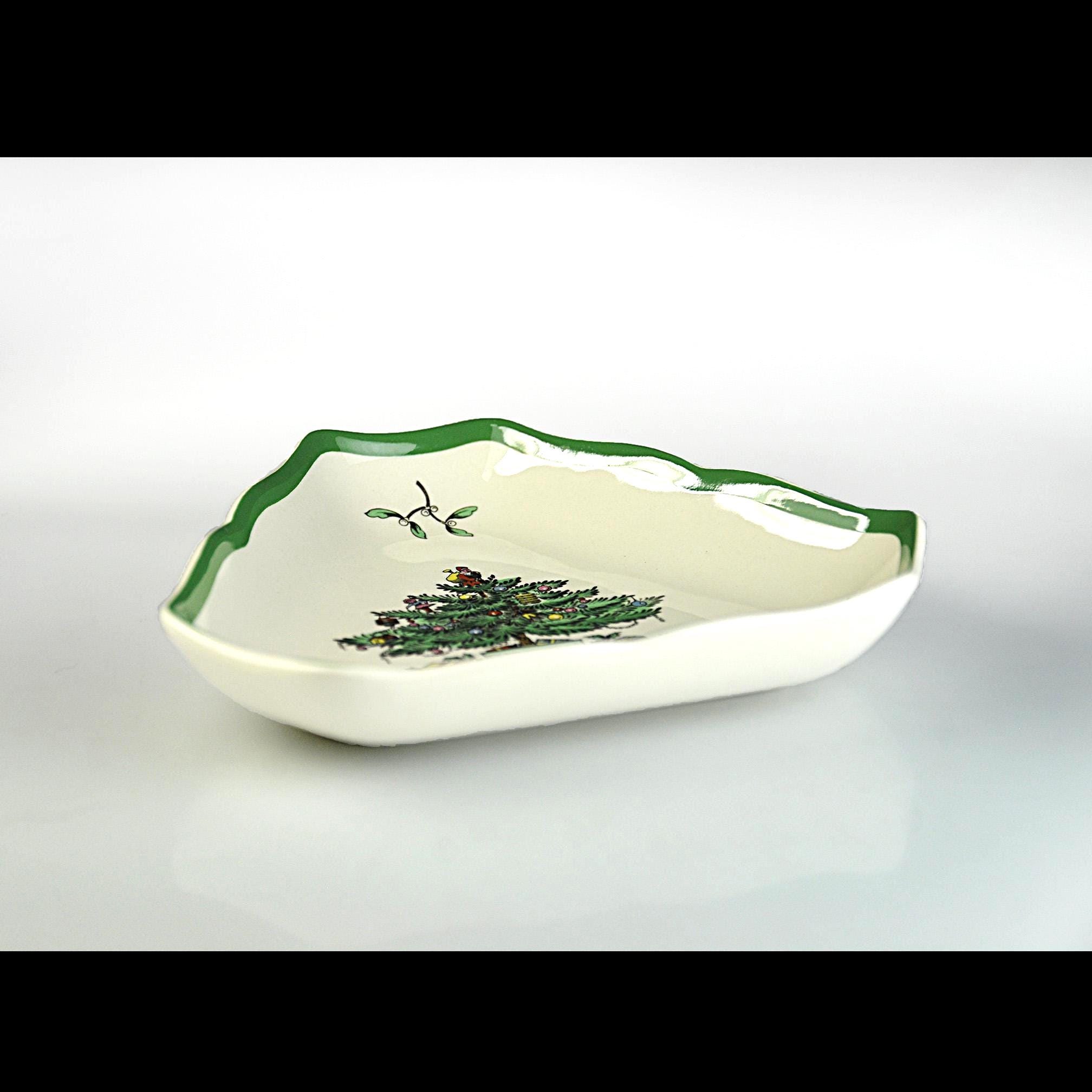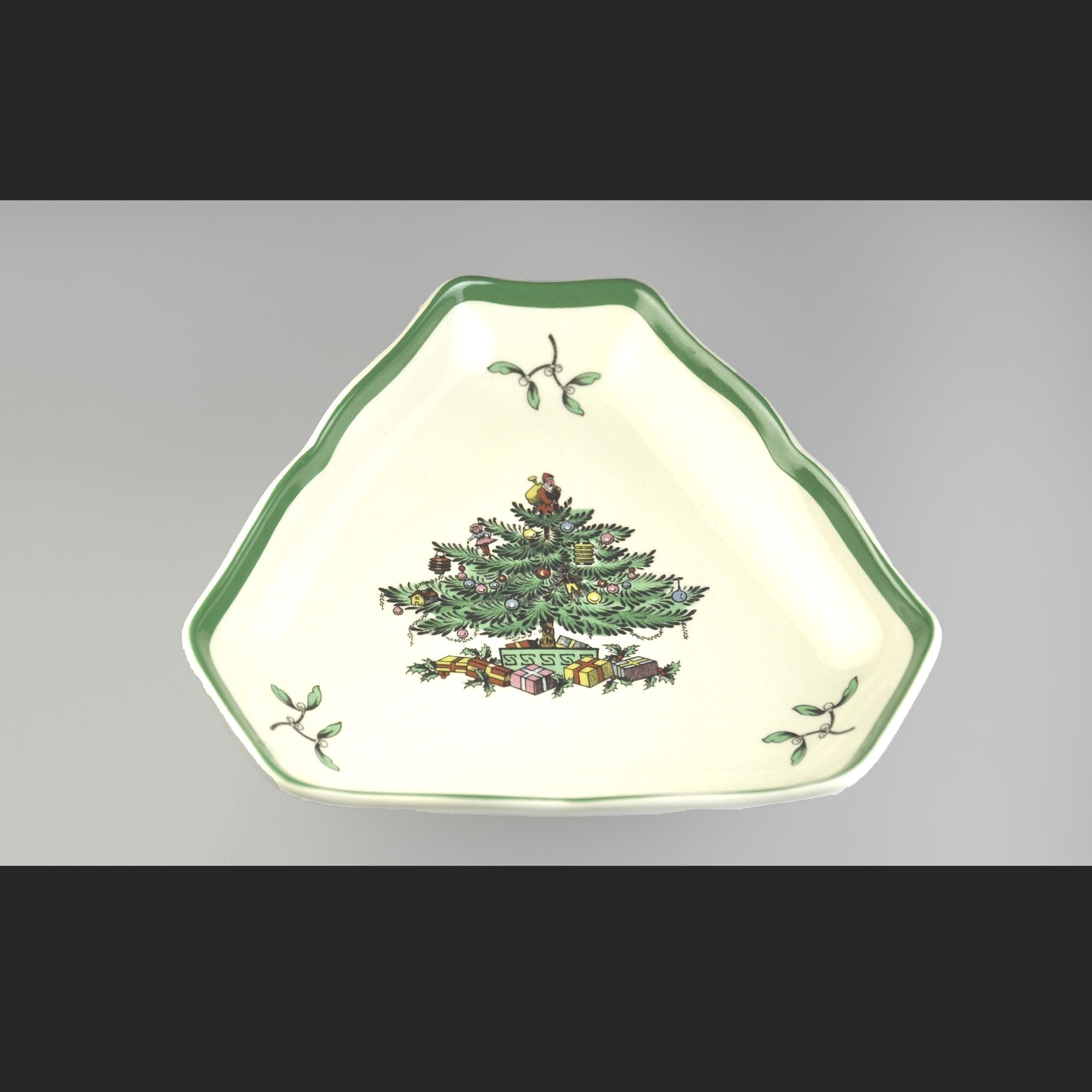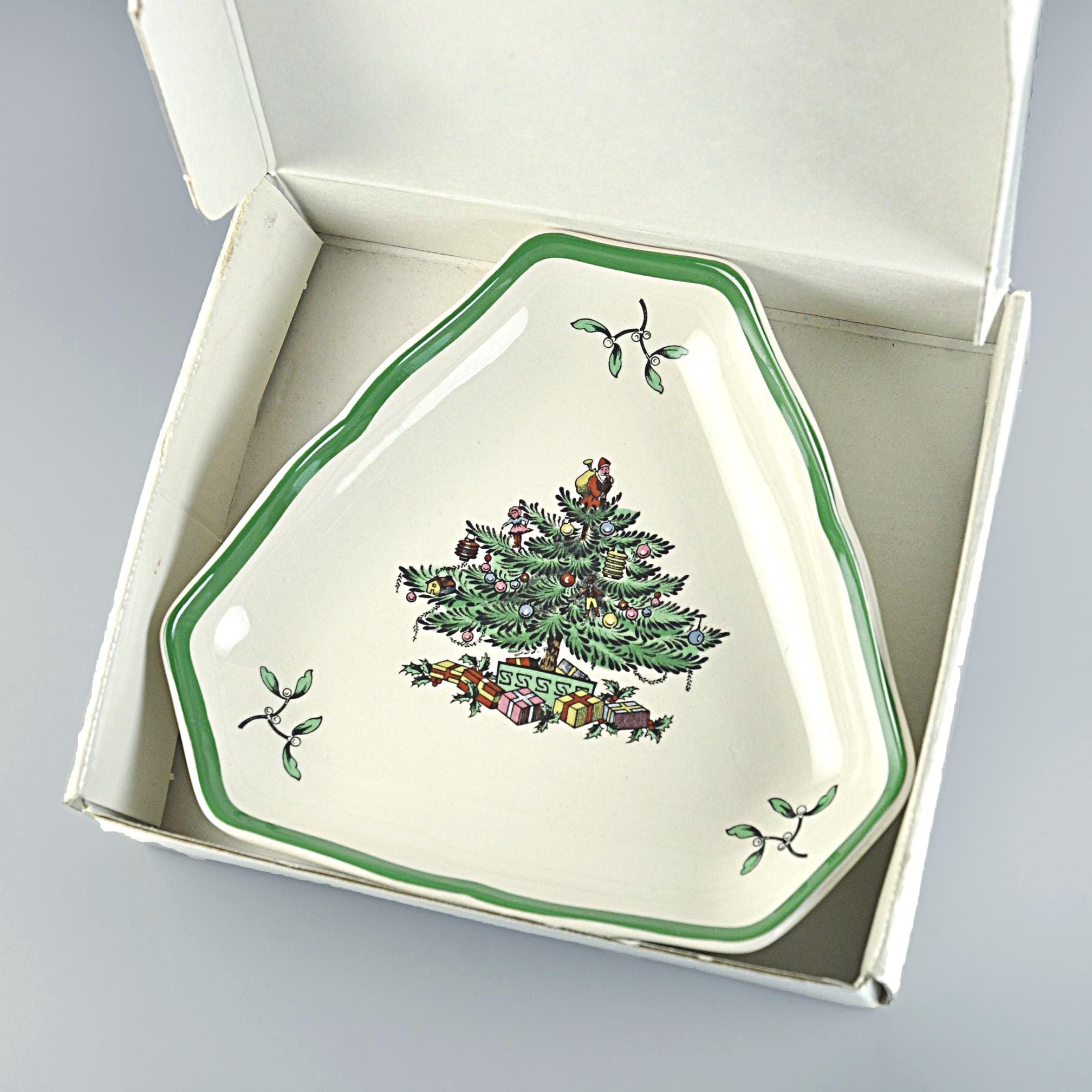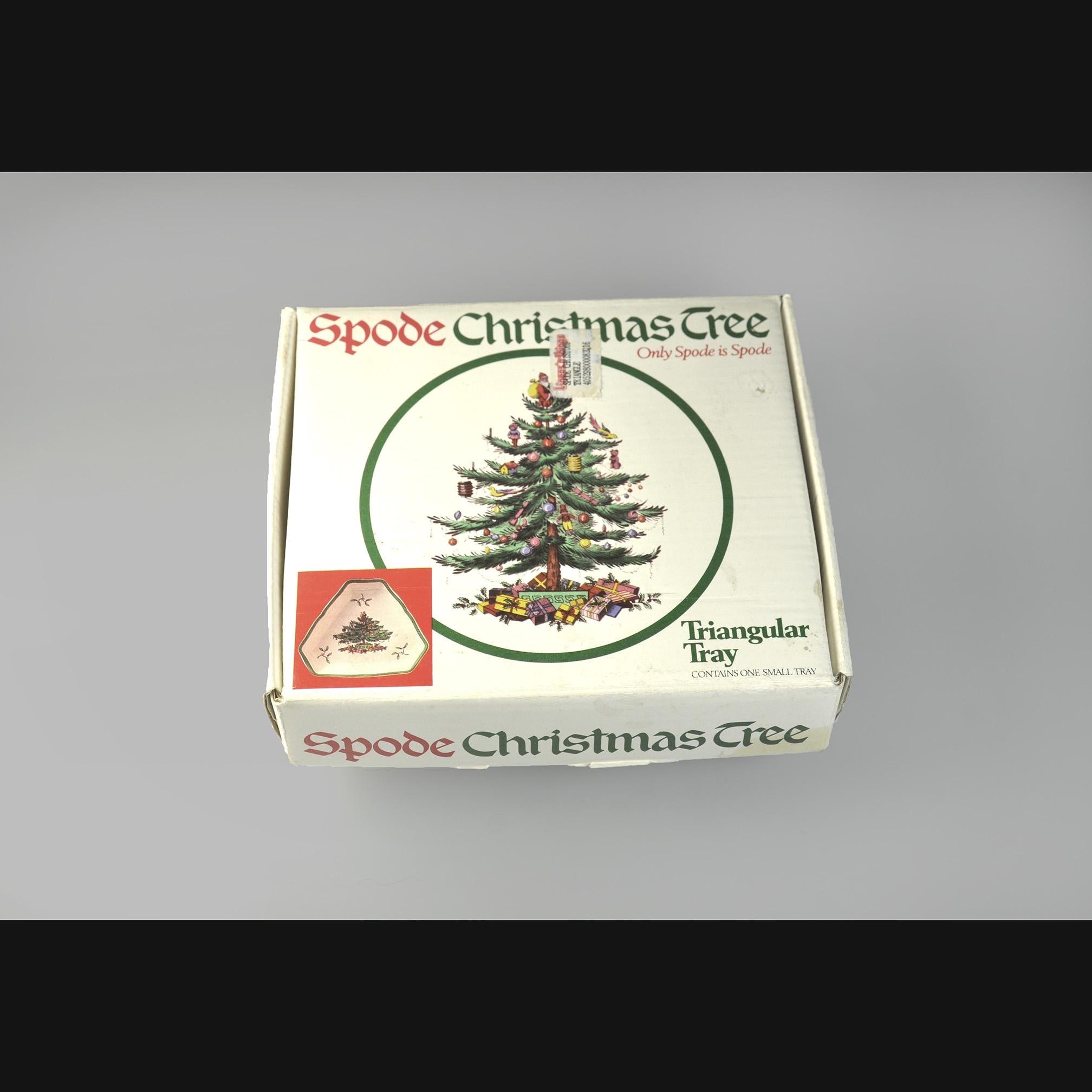 Spode’s Christmas Tree pattern has been part of holiday tables for generations, and it’s one of those designs many people recognize the moment they see it. This small triangular tray features the classic decorated Christmas tree with presents underneath, surrounded by the familiar green border and tiny mistletoe accents in the corners. The shape makes it a little different from the usual round holiday dishes, giving it a nice look whether it’s sitting on a table or displayed on a stand. The tray comes with its original Spode Christmas Tree box, which is always a nice bonus for collectors or for someone who wants to store it safely after the holidays. Small pieces like this were often used for holiday candies, nuts, olives, or other little treats set out when friends and family stopped by during the Christmas season. Even when it isn’t being used, it makes a charming decorative piece for a shelf, sideboard, or holiday display.