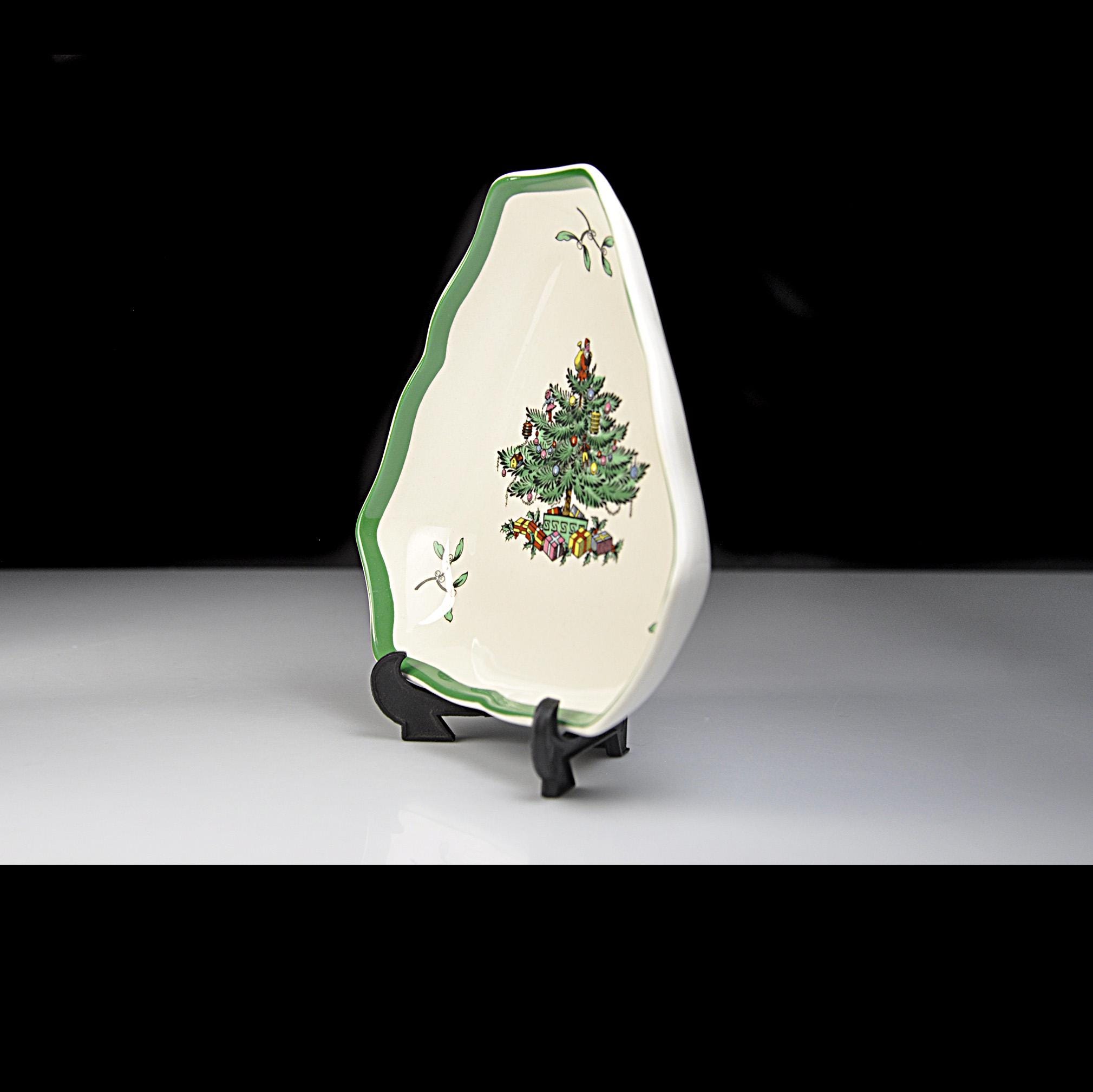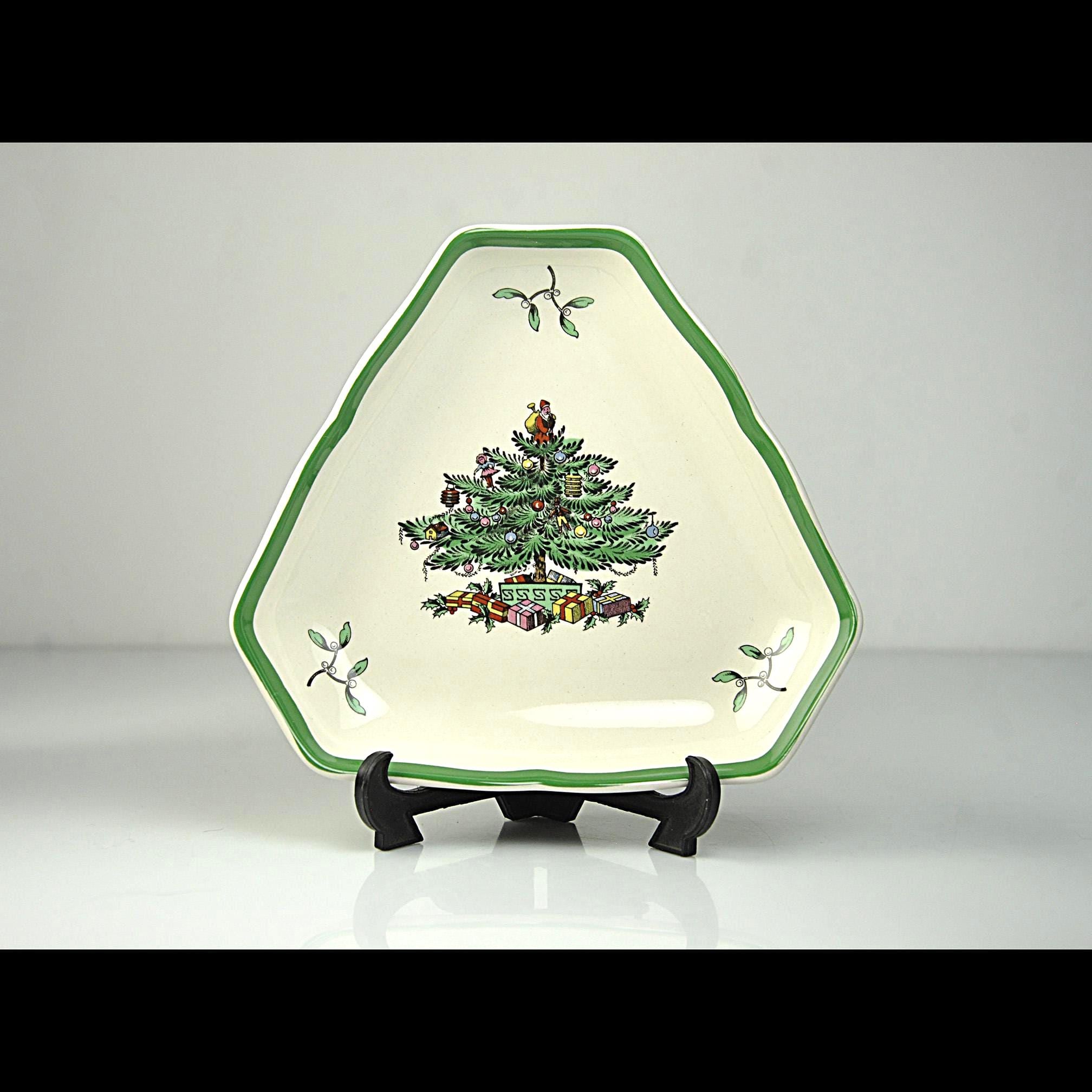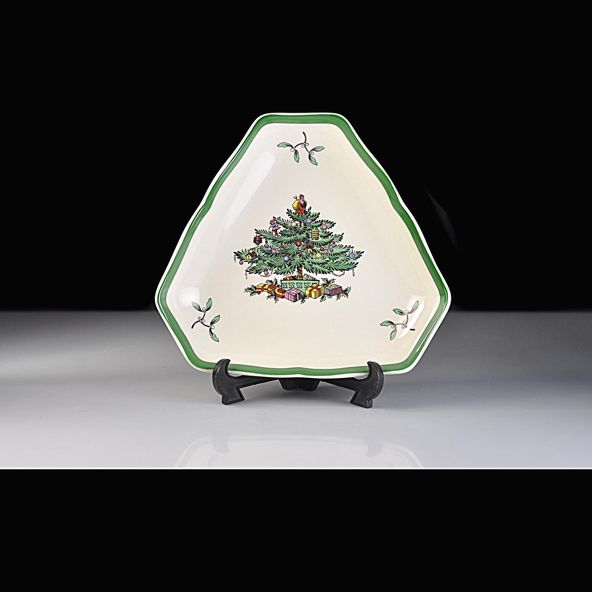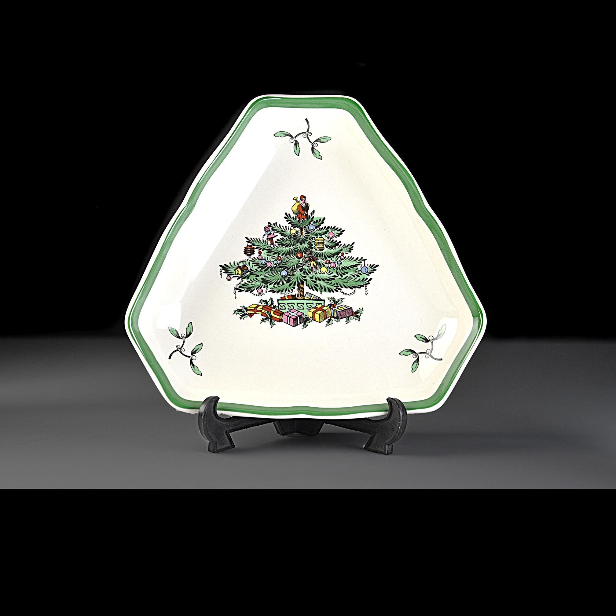 Spode’s Christmas Tree pattern has been part of holiday tables for generations, and it’s one of those designs many people recognize the moment they see it. This small triangular tray features the classic decorated Christmas tree with presents underneath, surrounded by the familiar green border and tiny mistletoe accents in the corners. The shape makes it a little different from the usual round holiday dishes, giving it a nice look whether it’s sitting on a table or displayed on a stand. The tray comes with its original Spode Christmas Tree box, which is always a nice bonus for collectors or for someone who wants to store it safely after the holidays. Small pieces like this were often used for holiday candies, nuts, olives, or other little treats set out when friends and family stopped by during the Christmas season. Even when it isn’t being used, it makes a charming decorative piece for a shelf, sideboard, or holiday display.