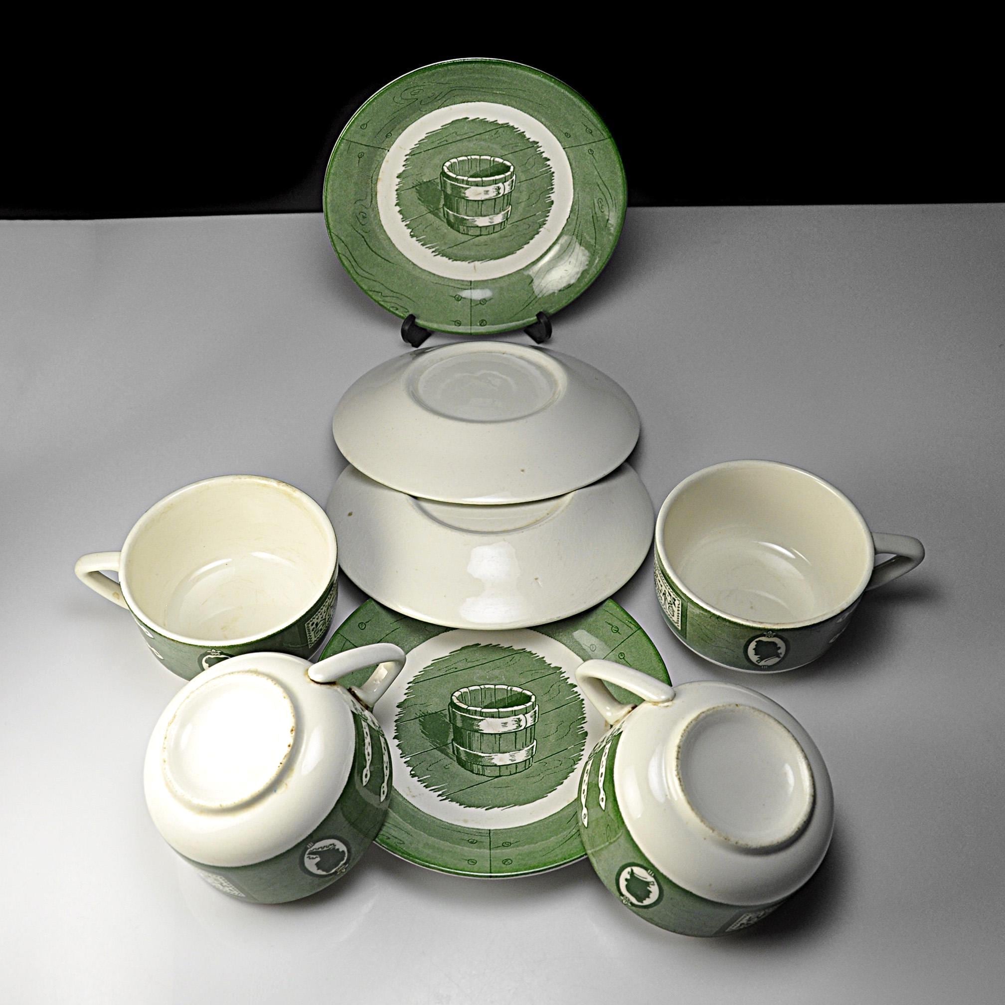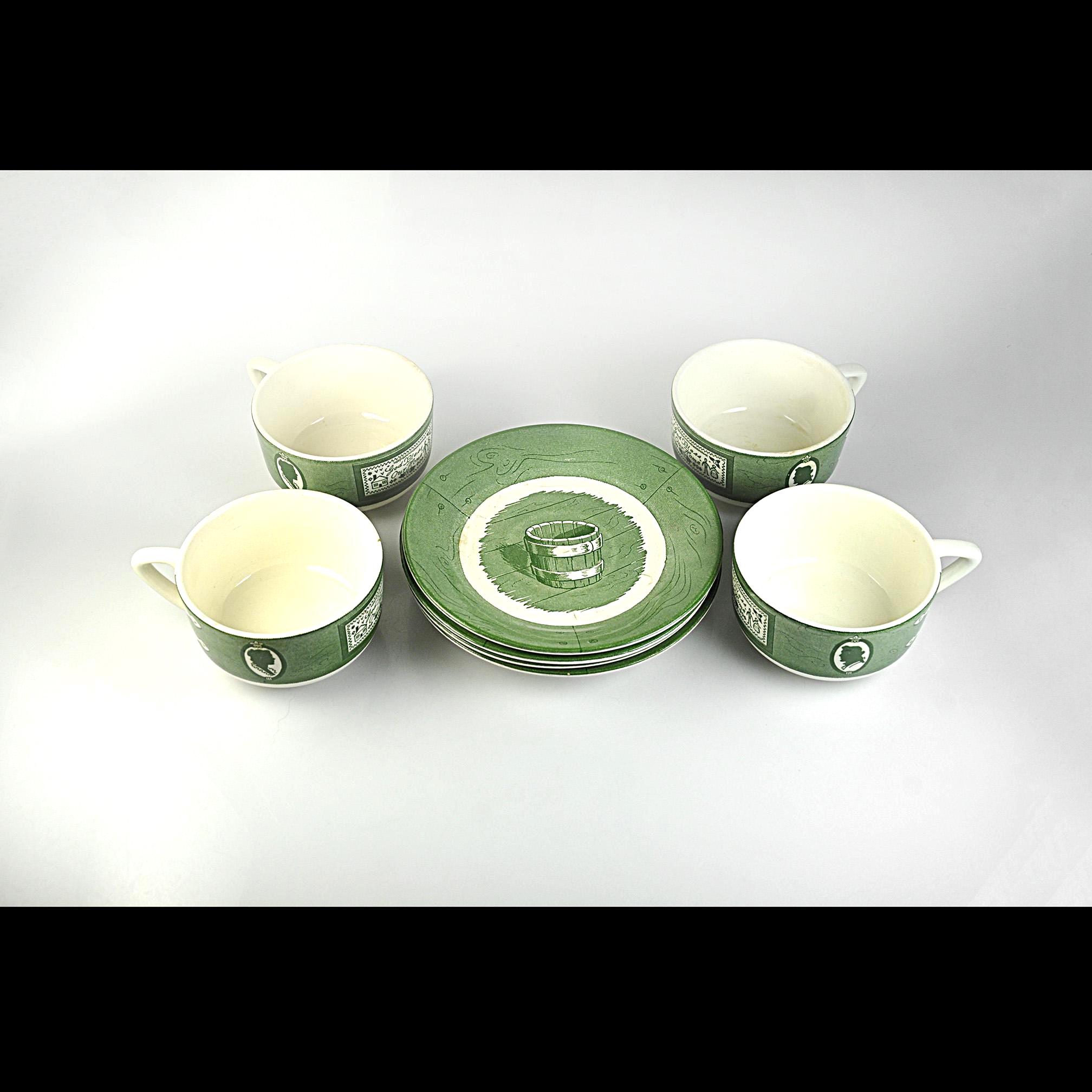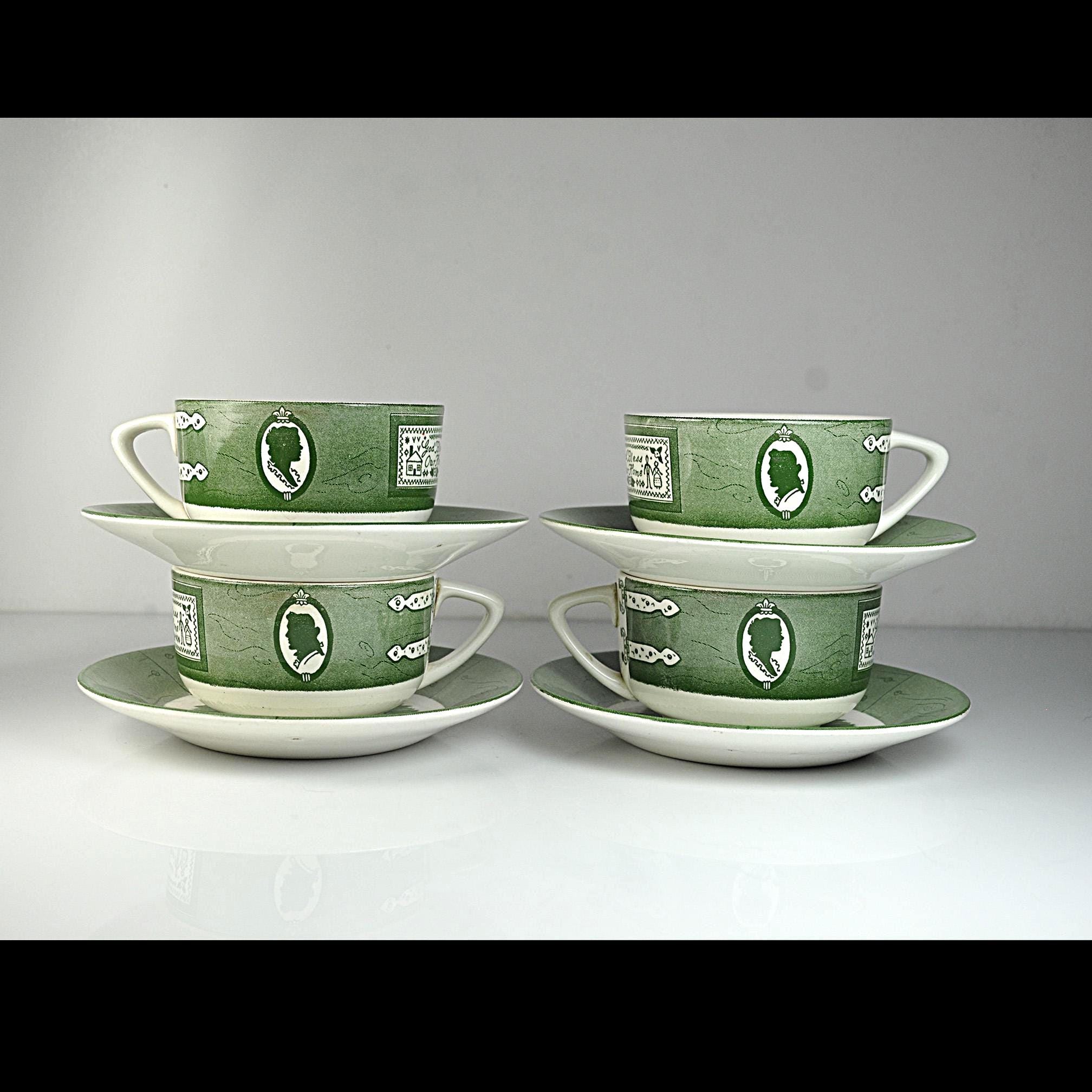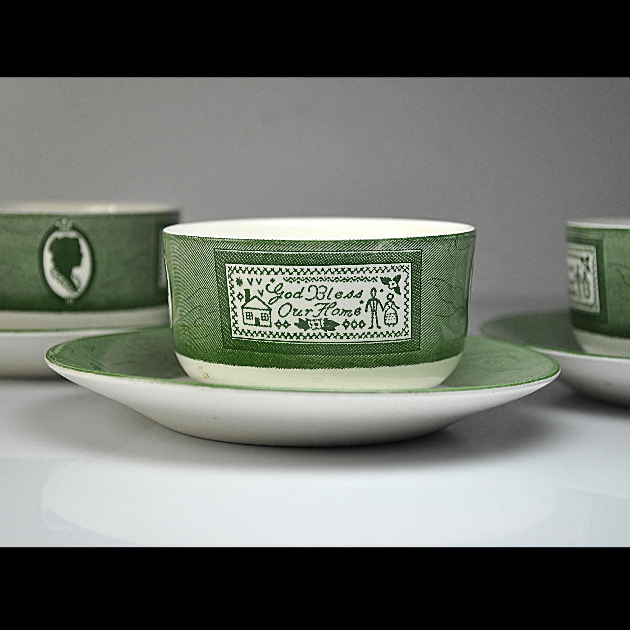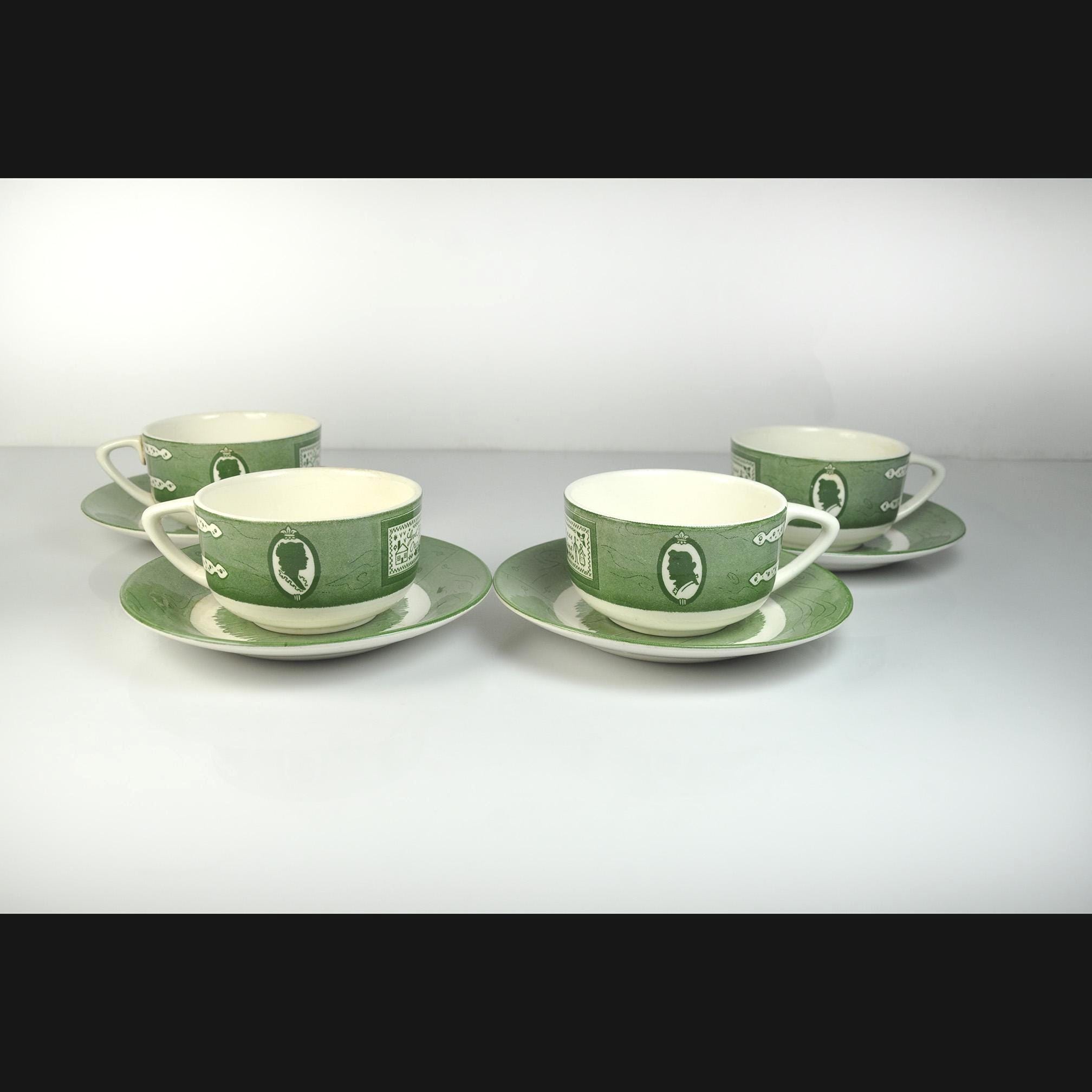 Some dishes just feel like they belong in an old country kitchen, and this Colonial Homestead set is one of those. Made by Royal China in Sebring, Ohio, this pattern became popular in the 1950s when early American decorating was everywhere. The design celebrates colonial life with simple green transferware illustrations—silhouette portraits, iron hinges, and a small sampler that reads “God Bless Our Home.” The saucers feature a rustic wooden bucket in the center, adding to that old homestead feeling the pattern was meant to capture. Royal China produced sturdy everyday dinnerware that families used for decades, and many pieces like these were sold through grocery stores and catalog promotions. Because of that, it’s very common for Colonial Homestead pieces to be unmarked on the bottom, just like this set. Today these pieces fit right in with farmhouse kitchens, cottage décor, or anyone who enjoys vintage Americana style. This listing includes four matching cups and four matching saucers.
