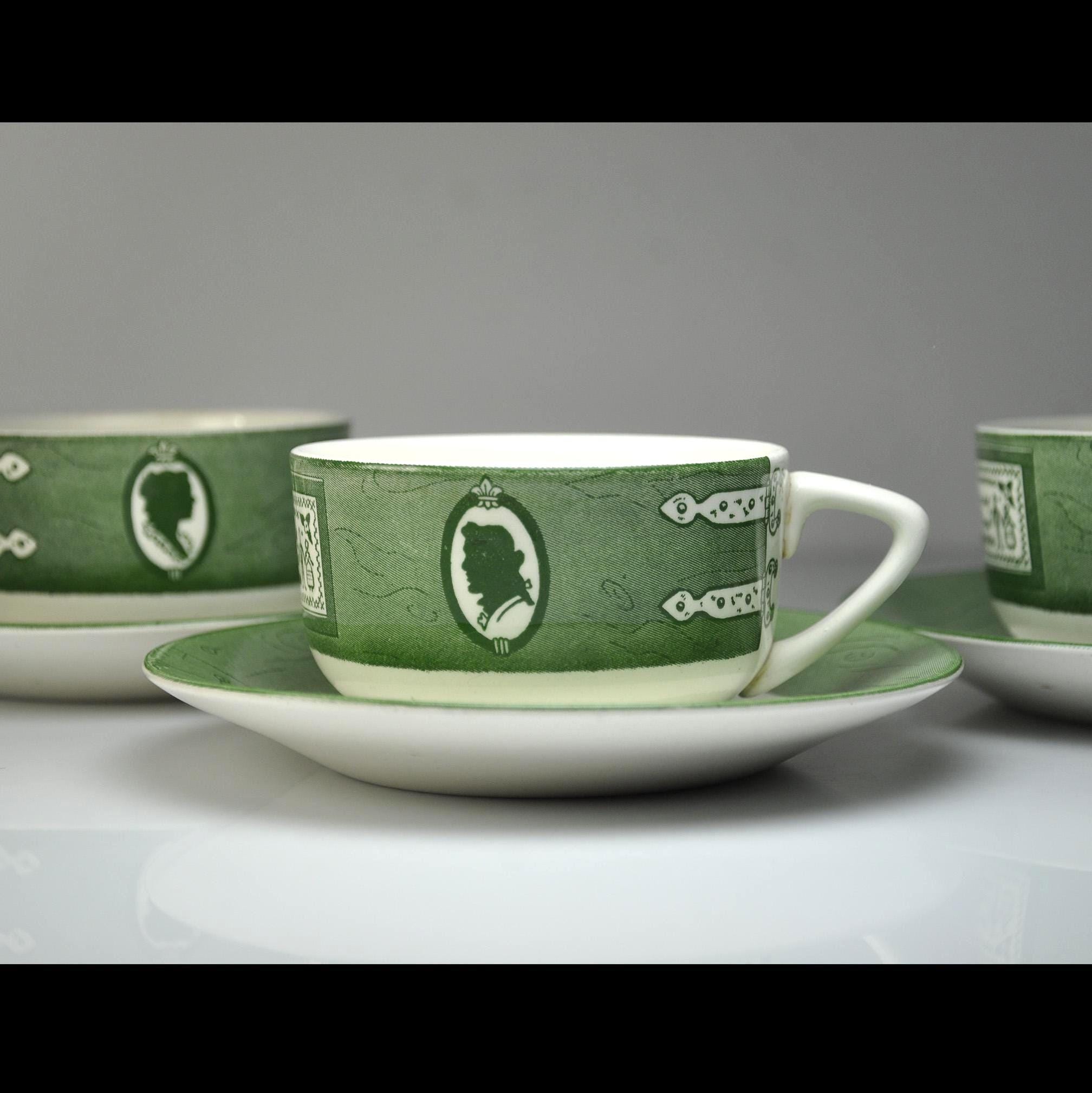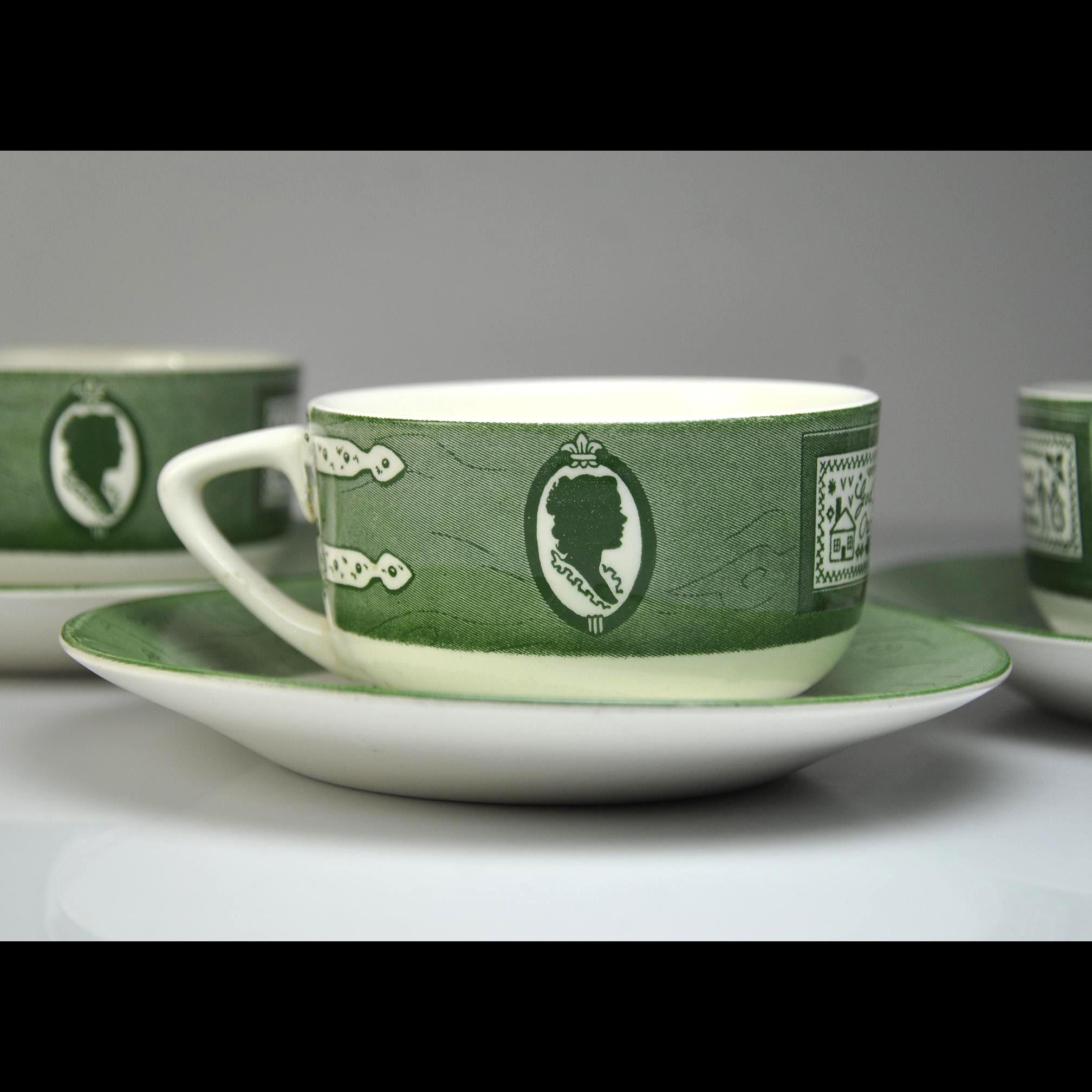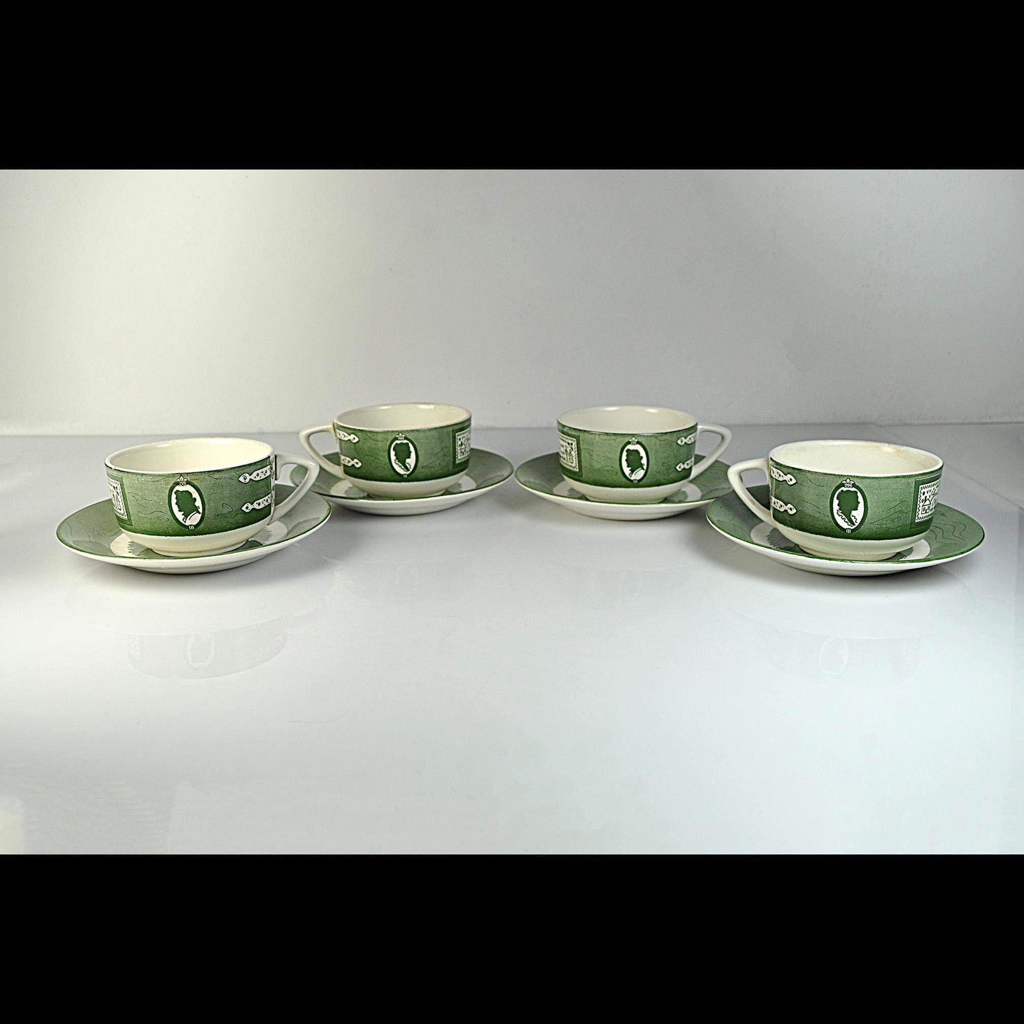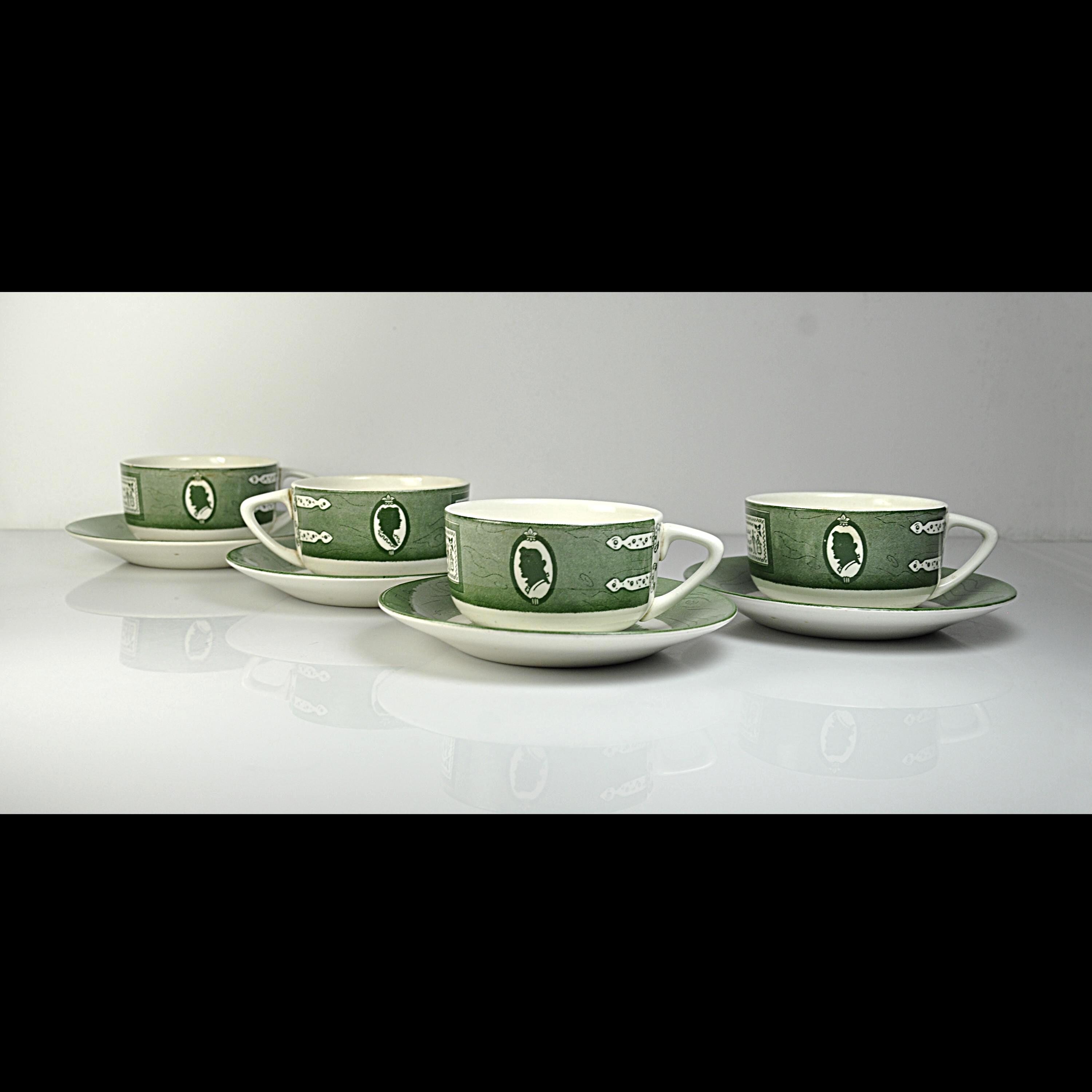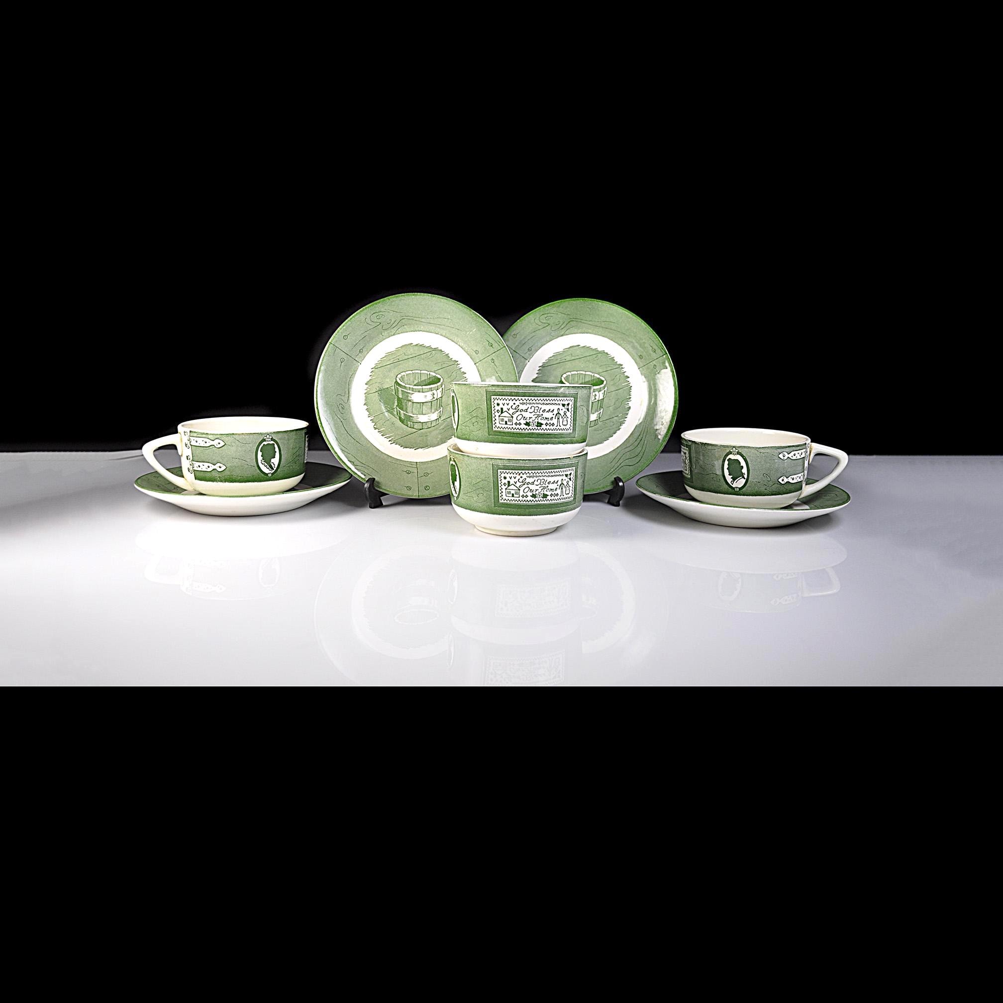 Some dishes just feel like they belong in an old country kitchen, and this Colonial Homestead set is one of those. Made by Royal China in Sebring, Ohio, this pattern became popular in the 1950s when early American decorating was everywhere. The design celebrates colonial life with simple green transferware illustrations—silhouette portraits, iron hinges, and a small sampler that reads “God Bless Our Home.” The saucers feature a rustic wooden bucket in the center, adding to that old homestead feeling the pattern was meant to capture. Royal China produced sturdy everyday dinnerware that families used for decades, and many pieces like these were sold through grocery stores and catalog promotions. Because of that, it’s very common for Colonial Homestead pieces to be unmarked on the bottom, just like this set. Today these pieces fit right in with farmhouse kitchens, cottage décor, or anyone who enjoys vintage Americana style. This listing includes four matching cups and four matching saucers.