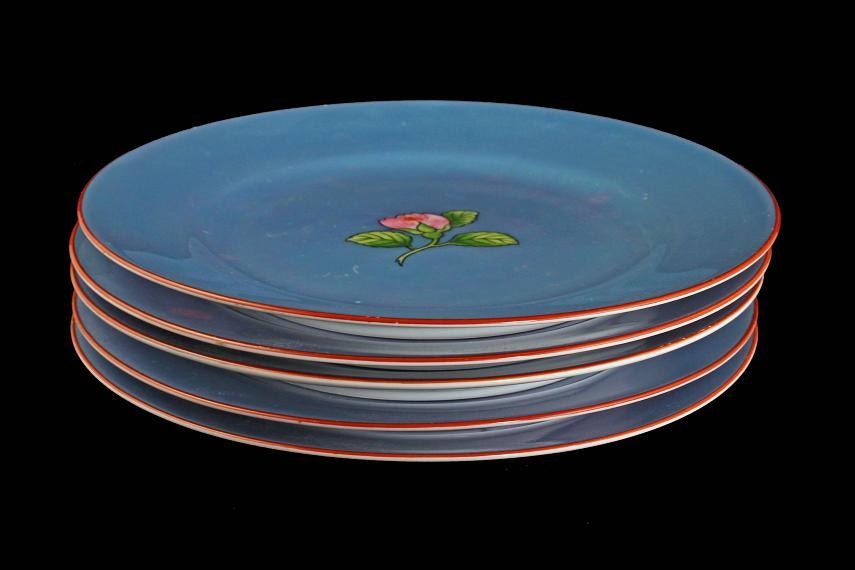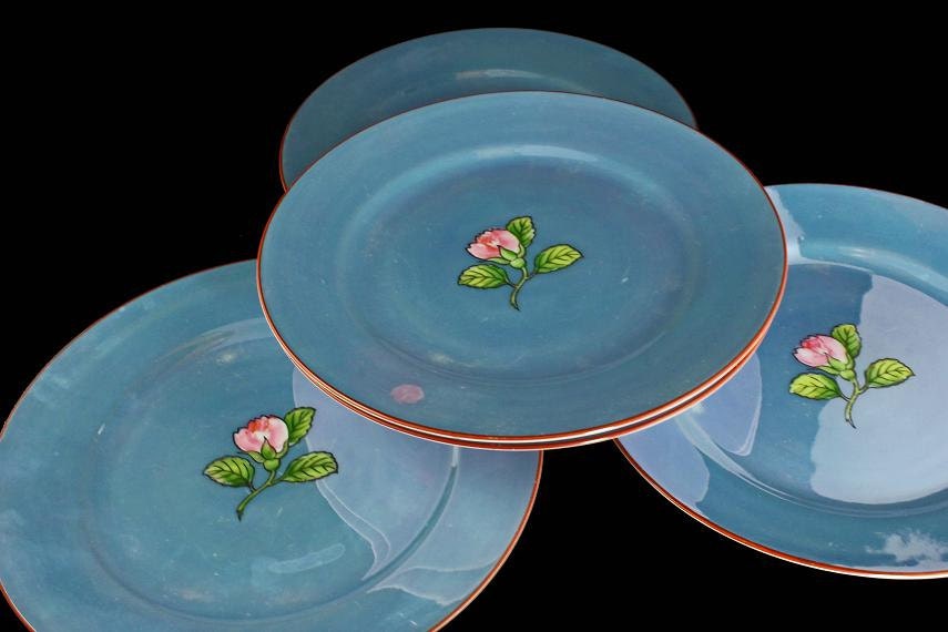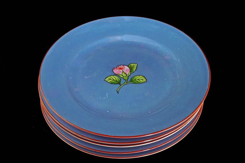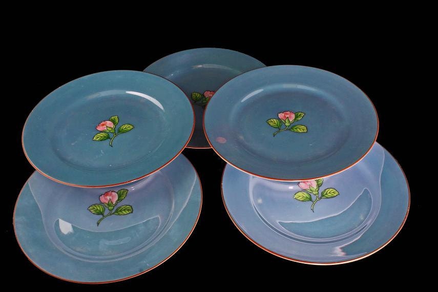 A gorgeous set of 5 lusterware blue salad plates by Noritake. These plates are an iridescent (displaying a play of lustrous color) blue with a reddish-brown trim. The plates are a hard to find item. They would be a great addition to a collection. What great dishes for enjoying an al fresco lunch out on the veranda, porch, or patio.