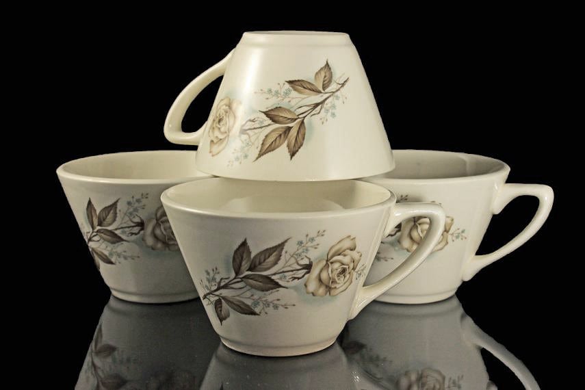 A wonderful set of 4 tea or coffee cups in a hard to find pattern by Mount Clemens. This is a charming brown rose with powder blue shadows and mini flowers. What a great way to add a touch of the past to your dinner table, buffet, or sideboard.