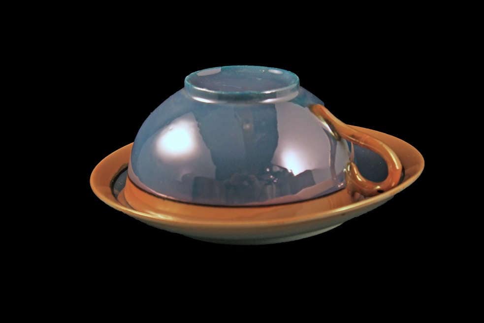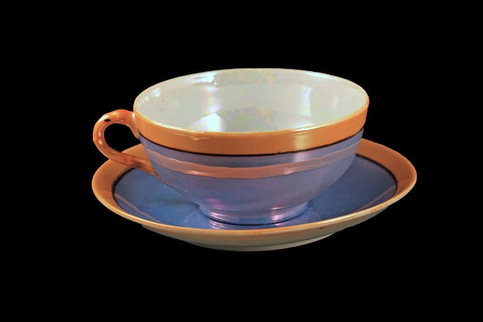A gorgeous Nippon lusterware teacup and saucer that is an iridescent (displaying a play of lustrous color) blue with a peach trim and black line. It would be a great addition to a collection. What a great set for enjoying an afternoon tea out on the veranda, porch, or patio.