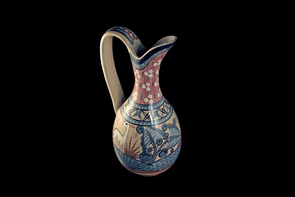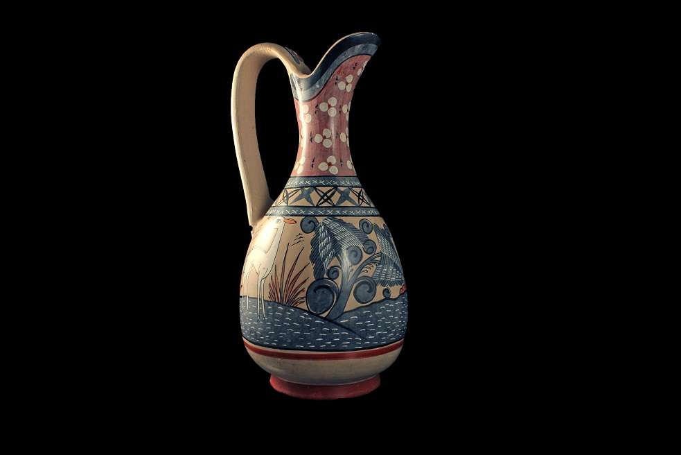 Mexican Pottery Pitcher, Mateos, Signed, Burnished, Hand Painted, Collectible, 12 Inch