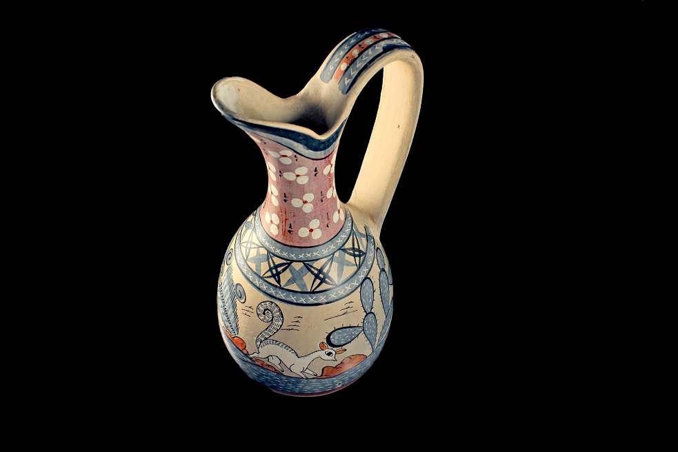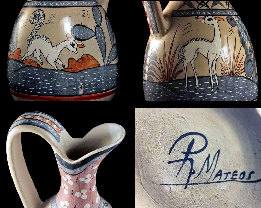 This is a gorgeous pitcher by Mateos Pottery made in Mexico. It is burnished, hand painted, and signed by the artist. This pitcher's pattern is of cactus, desert plants, and animals. These are highly collectible. It would make a wonderful addition to a Mexican themed room, centerpiece for a table, or as a gift for a collector.