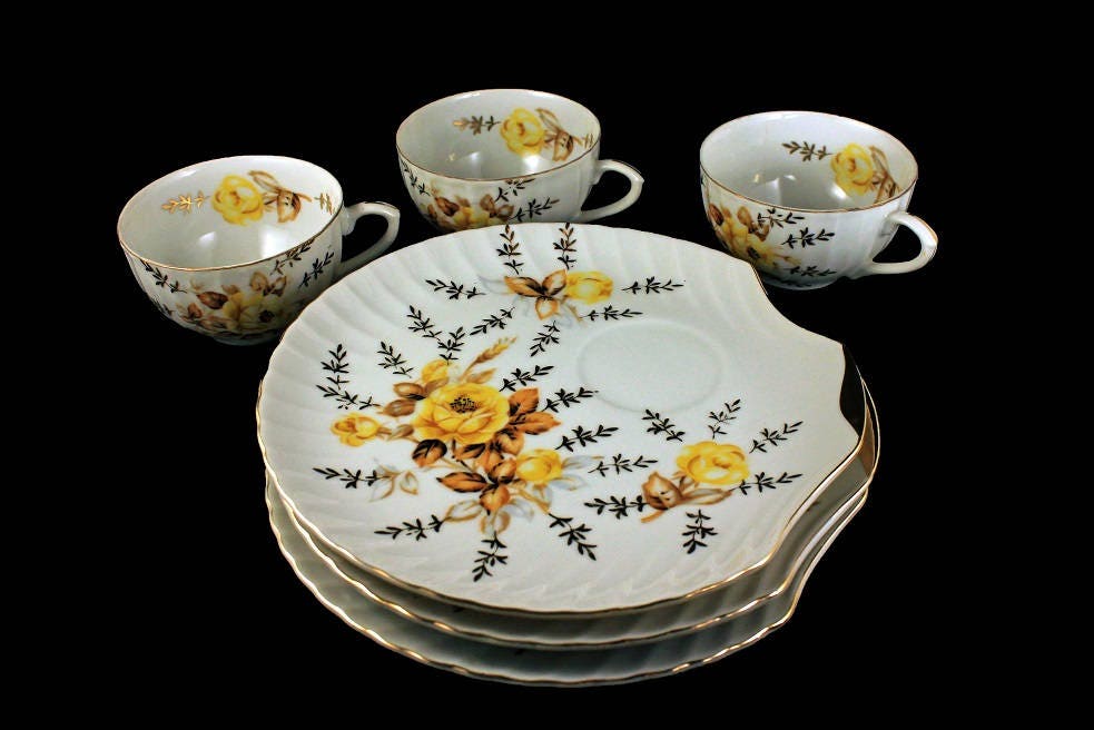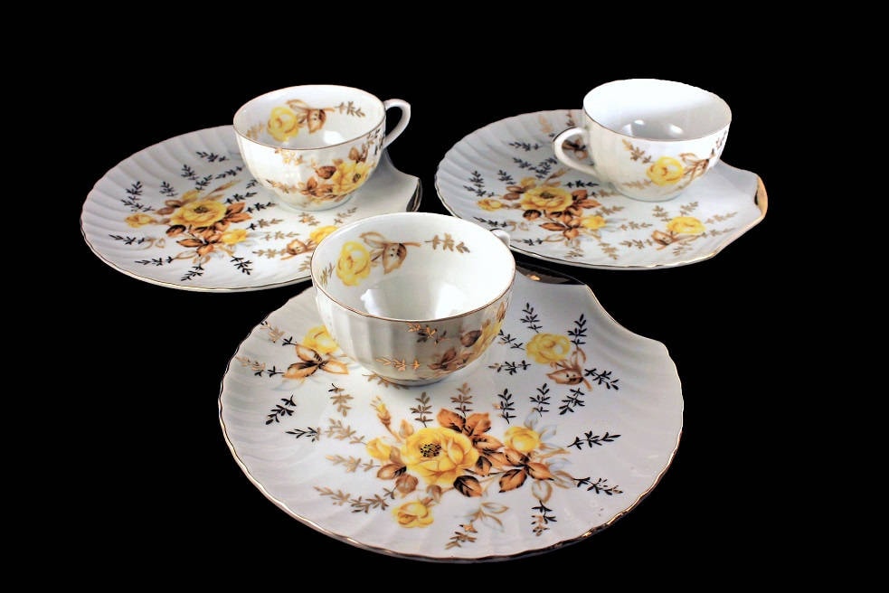 Snack Plates and Cups, Bone China, Shell Shaped Plate, Yellow Rose Pattern, Gold Trim, Set of 3